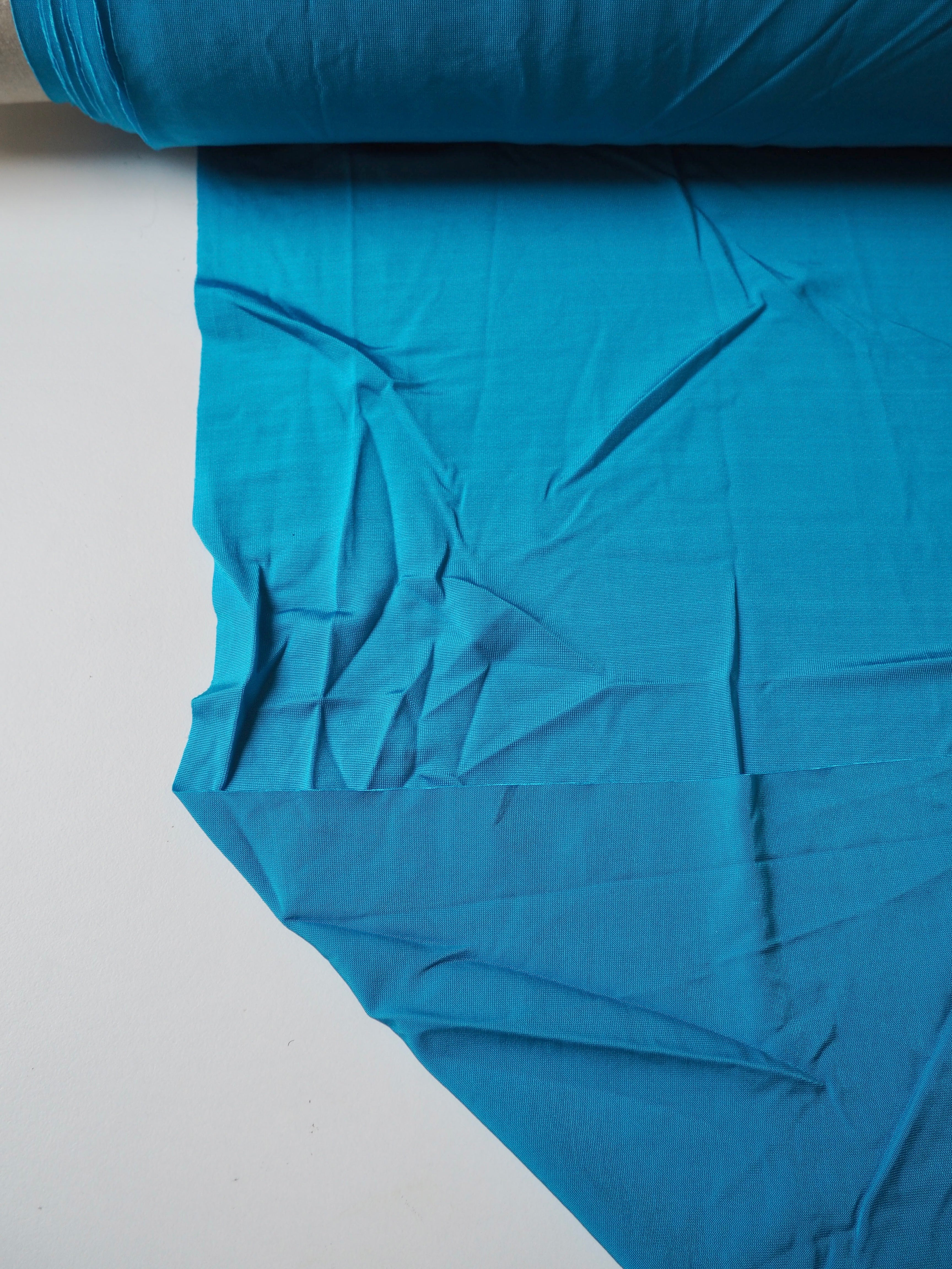 This ex-designer fabric is a jersey. It has a beautiful drape that’s quite swishy, and a slinky handle. It's lightweight and has a smooth handle. Has about 40% stretch width ways, and about 30% length ways, and great recovery. Opaque. Perfect for a skirt or elevated basics!