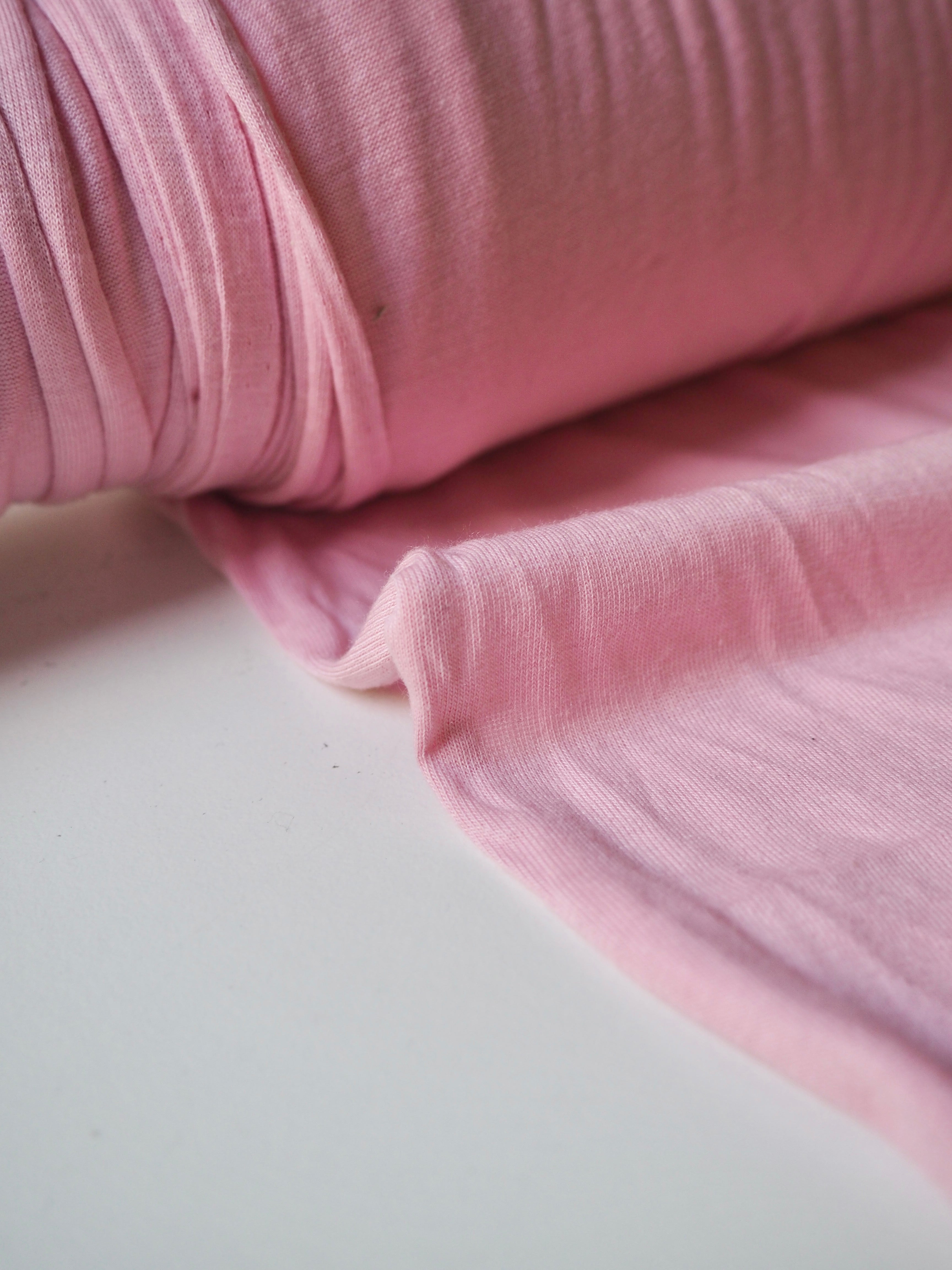 This ex-designer fabric is a cotton jersey. It is lightweight with a soft, gentle drape. It has a single jersey t-shirt weave with a 30-40% stretch width-ways, and about 10% length ways. A little sheer due to colour, and ideal for everyday basics, would make a great classic t-shirt!