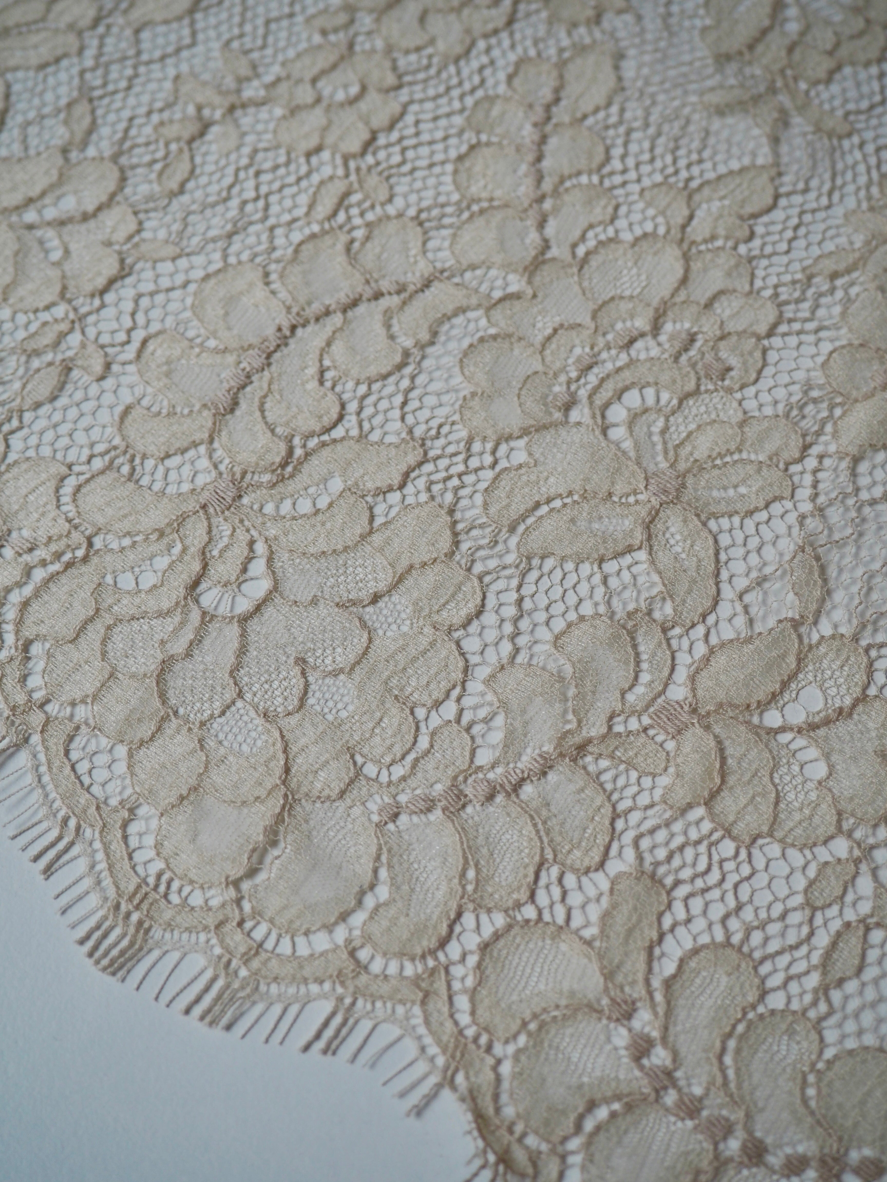 This ex-designer trim is a scallop lace trim. It has a medium scale floral pattern and an eyelash scallop finish on both edges. It also features a gentle cording. Perfect for lingerie and bra making, but could also be used as trim on other garments. We think this would look stunning appliquéd over the bodice of a dress!