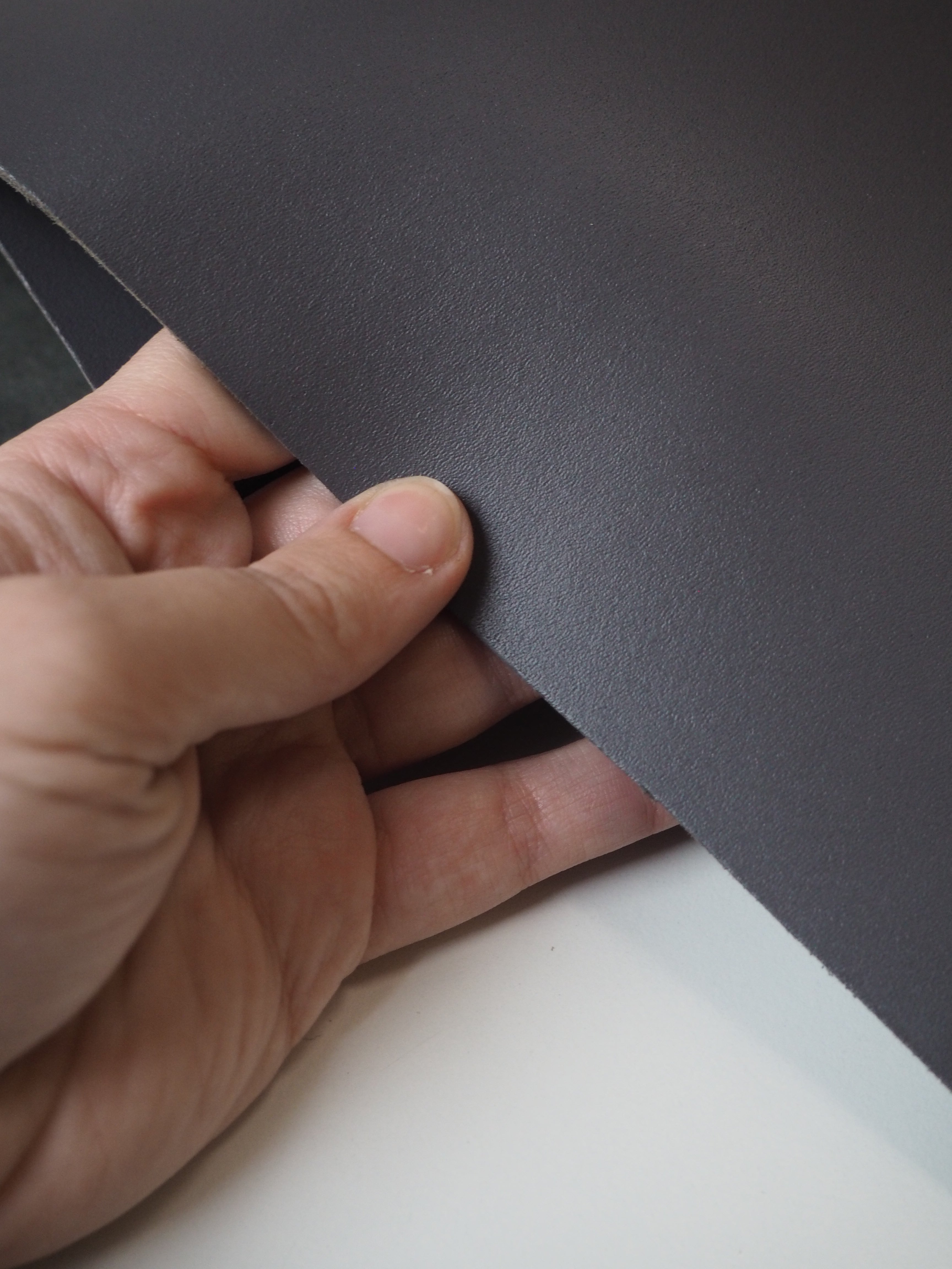 This ex-designer leather is a calfskin. It's a smooth leather with a light shine finish, a strong handle, and heavy weight. Has a great structure, in a medium grey colour. We would love to see this made up into accessories!