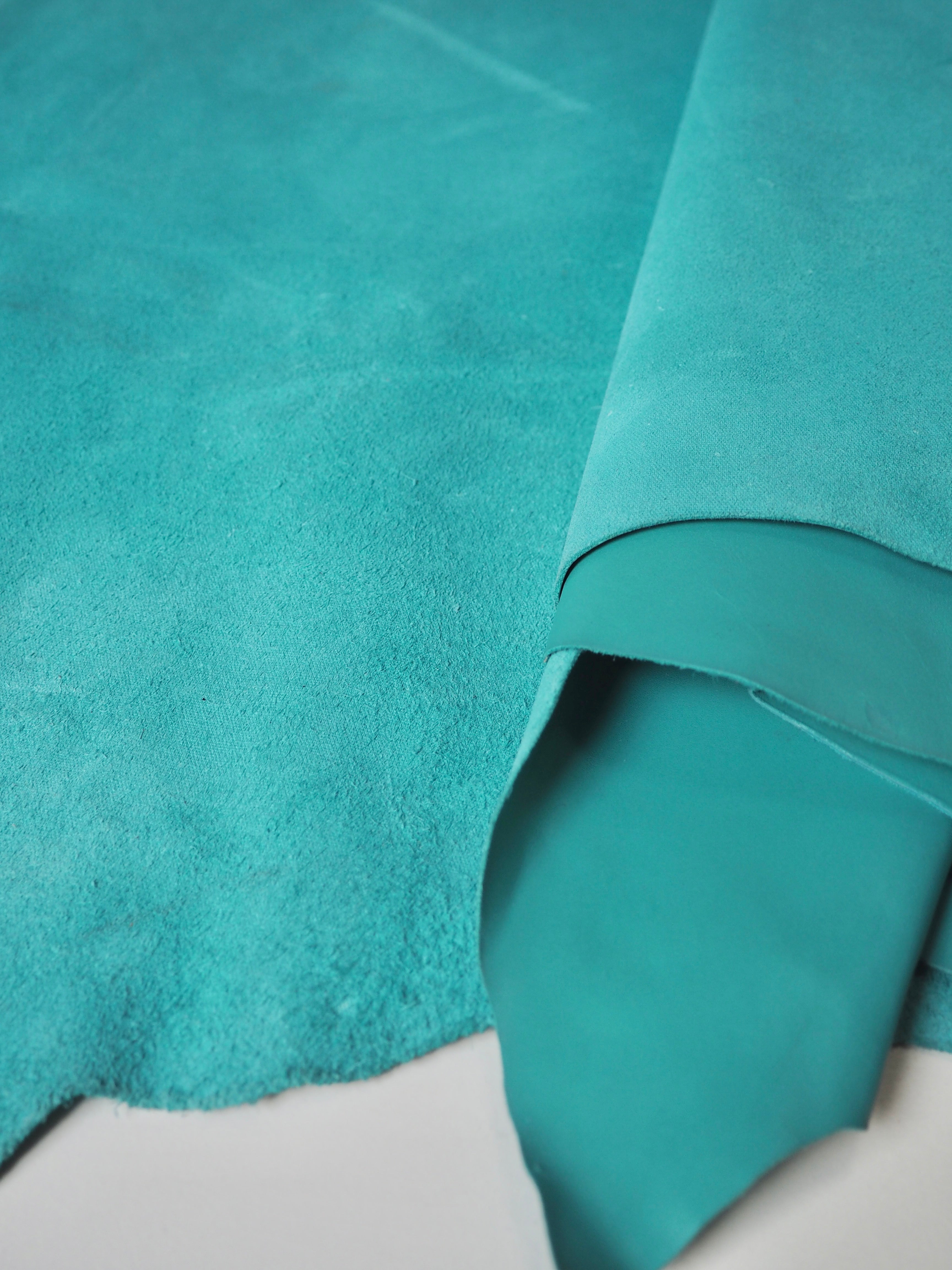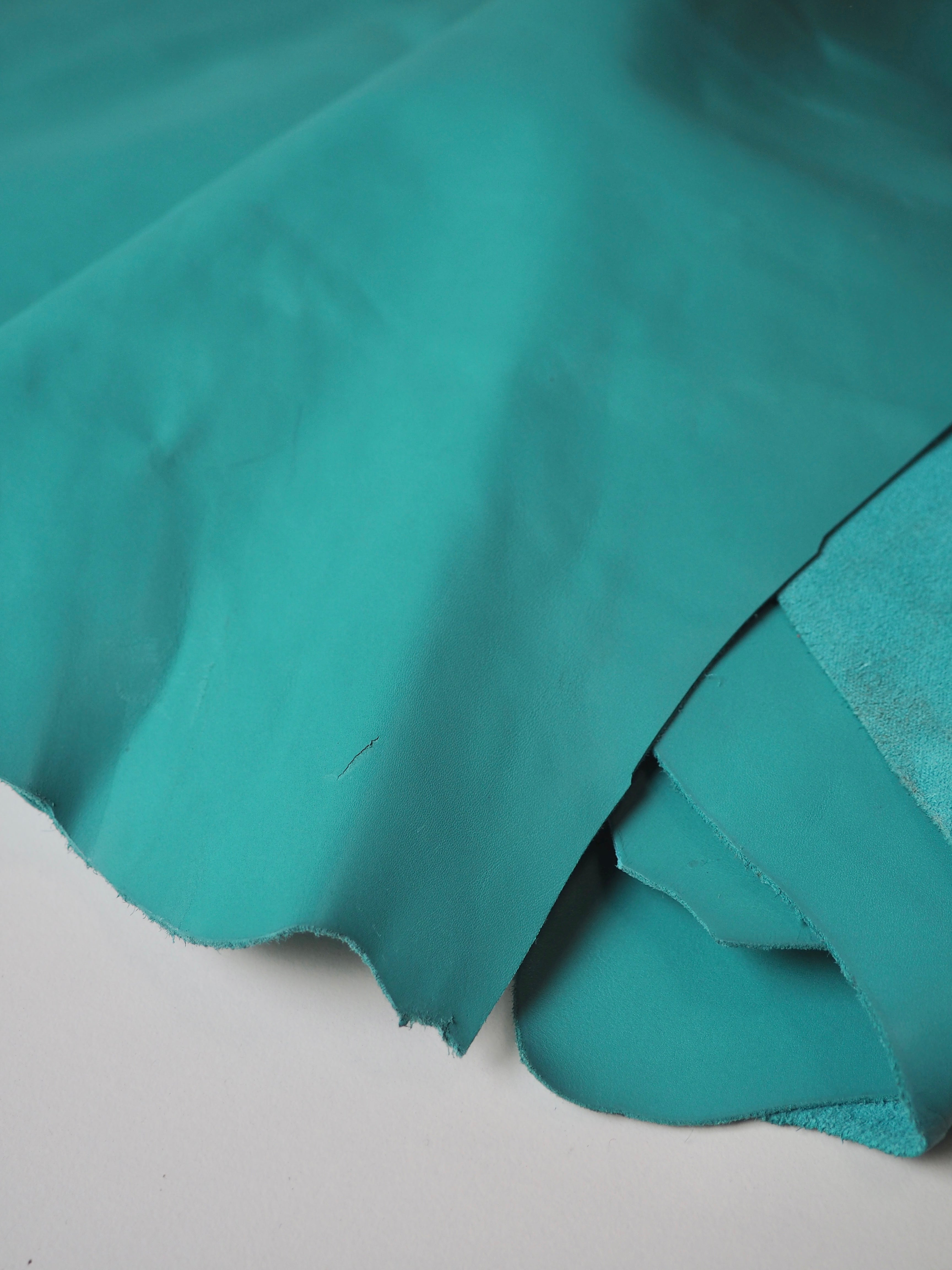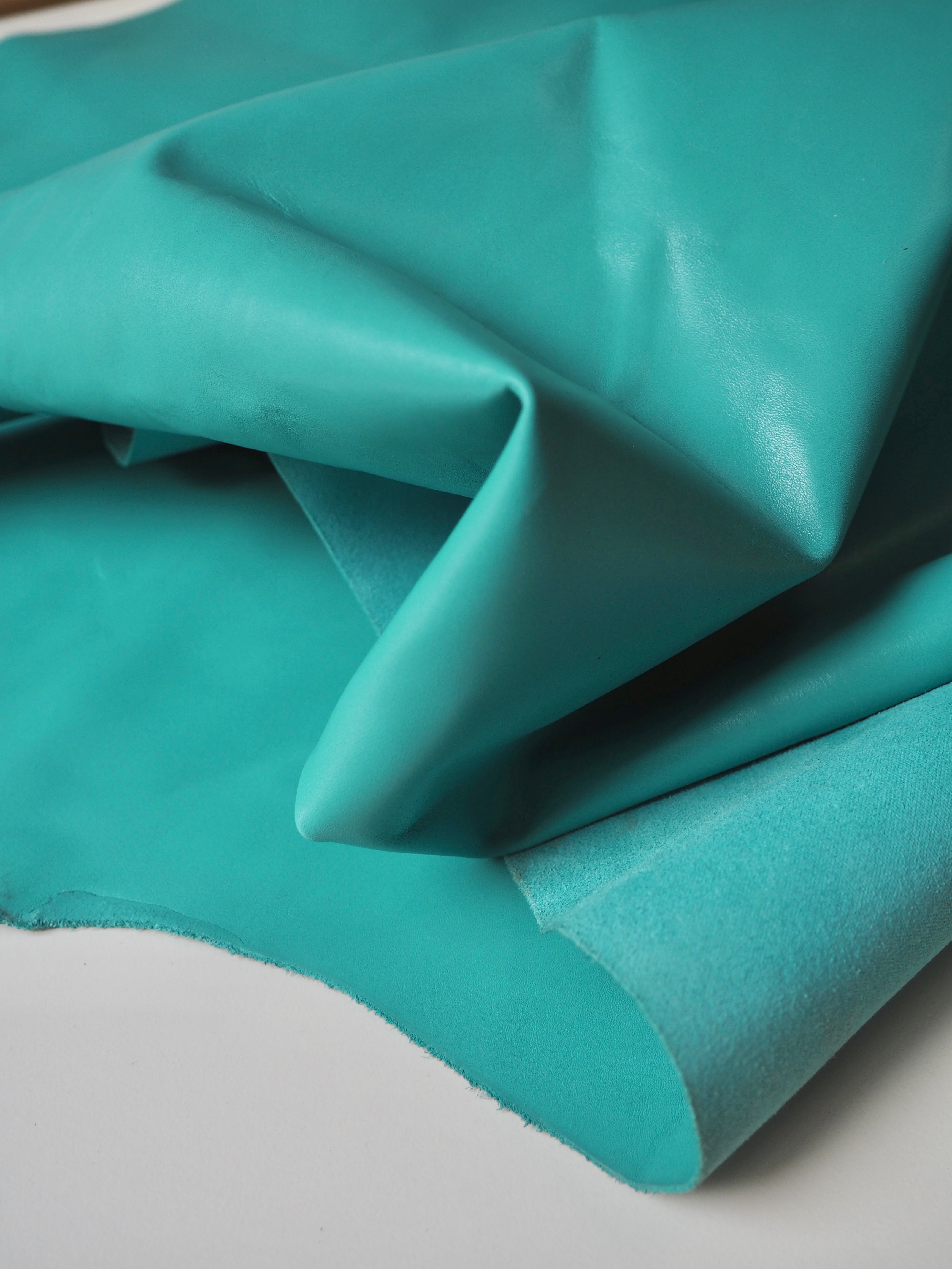 This ex-designer leather is a calfskin. It's a smooth leather with a light shine finish, a strong handle, and nice medium weight. Has a great structure, in a light turquoise blue colour. We would love to see this made up into a bag or purse!