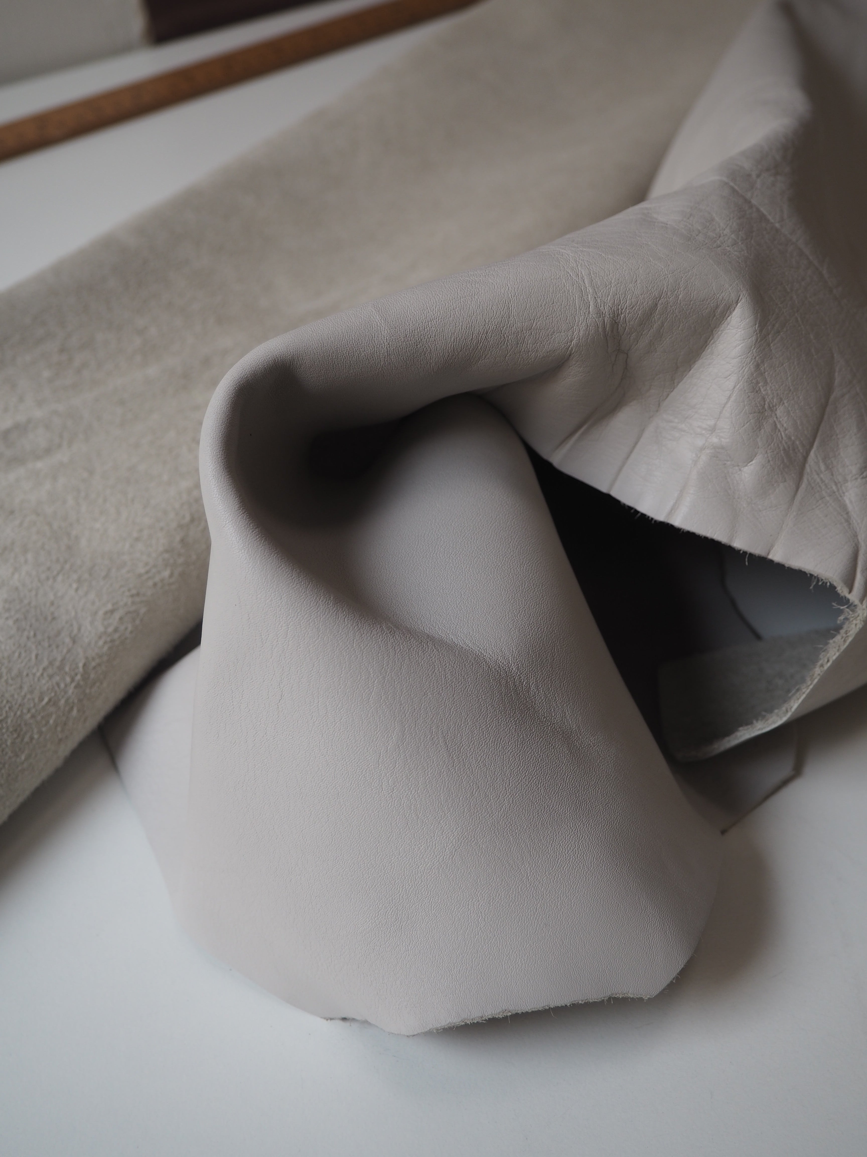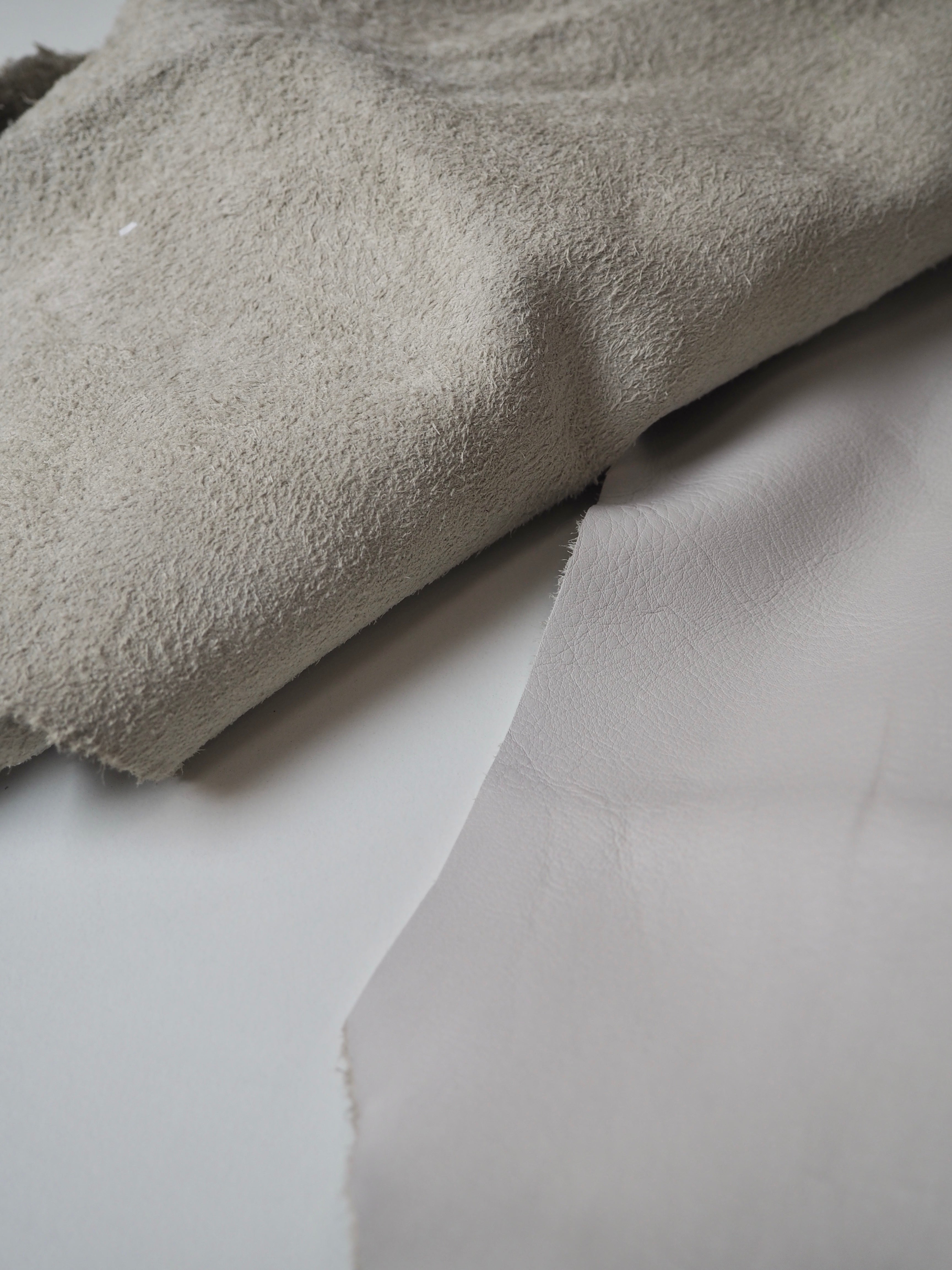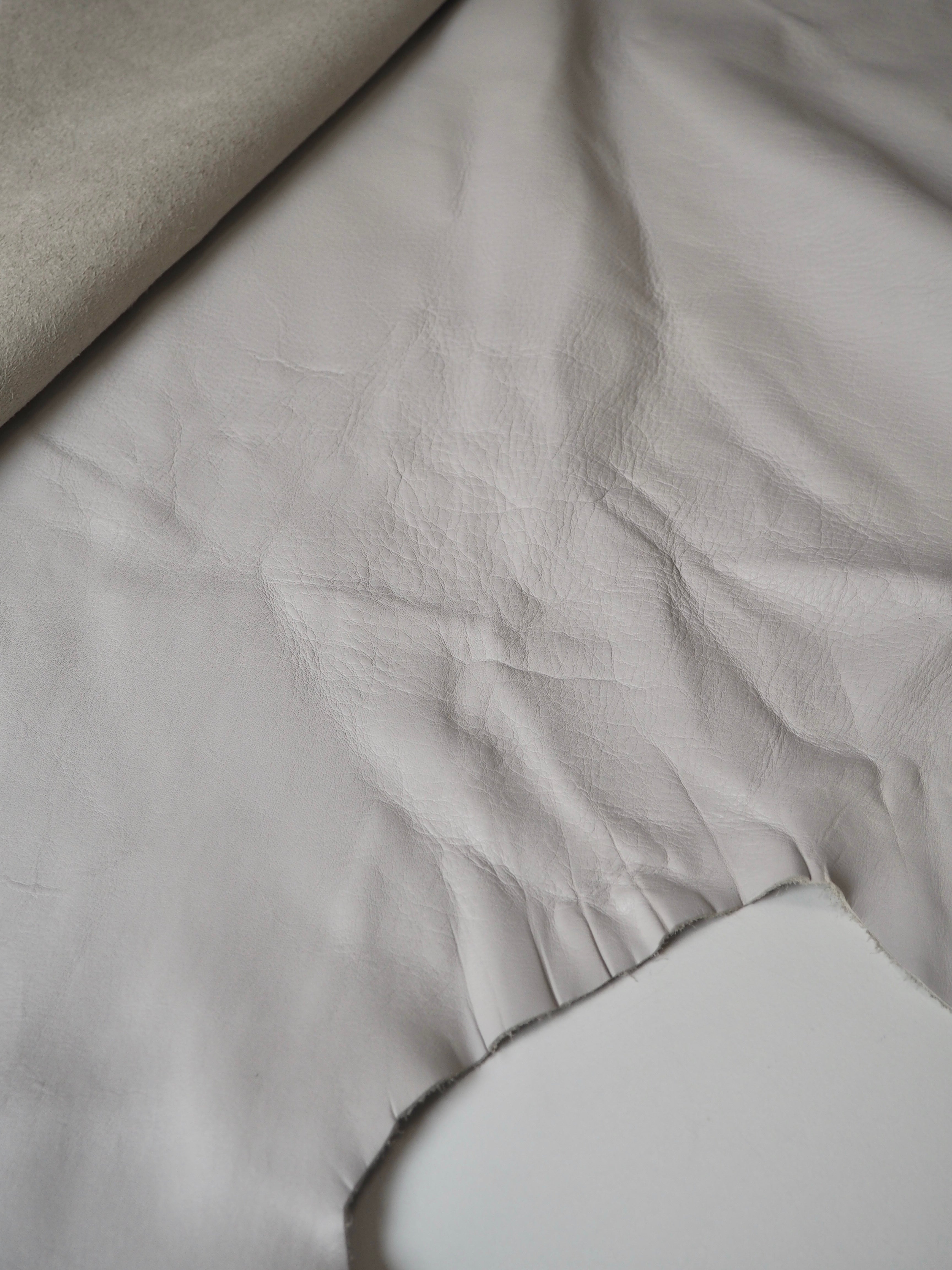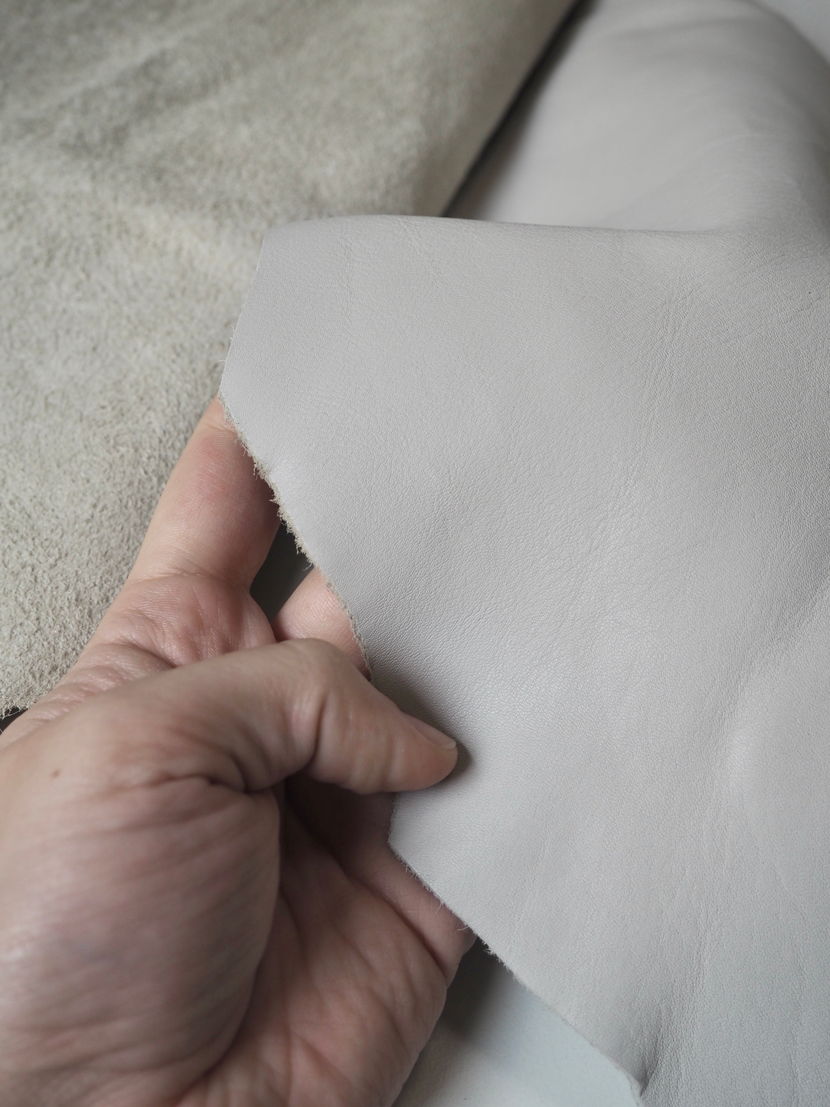This ex-designer leather is a calfskin. It's a top grain leather with a smooth finish, a sturdy handle, and nice medium weight. Has a soft reverse. In a very pale light grey colour. We would love to see this made up into a bag or purse! A few slight marks on each piece.