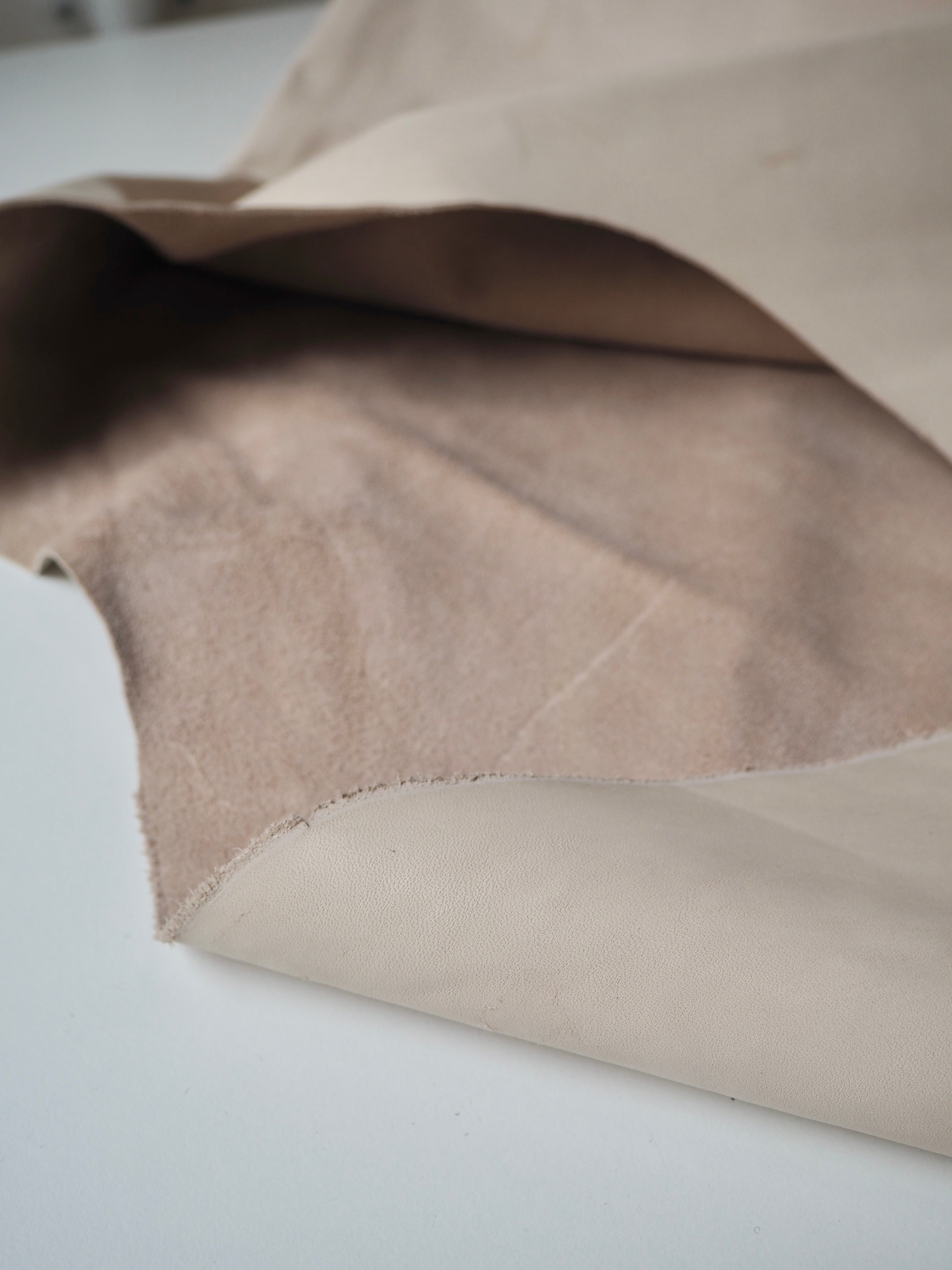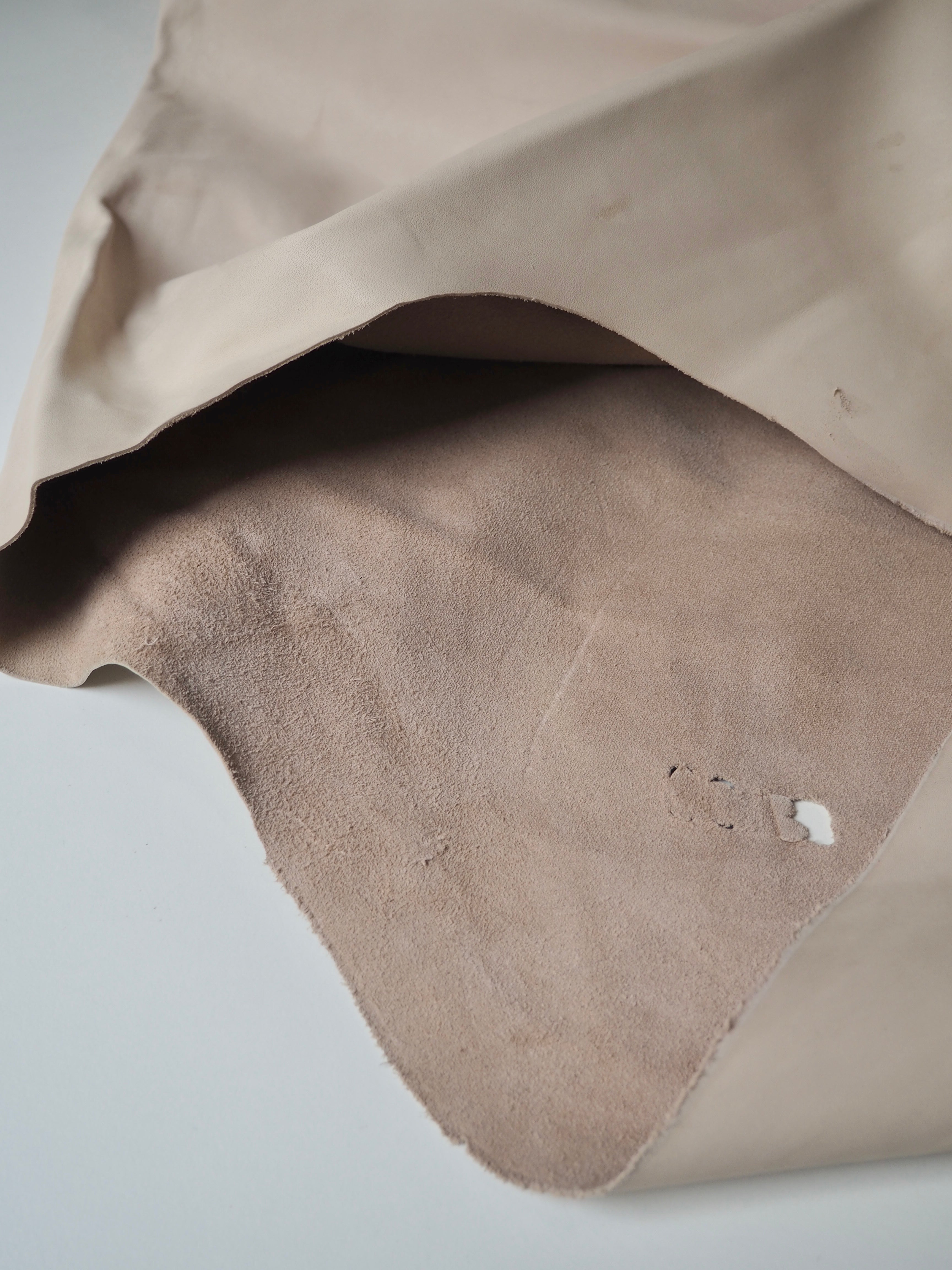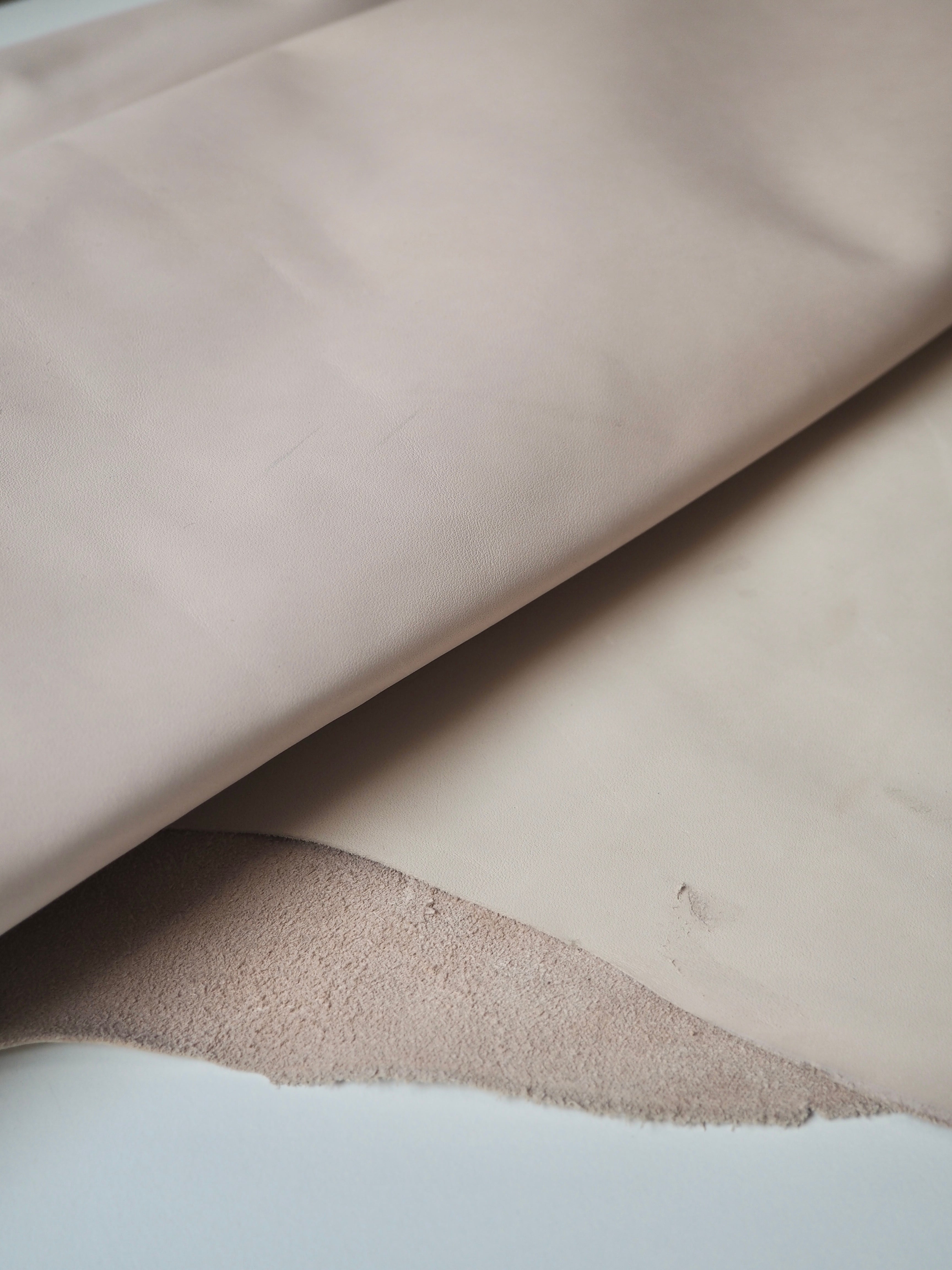 This ex-designer leather is a calfskin. It has a very smooth finish, with a very light sheen. It has a smooth topside and semi-suede soft underside. Has a crisp, medium structure, and is light to medium weight. We would love to see this made up into a bag or purse! This leather has a fold crease in the centre from the designer, as well as some slight marks. The price reflects this.