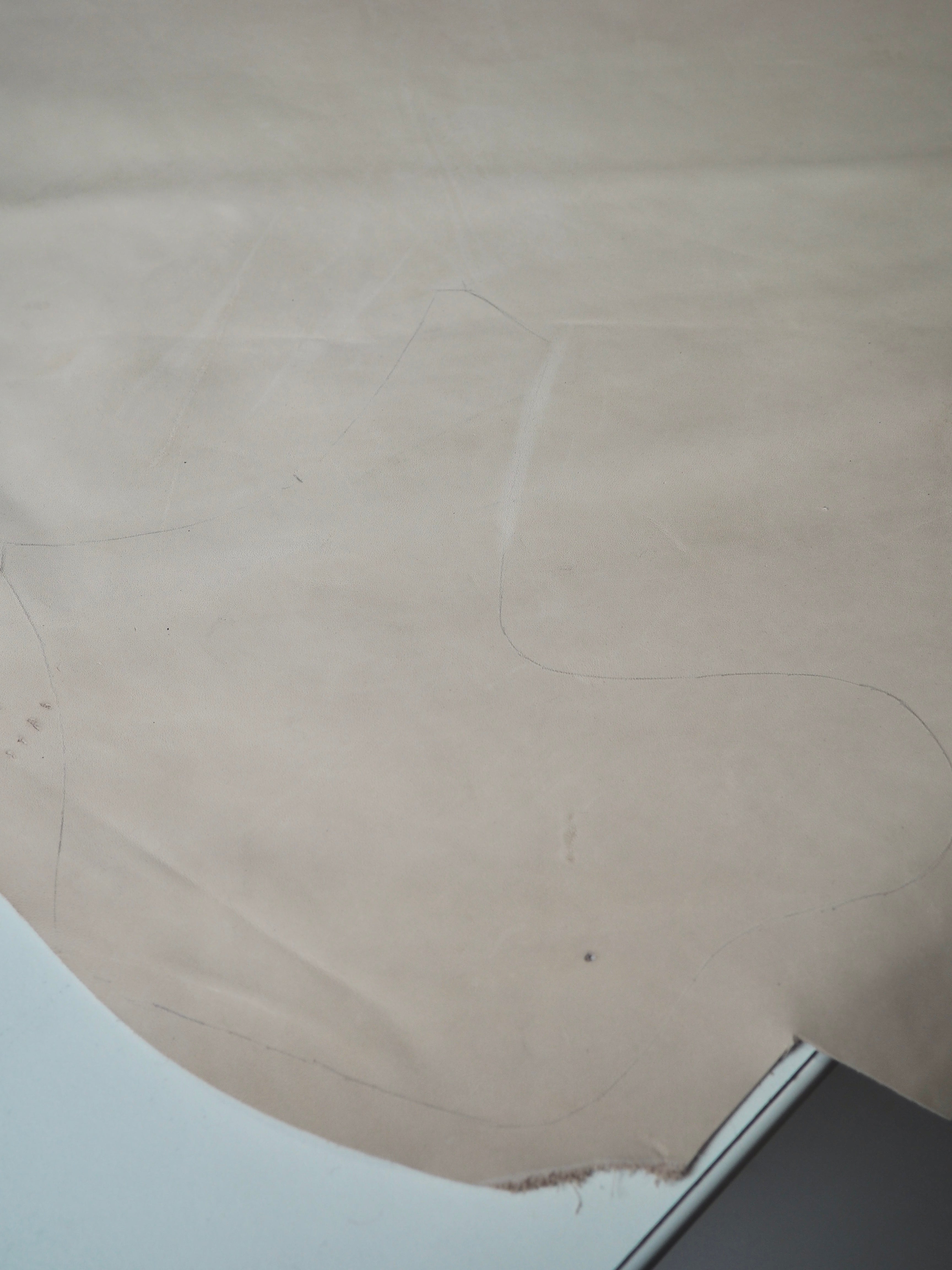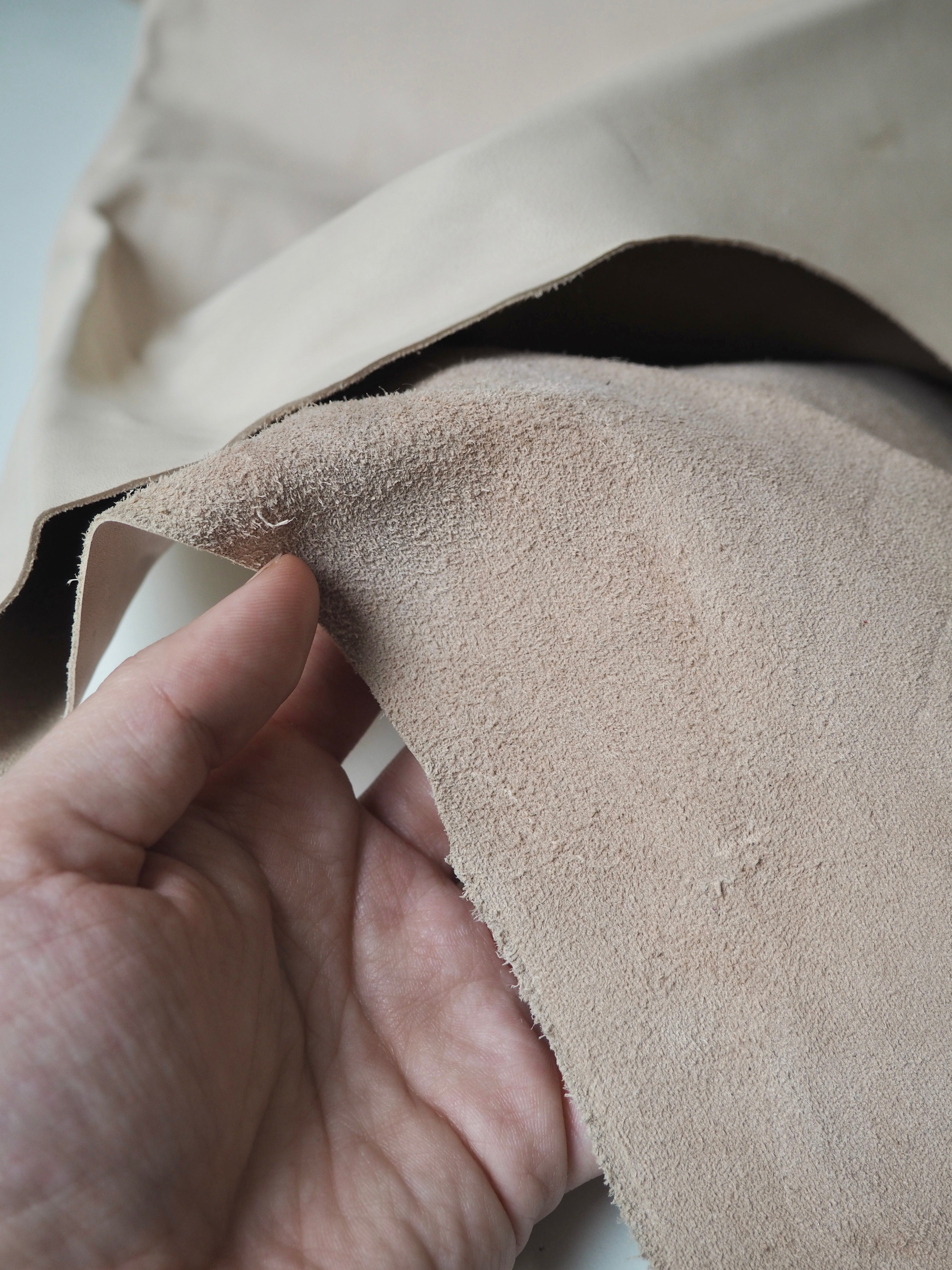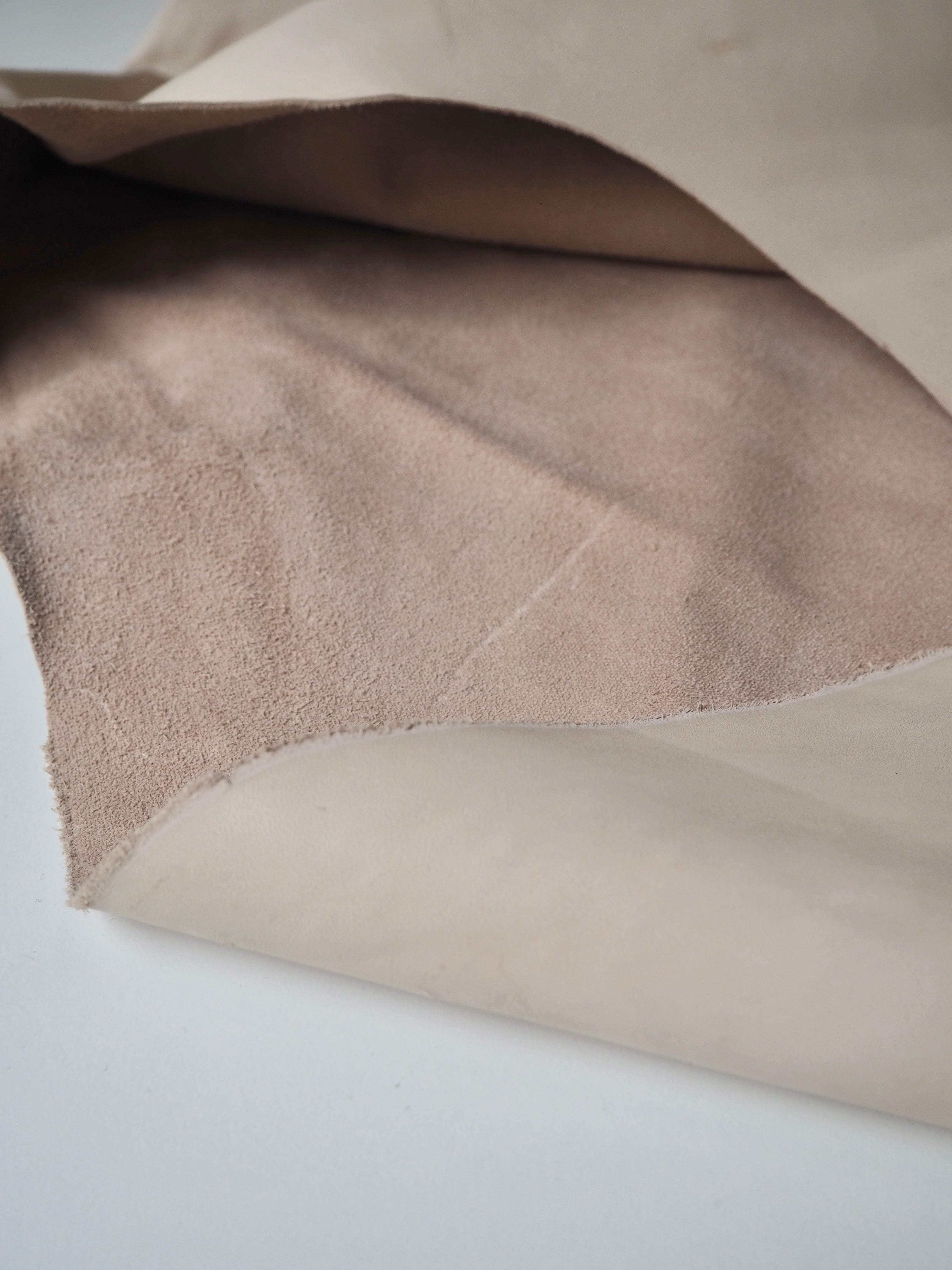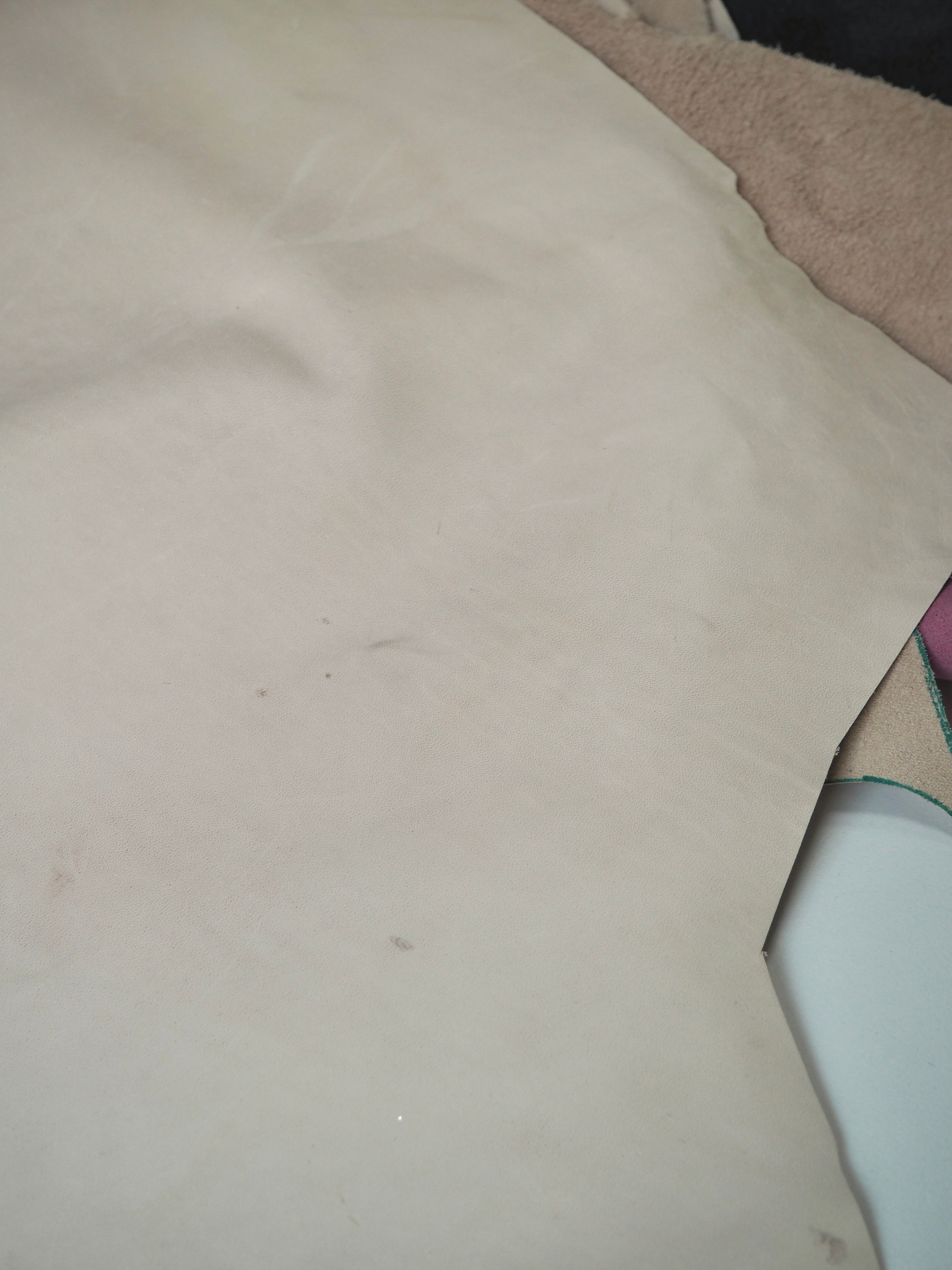 This ex-designer leather is a calfskin. It has a very smooth finish, with a very light sheen. It has a smooth topside and semi-suede soft underside. Has a crisp, medium structure, and is light to medium weight. We would love to see this made up into a bag or purse! This leather has a fold crease in the centre from the designer, as well as some slight marks. The price reflects this.
