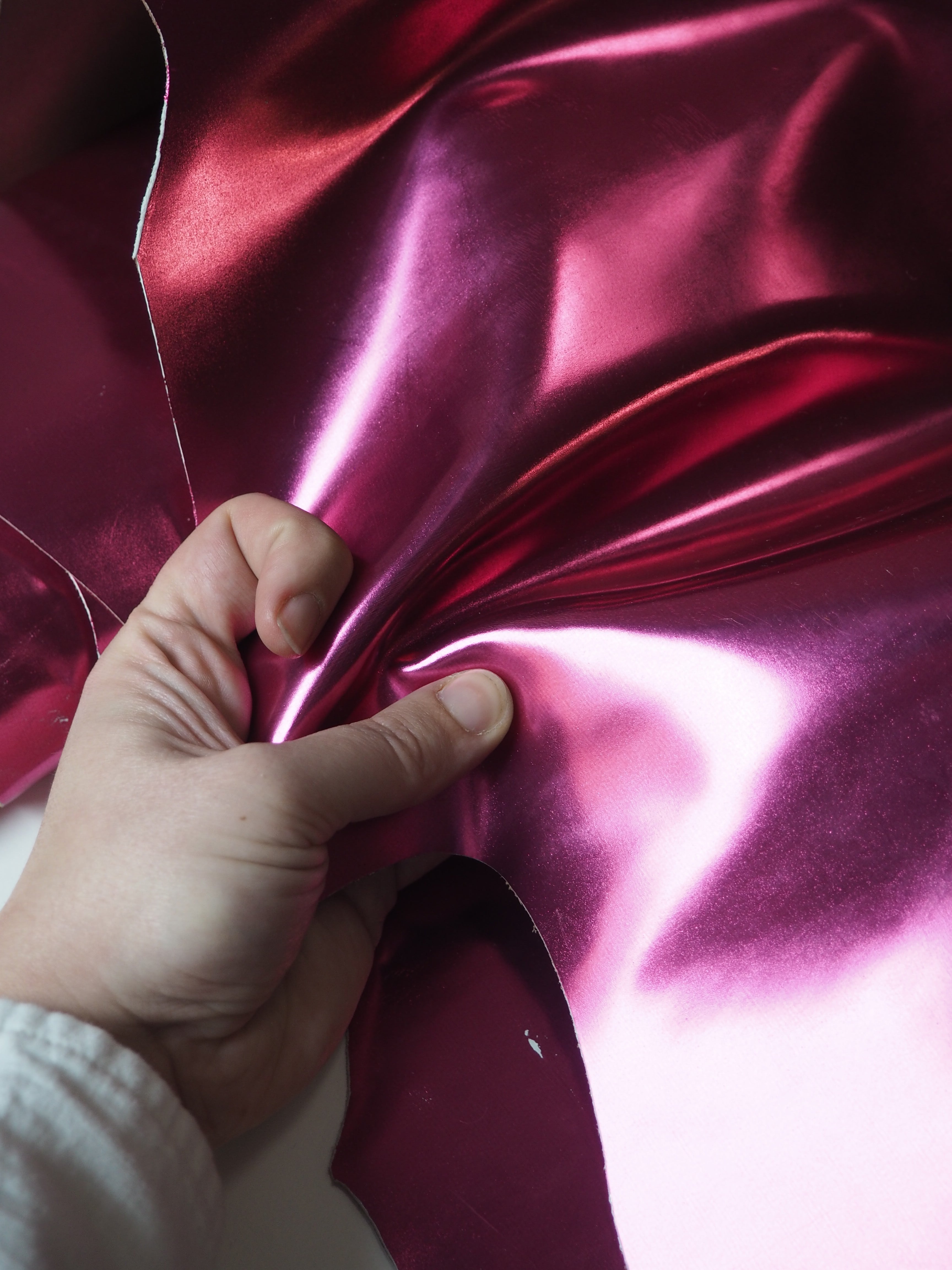 This ex-designer leather is a calfskin. It's a metallic medium pink leather with an extra shiny finish. Has a great structure, and is light to medium weight. We would love to see this made up into a bag or purse!