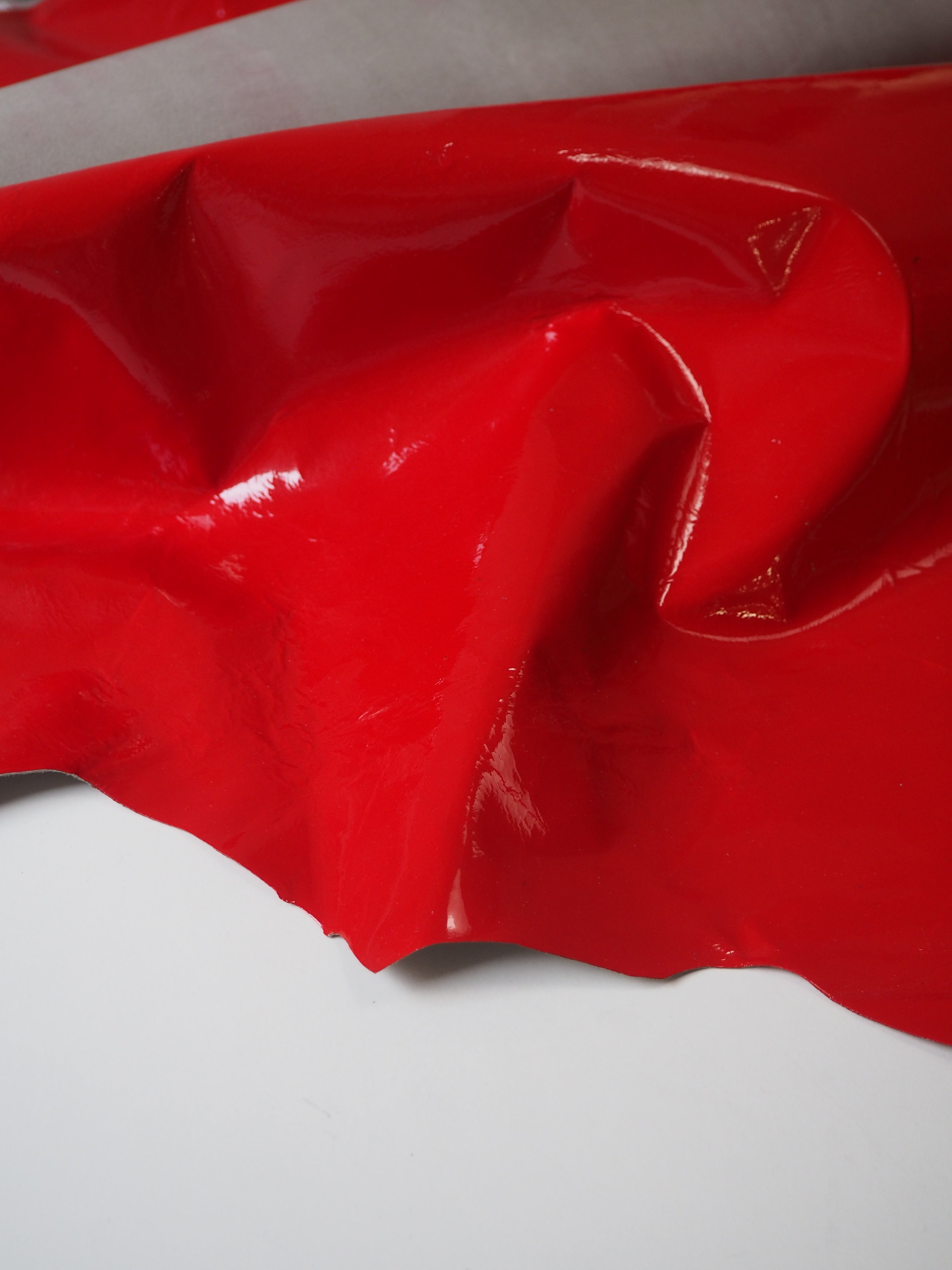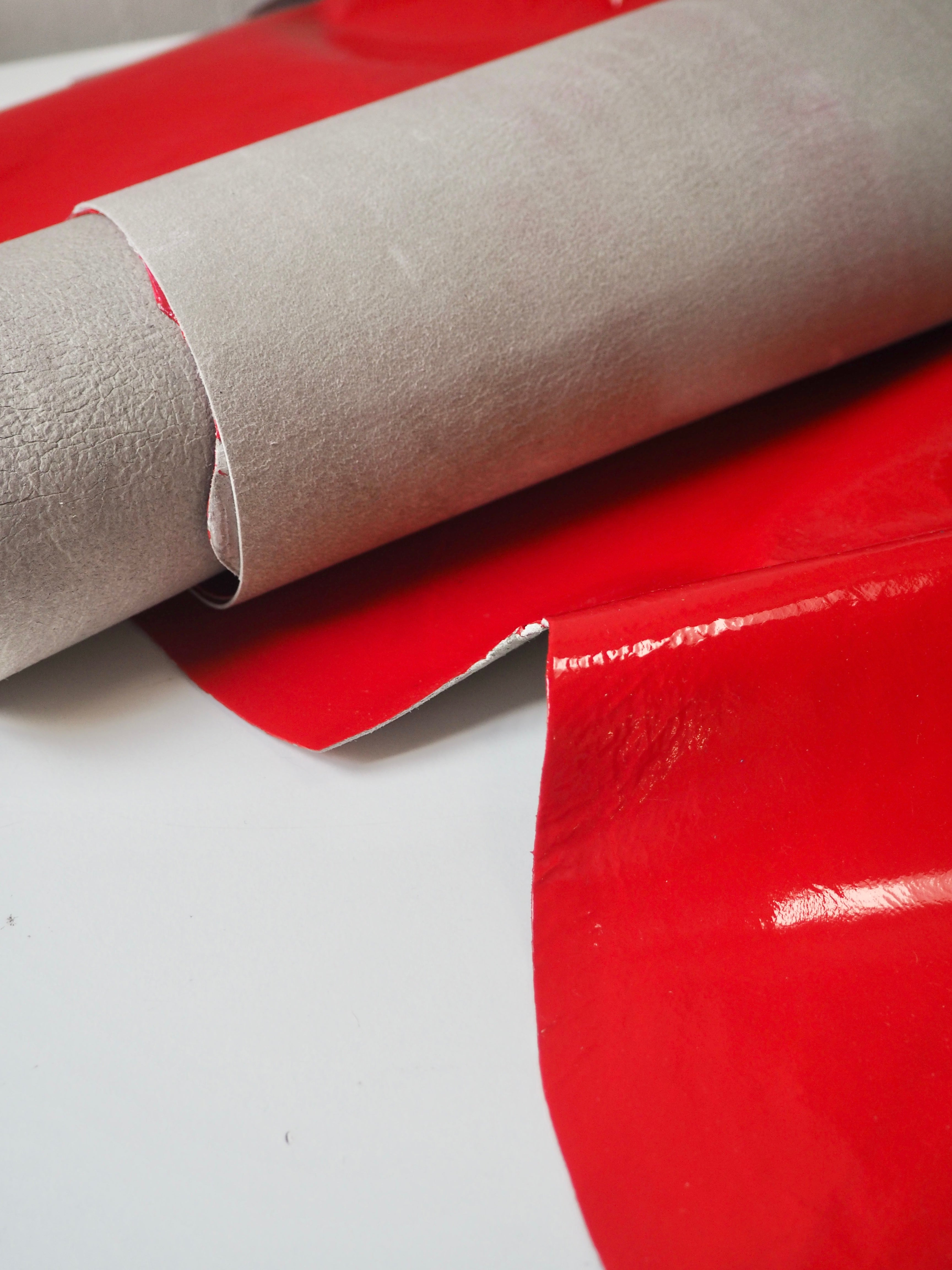 This ex-designer leather is a lambskin. It's a bright eye-catching red patent finish, with a semi-supple handle. It's smooth and very shiny, with some slight colour transfer/staining on the reverse of each hide. It's beautiful quality and very flexible. Lightweight with a lovely gentle structure, perfect for a variety of projects! Great for shoes/boots and accessories, or even a bag!