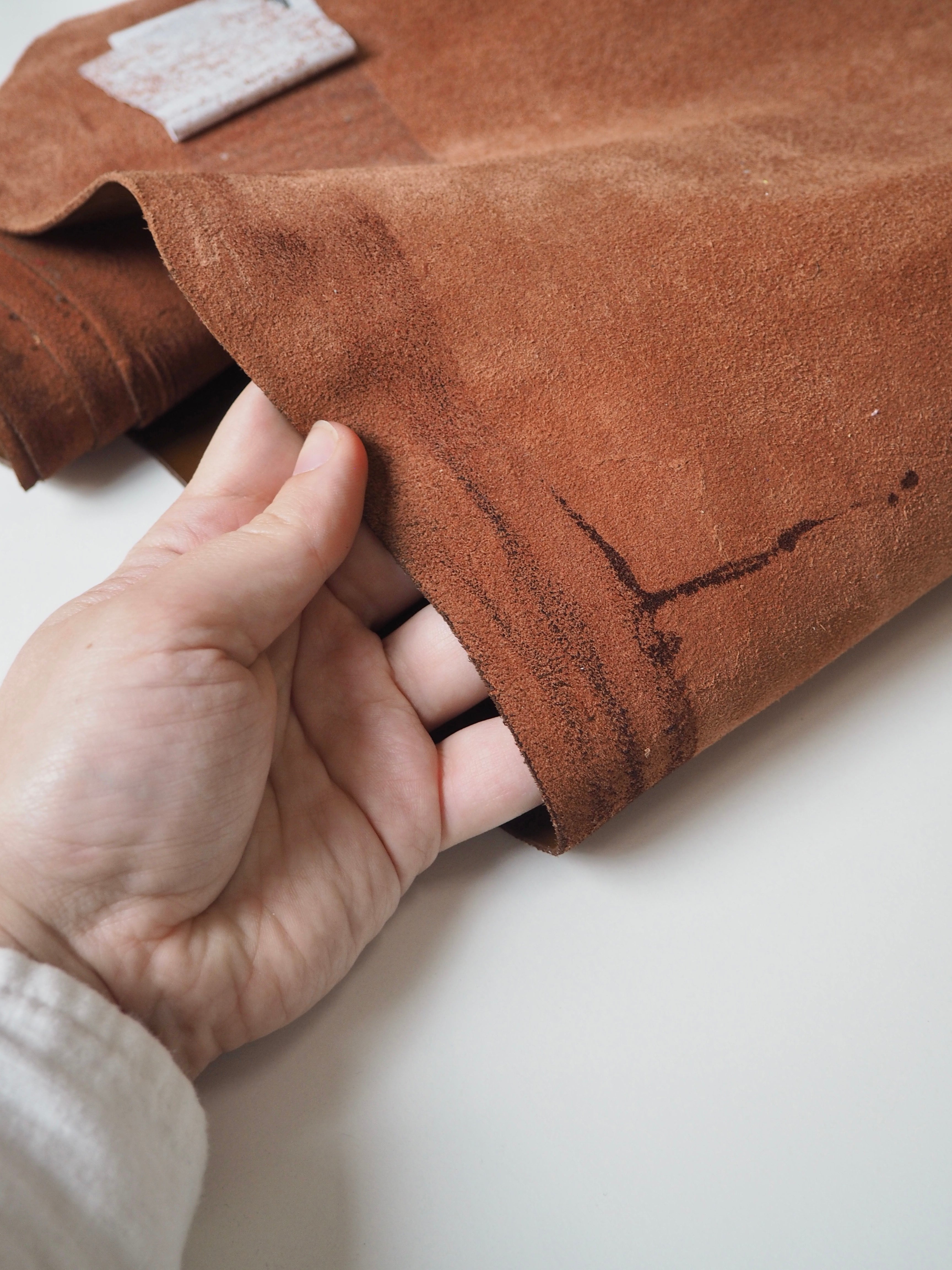 This ex-designer leather is a calfskin. It's a mocha brown leather with a shiny finish. Has a flexible structure, drapes quite well, and is light to medium weight. We would love to see this made up into a bag or purse!