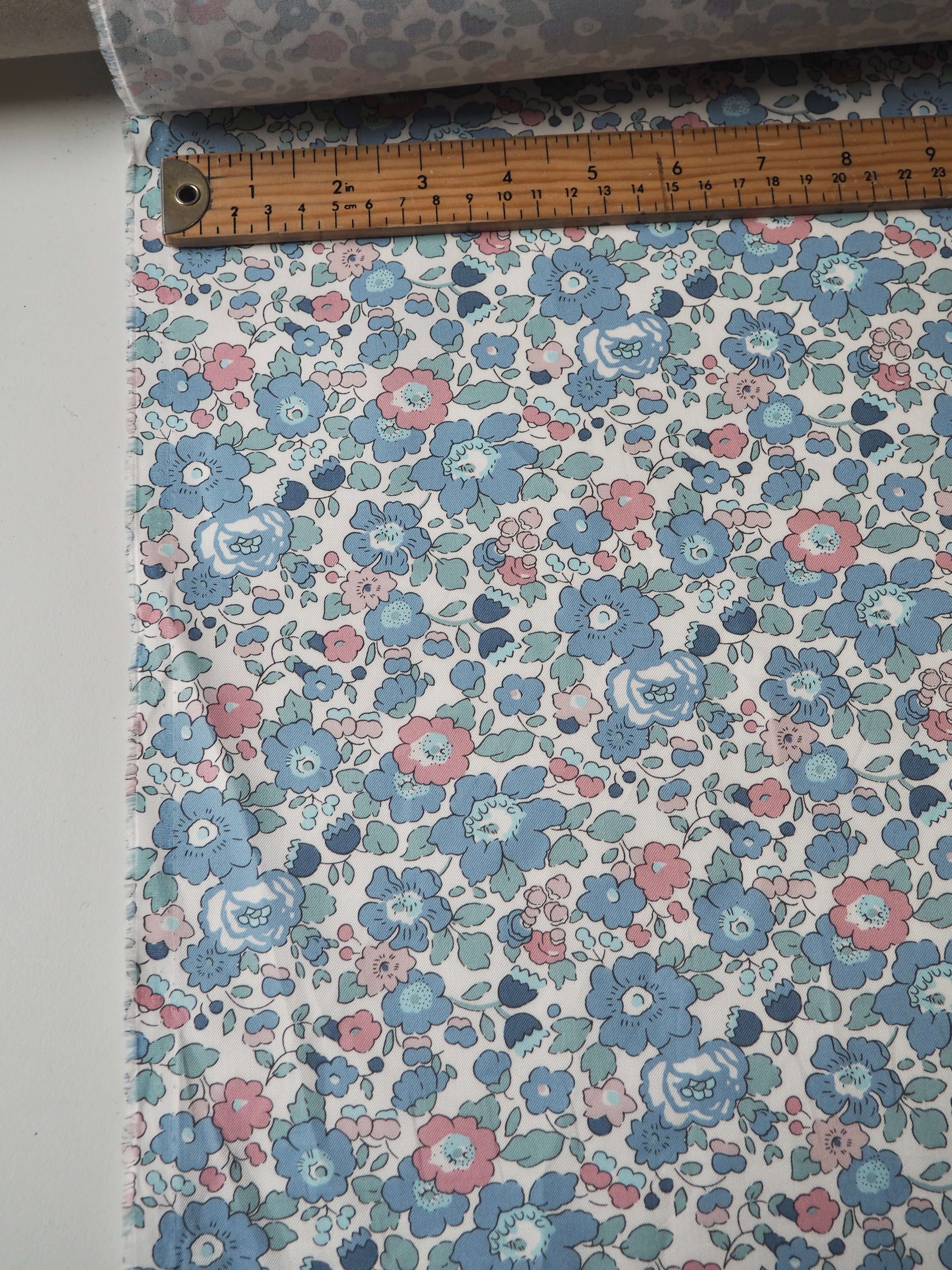 This ex-designer fabric is a classic Liberty cotton twill. It's a classic Betsy medium scale floral print. A top-quality Liberty cotton in a light to medium weight. Soft with a lovely drape and slight crispness. Has a wonderful cotton handle and a slight sheen. Fully opaque! We would love to see a light jacket or bag!