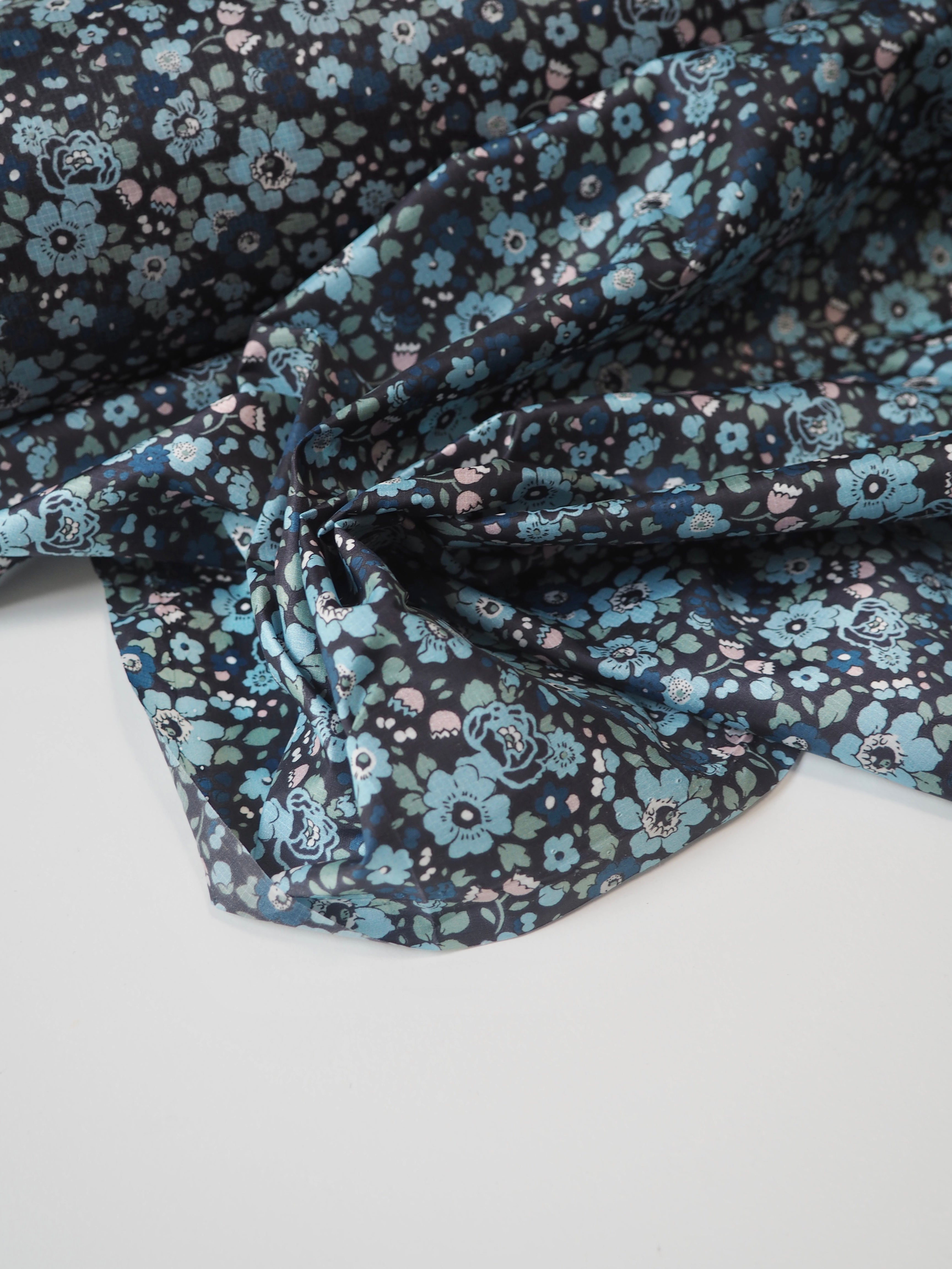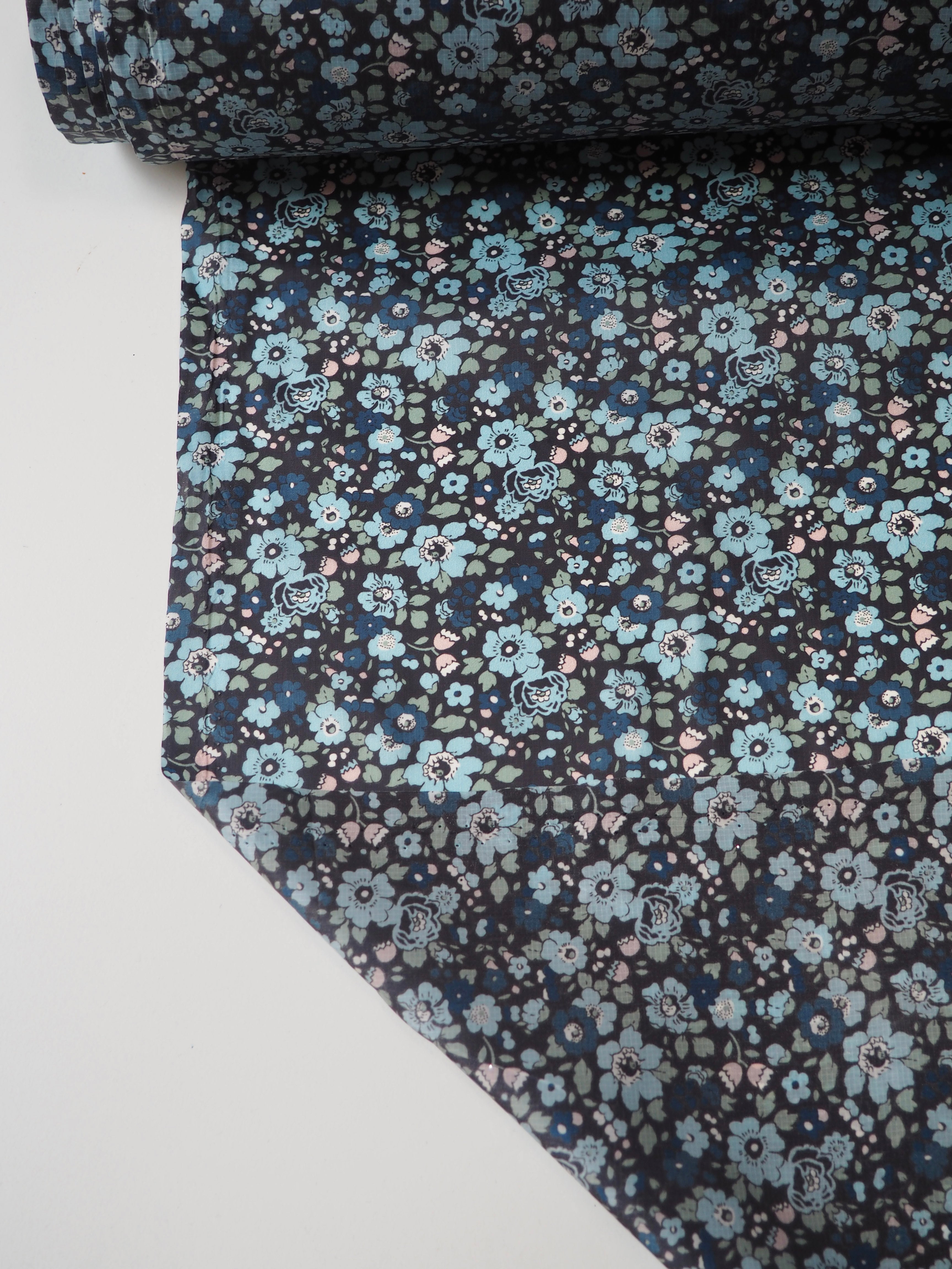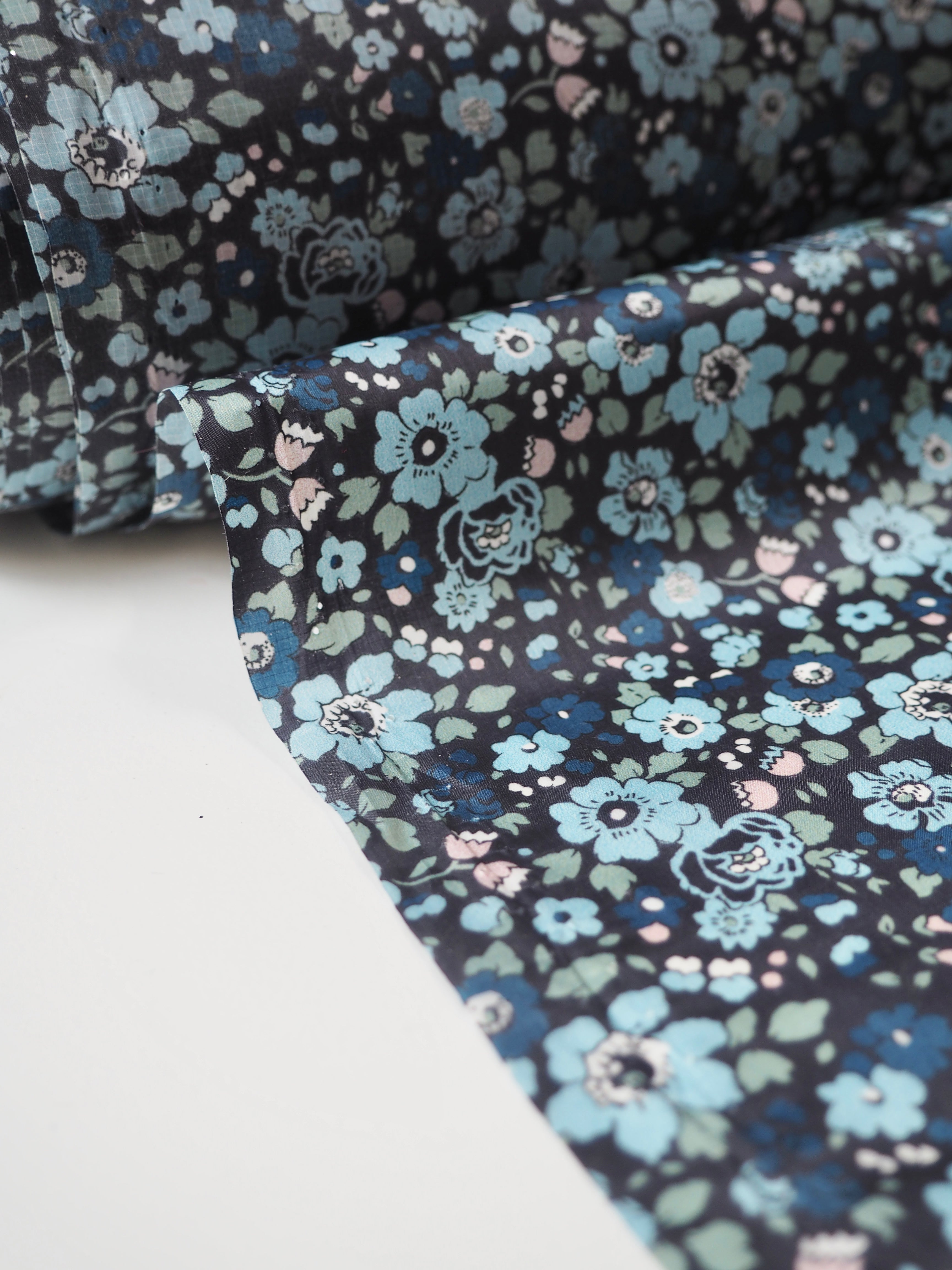 This ex-designer fabric is Liberty ripstop. Liberty doesn't usually sell ripstop, so this is a unique opportunity! It's in a medium blue and black Betsy print. It is super lightweight and hangs beautifully. Fully opaque. Quite rustle-y to handle. Ripstops have a cross weave pattern of strengthening fibres, which make them very sturdy and perfect for reusable bags, packing cubes, rain parkas, and easy crossbody bags!