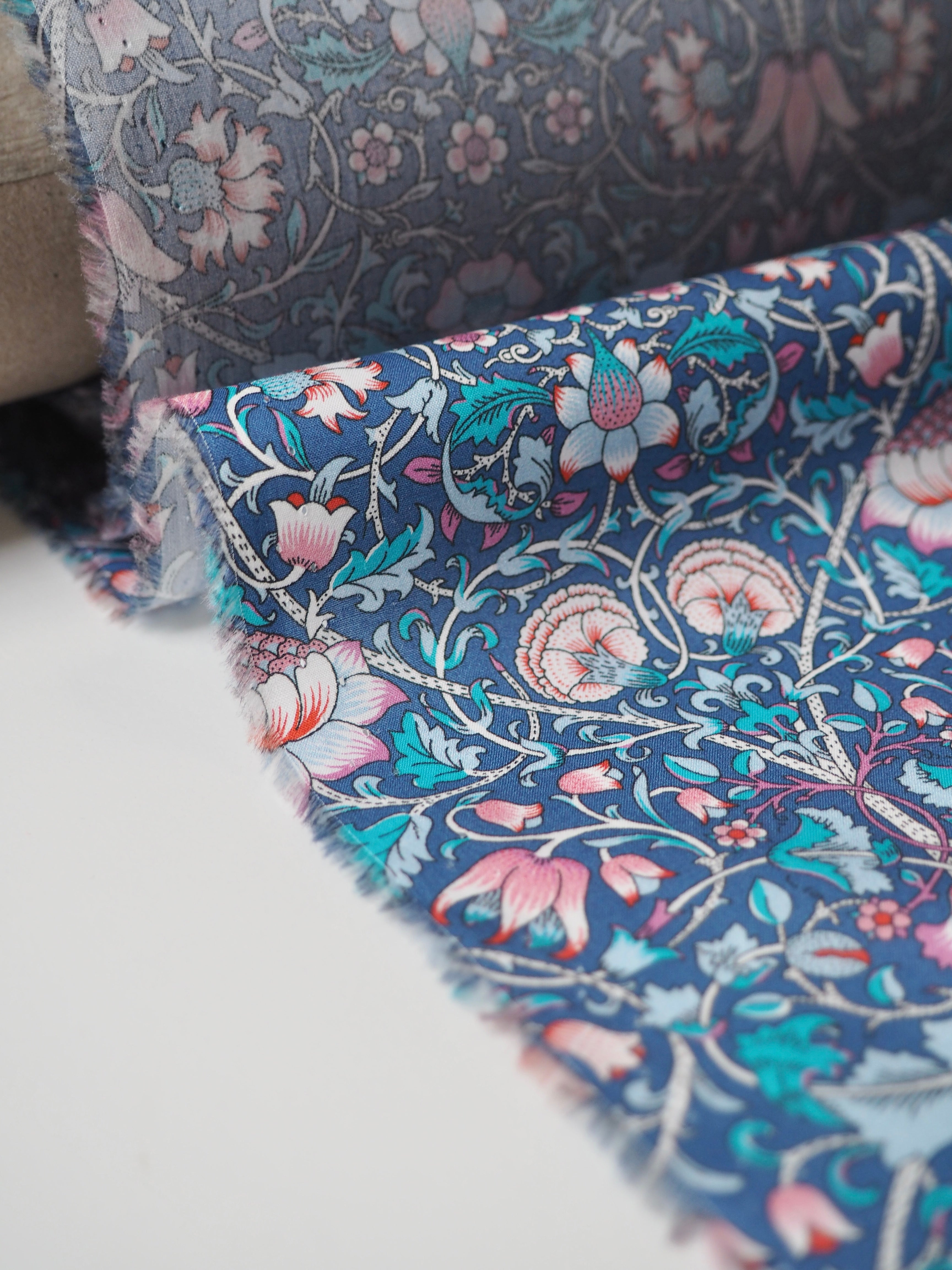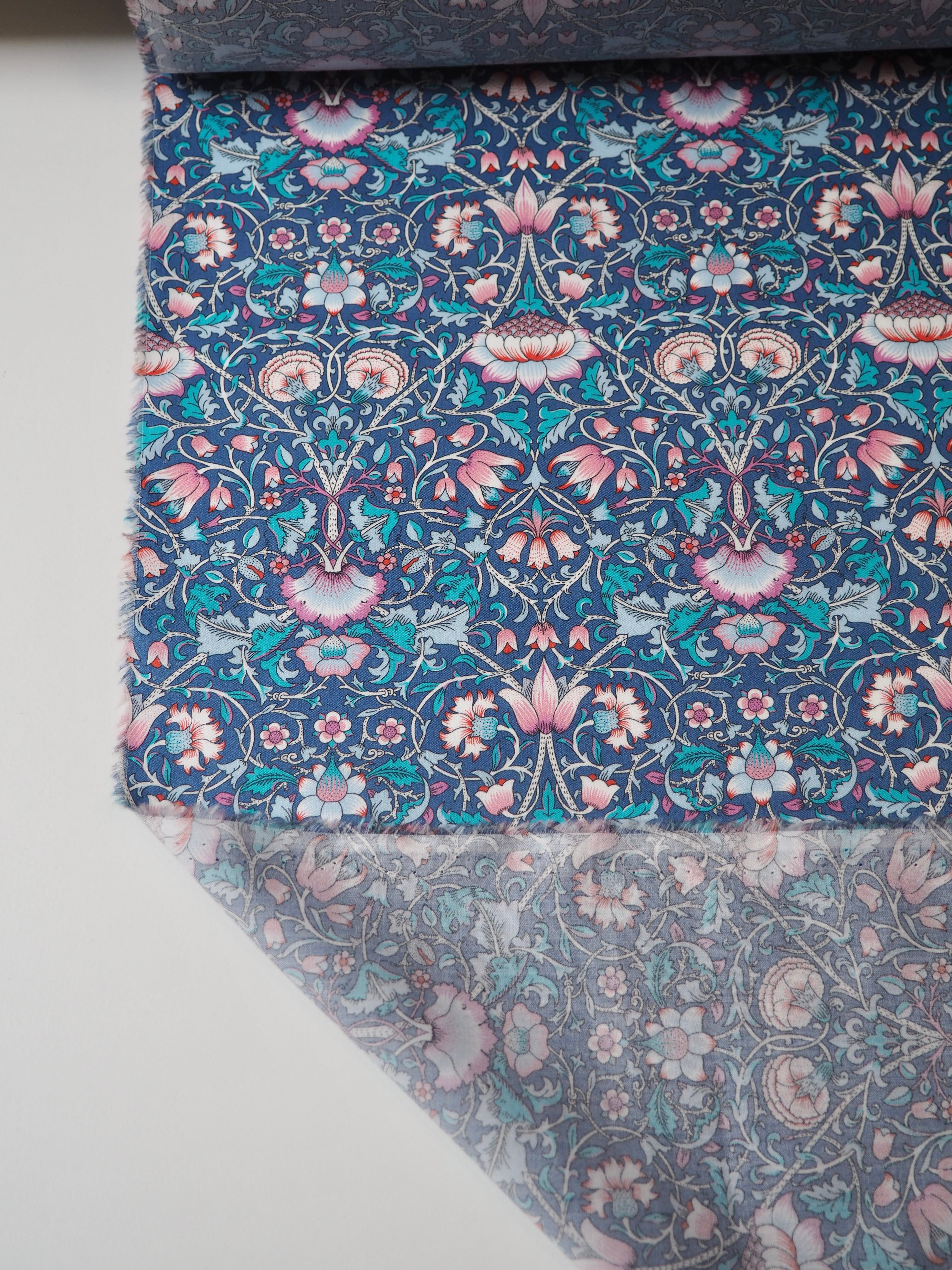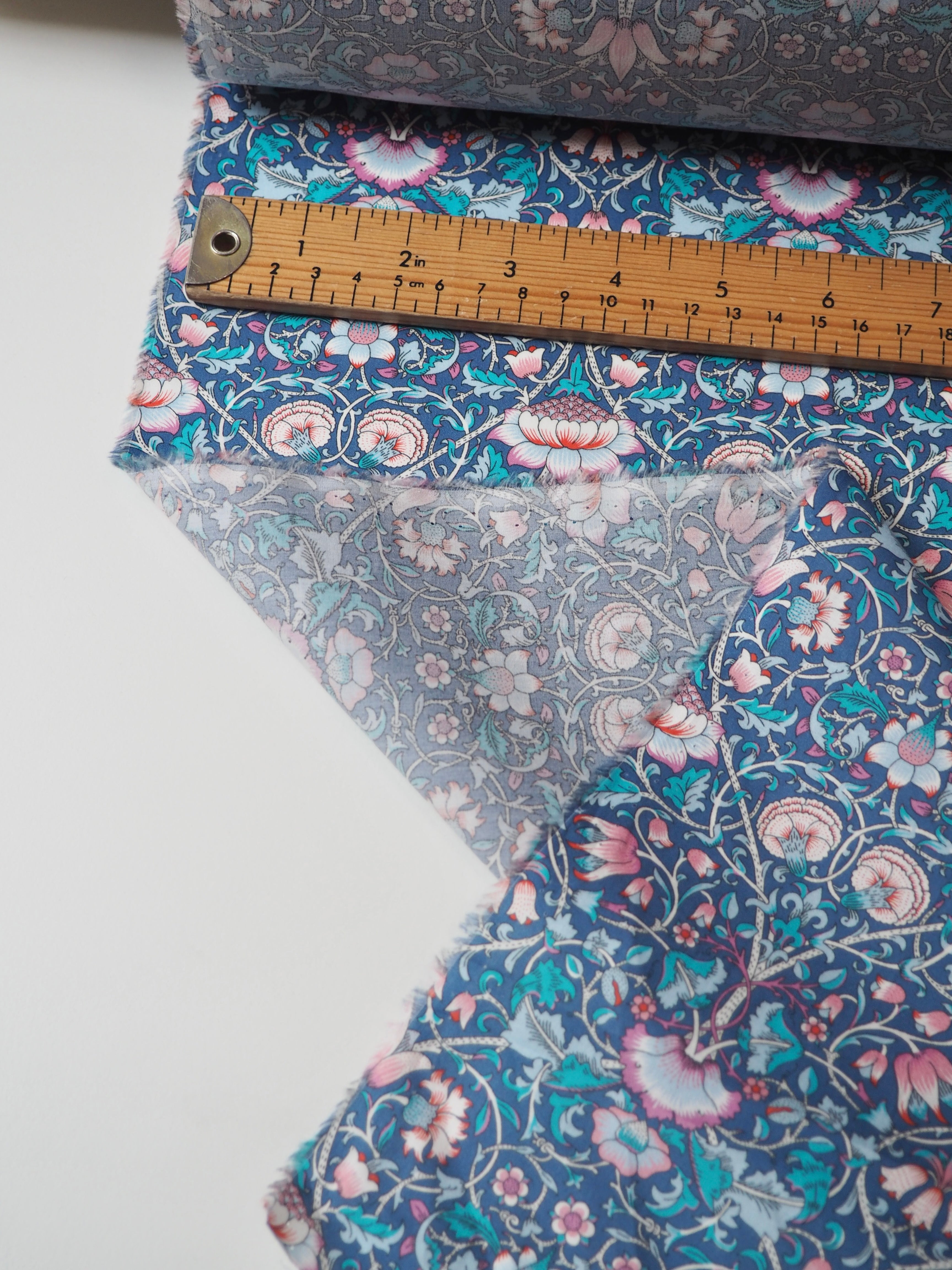 This ex-designer fabric is a classic Liberty Tana Lawn. It's in the classic Lodden print in a blue and pink colourway. A top-quality Liberty cotton, and super lightweight! Soft with a lovely drape and slight crispness. Has a wonderful cotton handle. Mostly opaque but lets a little light in. We would love to see it in a blouse or even for quilting!