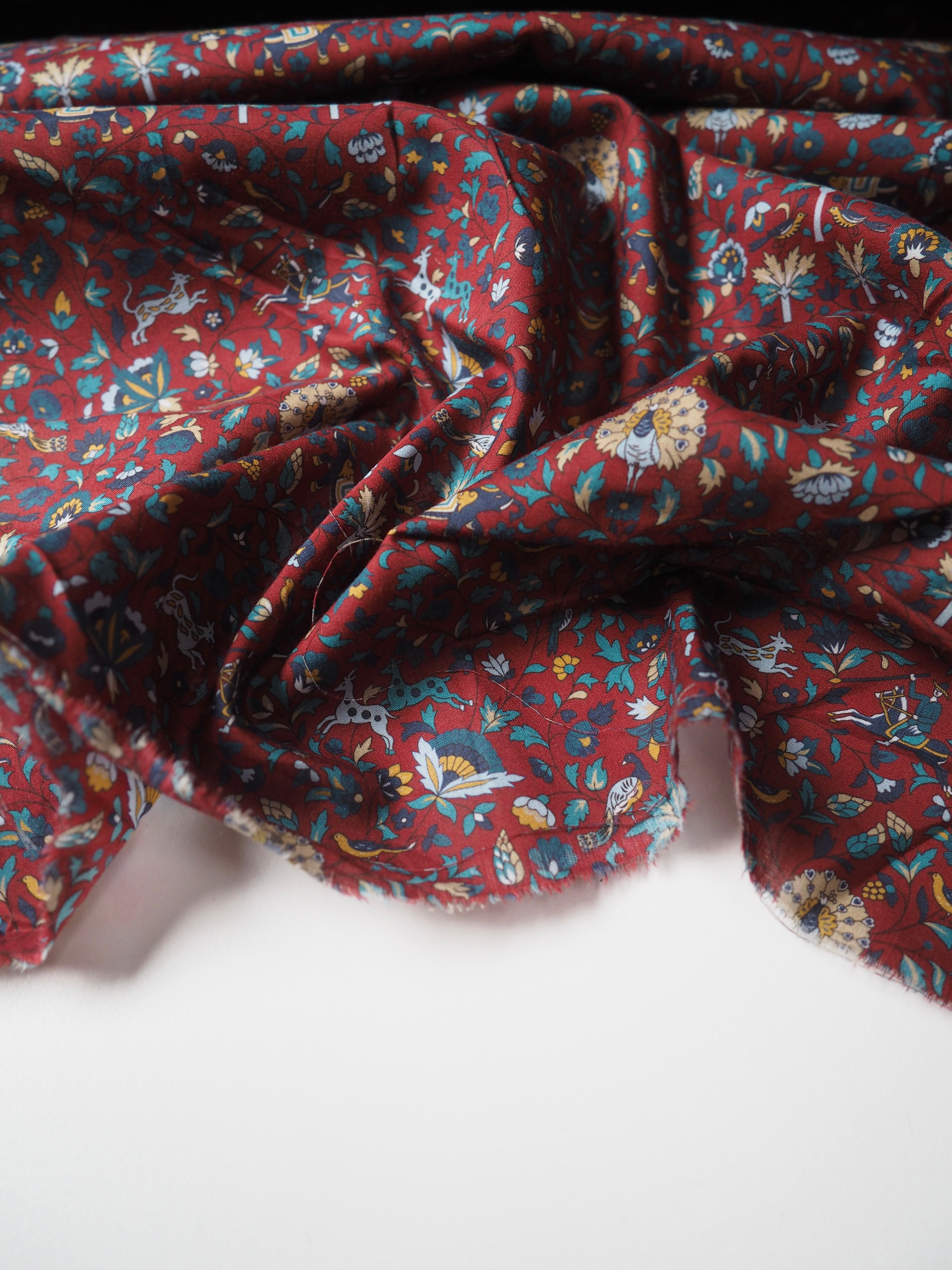 This ex-designer fabric is a classic Liberty Tana Lawn. It's in a classic burgundy Imran print of elephants, peacocks, and leaves. A top-quality Liberty cotton, and super lightweight! Soft with a lovely drape and slight crispness. Has a wonderful cotton handle. Mostly opaque but lets a little light in. We would love to see it in a blouse or even for quilting!