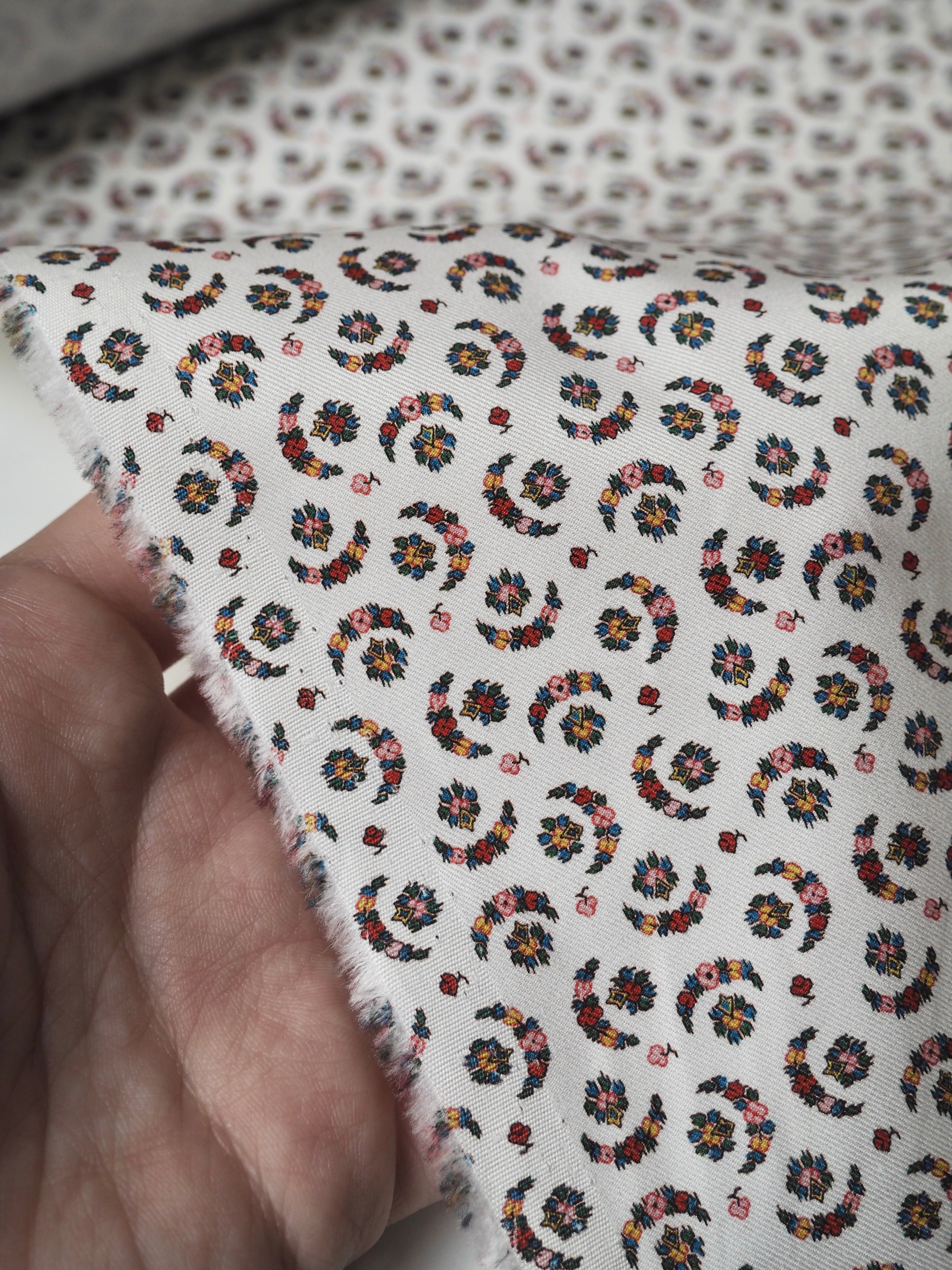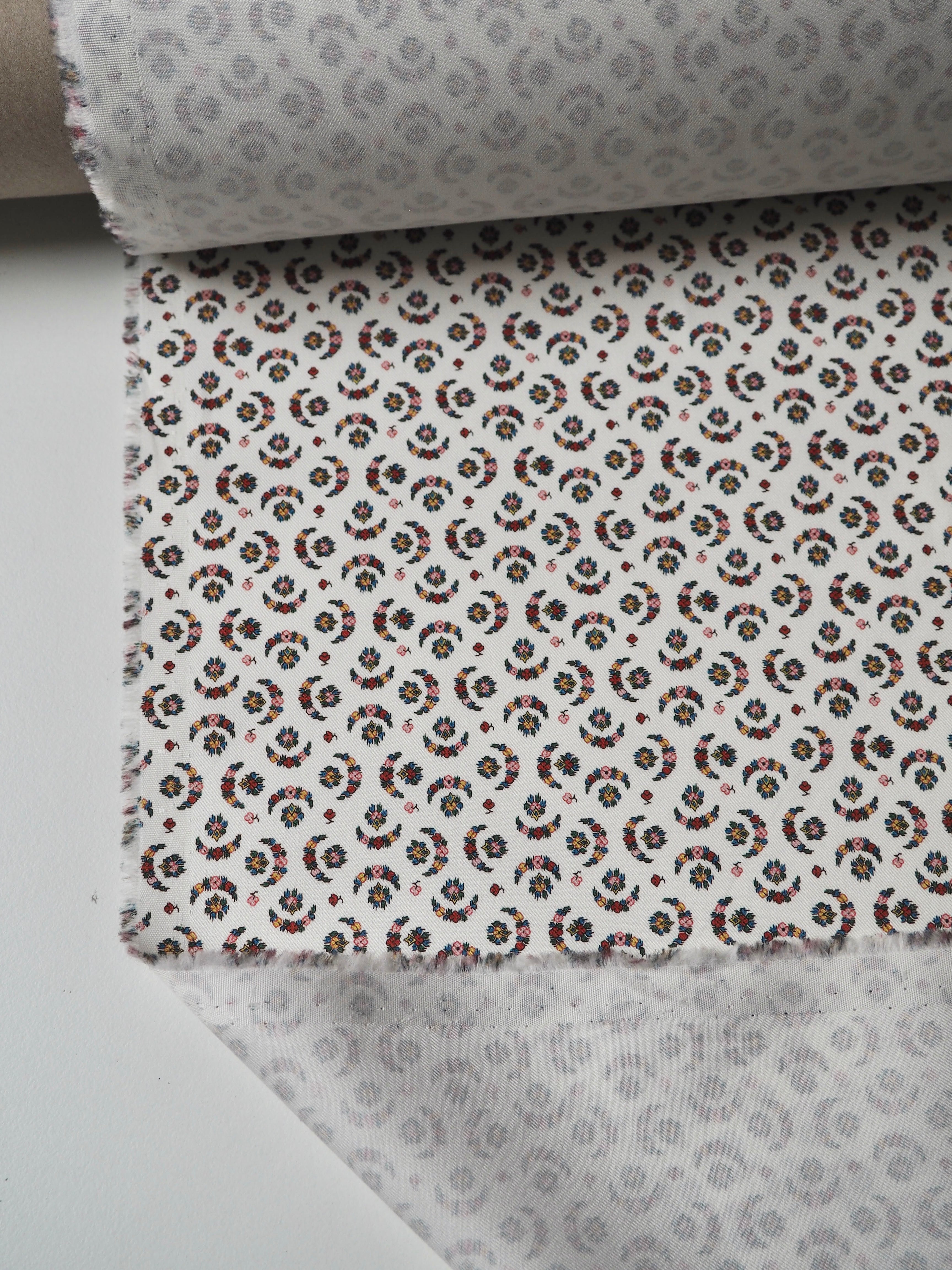 This ex-designer fabric is a classic Liberty cotton twill. It's a moon and flower print in small scale. A top-quality Liberty cotton in a light to medium weight. Soft with a lovely drape and slight crispness. Has a wonderful cotton handle and a slight sheen. Fully opaque! We would love to see a light jacket or bag!
