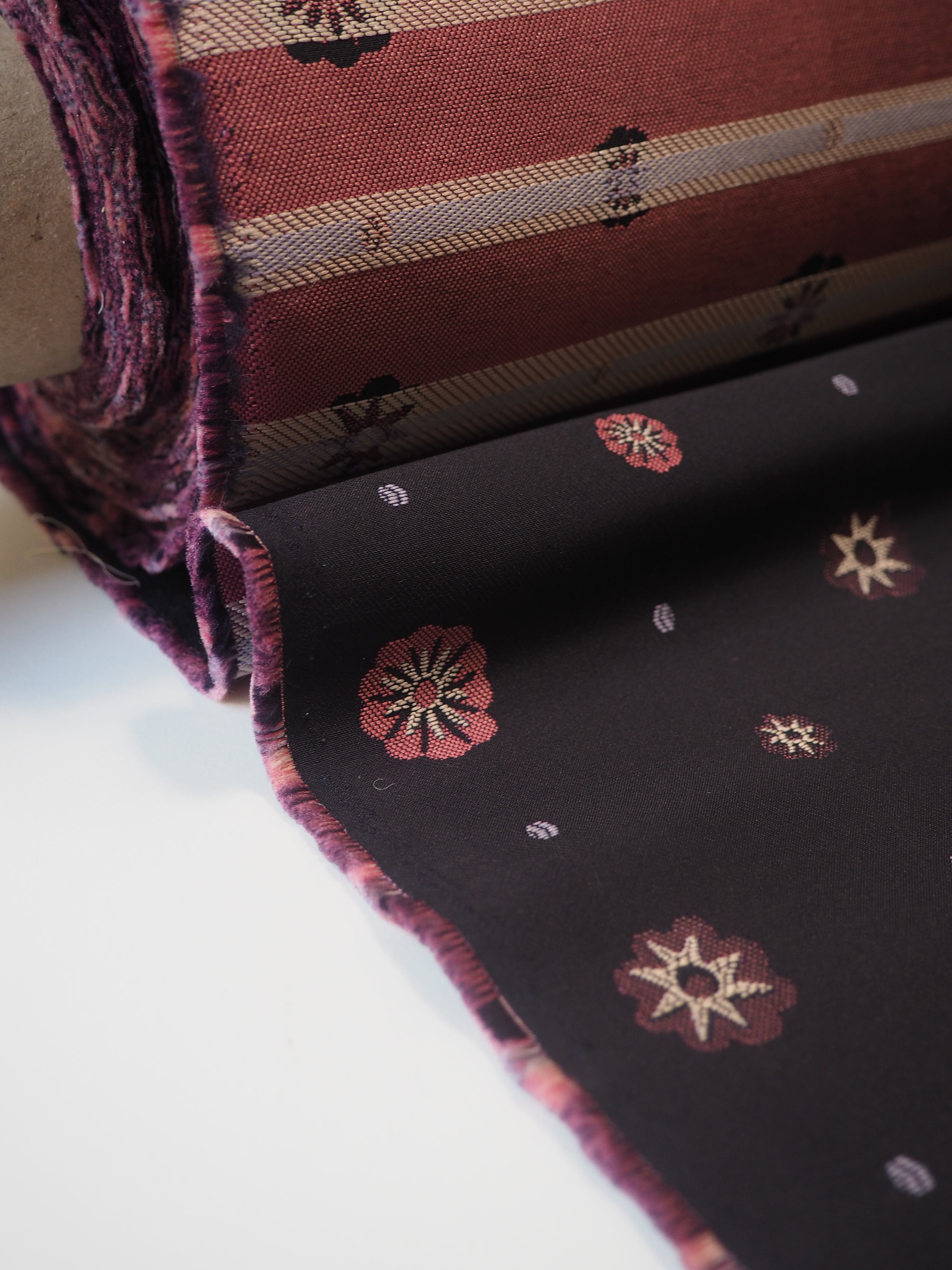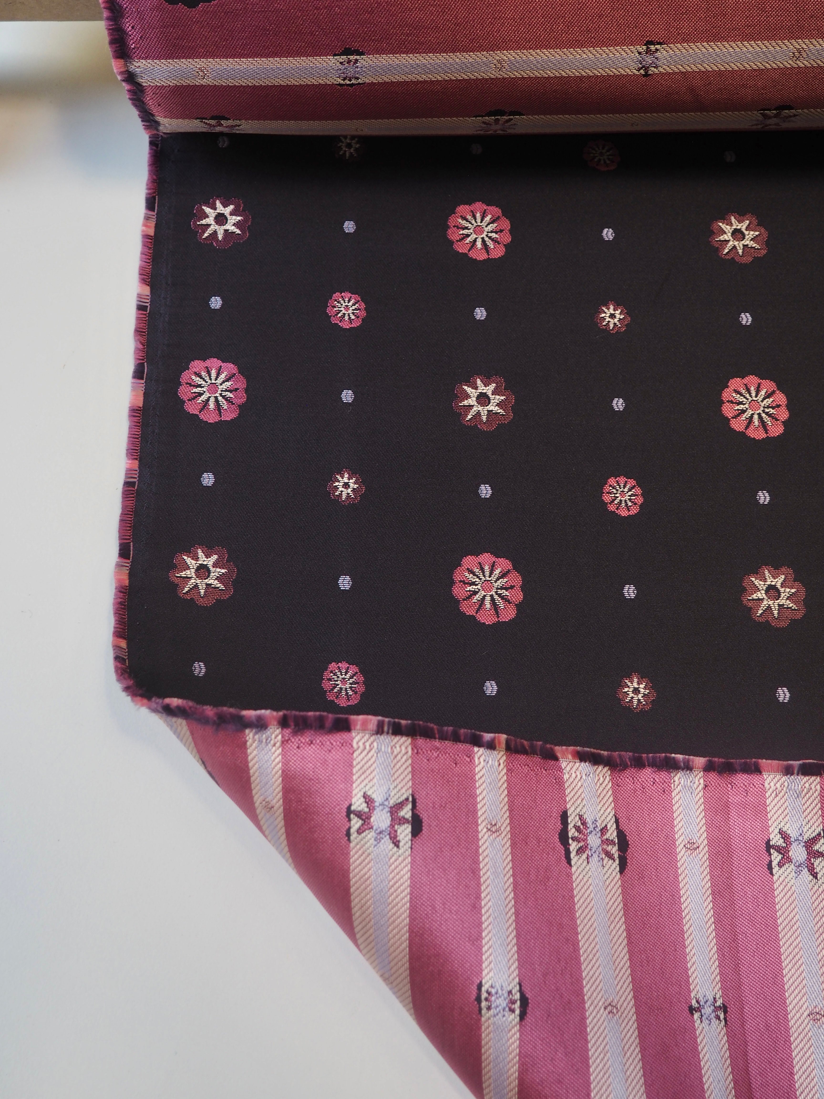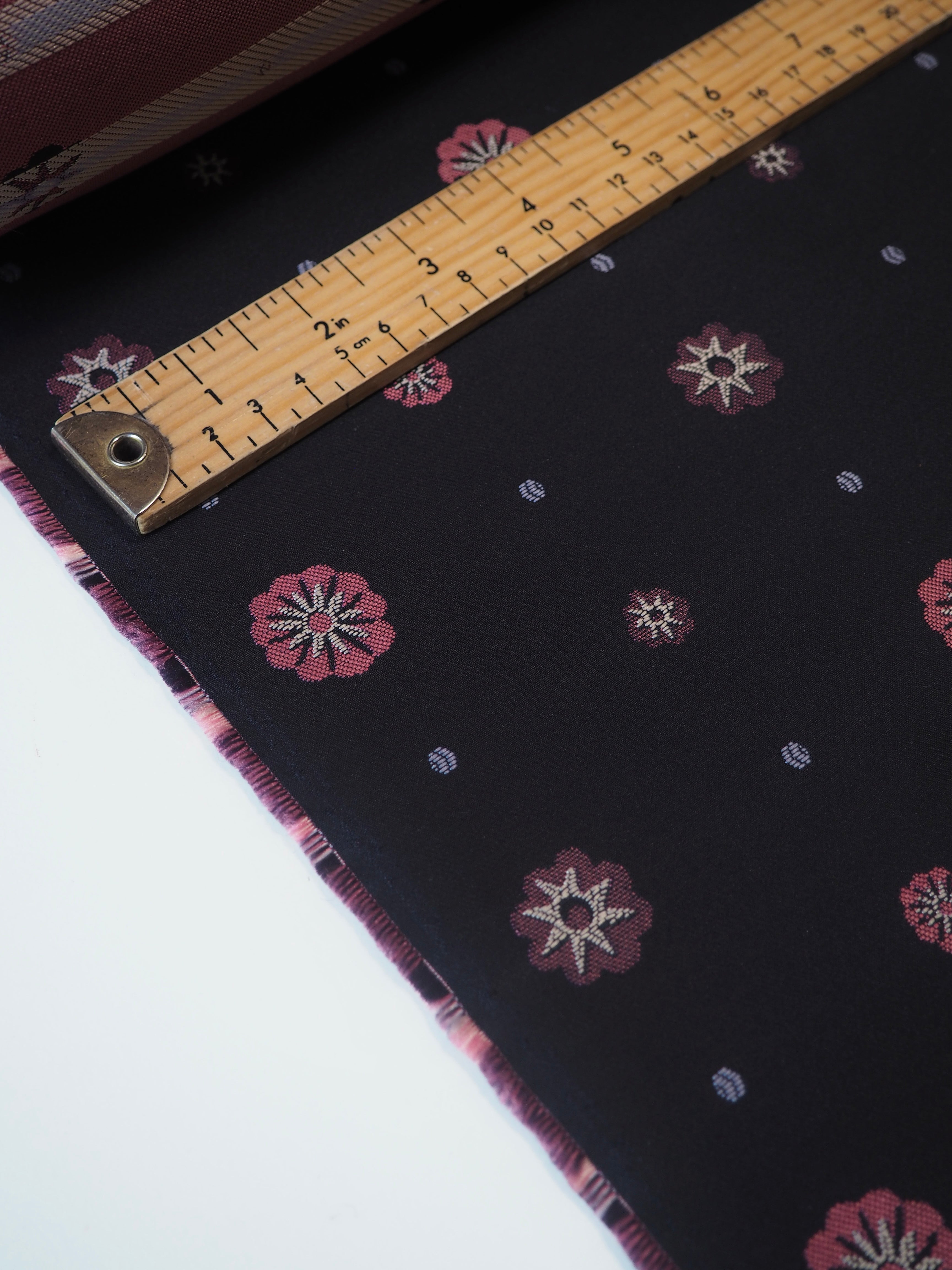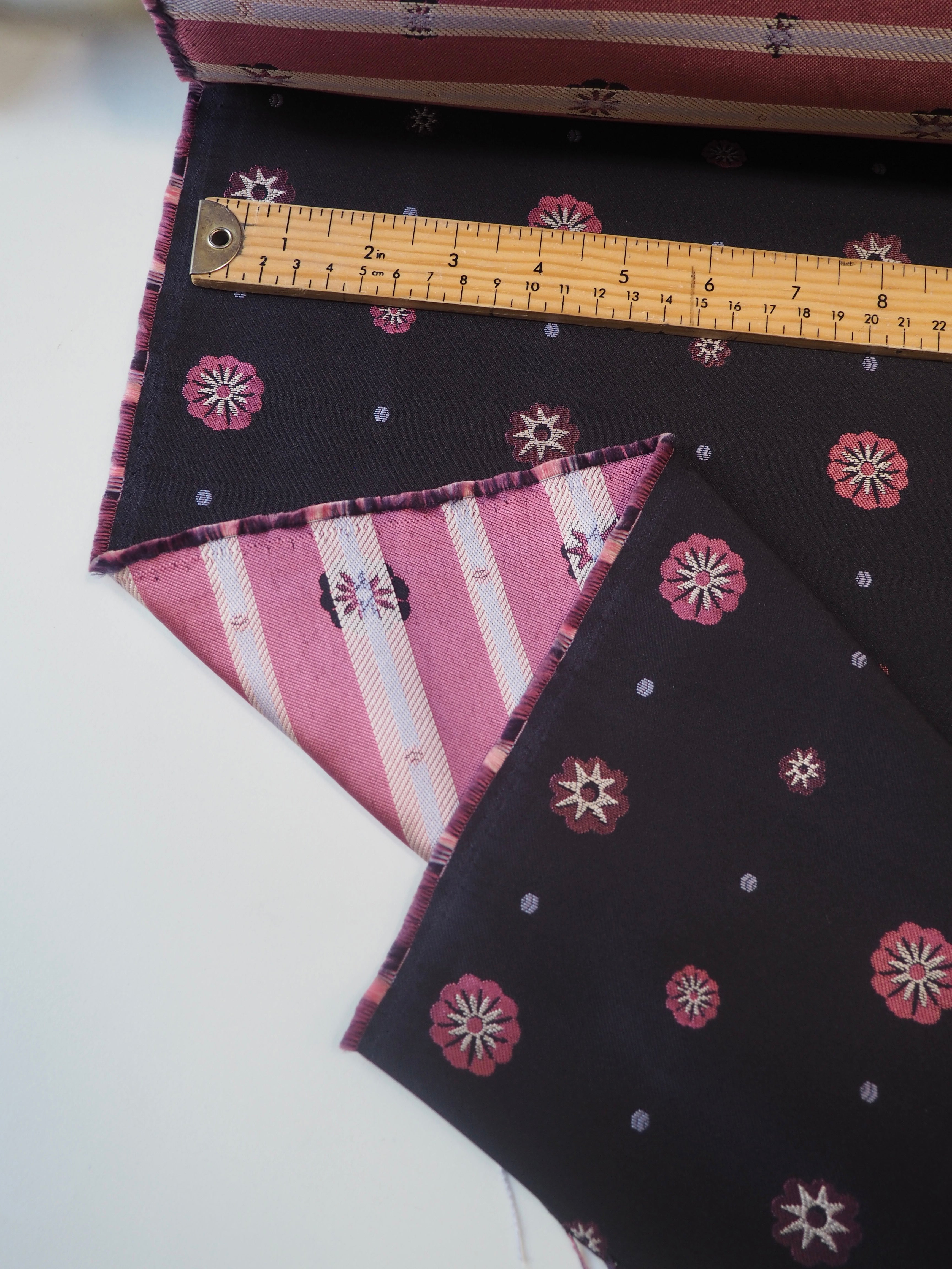 This ex-designer fabric is a gorgeous Liberty jacquard. It's in a black and pink floral jacquard, in a small scale and a pink multi-colourway. It is light to medium weight, with a beautiful structure to play with. Fully opaque, with a lovely handle. Truly one-of-a-kind and perfect for a party dress or even bags and cushions!