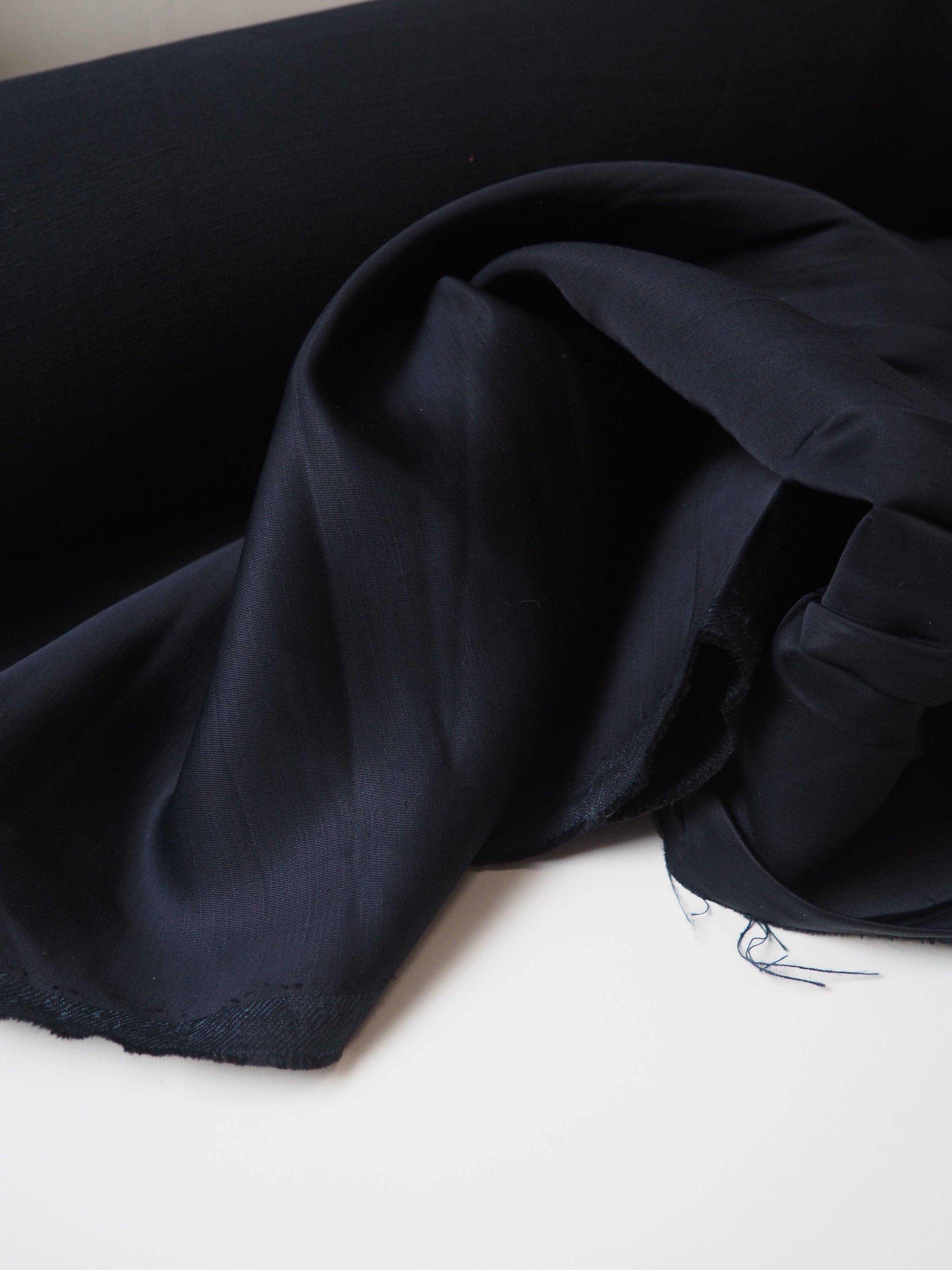 This ex-designer fabric is a luxurious satin. It's a viscose and linen blend, which gives it a sleek satin topside, mixed with a linen reverse handle and fantastic structure. It's a unique cloth that feels incredible and looks so quality. So eye-catching, fully opaque, and moves beautifully. Perfect for dresses or swishy trousers!