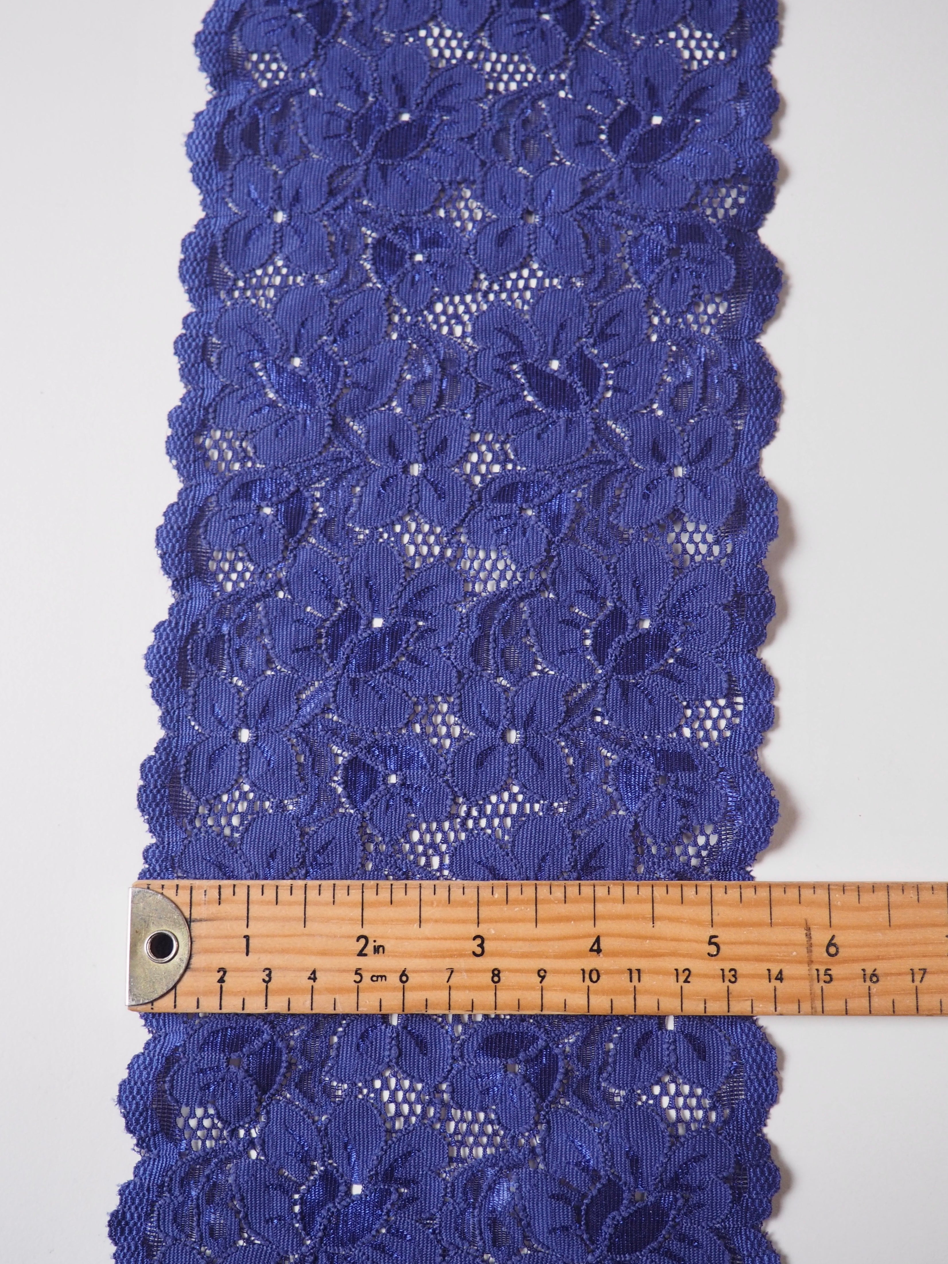 This ex-designer lace trim is a purple stretch lace with shiny lurex details. Perfect for lingerie and bra making, but could also be used as trim on other garments. It has about 30% stretch and a double scallop edge.