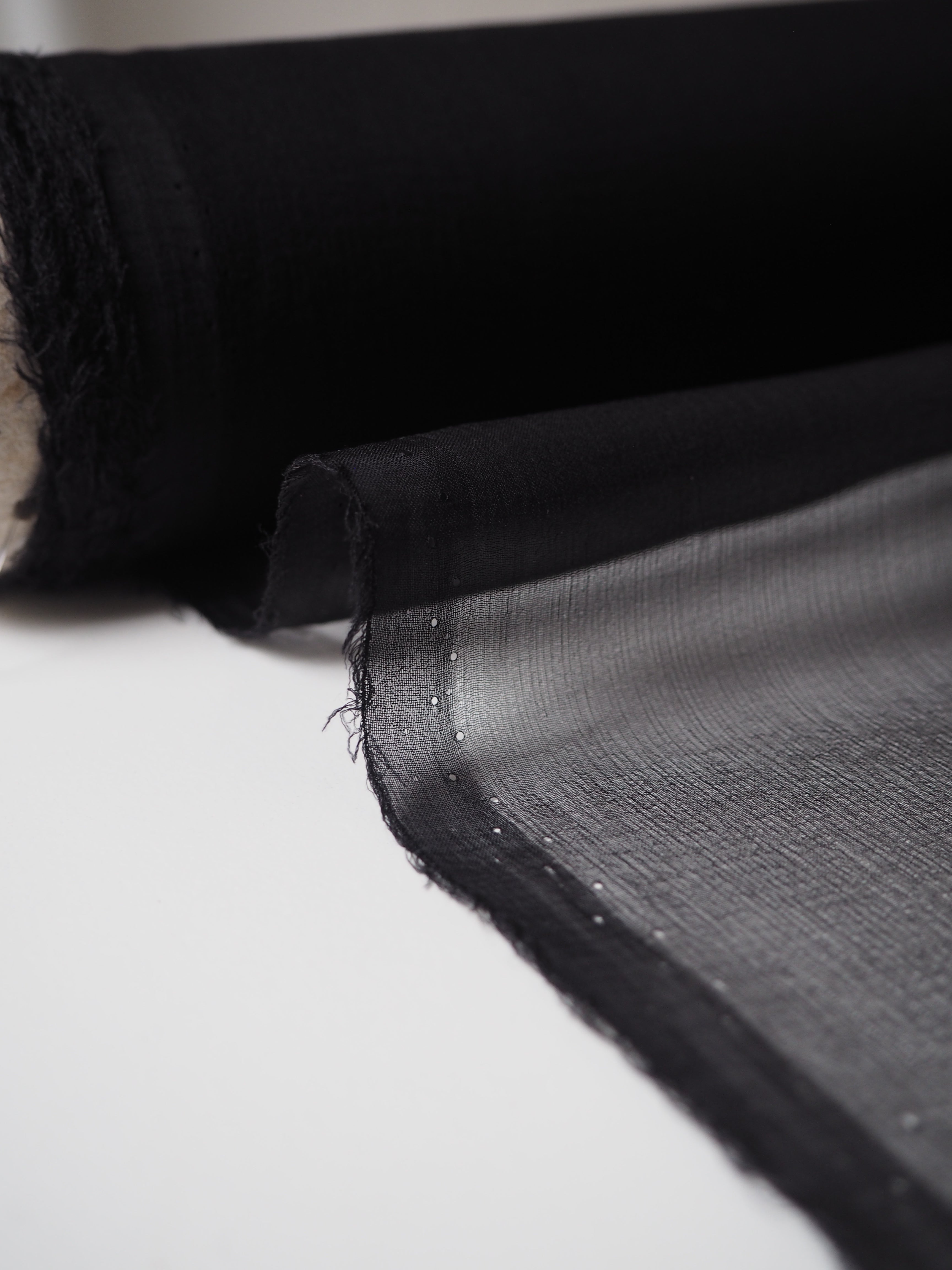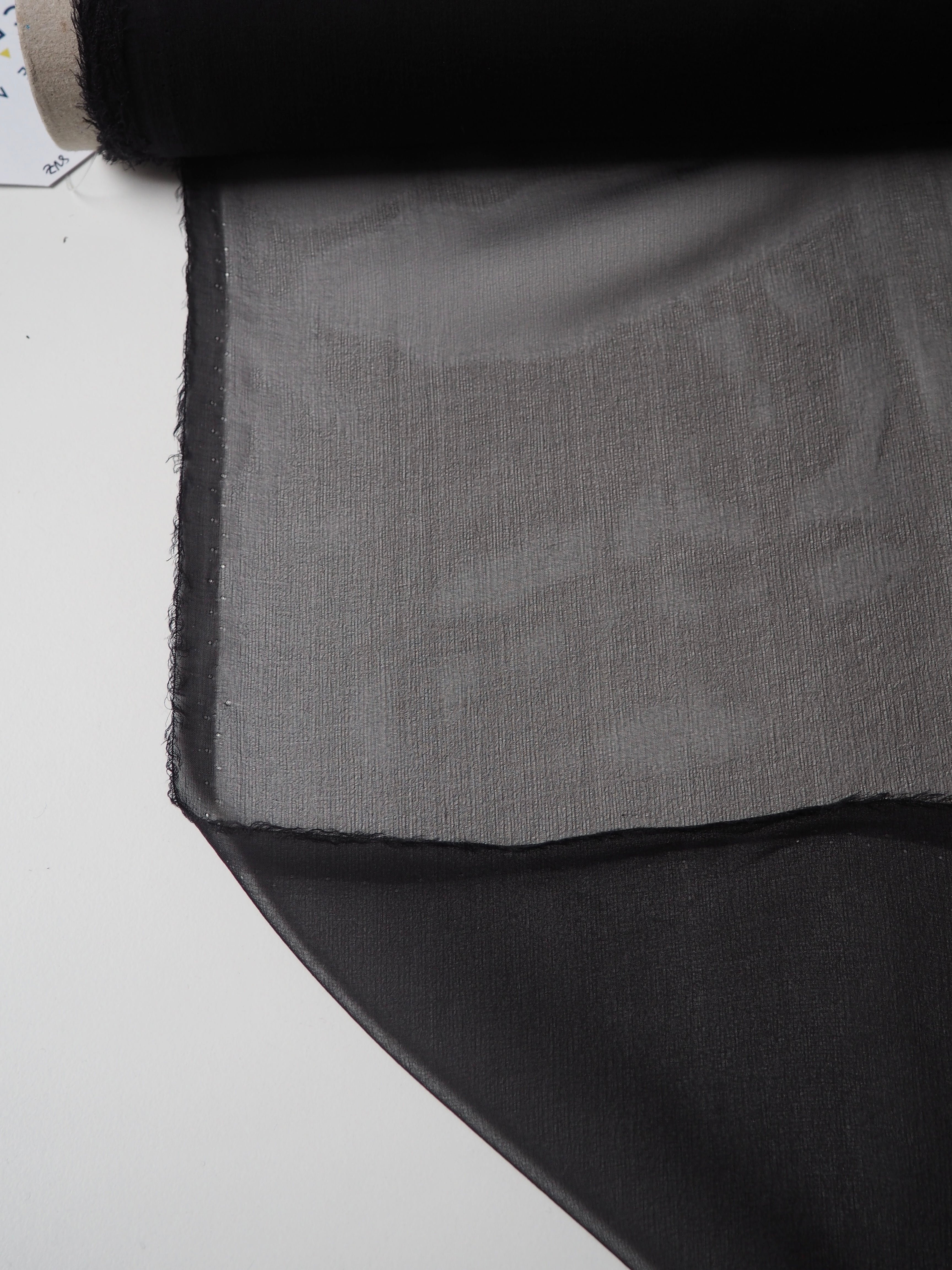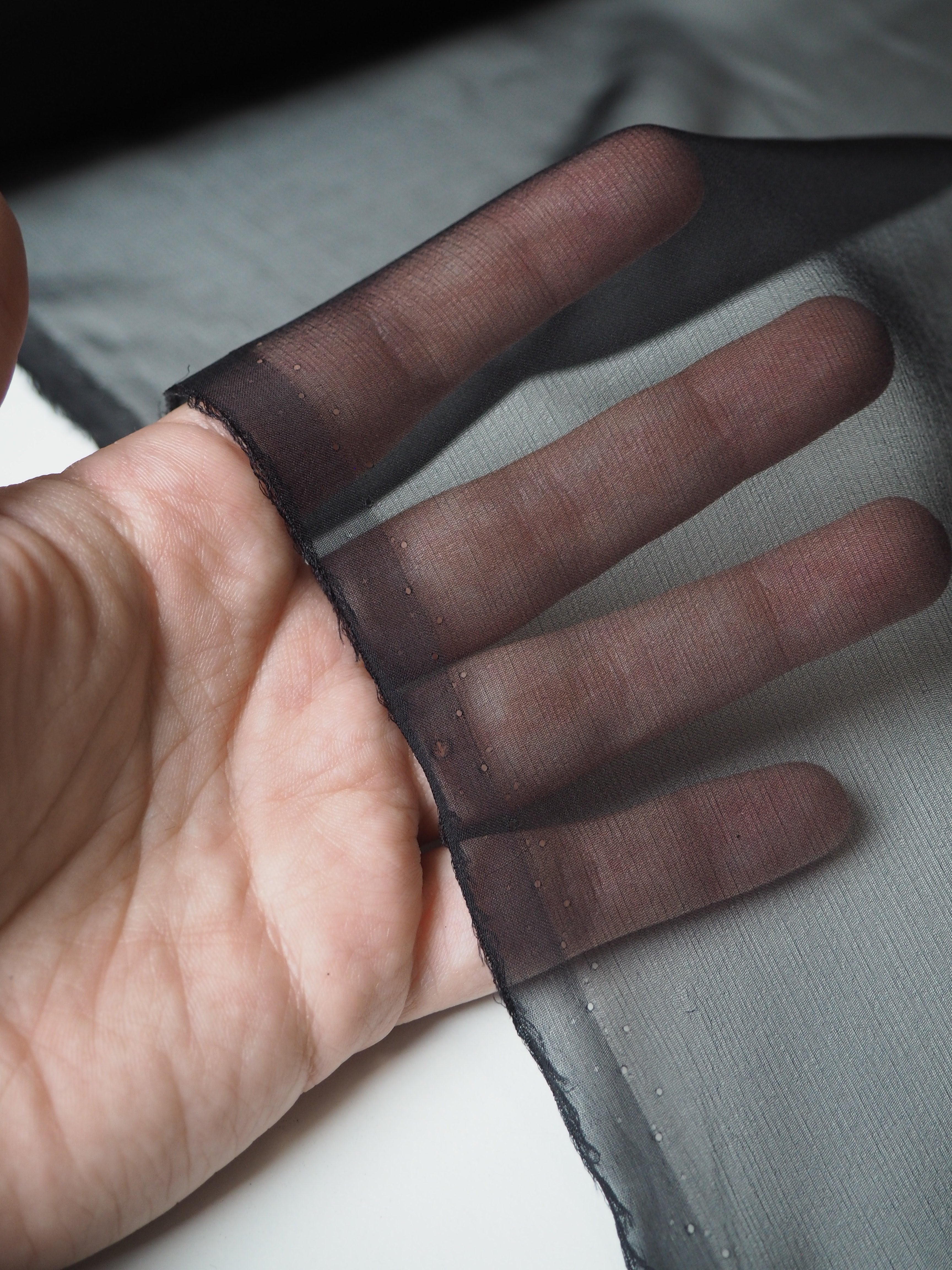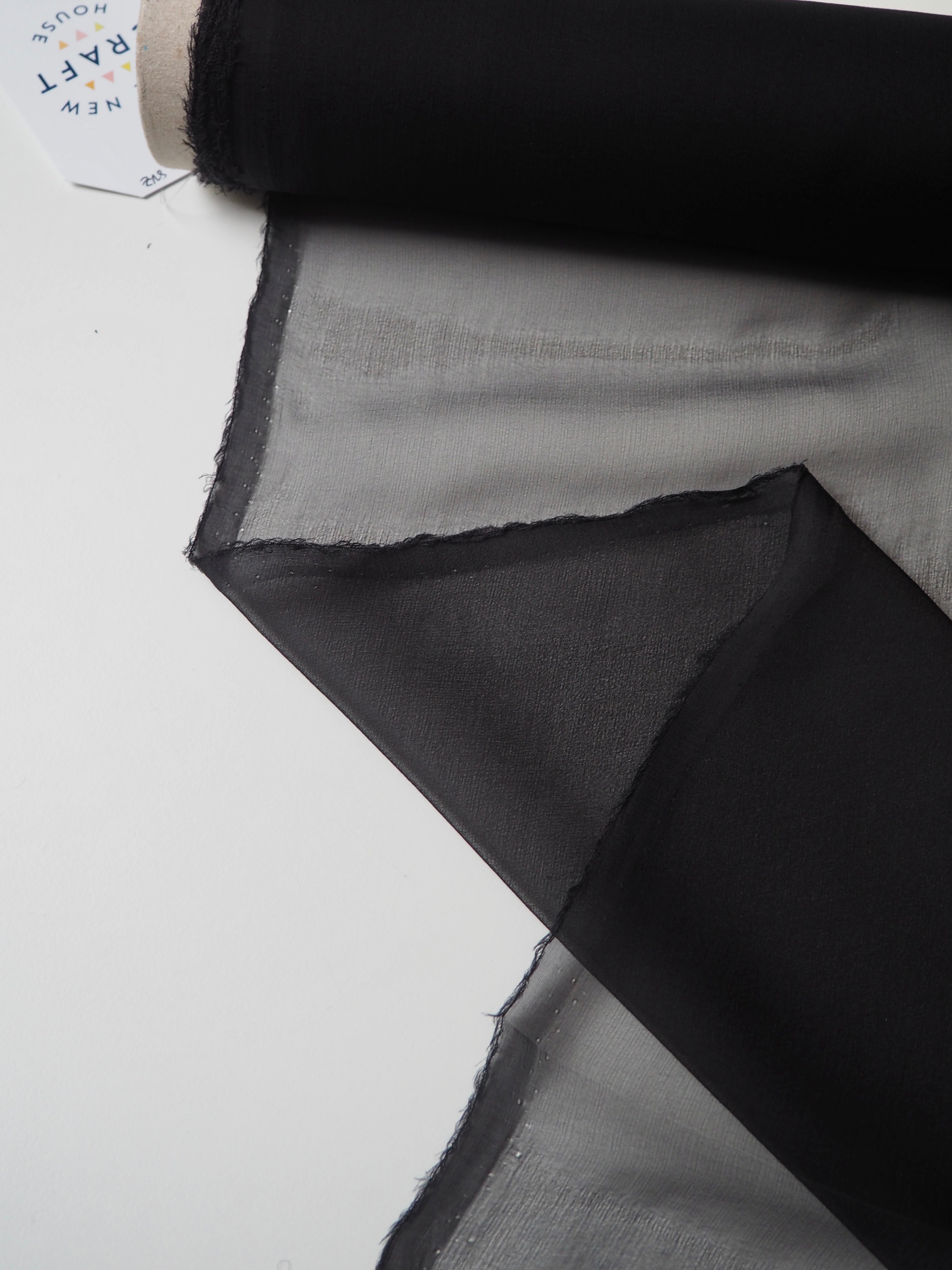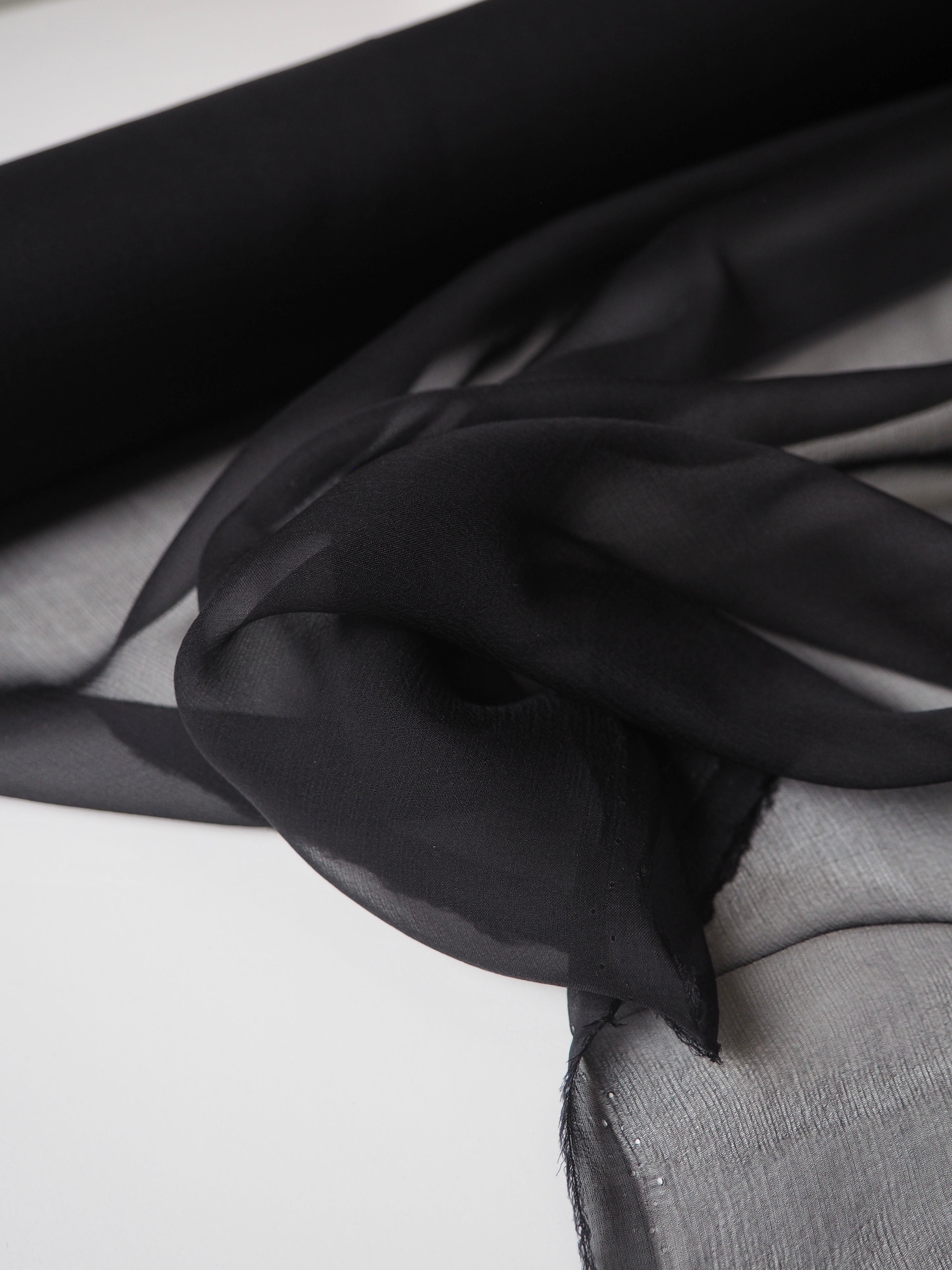 This ex-designer fabric is a lightweight silk chiffon. In a classic black colour, and quite sheer. Has a great silky handle with a subtle crepe-like texture. Super light and airy, ideal for lingerie, or using for a floaty top or dress!