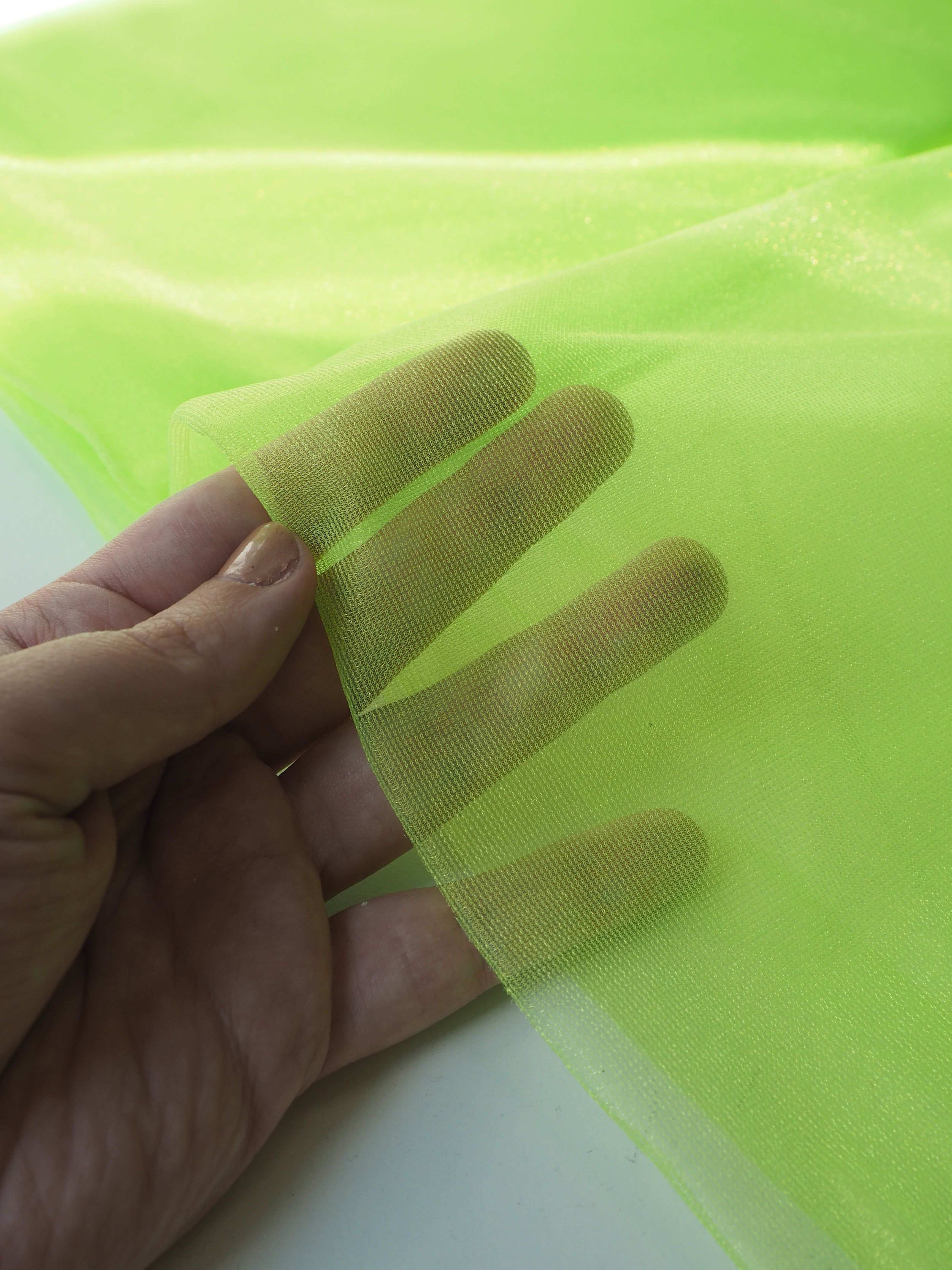 This ex-designer bright neon green tulle is super fine and has a nice soft structure. It has a flat weave, similar to an interlock mesh rather than the interconnecting hexagons usually associated with tulle. Lightweight with a soft drape.  Perfect for a gathered dress or petticoat!