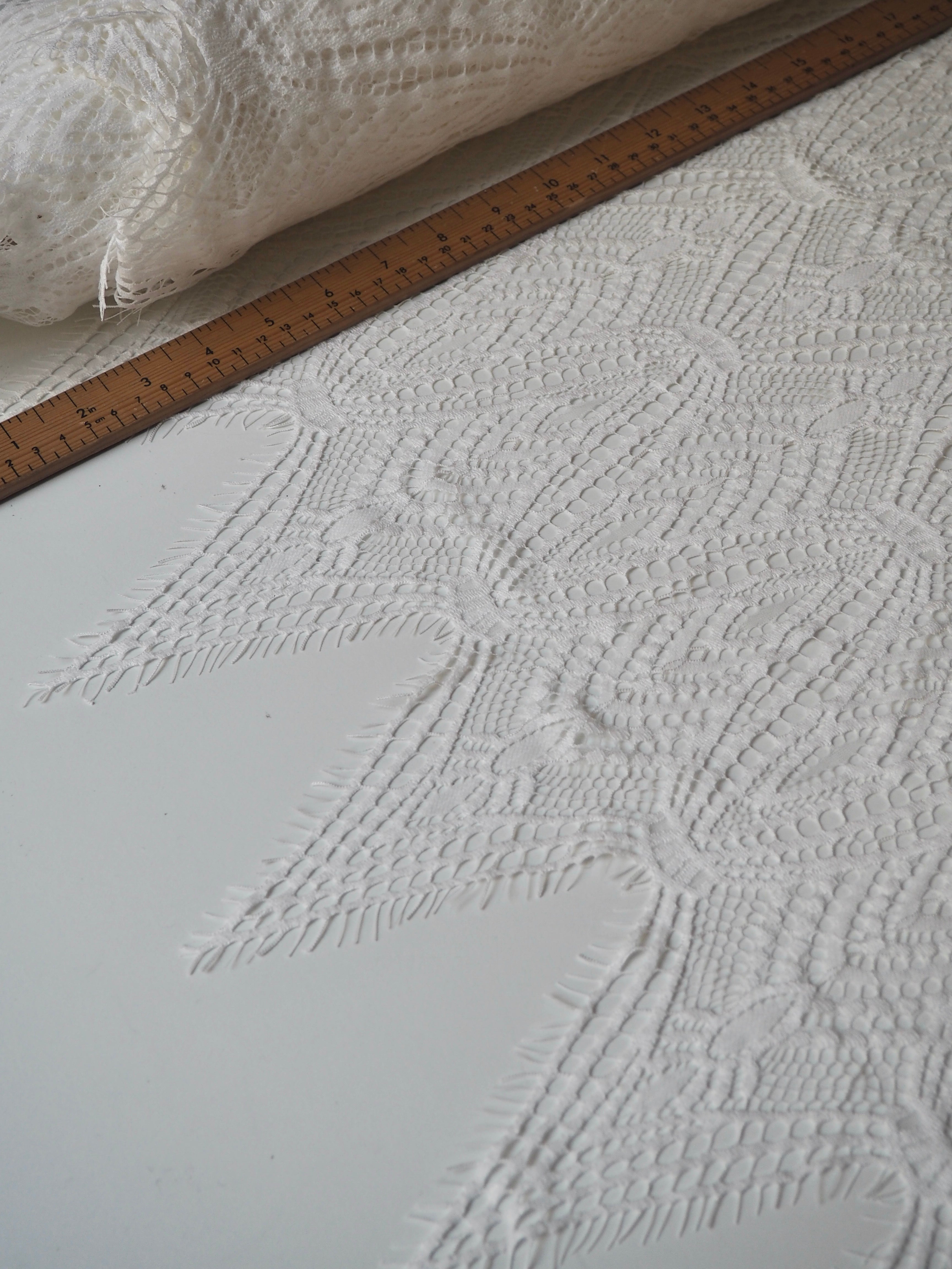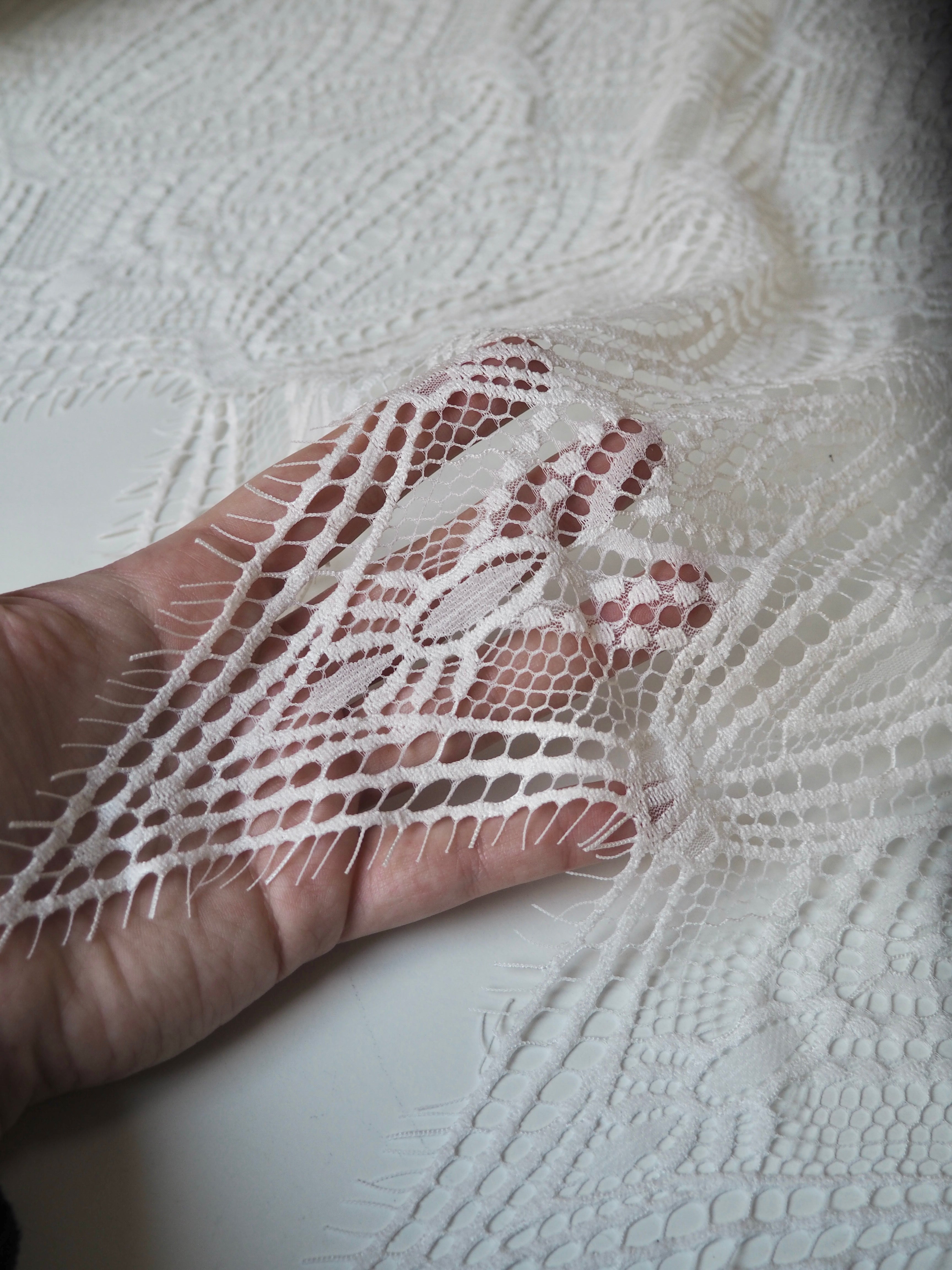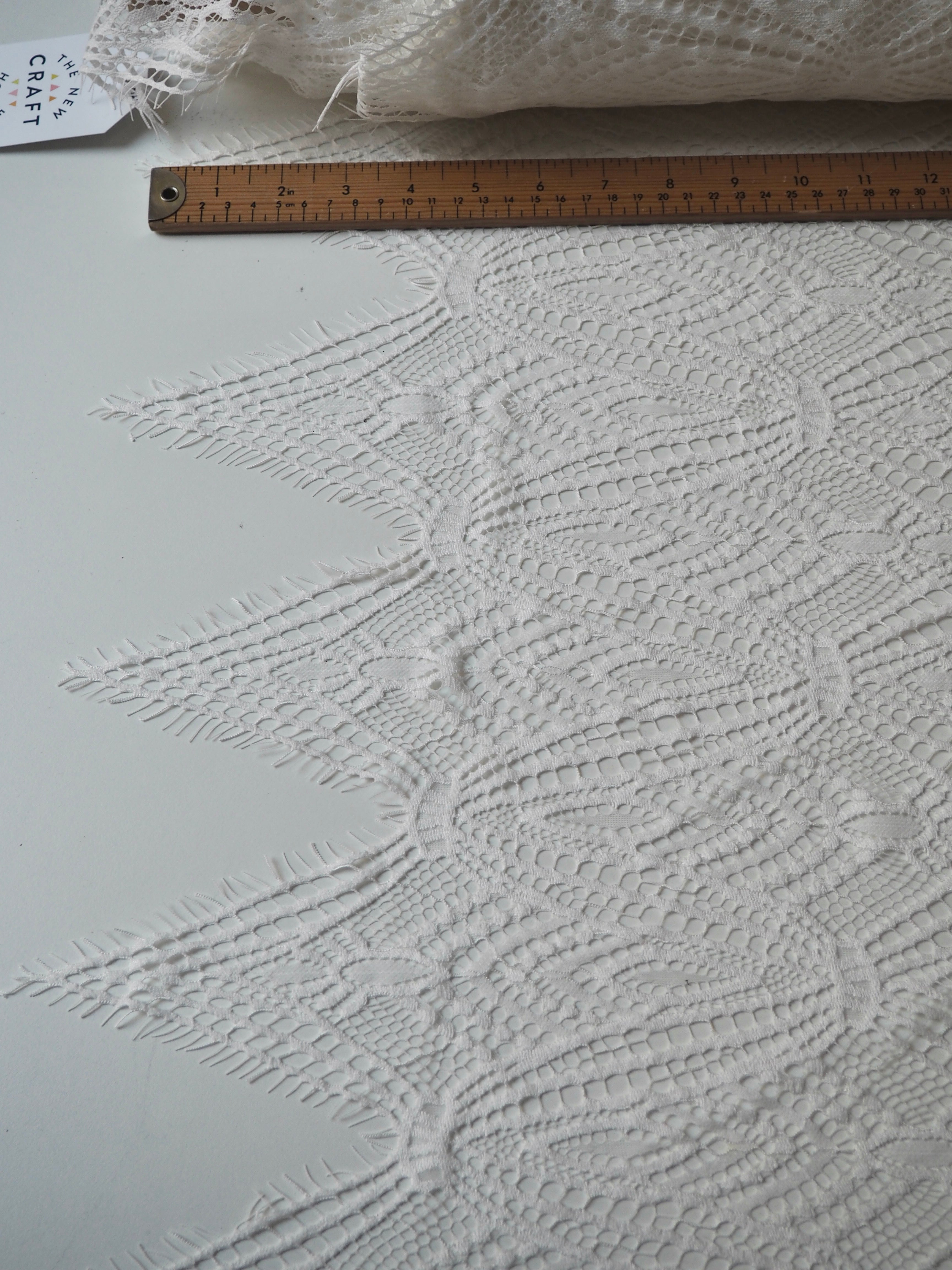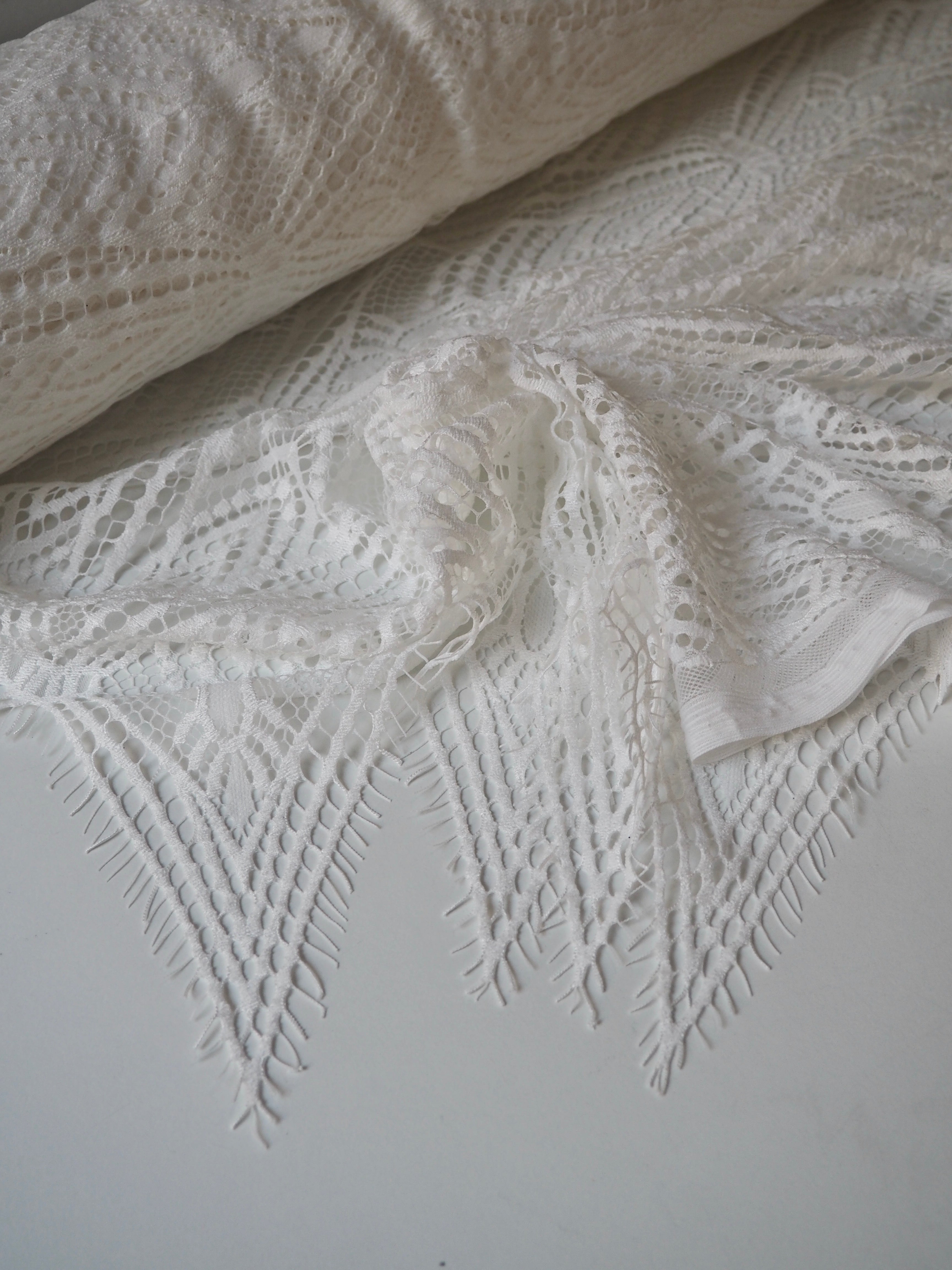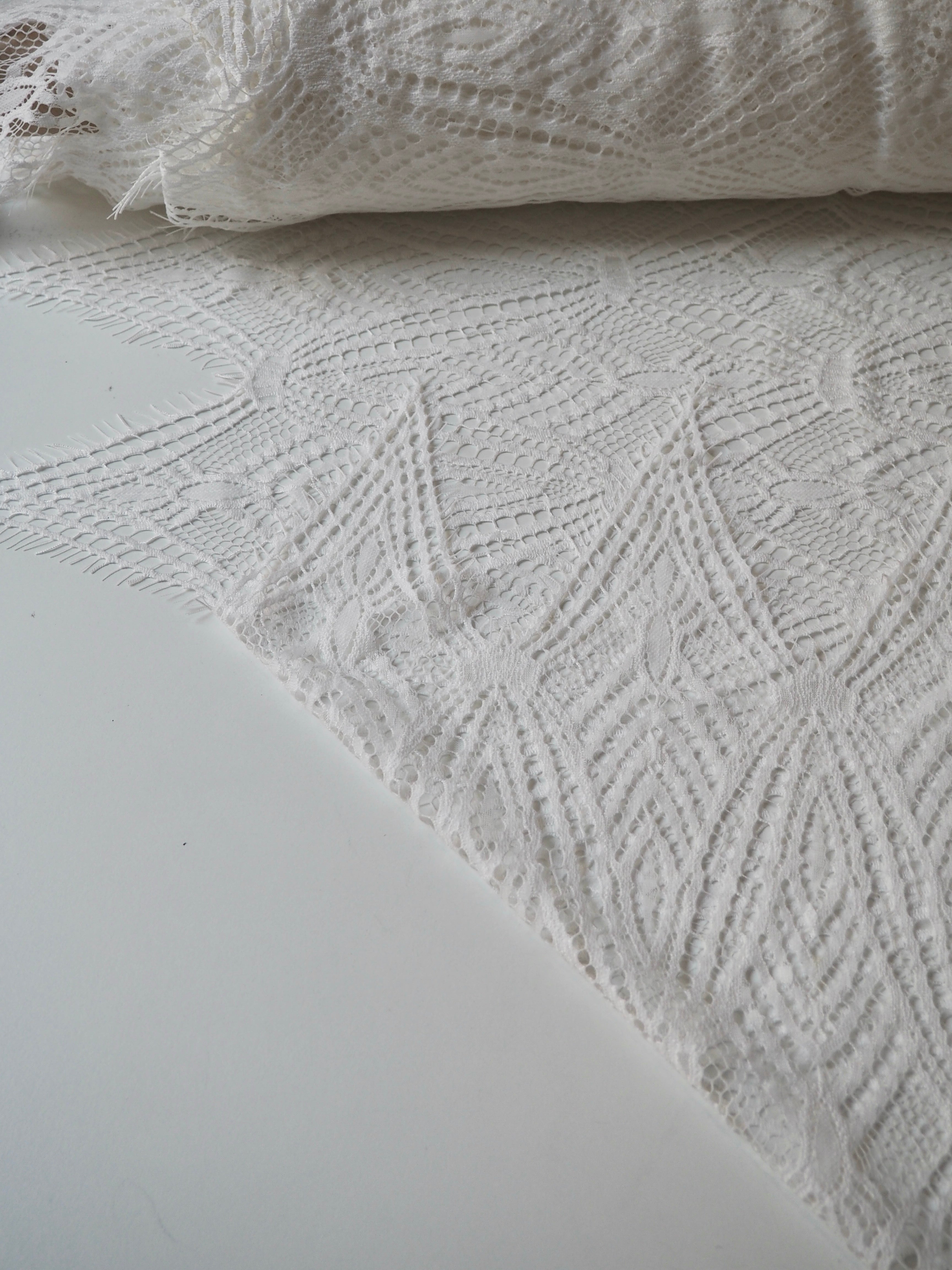 This ex-designer fabric is a lovely lace. It's in a soft white colour. It's very soft and has a flat finish, with a web-like diagonal pattern. Finishes with a deep triangle eyelash scallop on both ends. It has such a lovely drape and handle. Beautiful quality and perfect for bridal or summer tops and dresses! This lace is made in 2-3m pieces so if you order higher volume, your order might be in pieces.