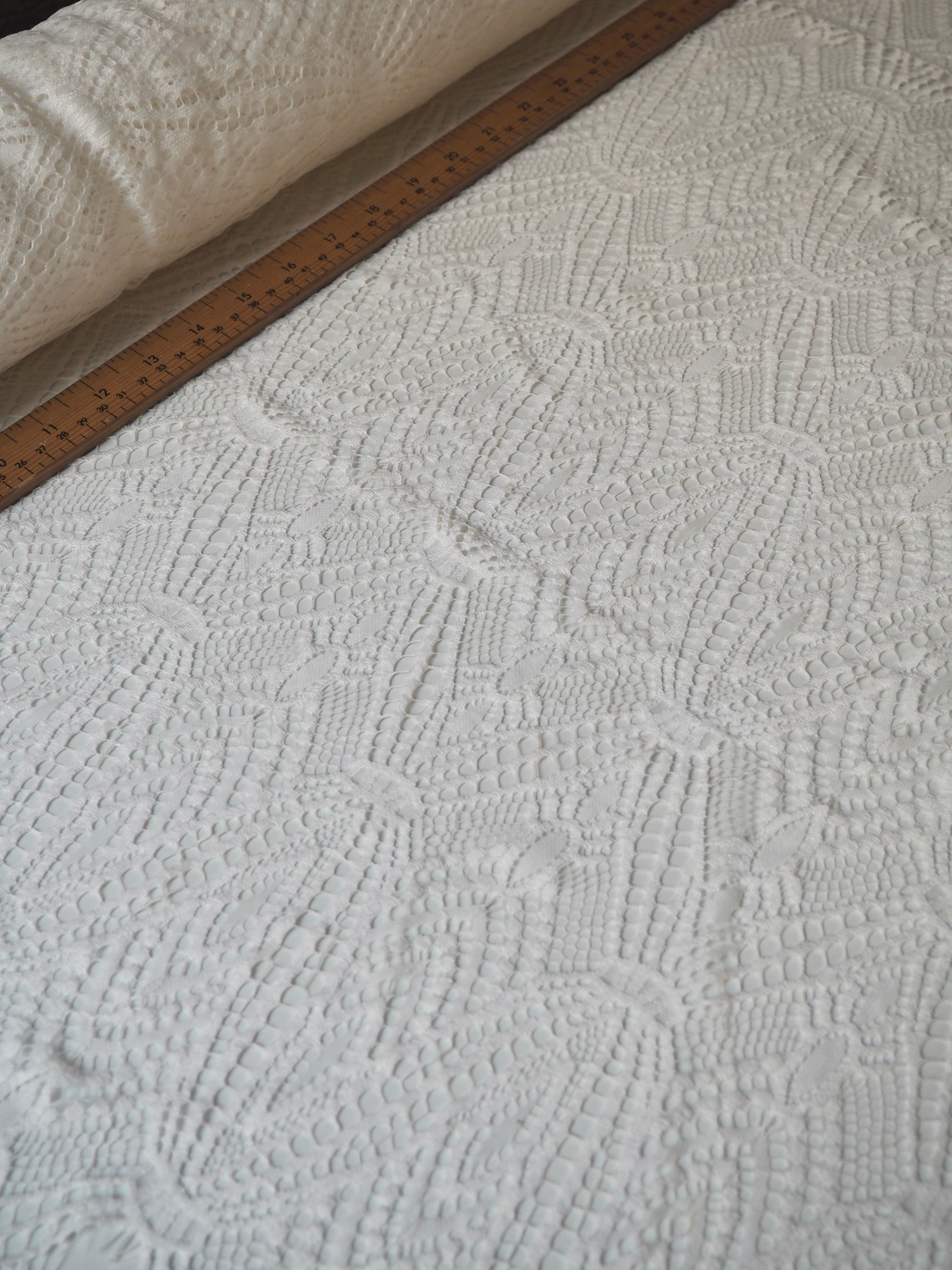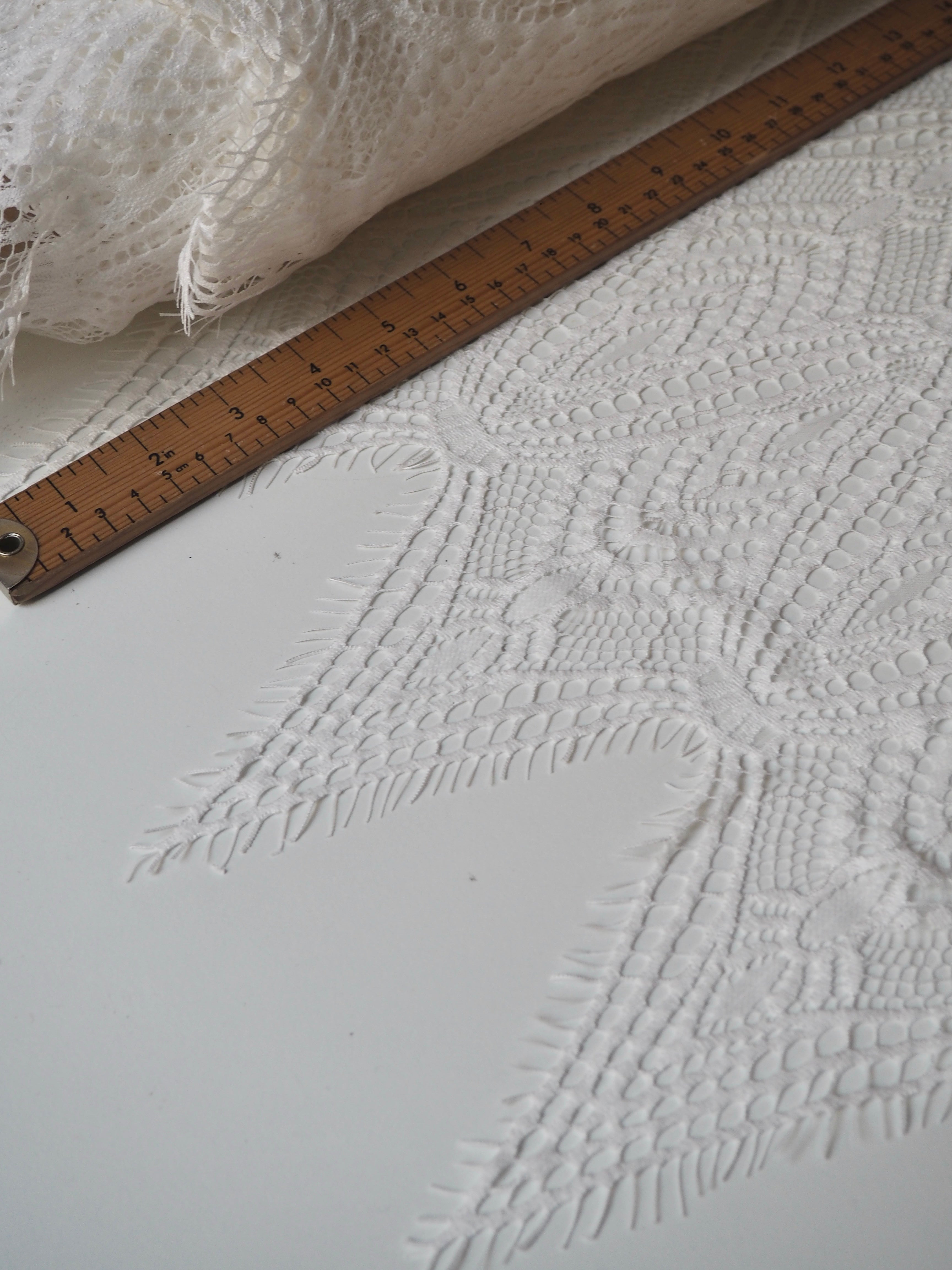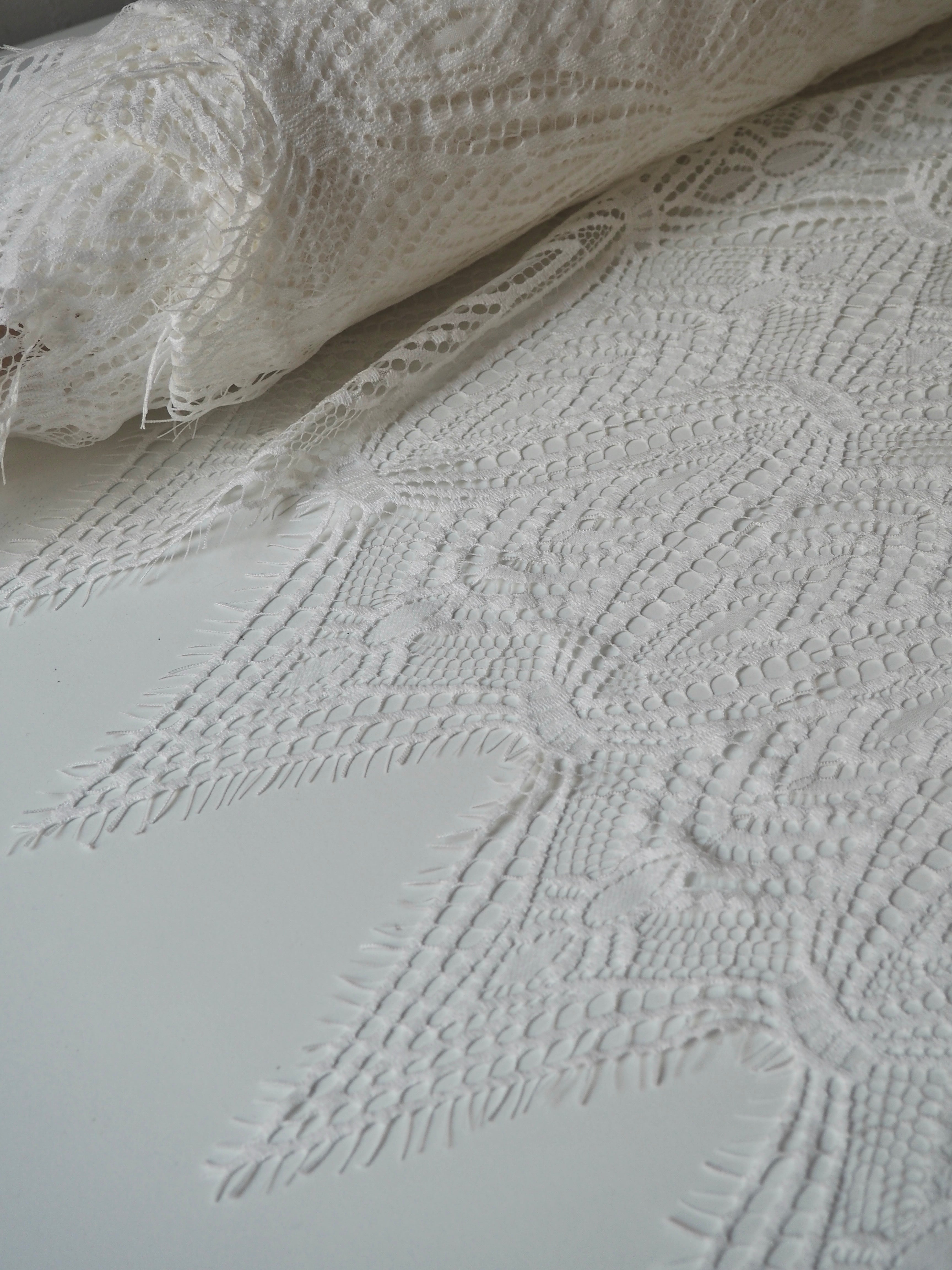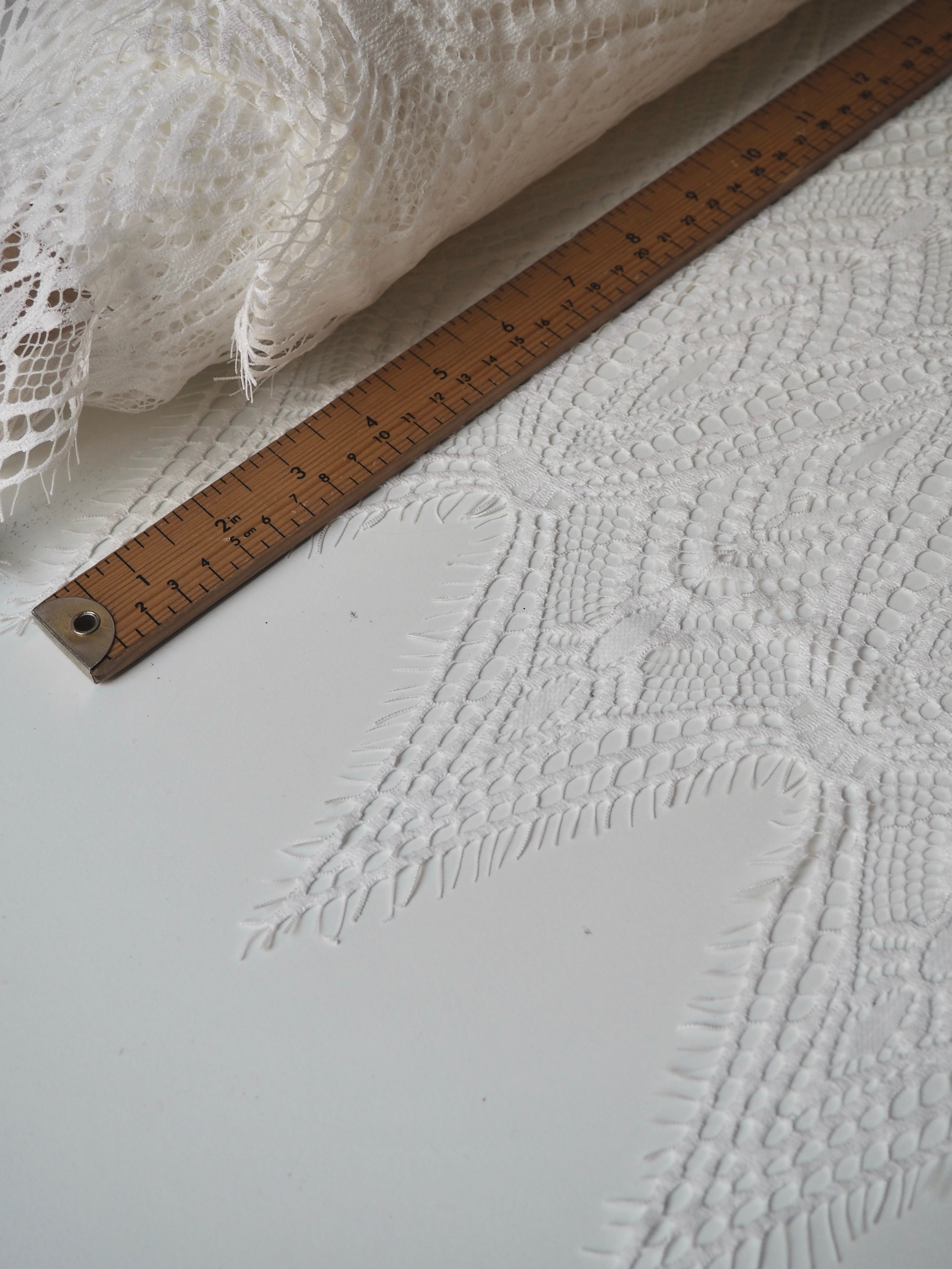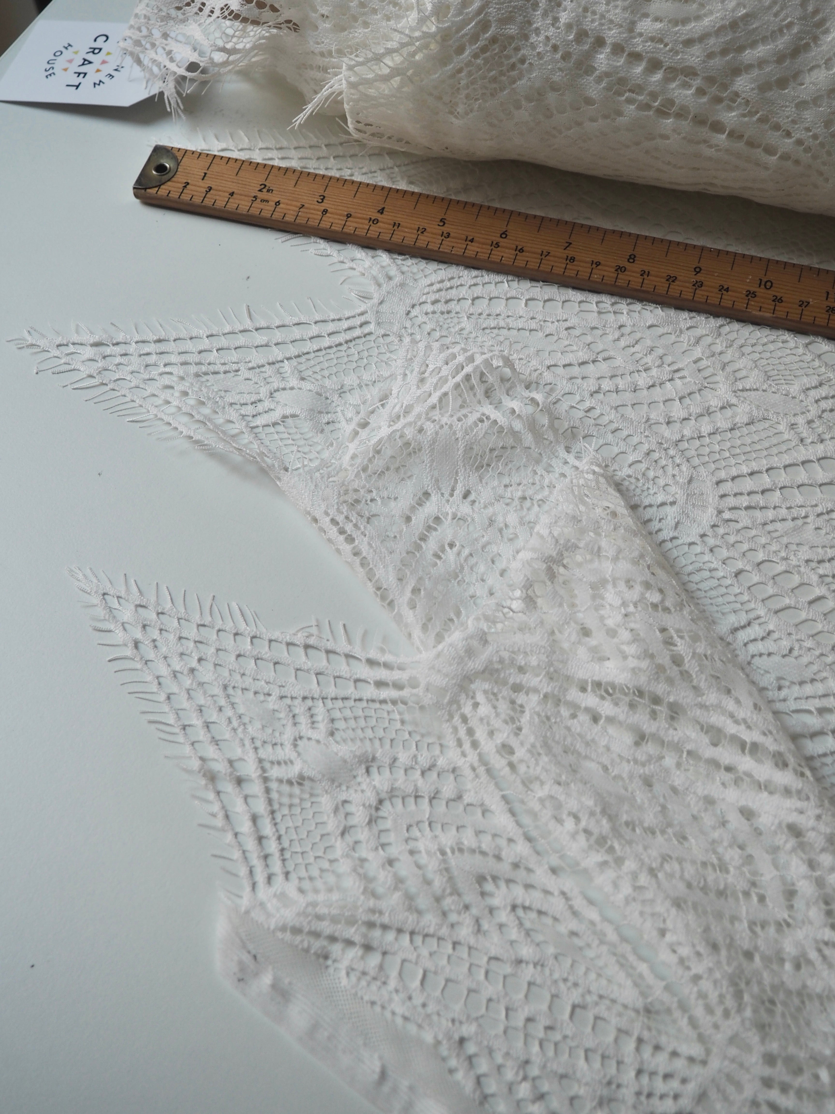This ex-designer fabric is a lovely lace. It's in a soft white colour. It's very soft and has a flat finish, with a web-like diagonal pattern. Finishes with a deep triangle eyelash scallop on both ends. It has such a lovely drape and handle. Beautiful quality and perfect for bridal or summer tops and dresses! This lace is made in 2-3m pieces so if you order higher volume, your order might be in pieces.