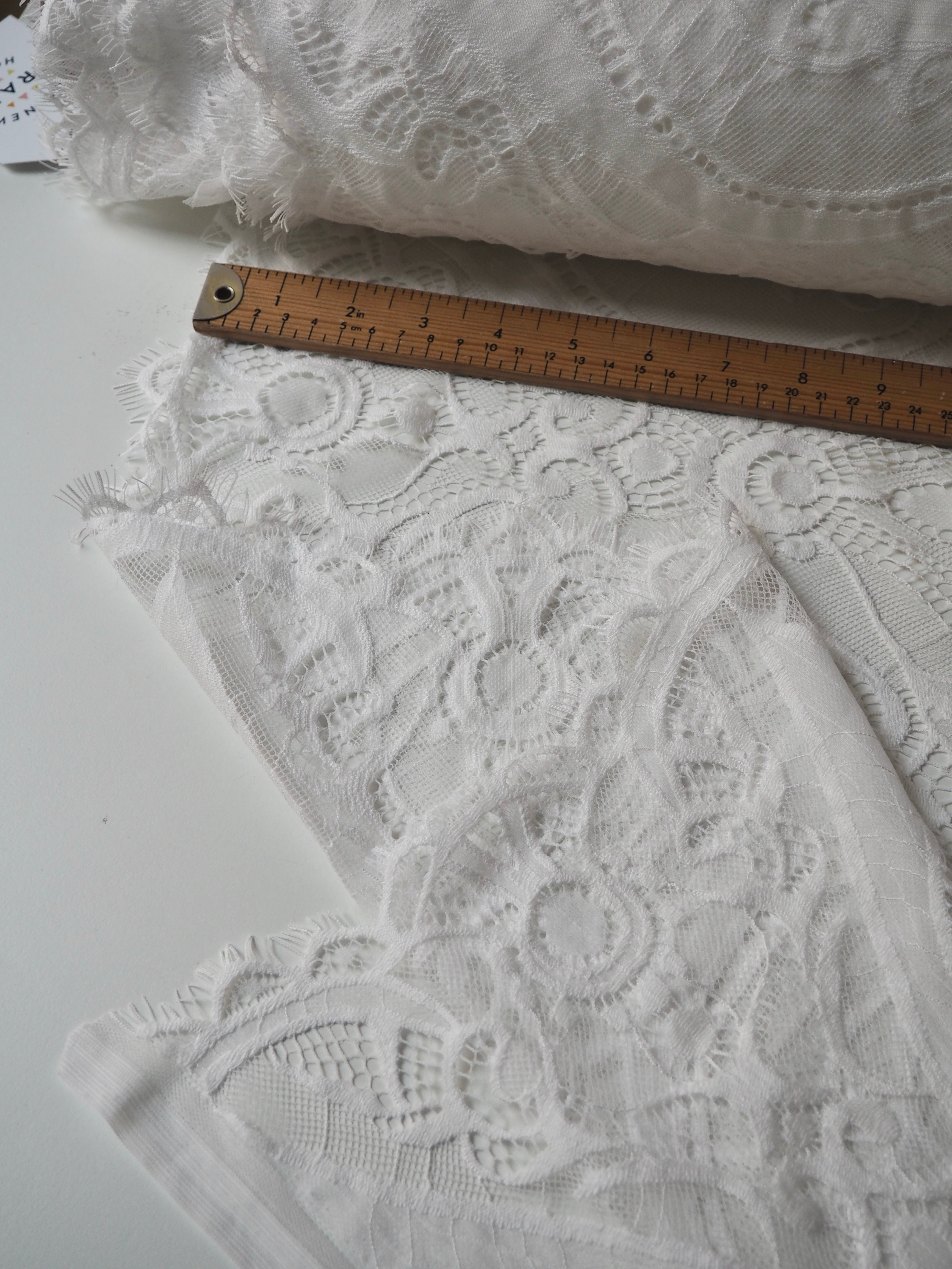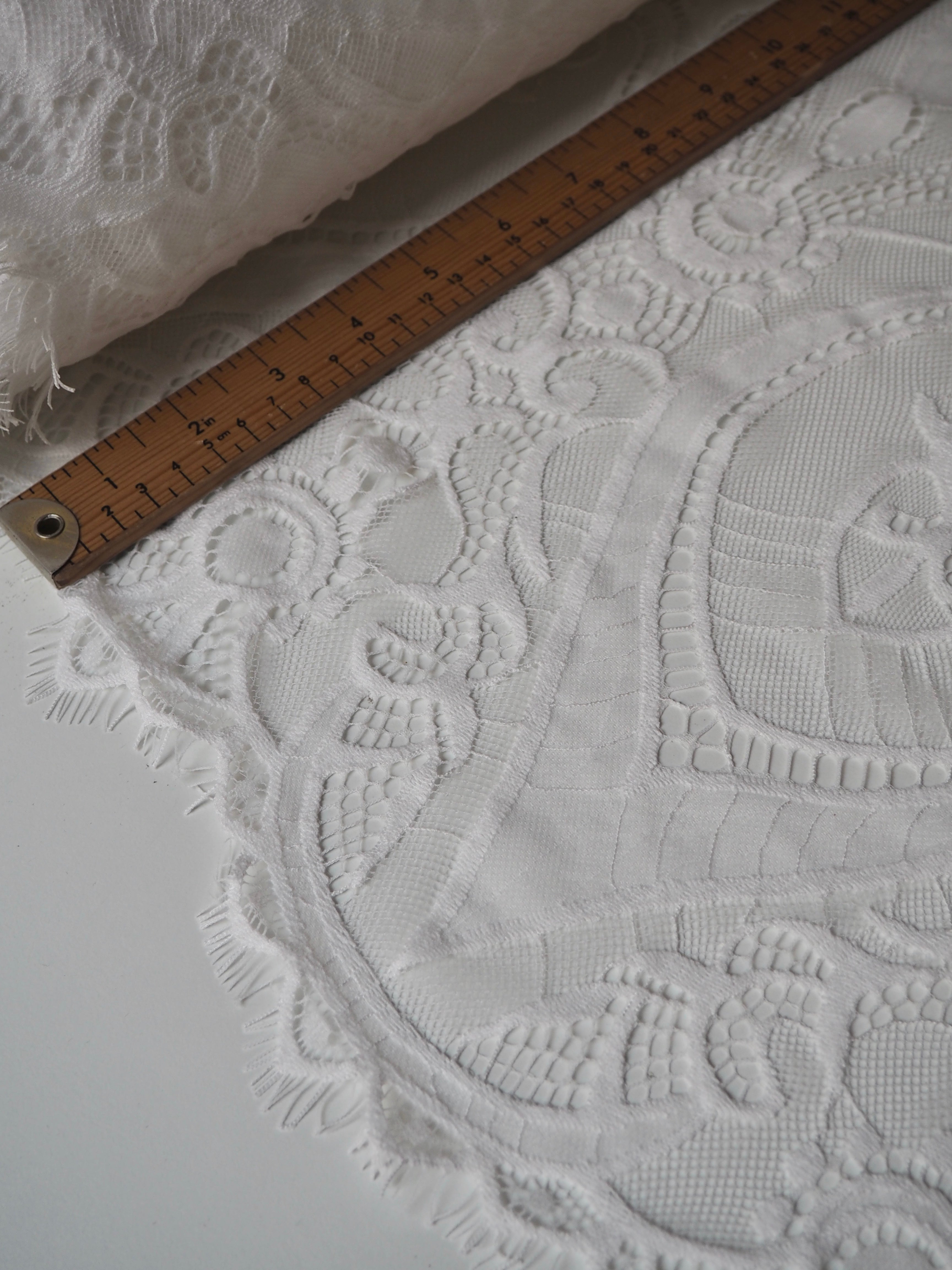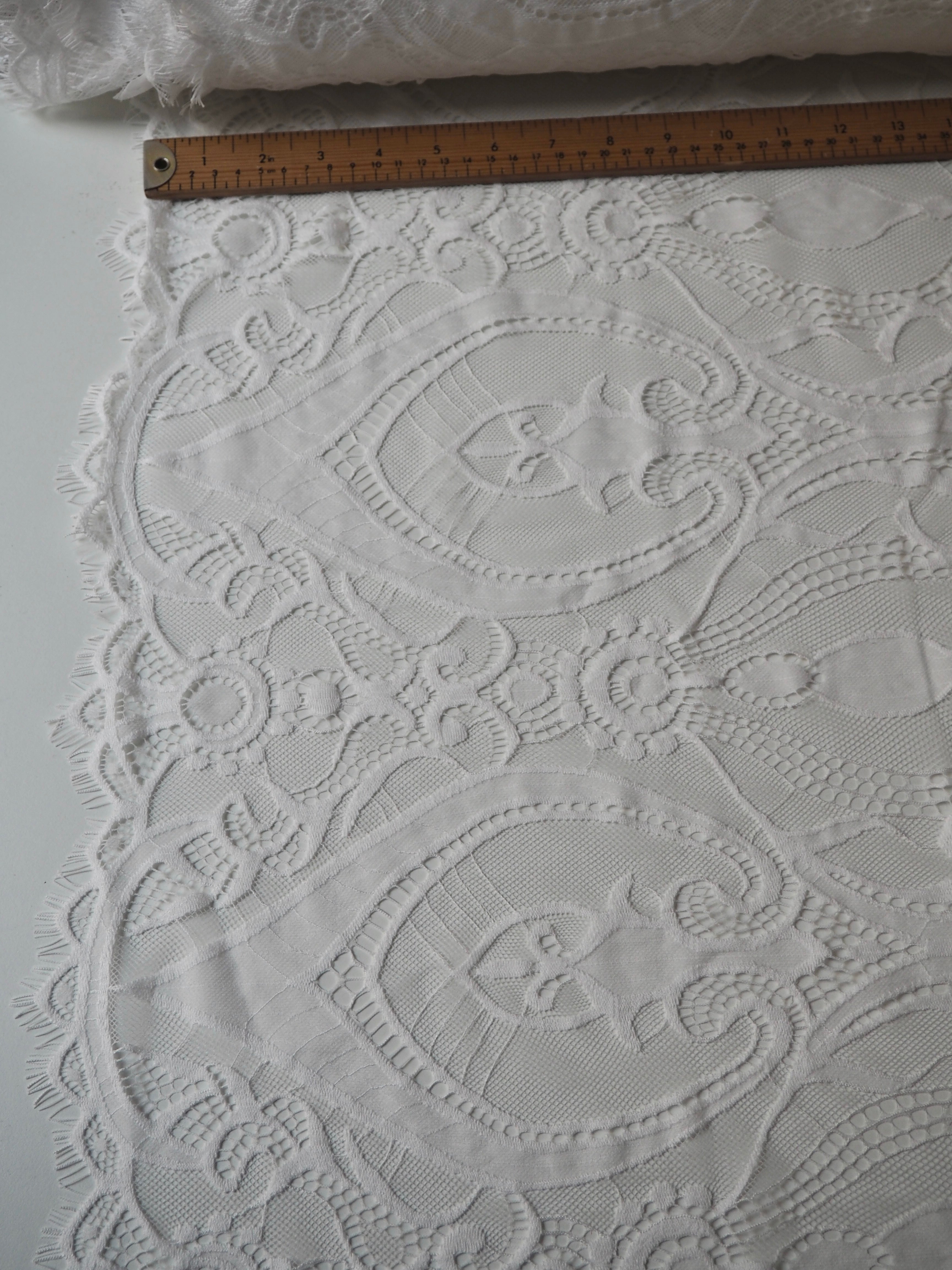 This ex-designer fabric is a lovely lace. It's in a soft white colour. It's soft and has a light sheen finish, with a very large scale scalloping pattern. Finishes with a gentle eyelash scallop on both ends. It has such a lovely drape and handle. Beautiful quality and perfect for bridal or summer tops and dresses! This lace is made in 2-3m pieces so if you order higher volume, your order might be in pieces.