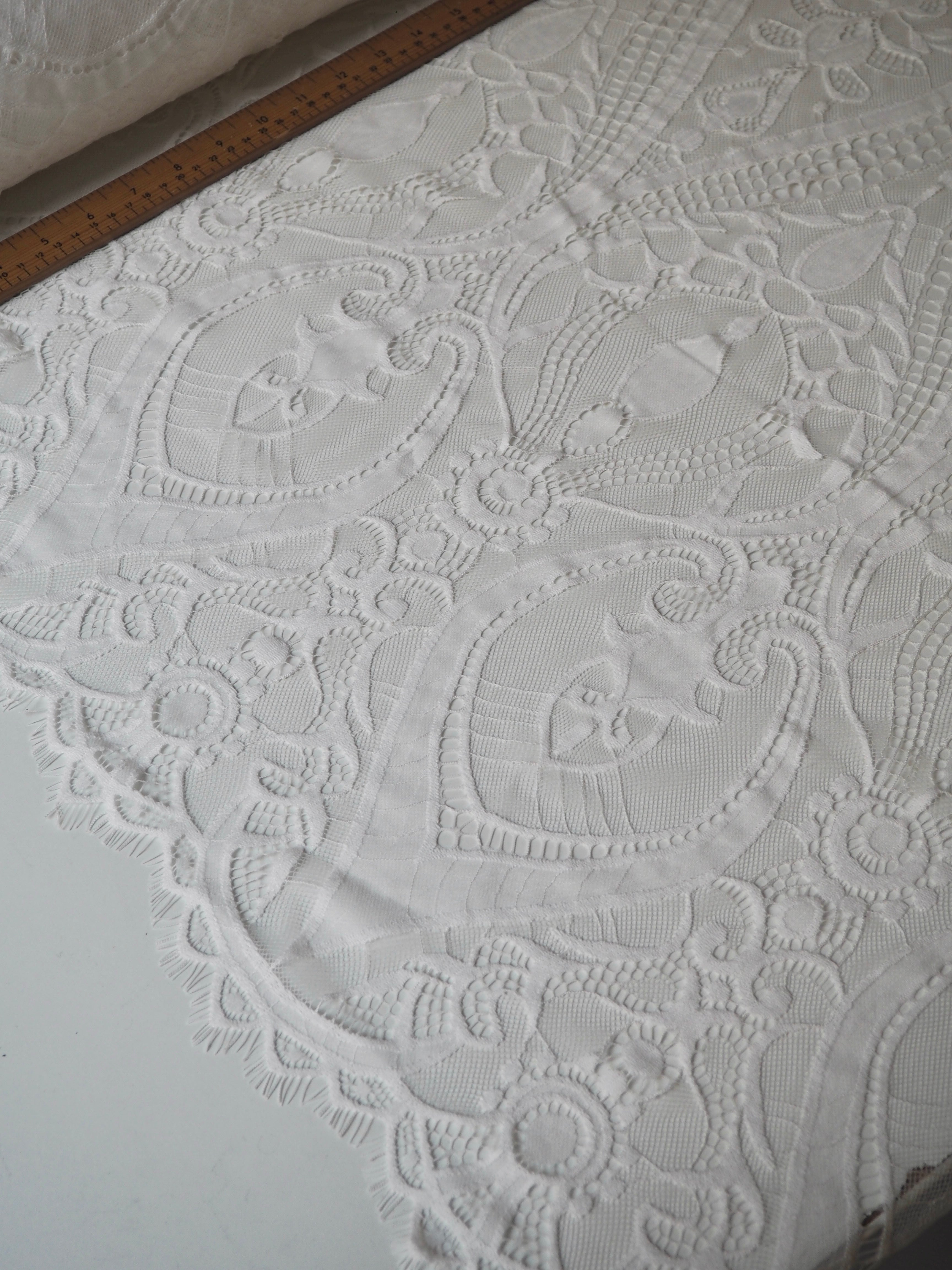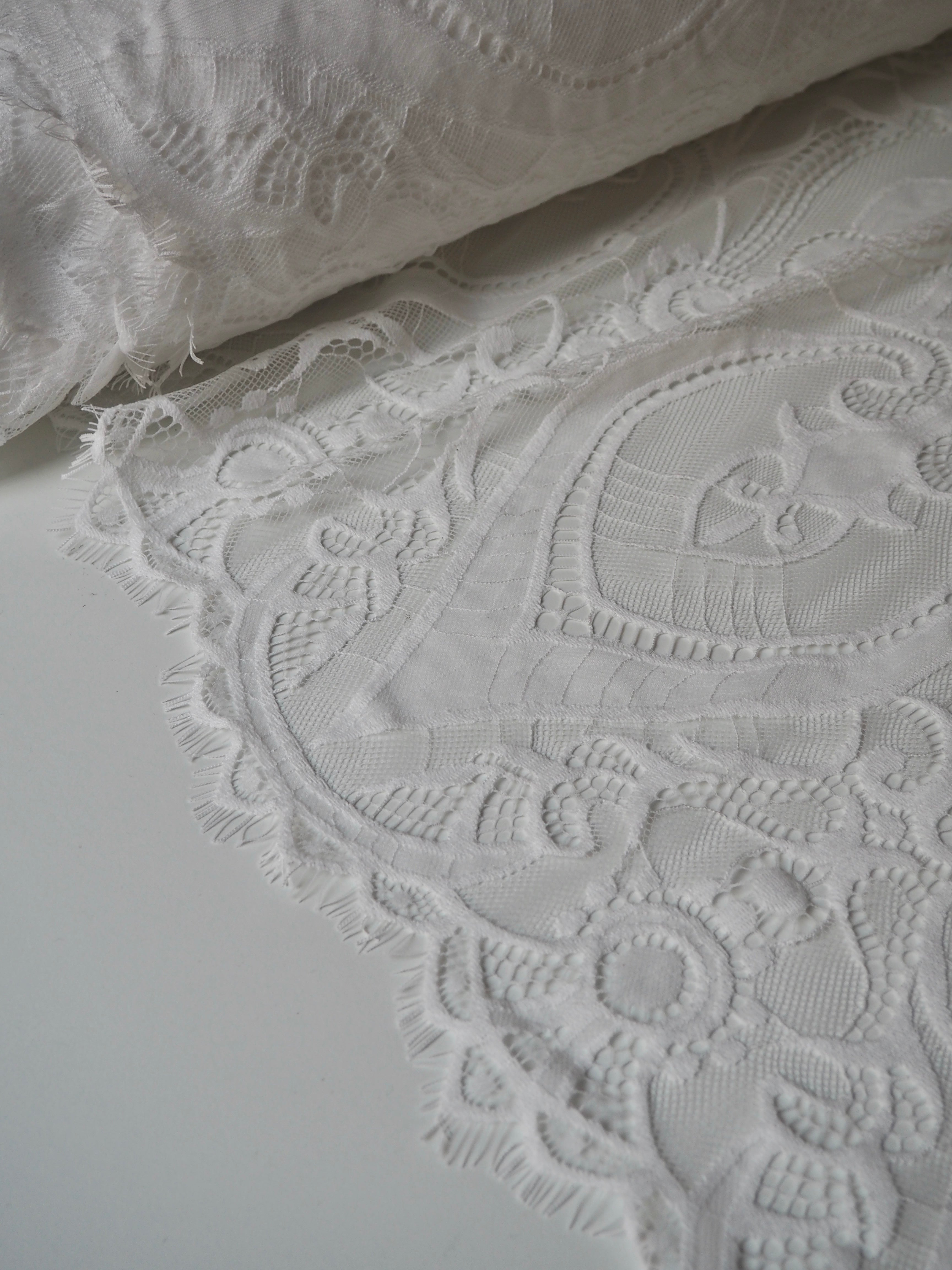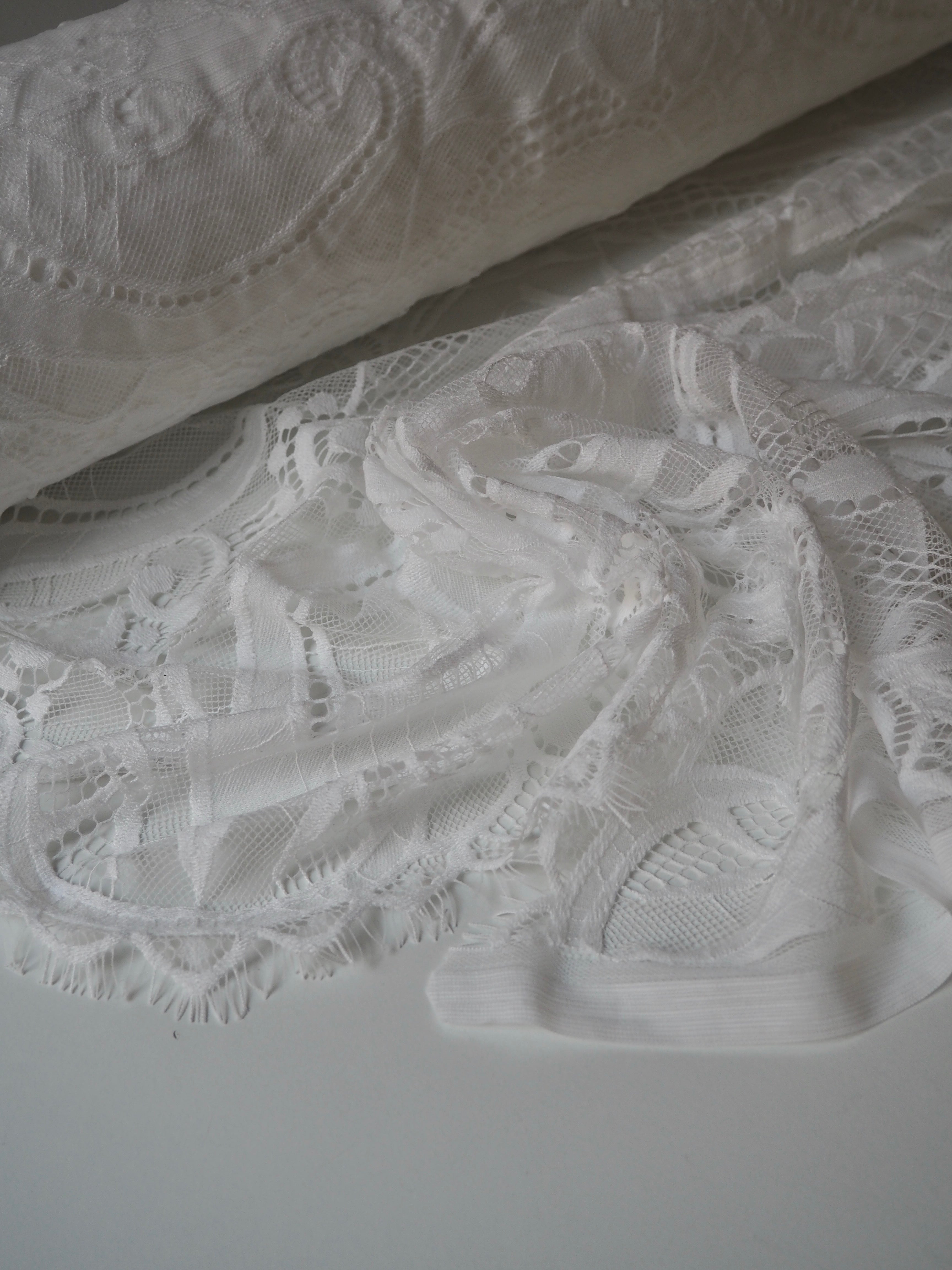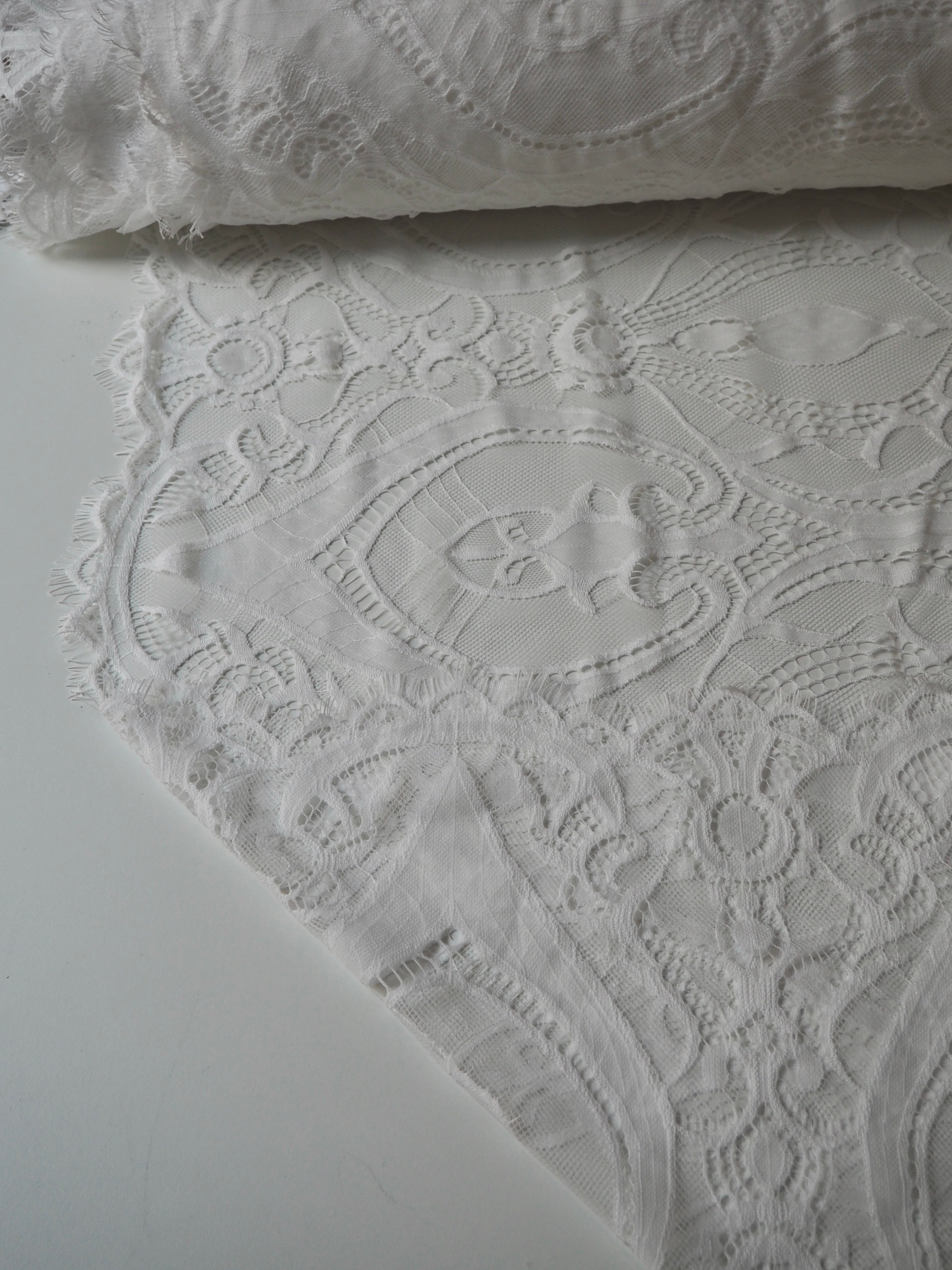 This ex-designer fabric is a lovely lace. It's in a soft white colour. It's soft and has a light sheen finish, with a very large scale scalloping pattern. Finishes with a gentle eyelash scallop on both ends. It has such a lovely drape and handle. Beautiful quality and perfect for bridal or summer tops and dresses! This lace is made in 2-3m pieces so if you order higher volume, your order might be in pieces.