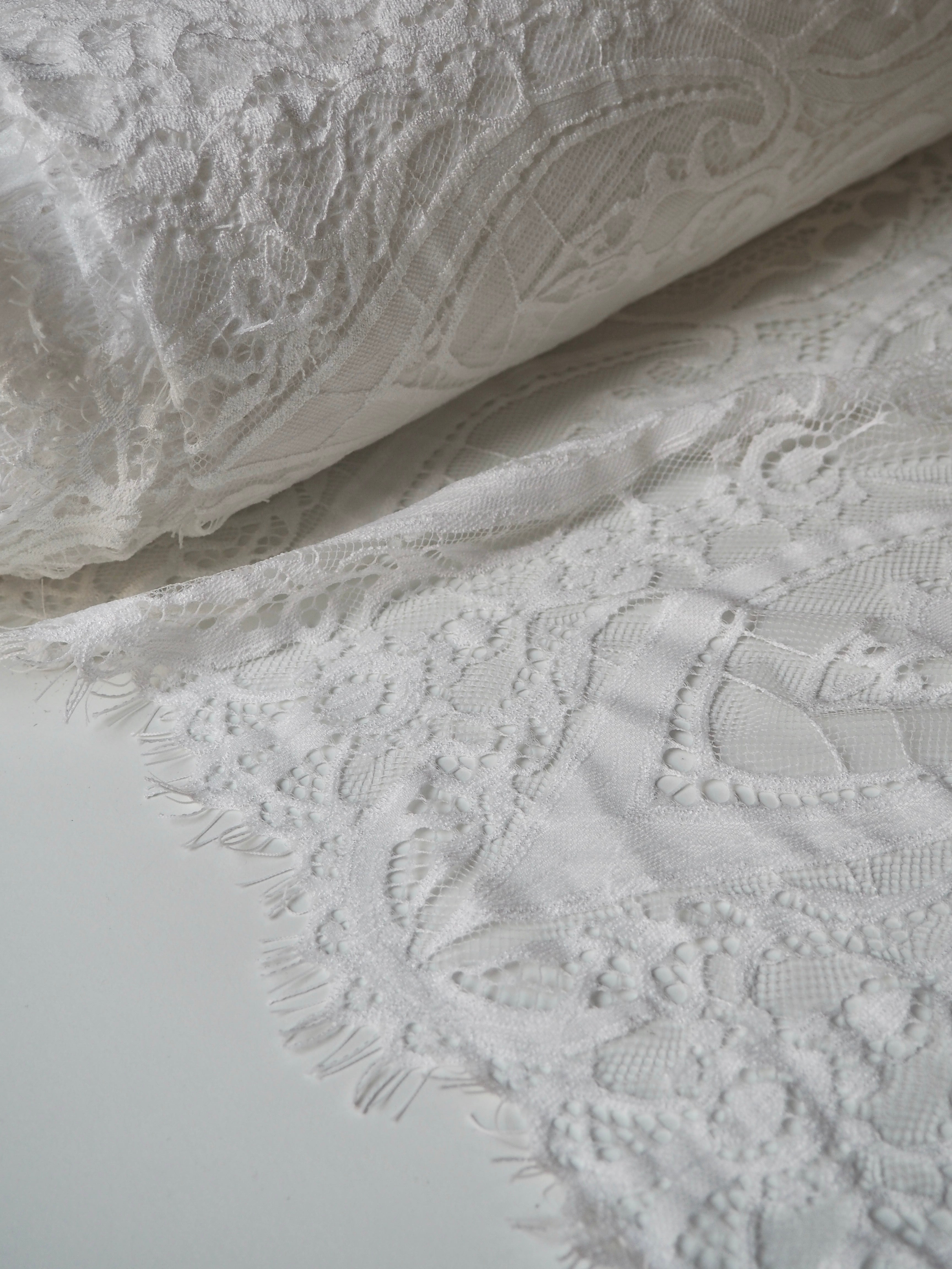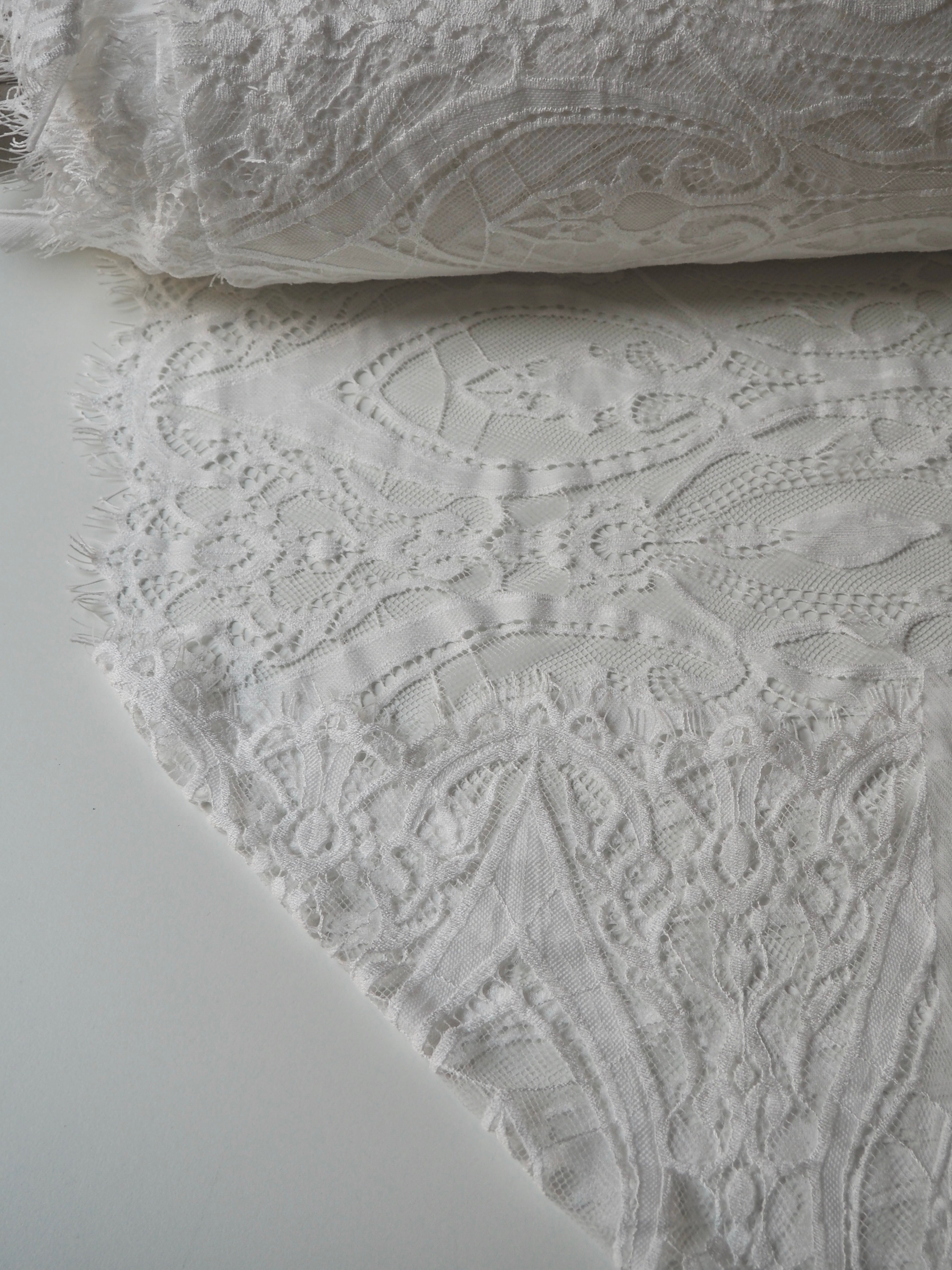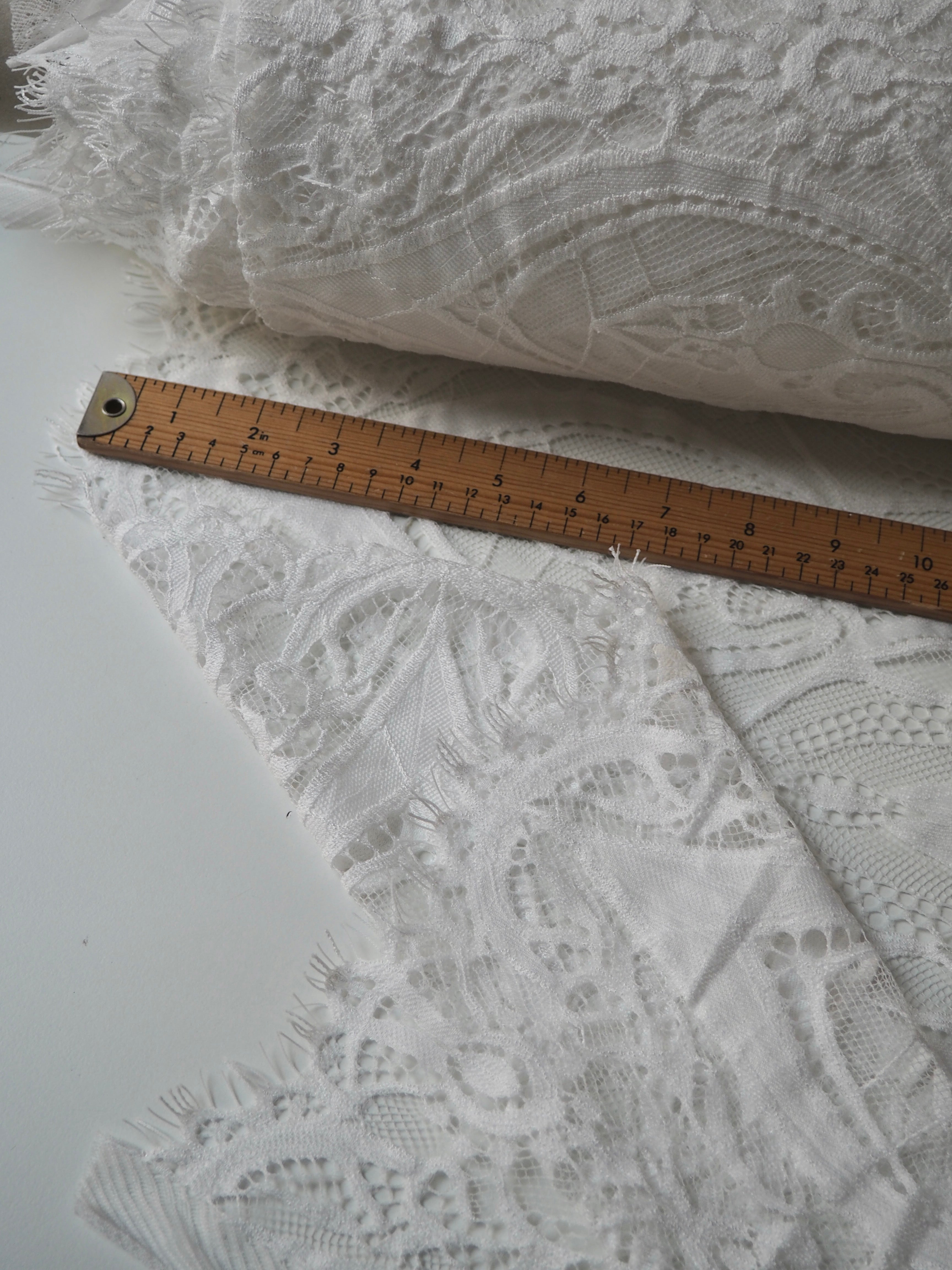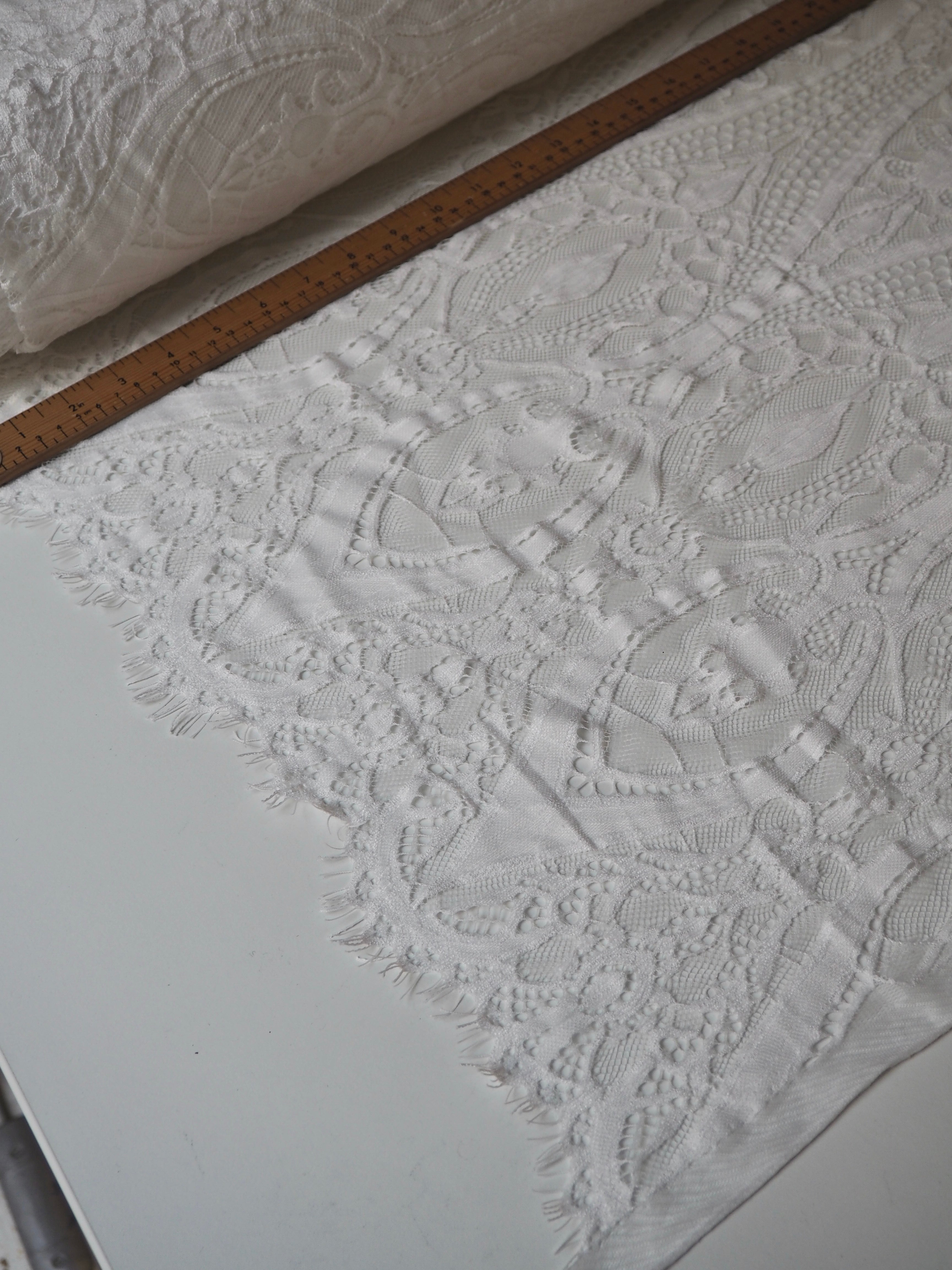 This ex-designer fabric is a lovely lace. It's in a soft white colour. It's soft and has a light sheen finish, with a large scale scalloping pattern. Finishes with a gentle eyelash scallop at both ends. It has such a lovely drape and handle. Beautiful quality and perfect for bridal or summer tops and dresses! This lace is made in 2-3m pieces so if you order higher volume, your order might be in pieces.