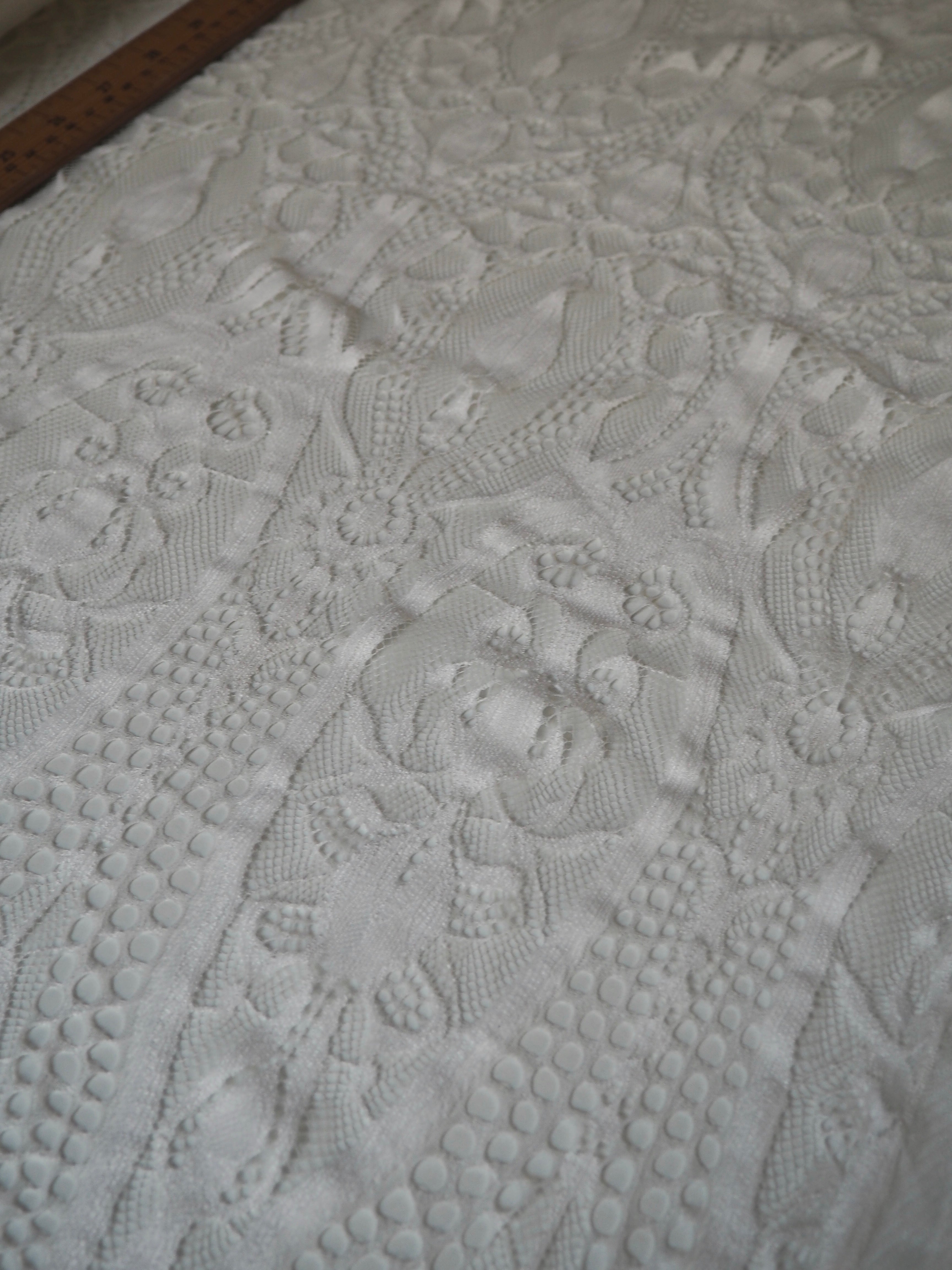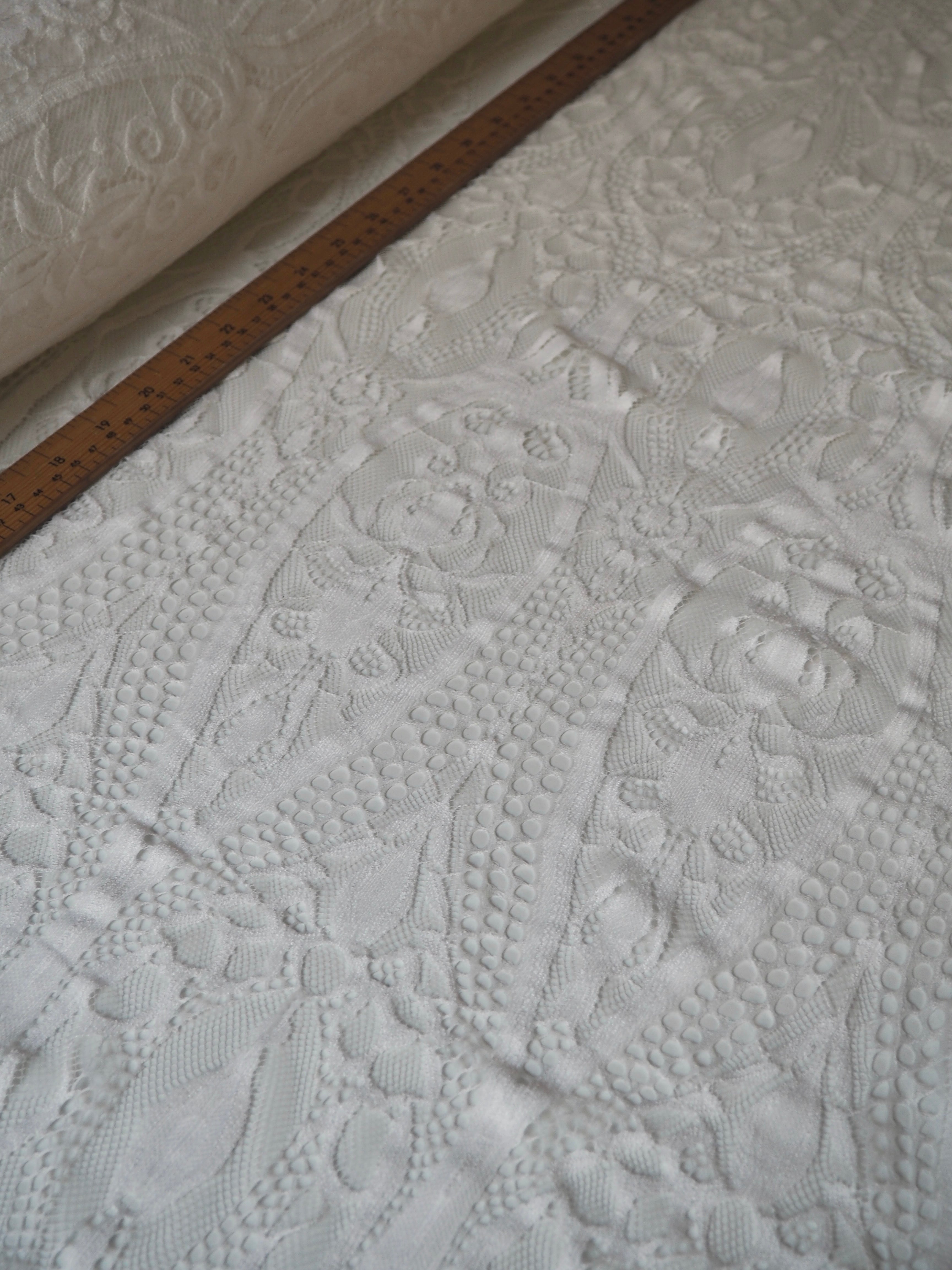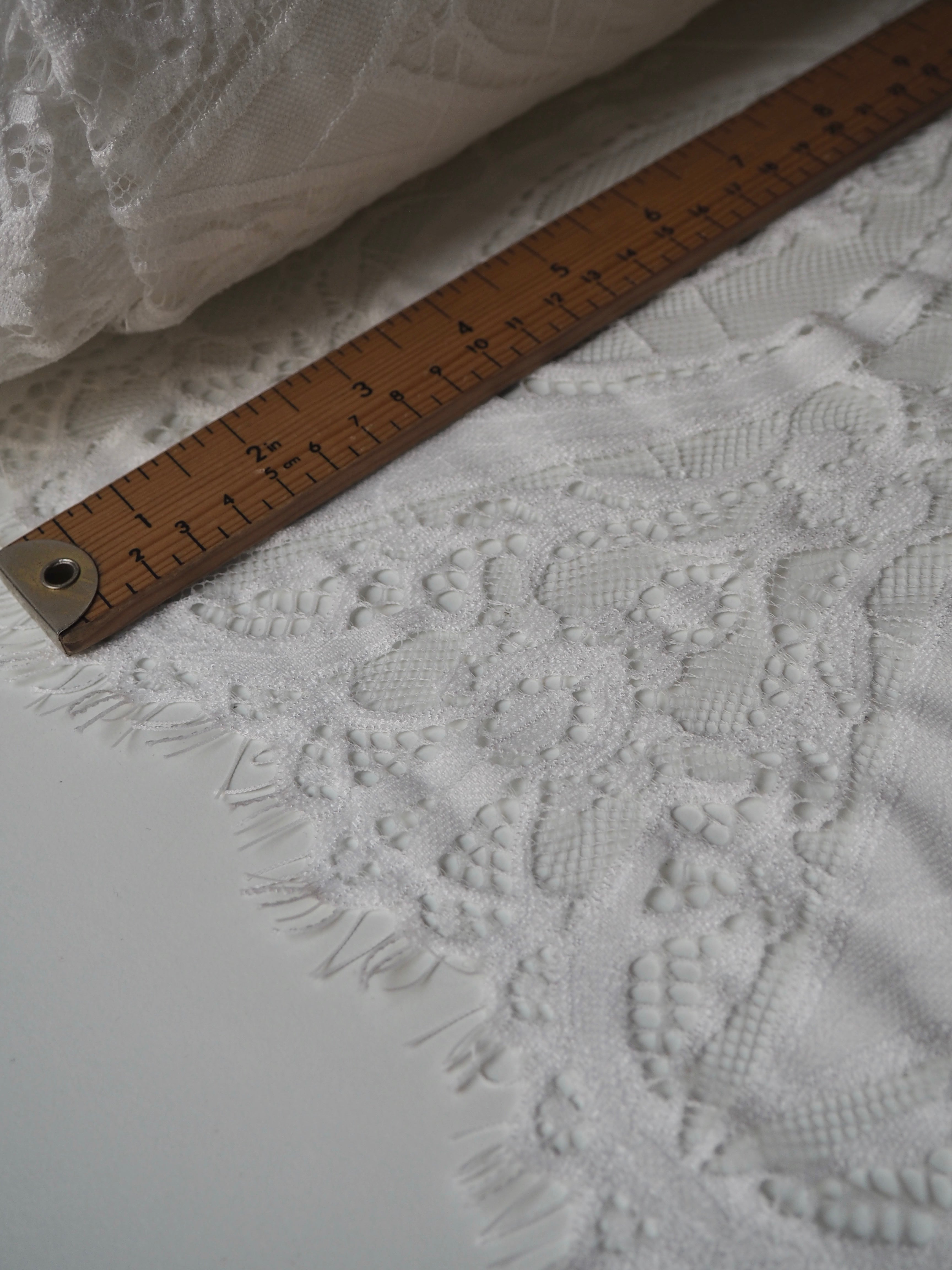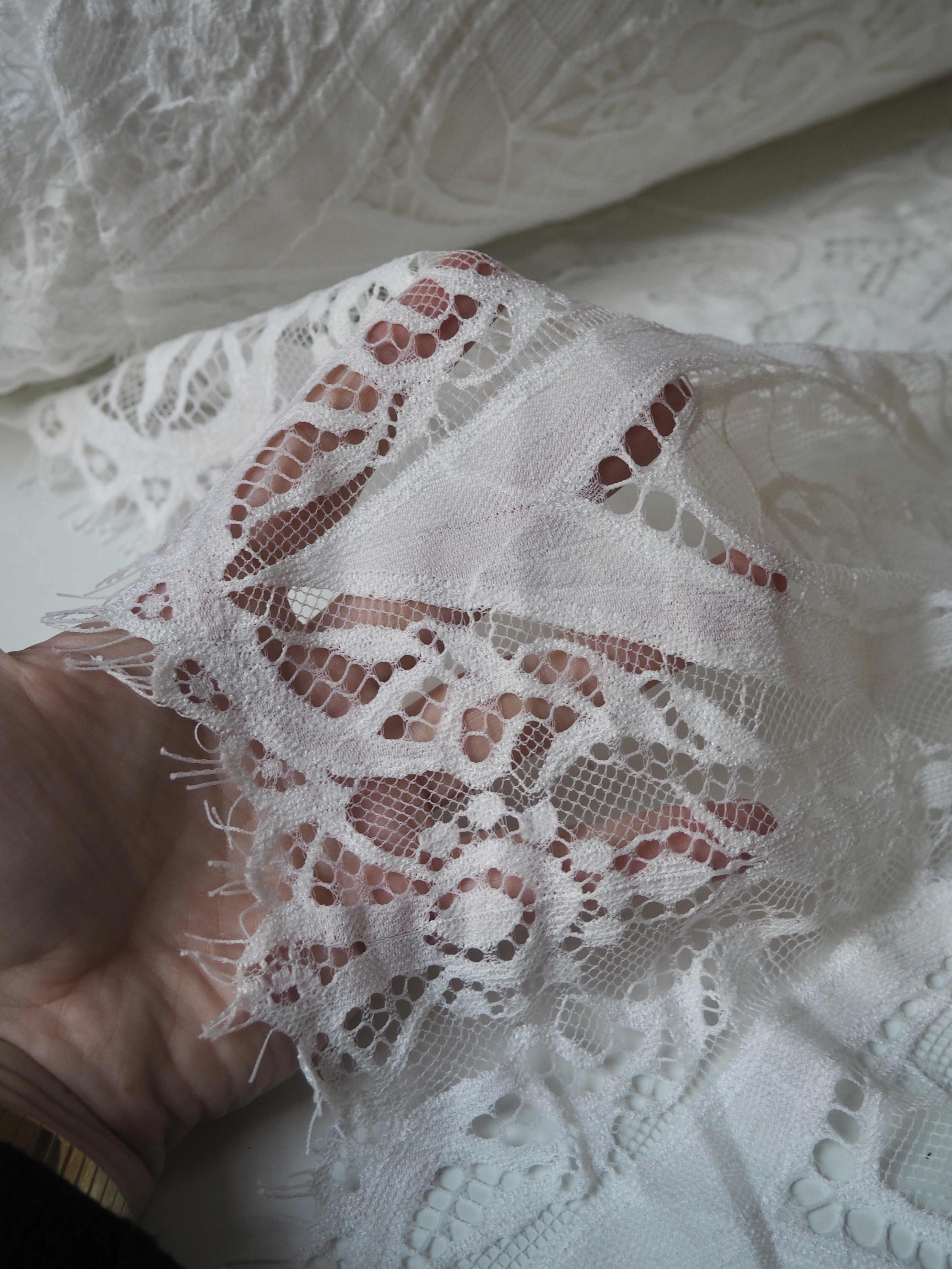 This ex-designer fabric is a lovely lace. It's in a soft white colour. It's soft and has a light sheen finish, with a large scale scalloping pattern. Finishes with a gentle eyelash scallop at both ends. It has such a lovely drape and handle. Beautiful quality and perfect for bridal or summer tops and dresses! This lace is made in 2-3m pieces so if you order higher volume, your order might be in pieces.