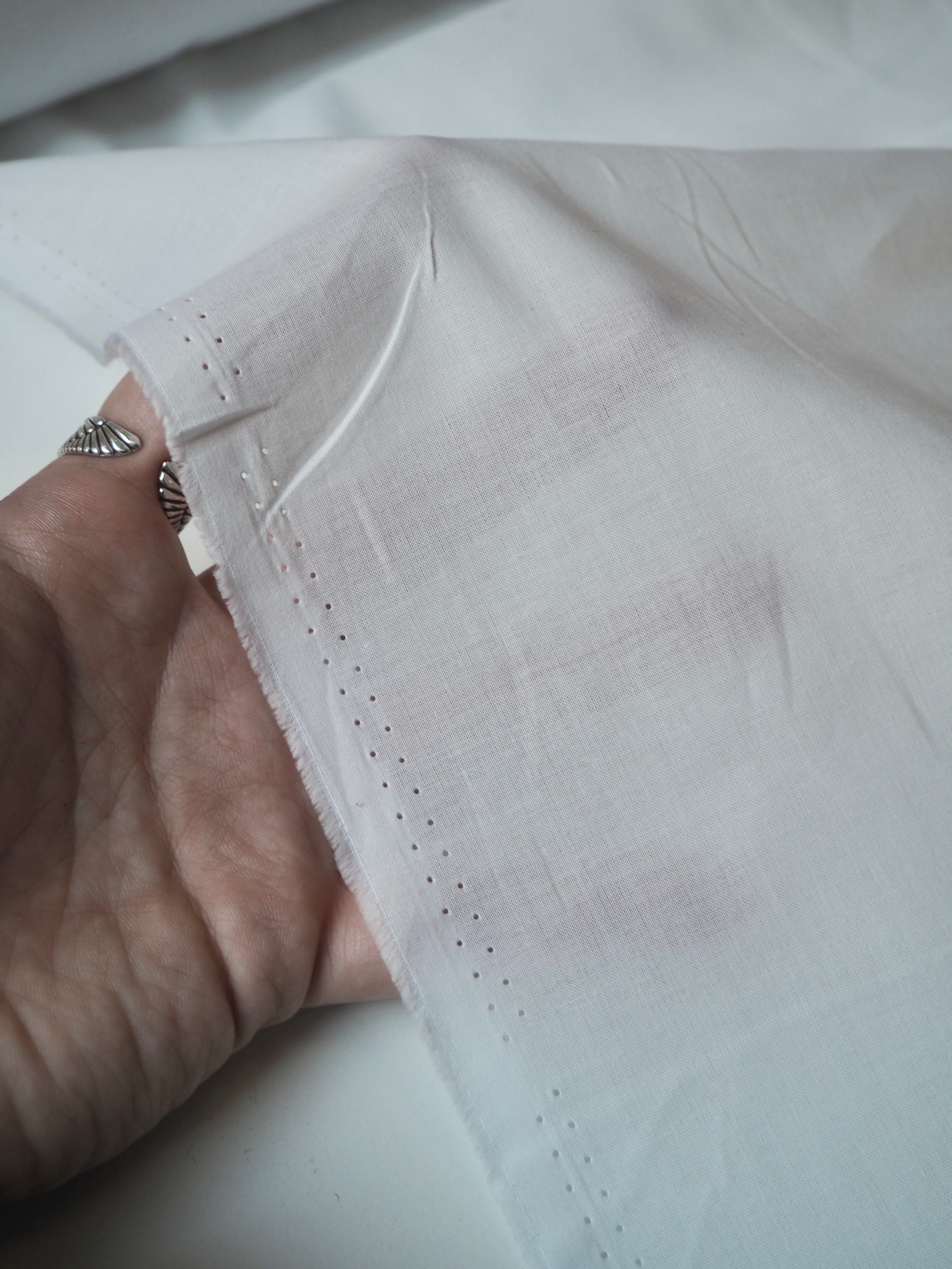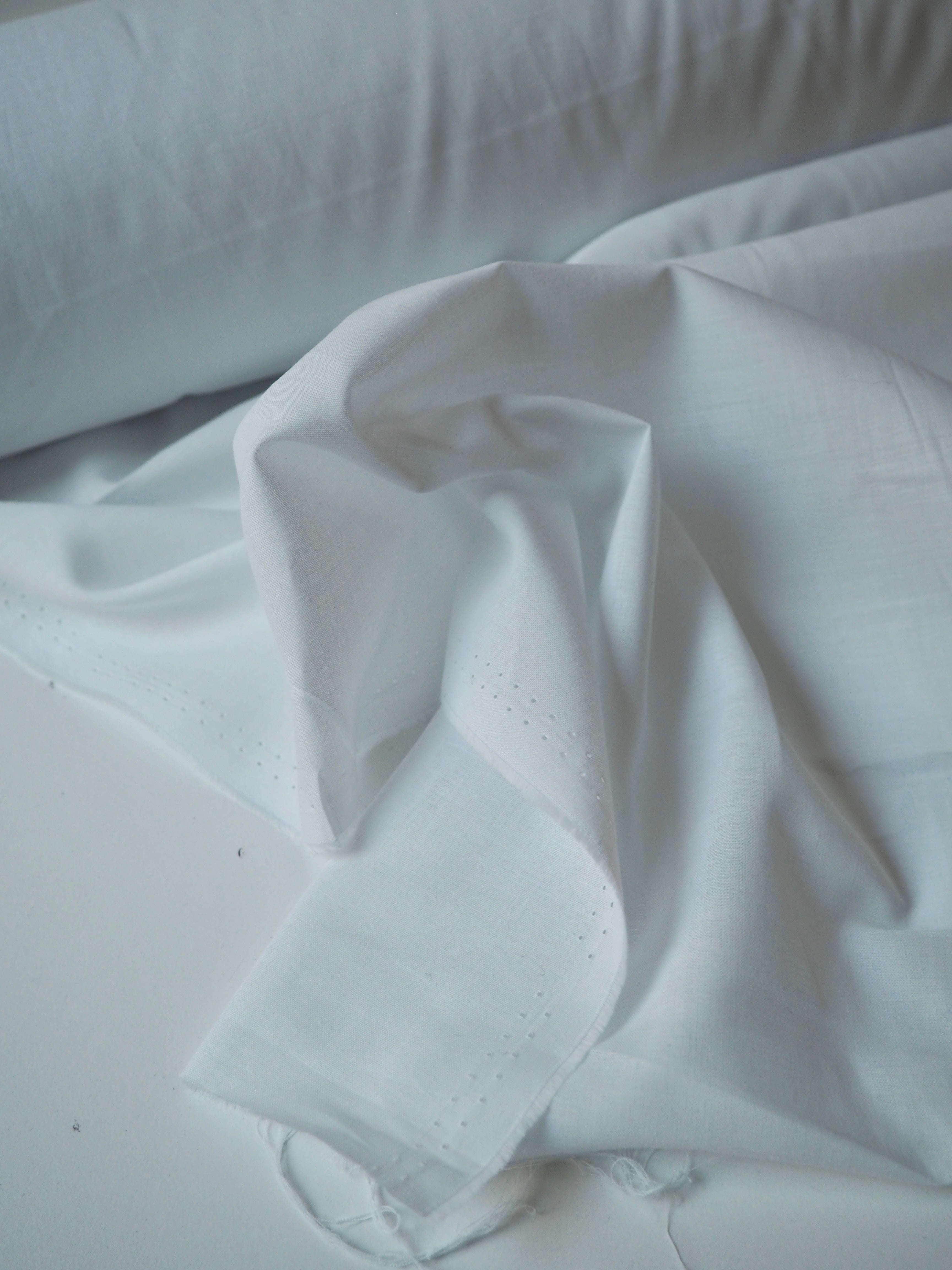 This ex-designer fabric is a cotton lawn. It's a classic white cloth with a plain weave and a comfortable handle and drape. It's soft and easy to wear, and perfect for any staple garments. This one is lightweight and is semi- sheer. Perfect as a lining or for a nice summer top!