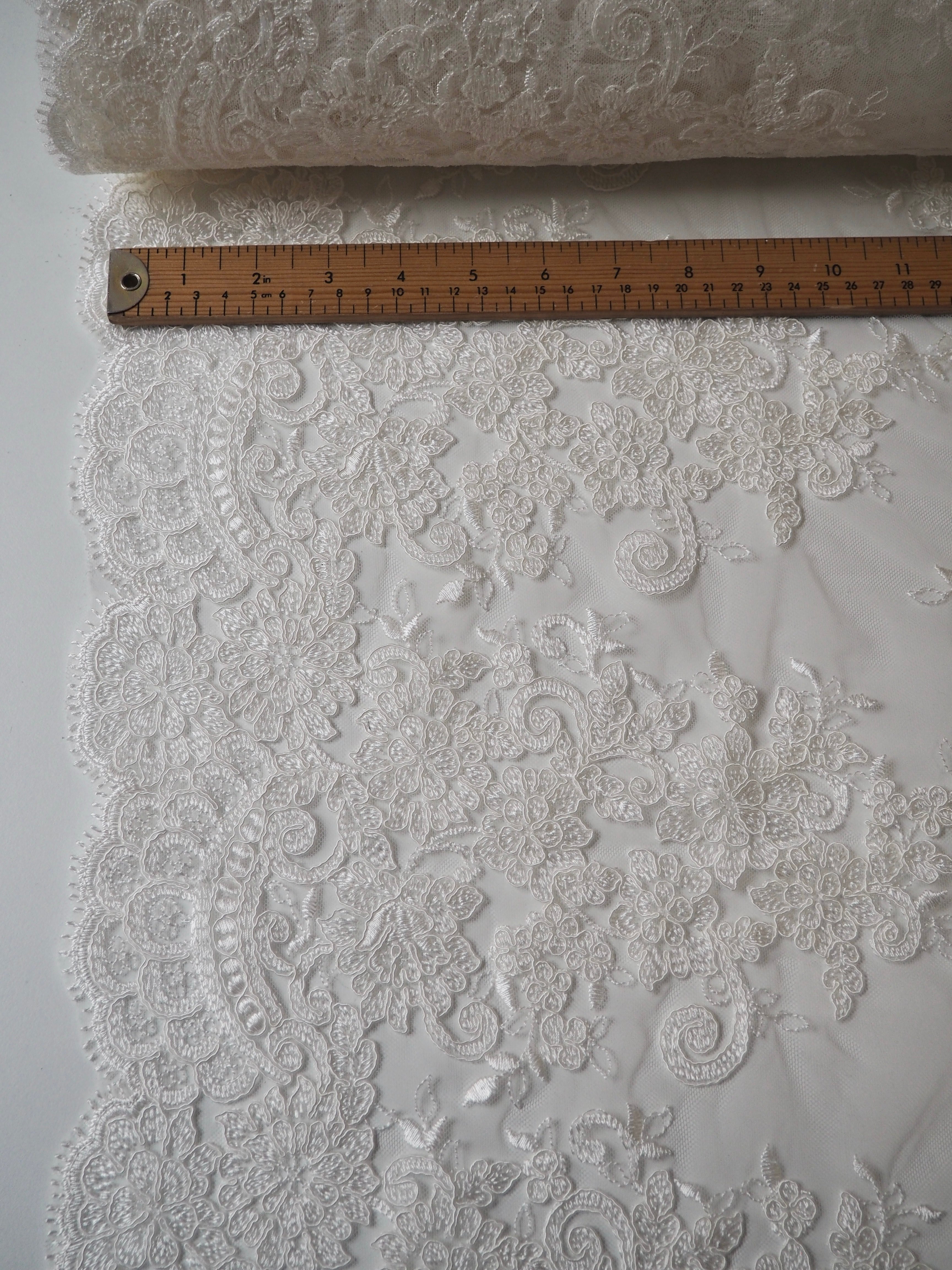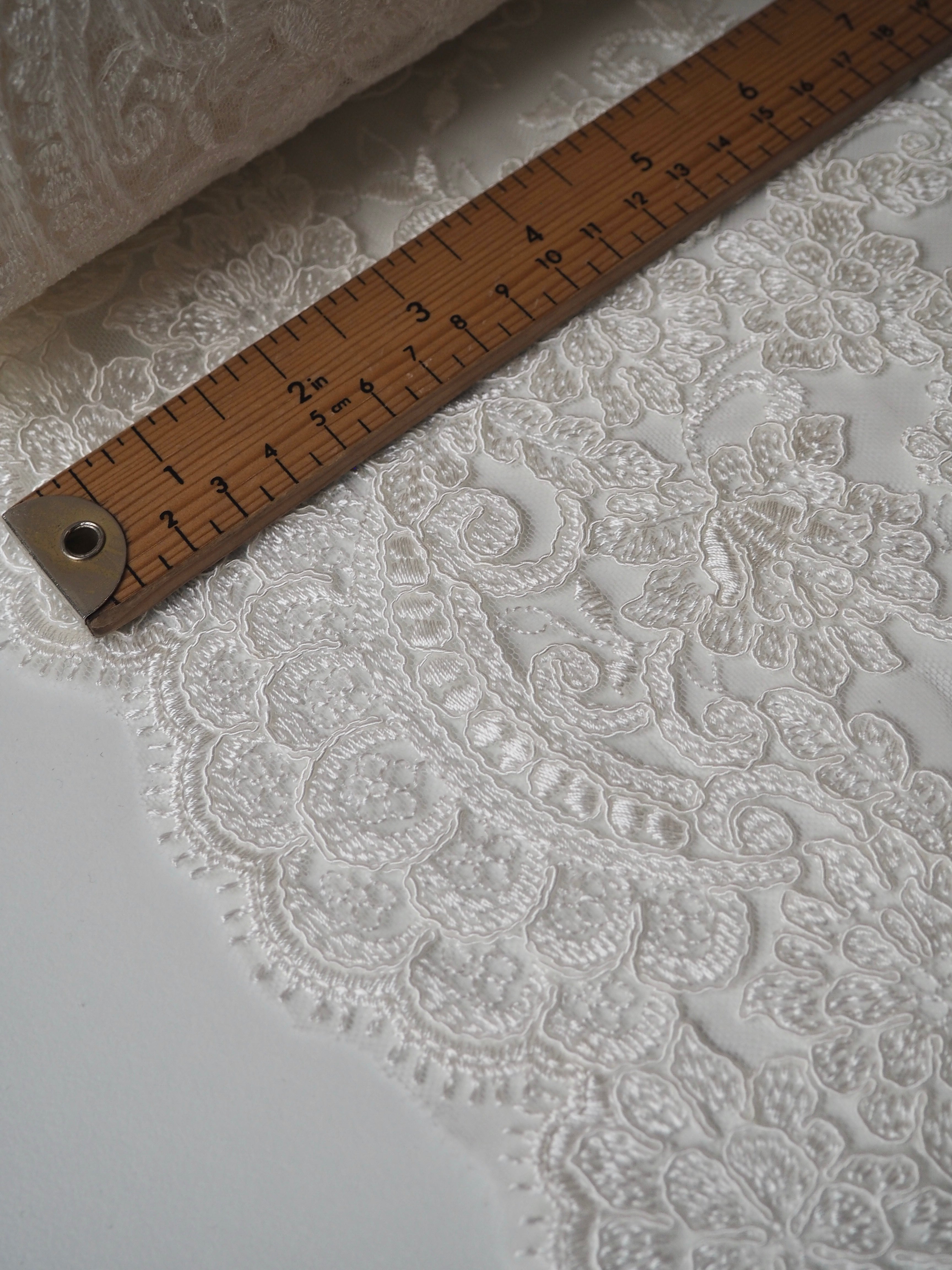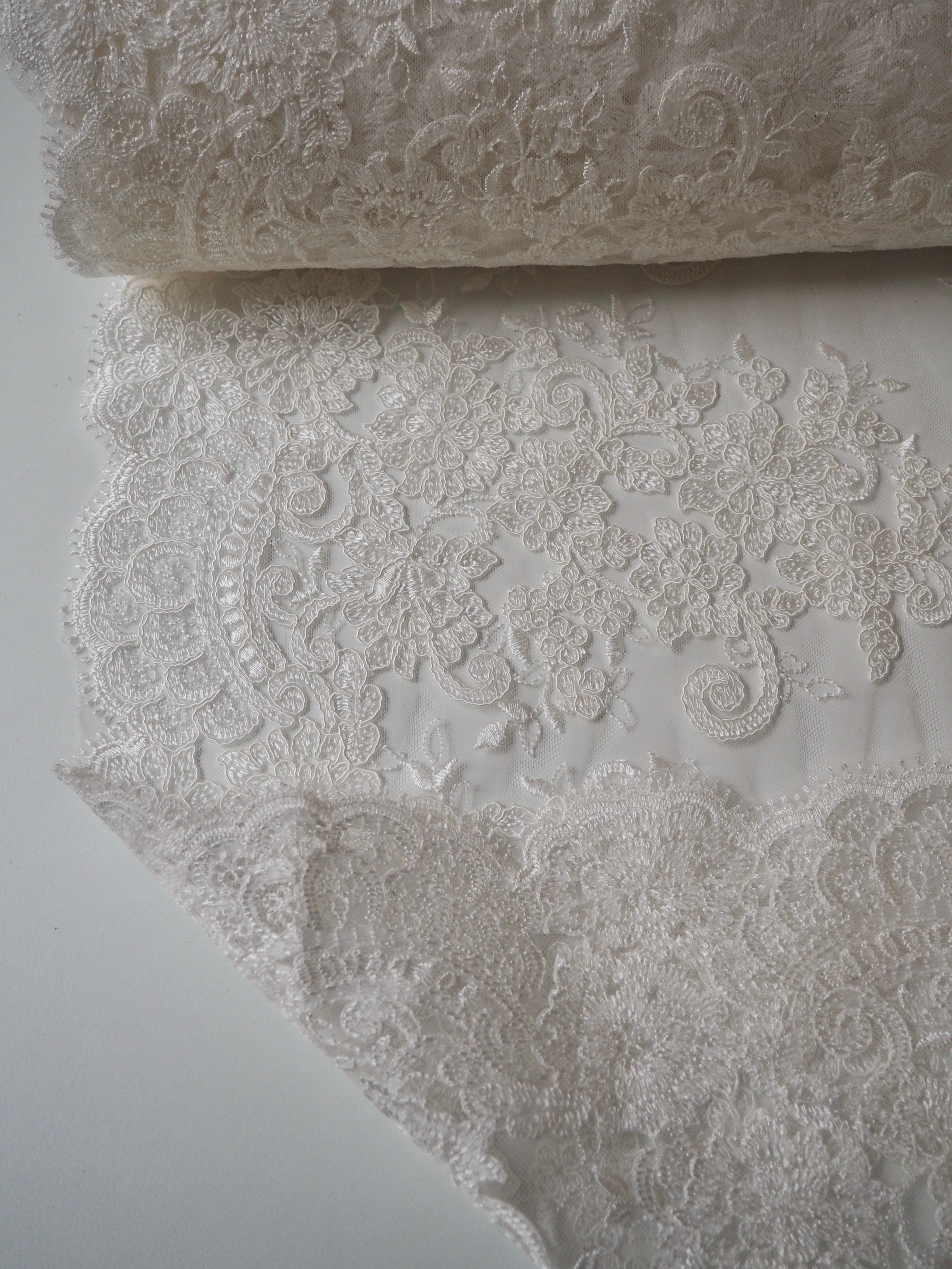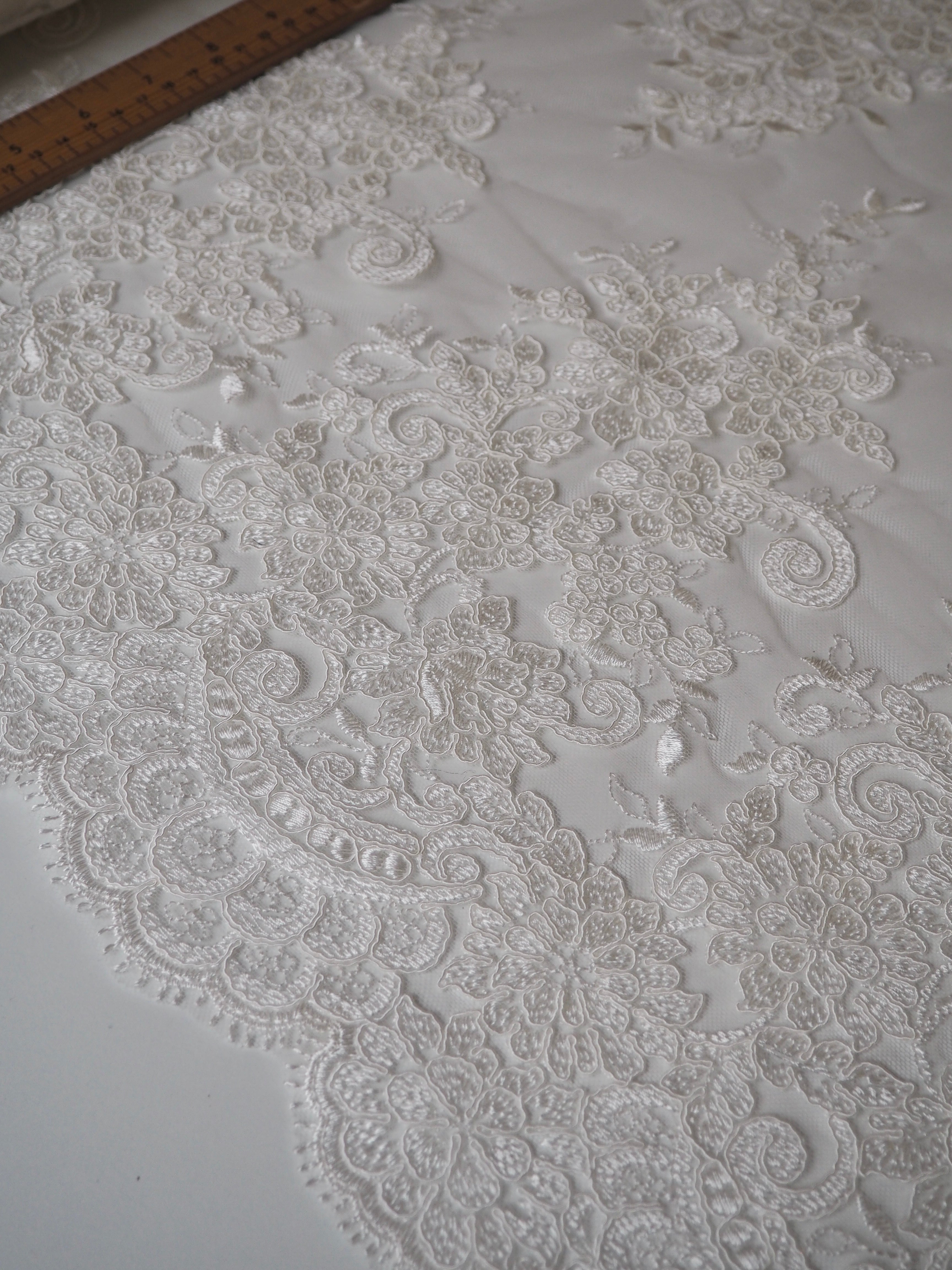 This ex-designer fabric is a gorgeous corded lace. Ivory flowers are corded in scalloped motifs at both ends of this cloth, with motifs uniformly embroidered in between on this ivory tulle. The fabric can be used as one piece or the motifs could be cut out and appliqued on for denser coverage. Medium weight and lovely, quality handle. Medium coverage. Perfect for bridal!