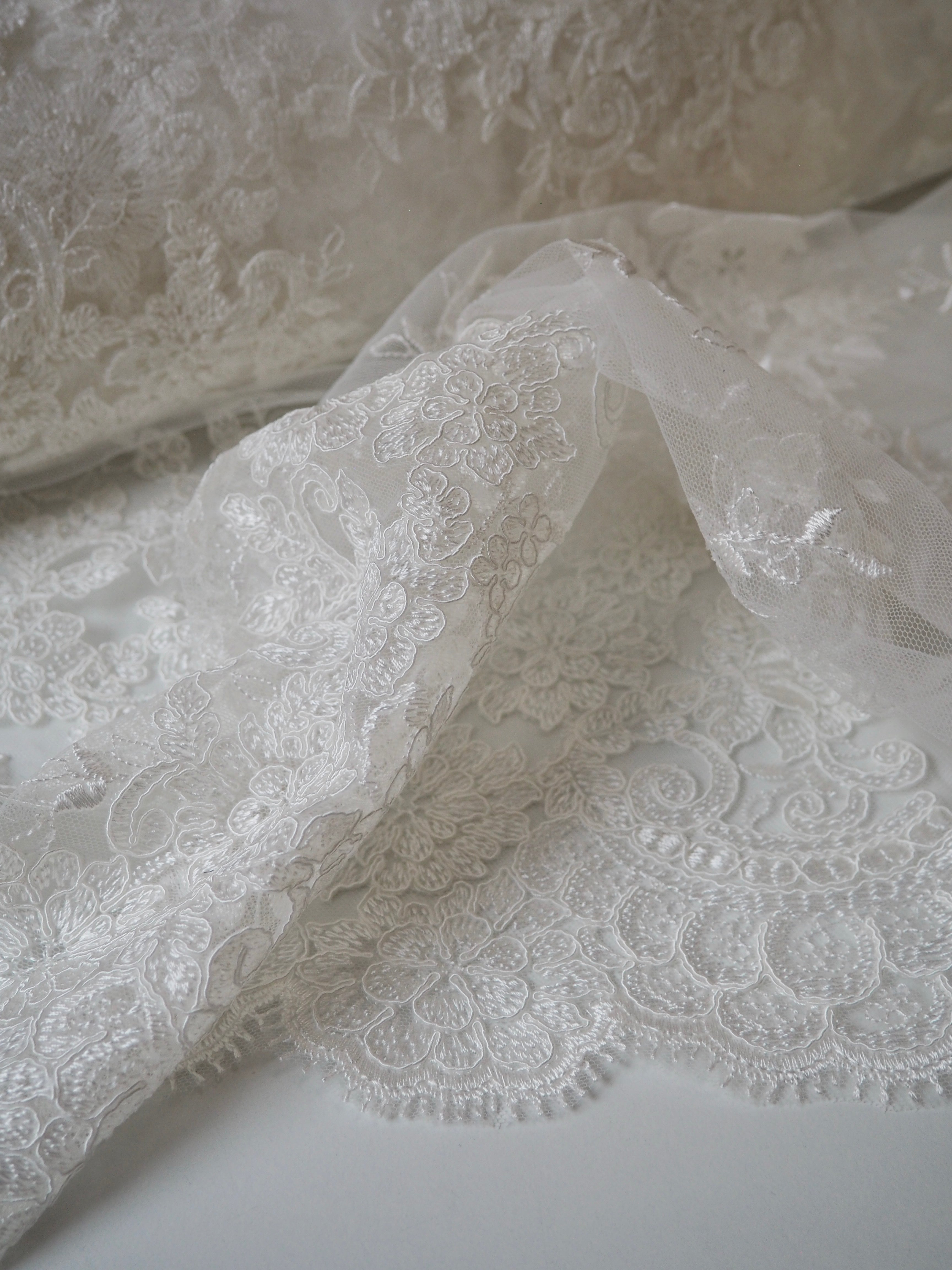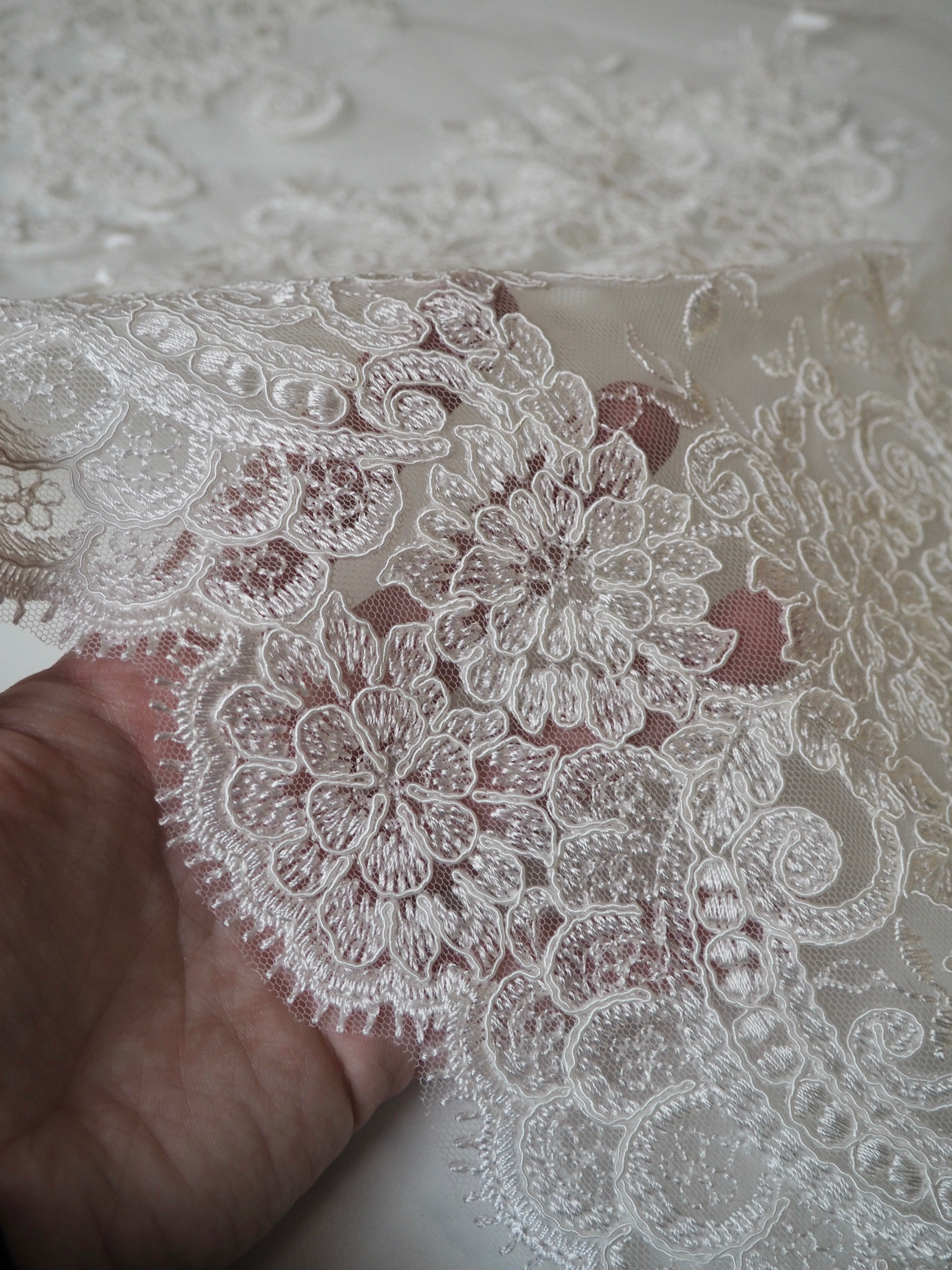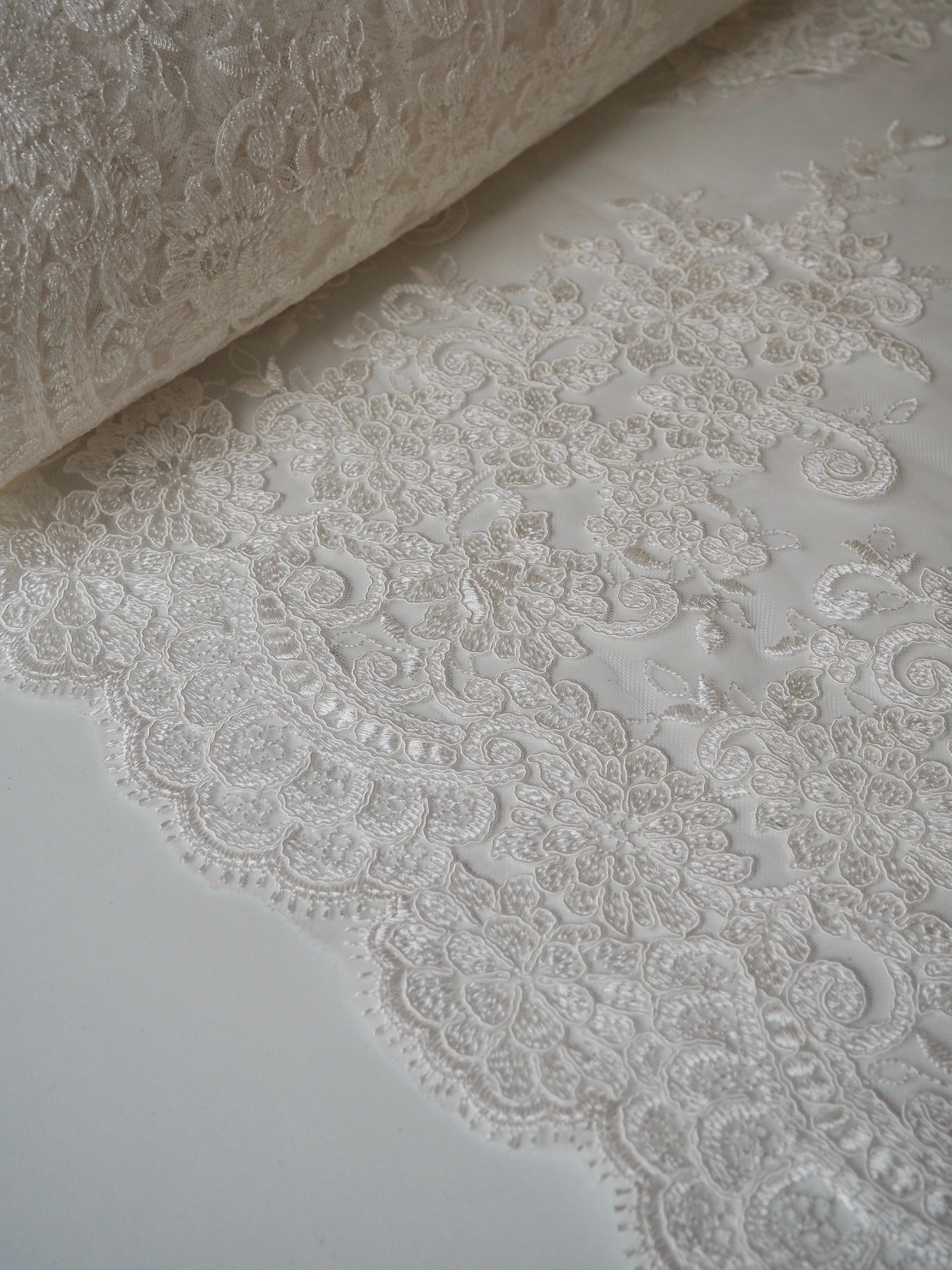 This ex-designer fabric is a gorgeous corded lace. Ivory flowers are corded in scalloped motifs at both ends of this cloth, with motifs uniformly embroidered in between on this ivory tulle. The fabric can be used as one piece or the motifs could be cut out and appliqued on for denser coverage. Medium weight and lovely, quality handle. Medium coverage. Perfect for bridal!
