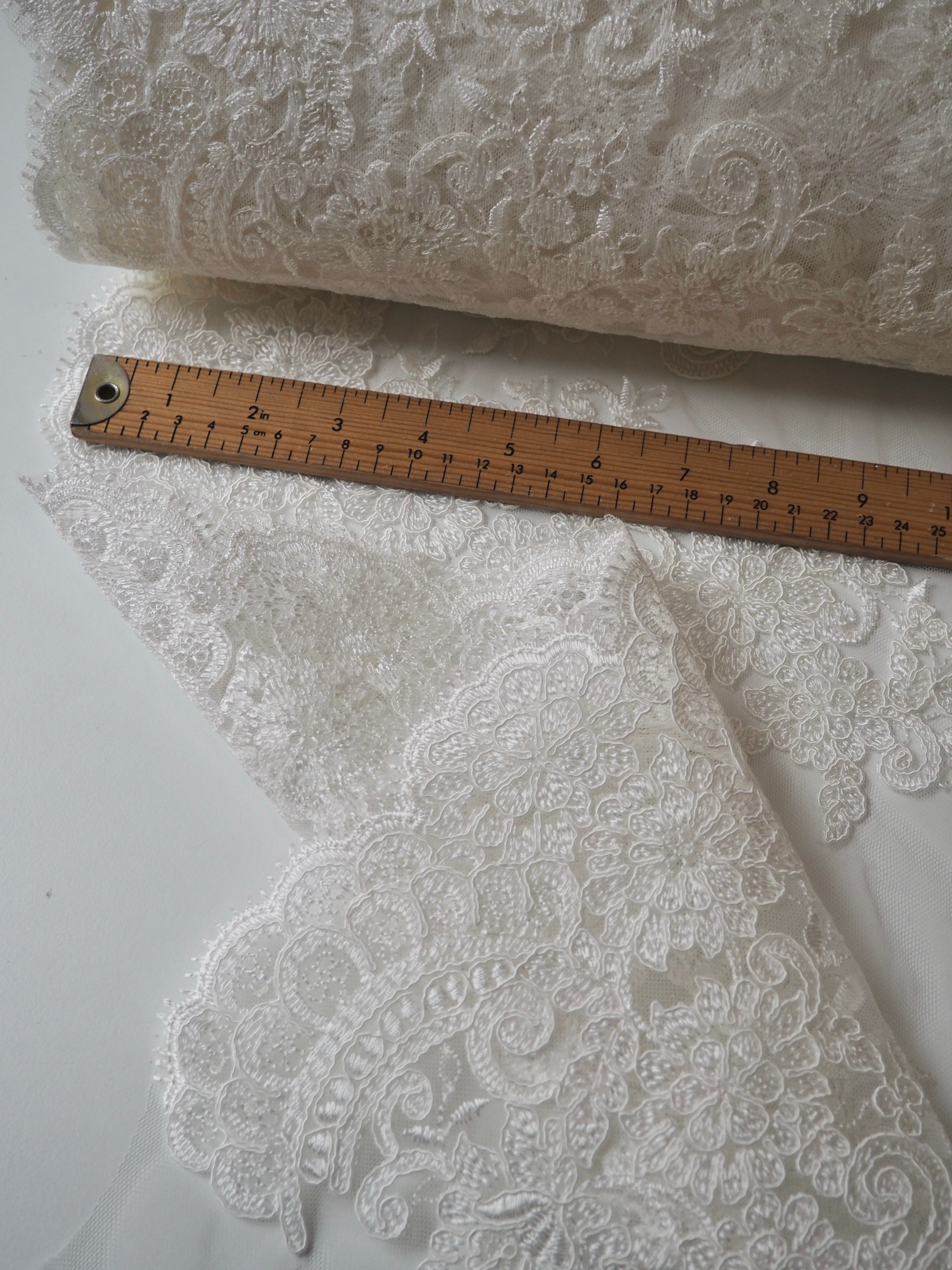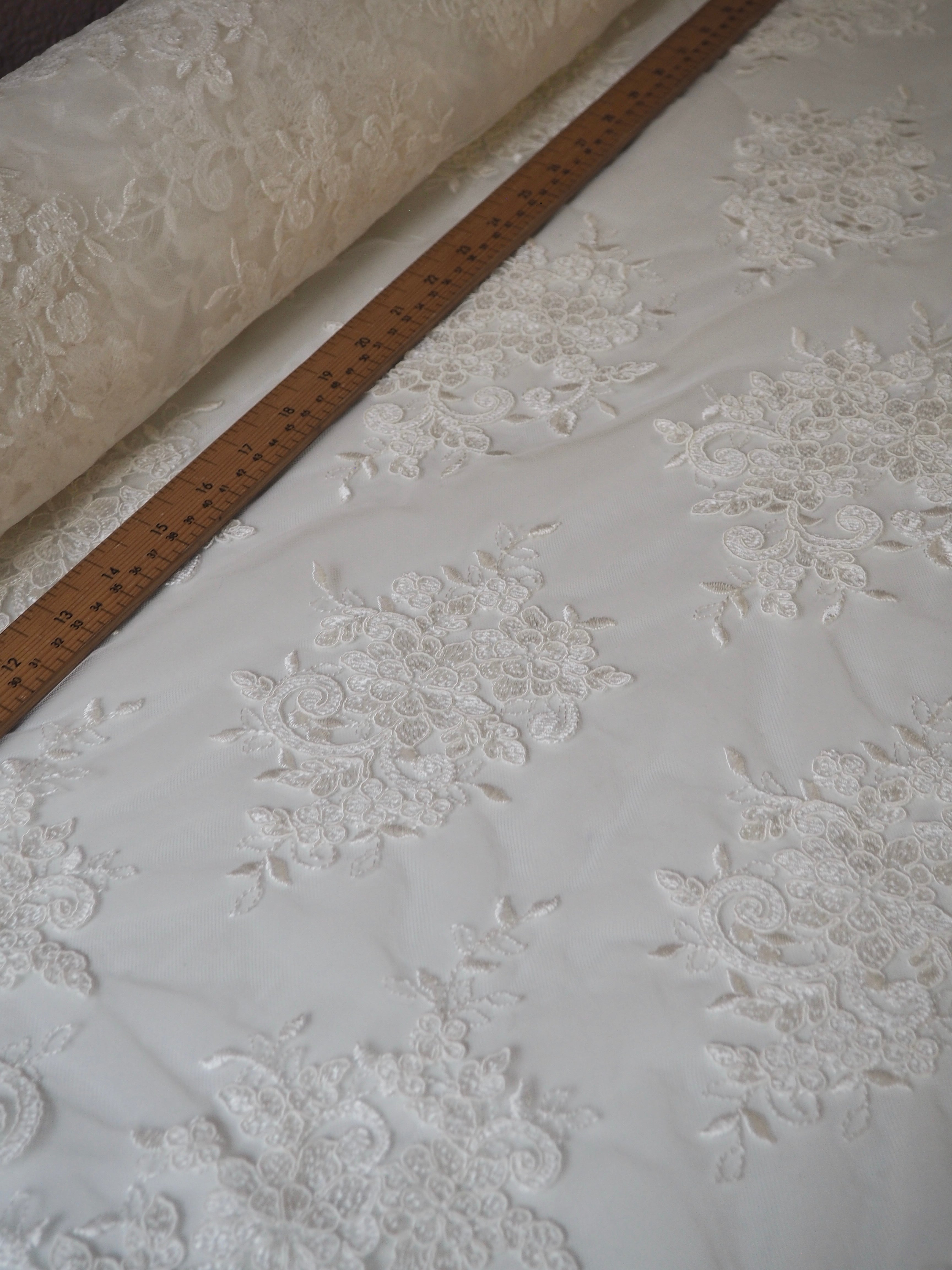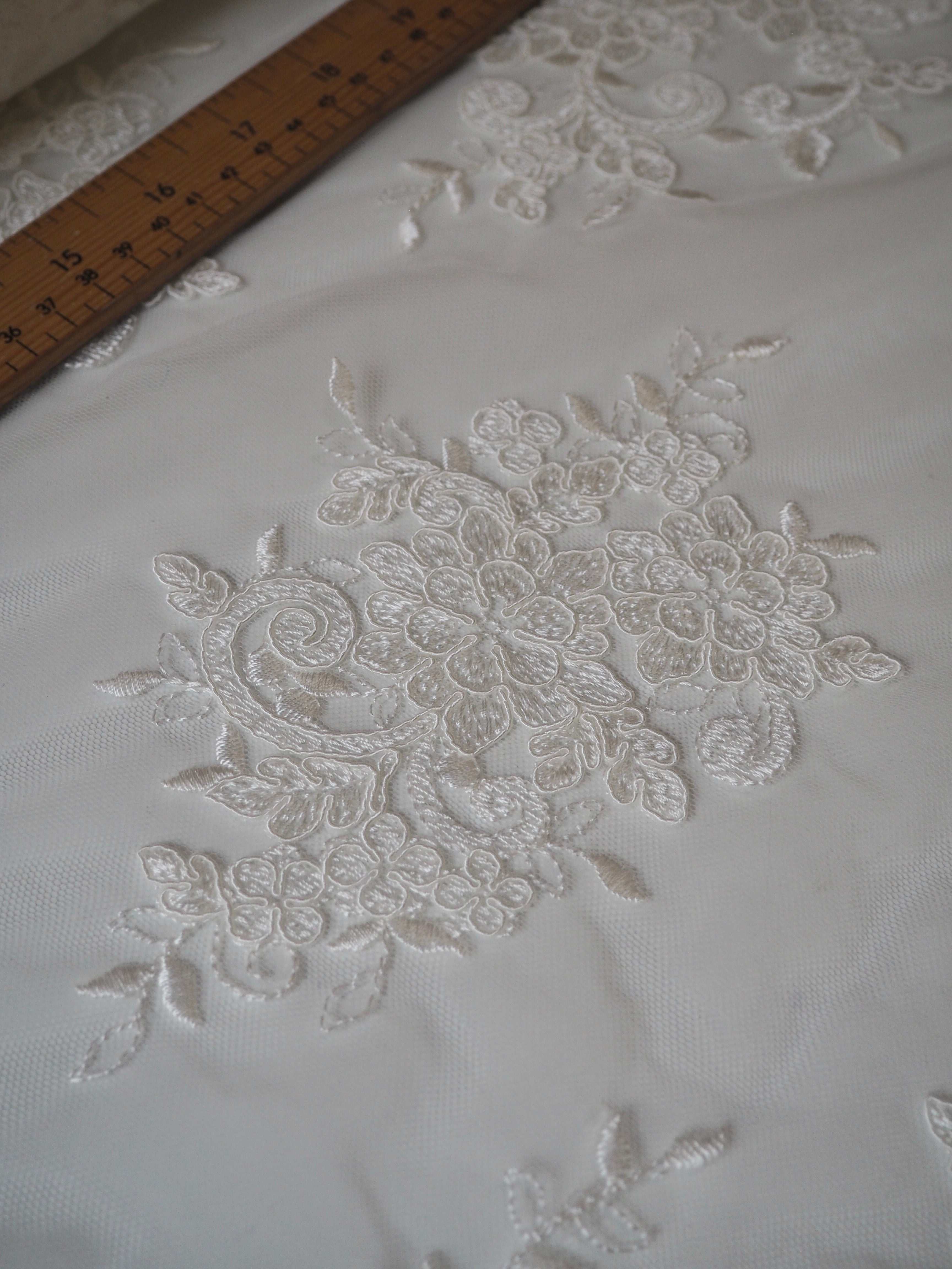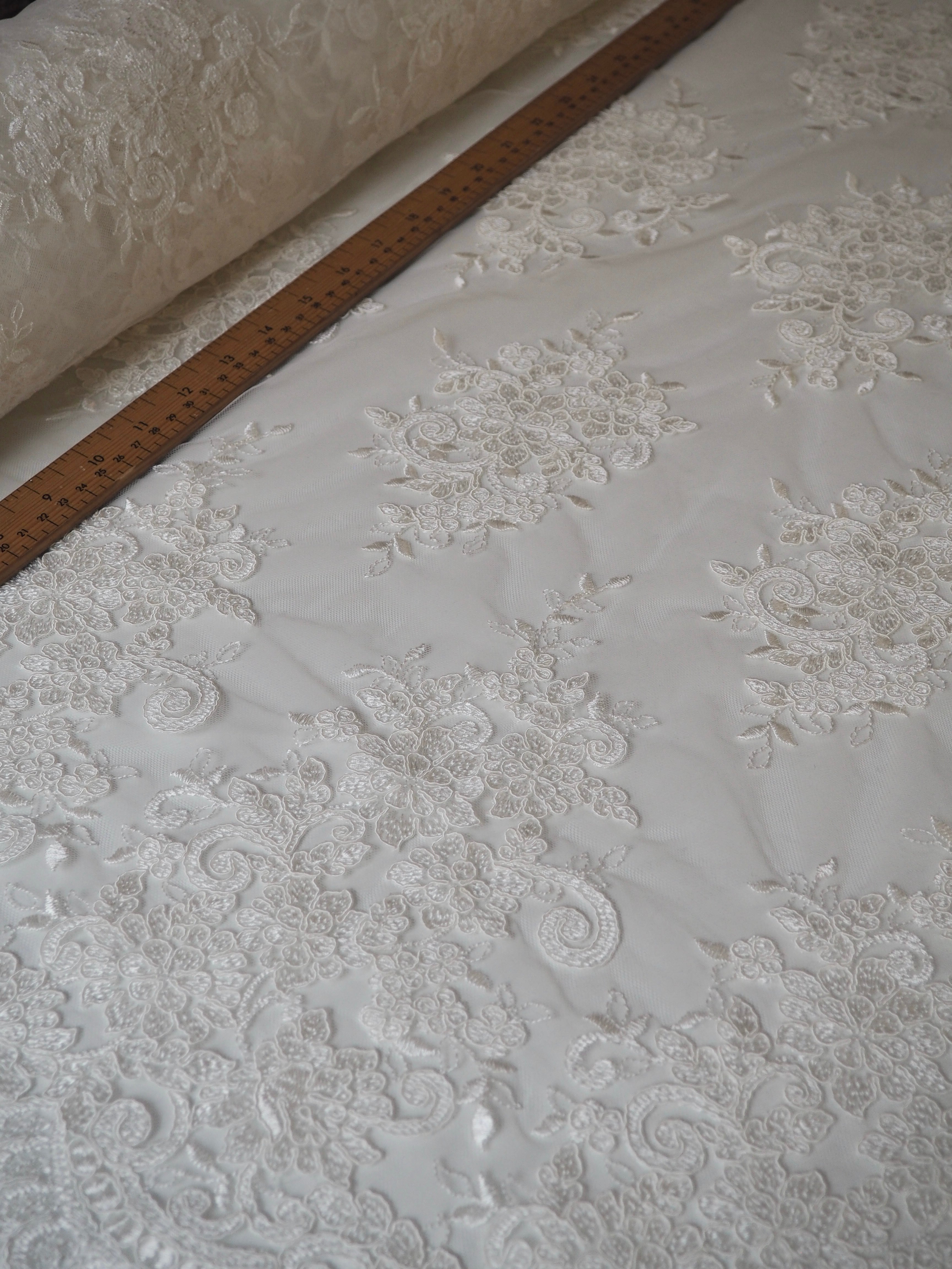 This ex-designer fabric is a gorgeous corded lace. Ivory flowers are corded in scalloped motifs at both ends of this cloth, with motifs uniformly embroidered in between on this ivory tulle. The fabric can be used as one piece or the motifs could be cut out and appliqued on for denser coverage. Medium weight and lovely, quality handle. Medium coverage. Perfect for bridal!