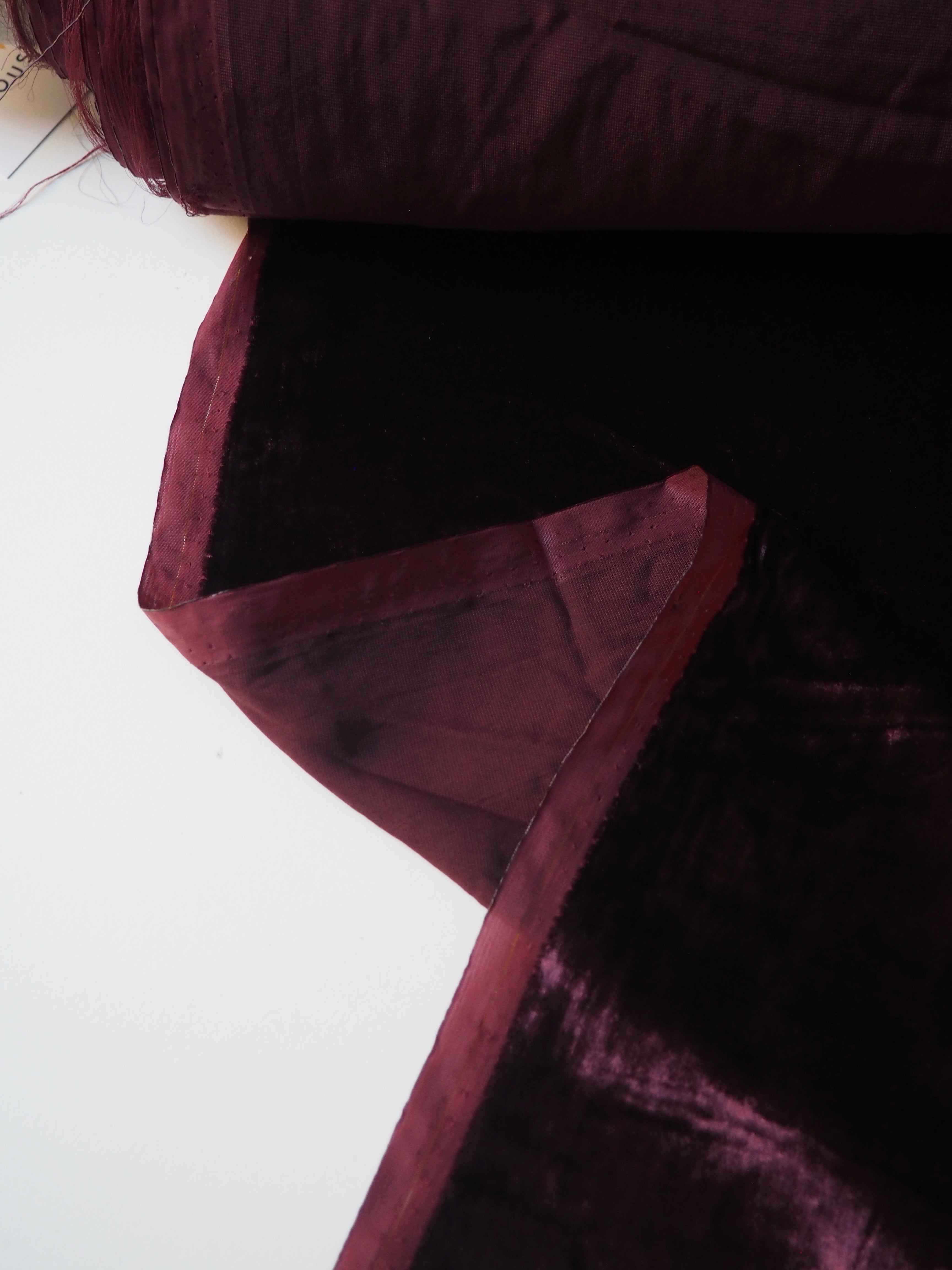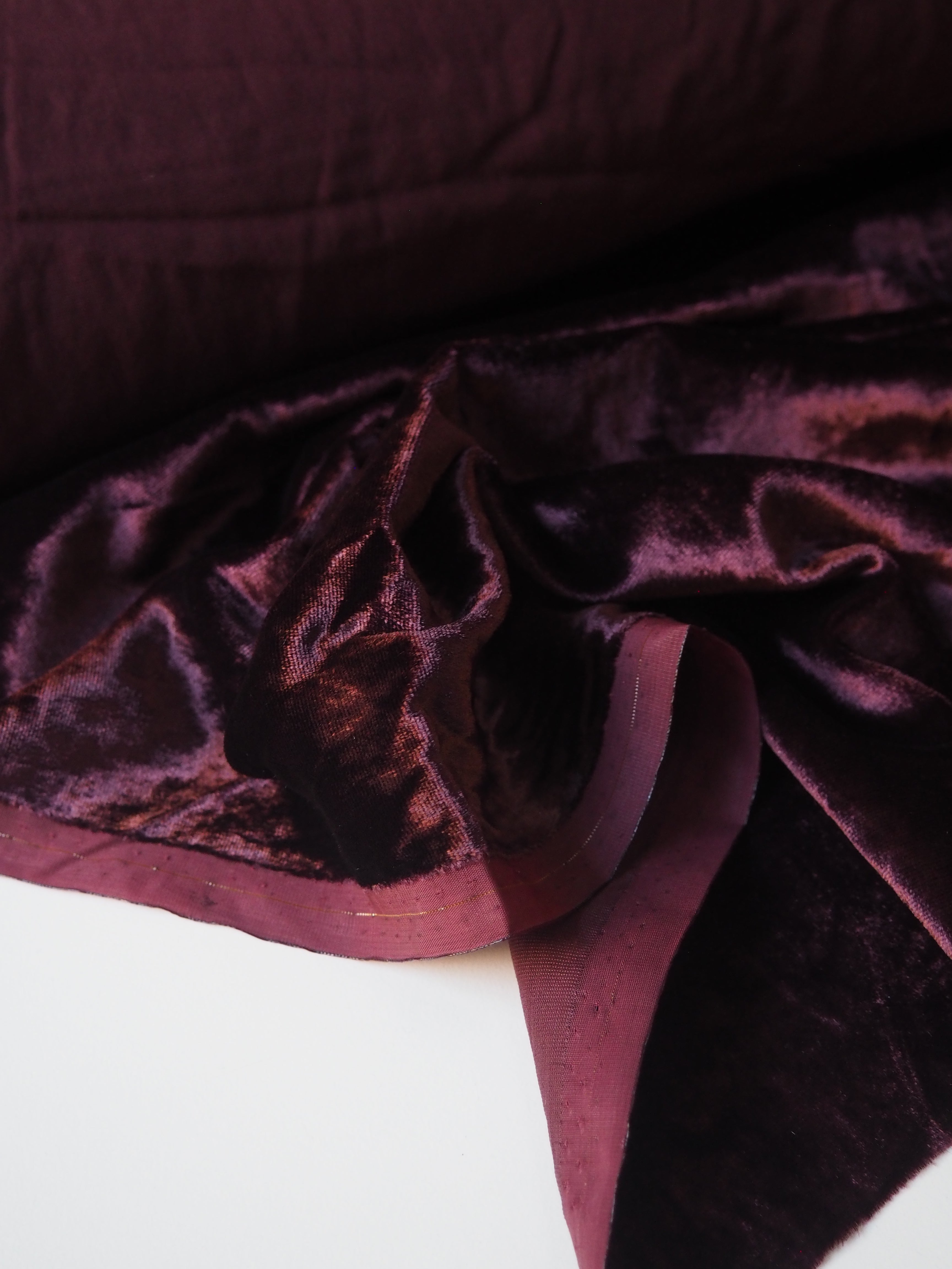 This ex-designer fabric is a sumptuous velvet. It's incredibly soft and luxurious. It has a slightly crushed finish, it came from the designer in a box, so the pile has slight pressure marks. This should revive with steam and brushing! It's opaque, with such a beautiful sheen. Has a light to medium pile that is wonderful to handle. Lightweight and with a beautiful drape and lovely movement. Perfect for a dress or even a blouse!