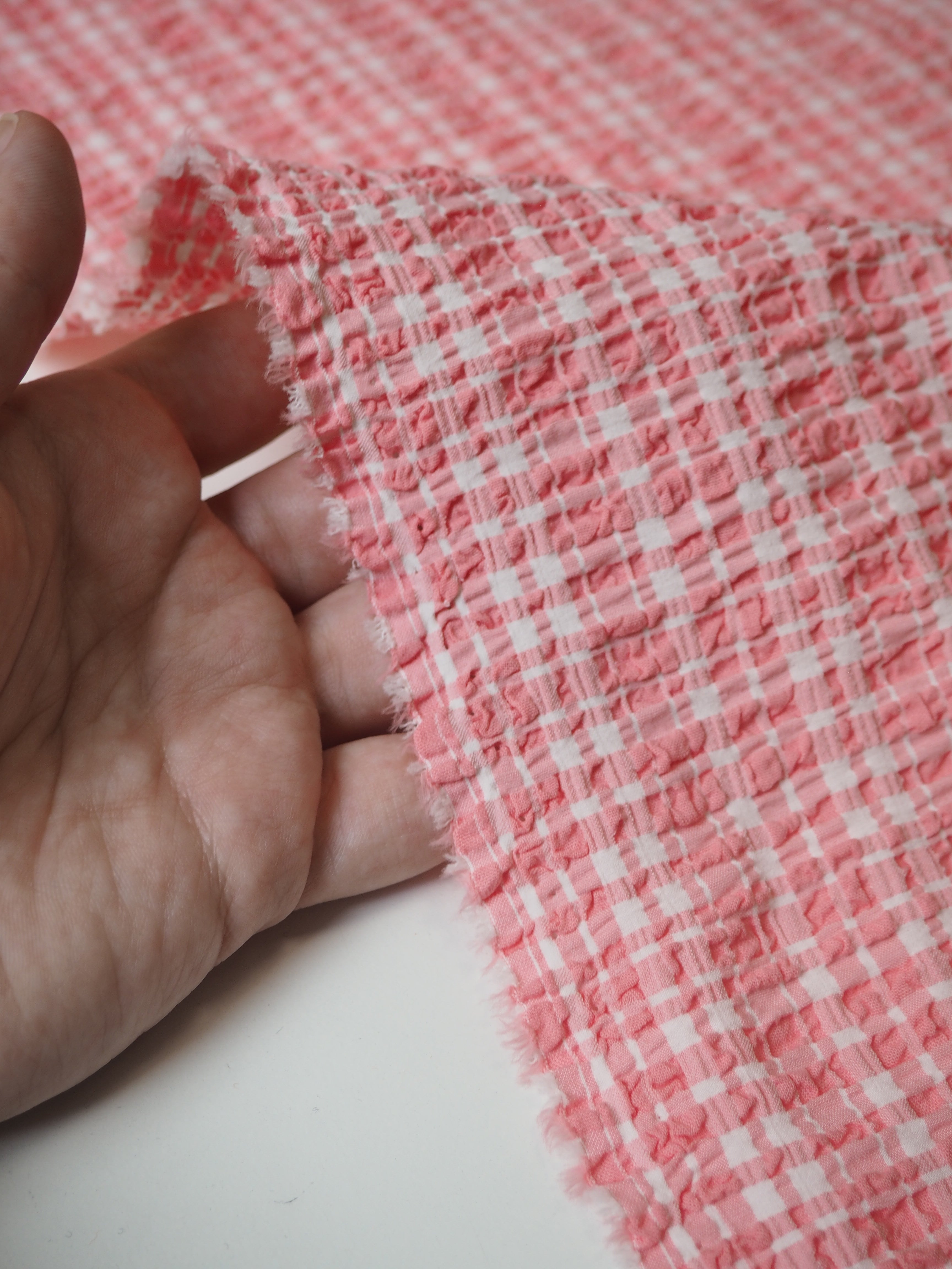 This ex-designer fabric is a seersucker. It's a medium scale pink and white check, with an extra-crinkly seersucker weave. Good stretch, about 10-15%, and comfortable, with an amazing cotton blend handle. Lightweight with a nice crispness and quirky texture! Opaque and perfect for summer dresses or tops!