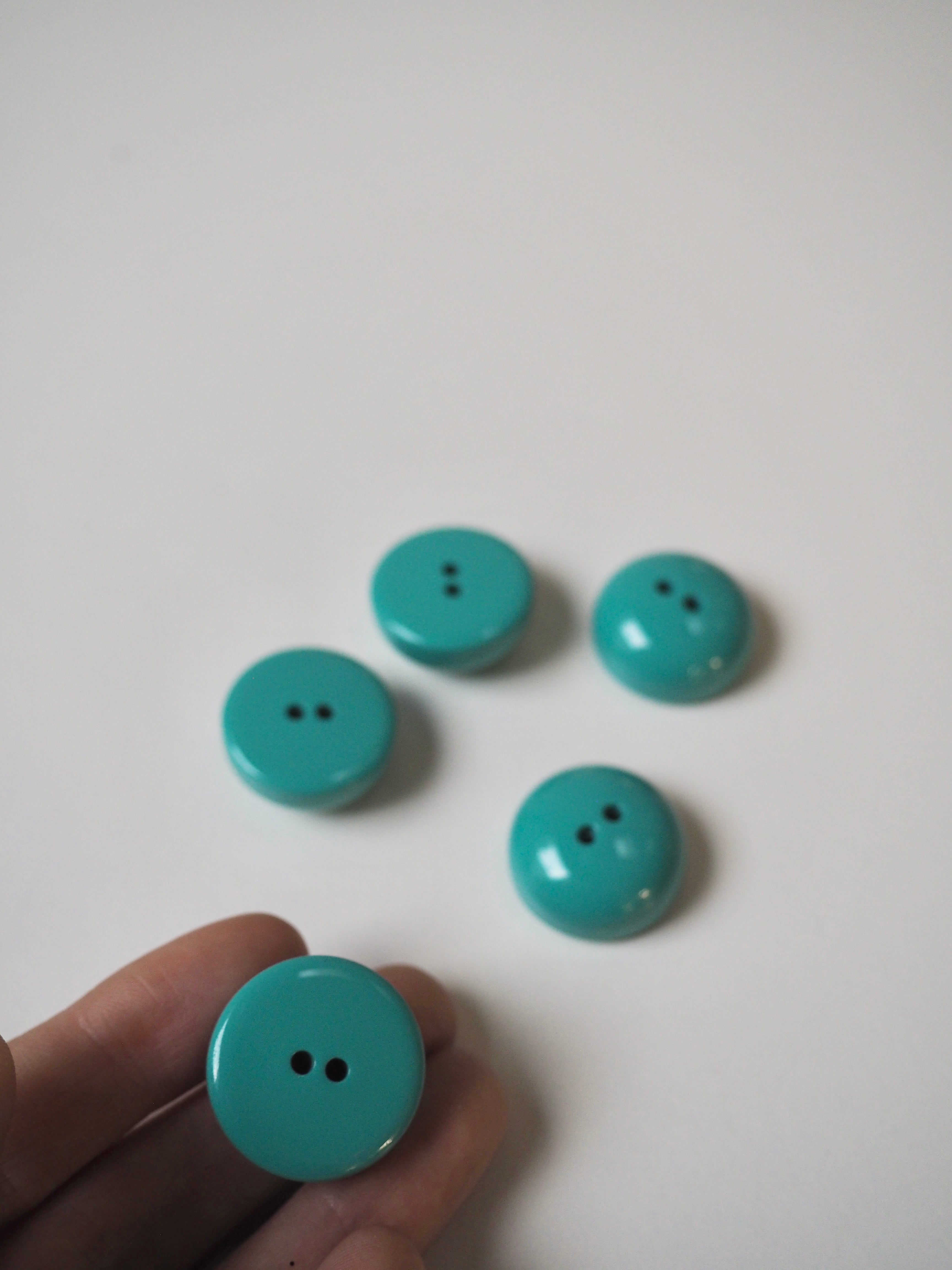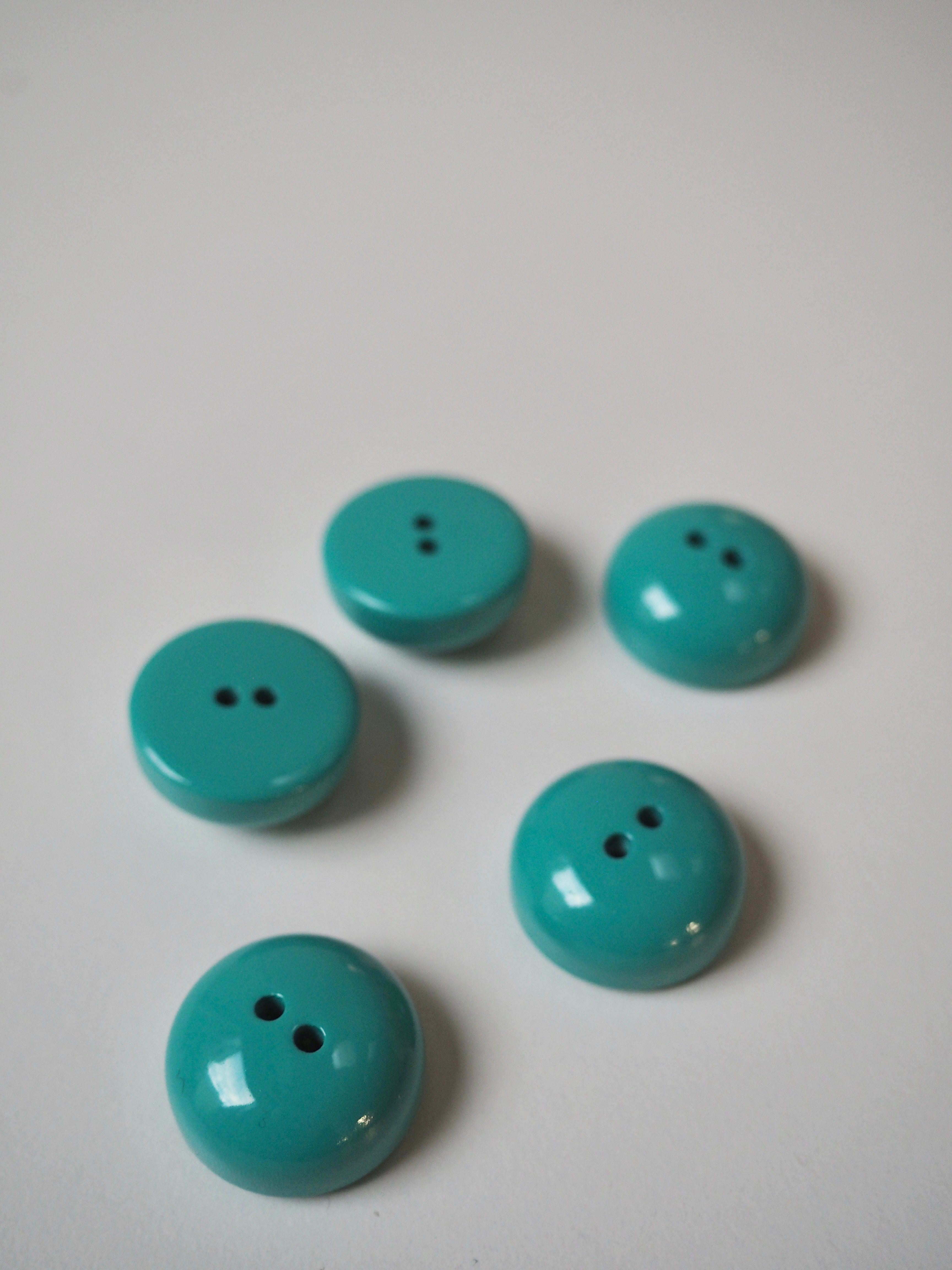 This ex-designer trim is a 2-hole domed plastic button. It has a shiny smooth finish and is a bright minty teal colour. Perfect size for coats, jackets and cardigans.