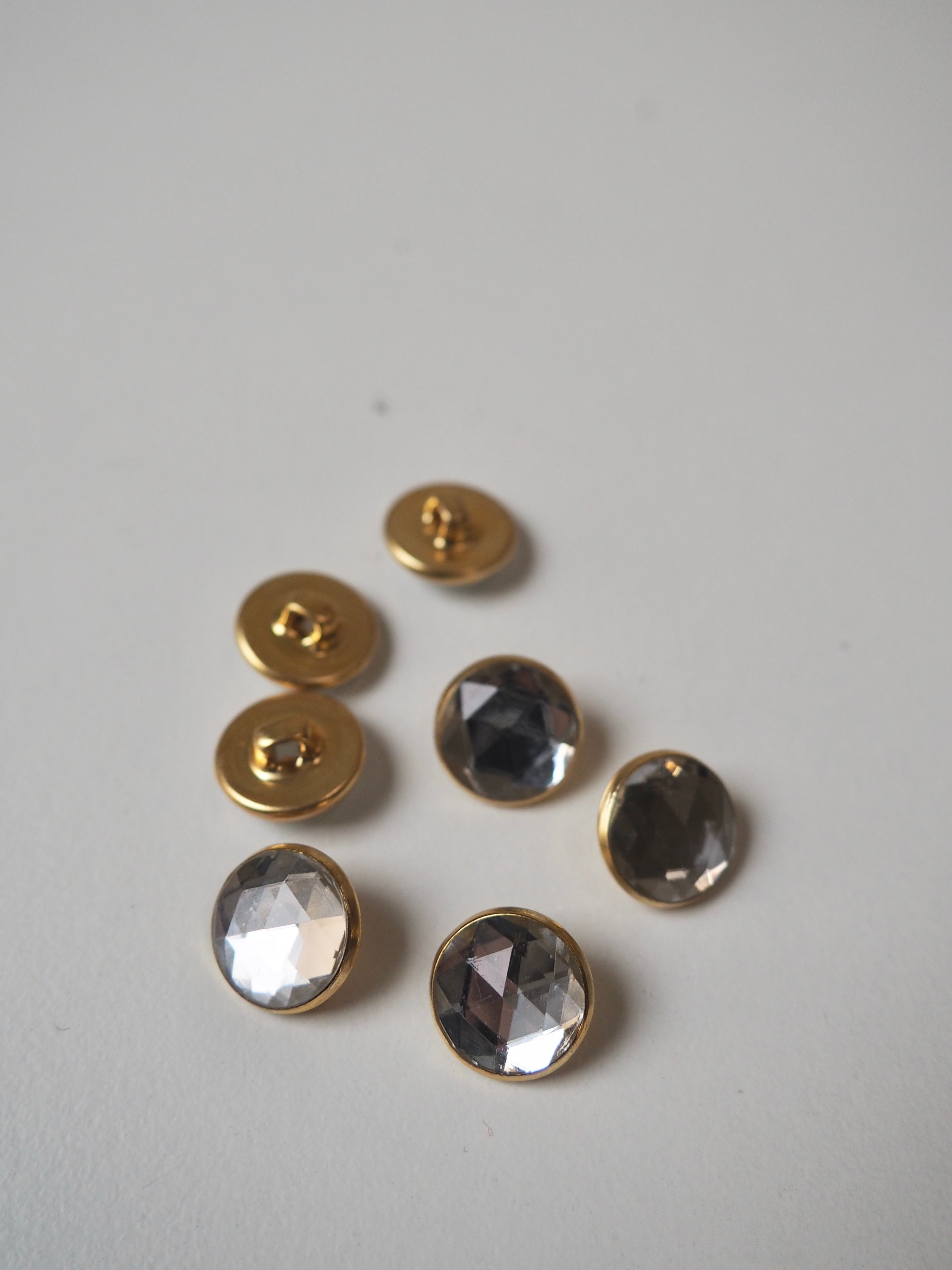 This ex-designer trim is a shank button. The front is a clear plastic crystal and rimmed with gold metal from the shank back. Perfect size for shirts and cardigans.