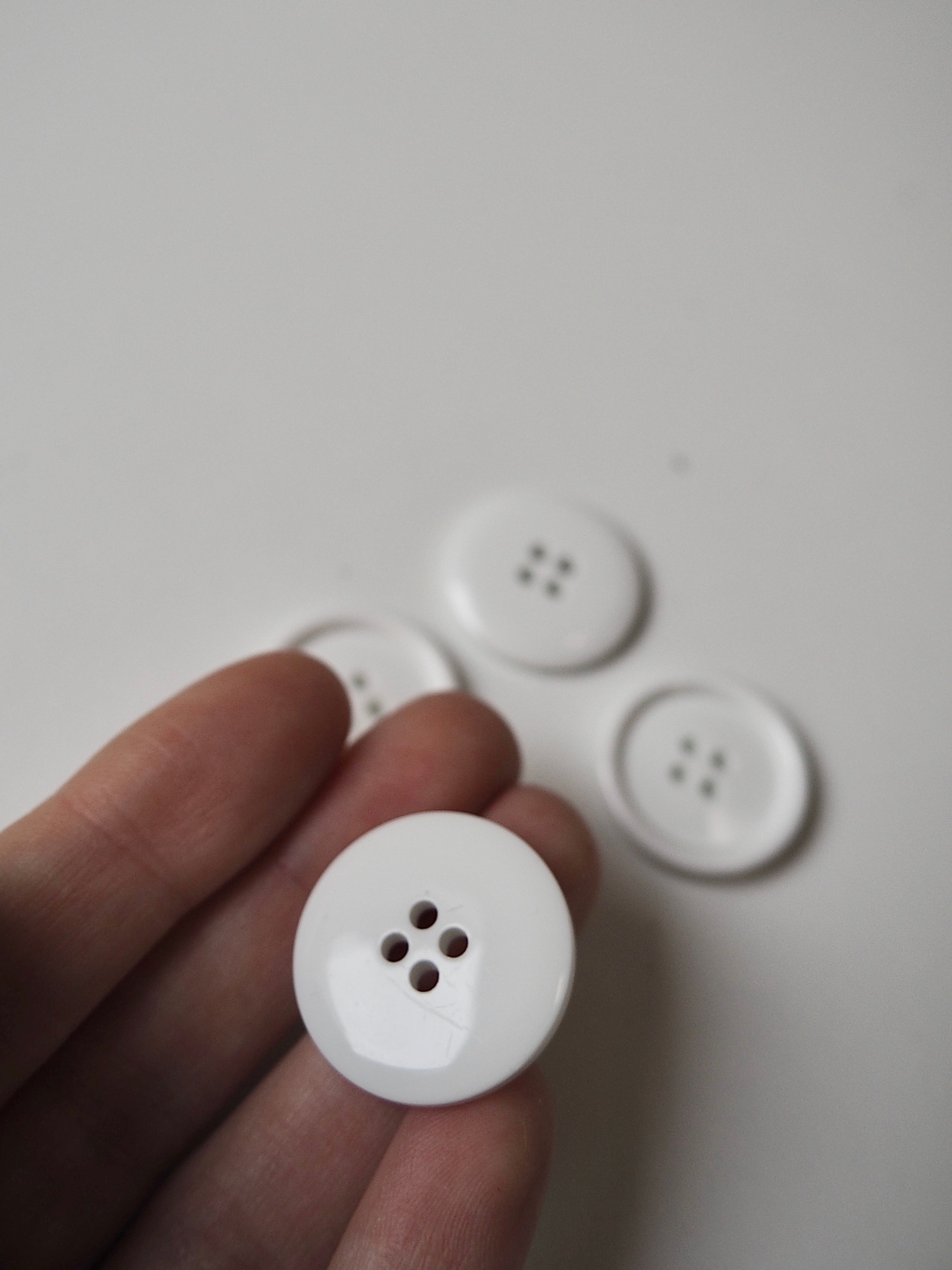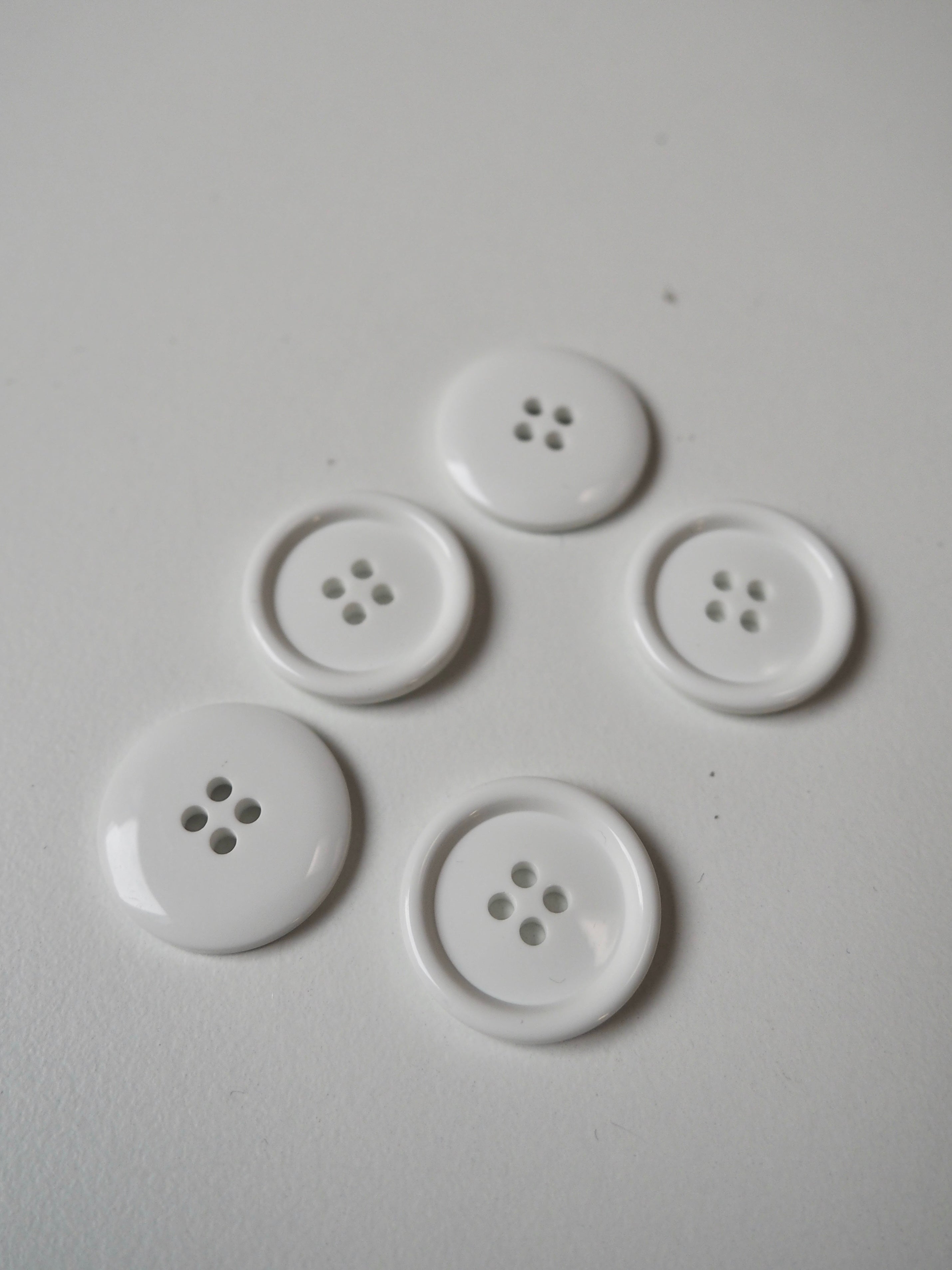This ex-designer trim is a plastic 4-hole button. They are rimmed and shiny in a true white colour. Perfect size for jackets and cardigans.