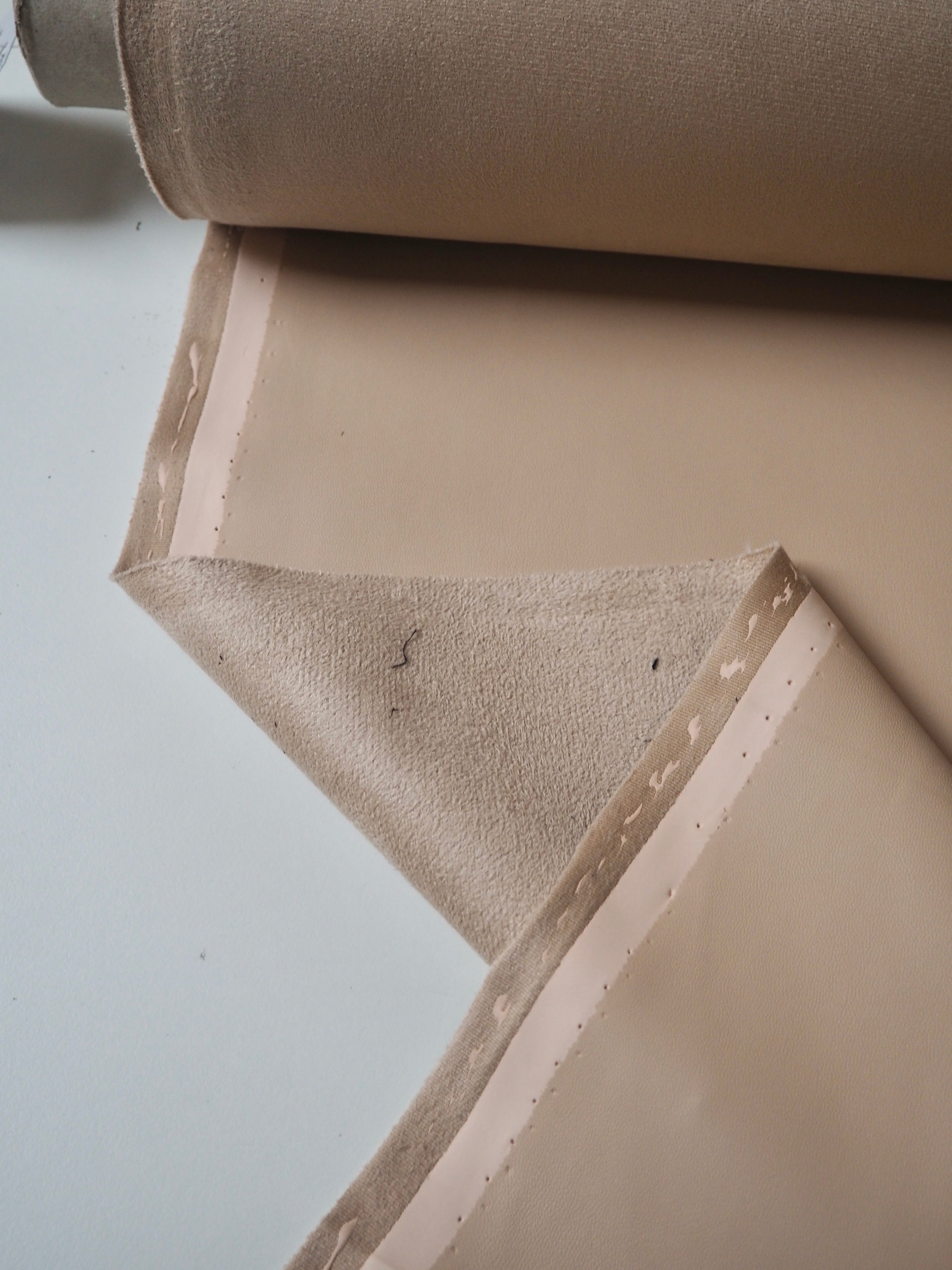This ex-designer fabric is a stretch pleather. It's light to medium weight with a smooth finish. It has a polyurethane coating on a soft sueded beige jersey backing. Has about 10-20% stretch width-ways. Has a good structure and would hold shape well. We would love this in a structured jacket or for a bag!