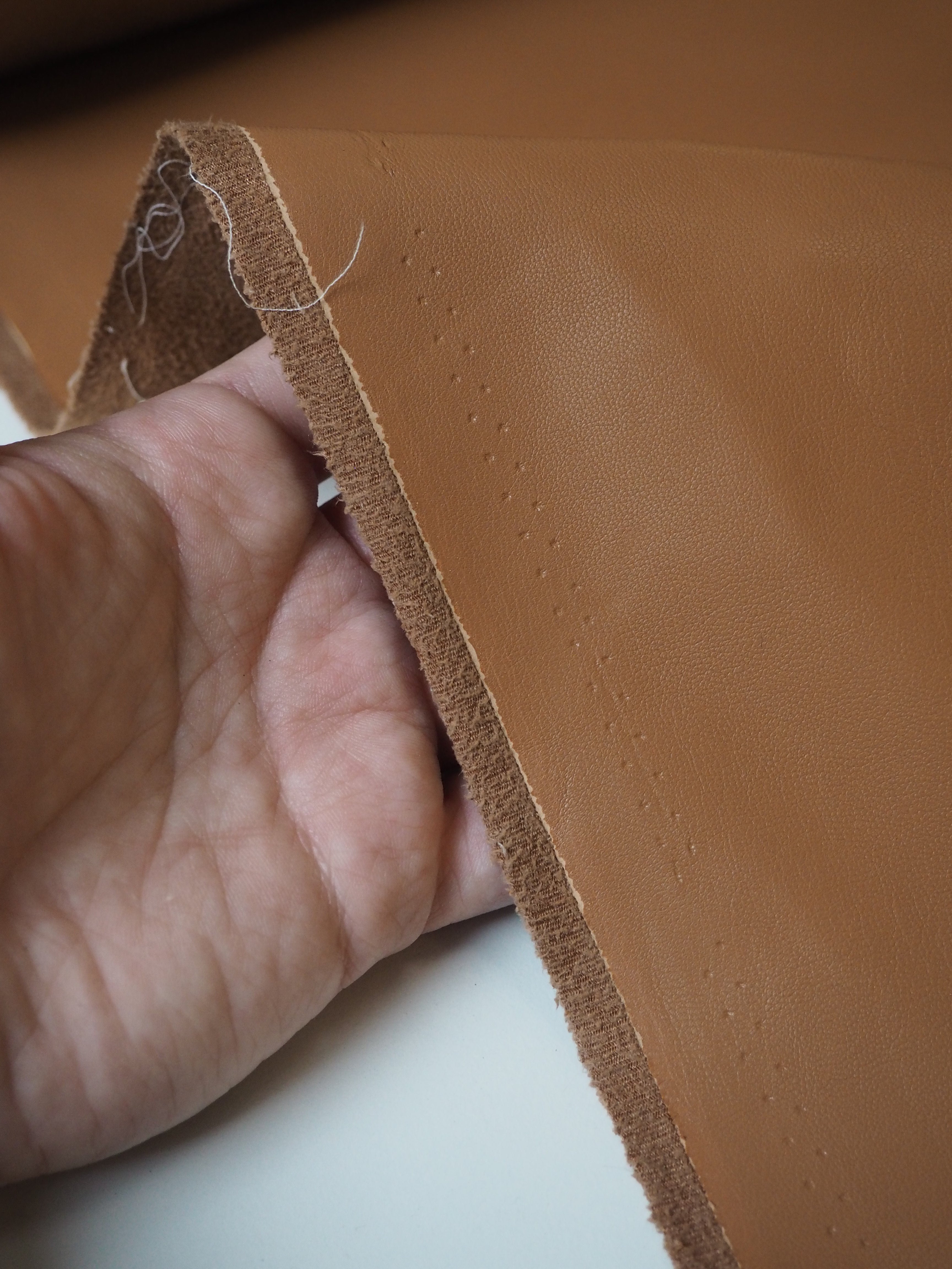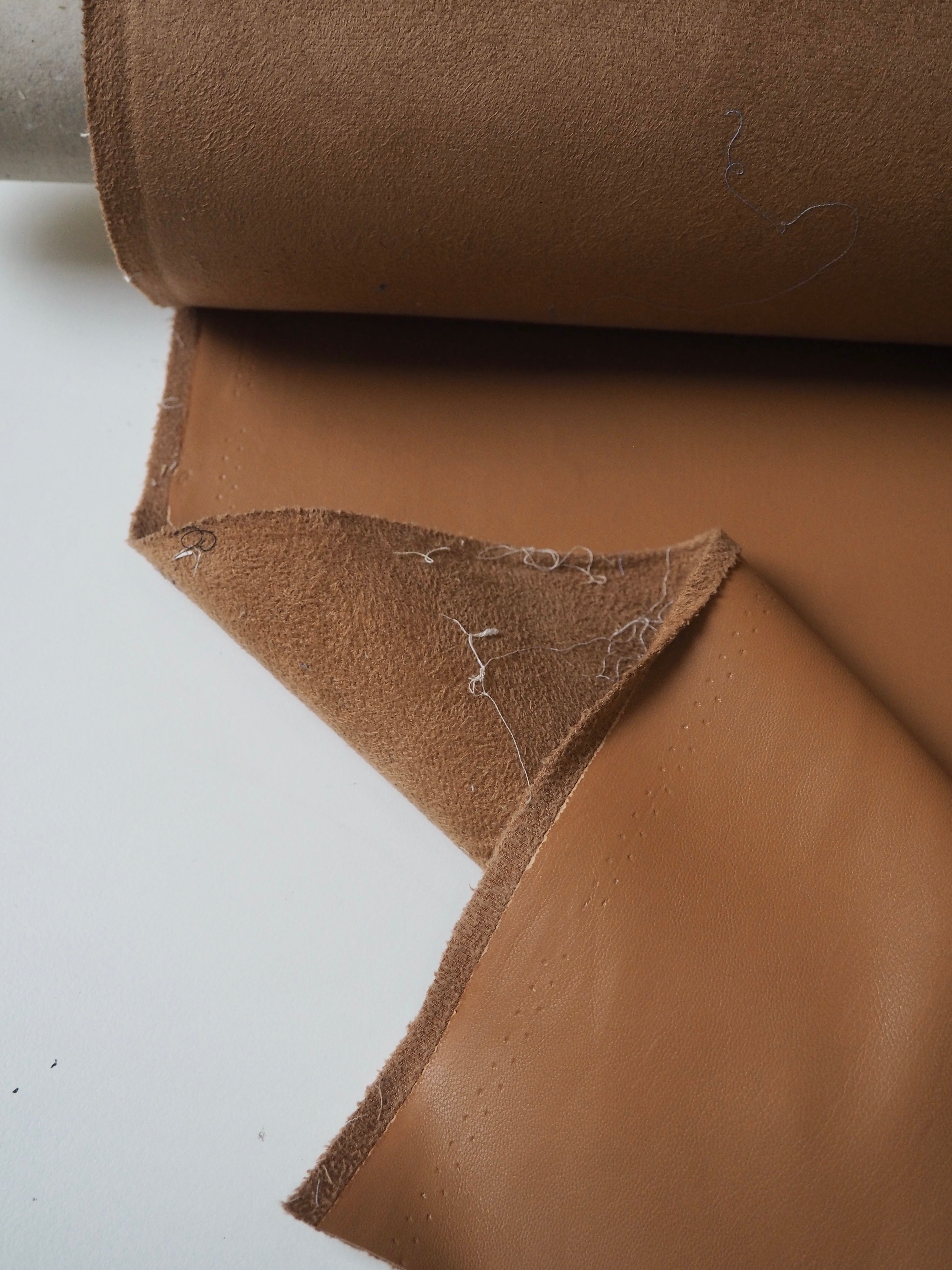 This ex-designer fabric is a stretch pleather. It's medium weight with a smooth finish. It has a polyurethane coating on a soft sueded ochre brown jersey backing. Has about 10-20% stretch width-ways. Has a good structure and would hold shape well. We would love this in a structured jacket or for a bag!