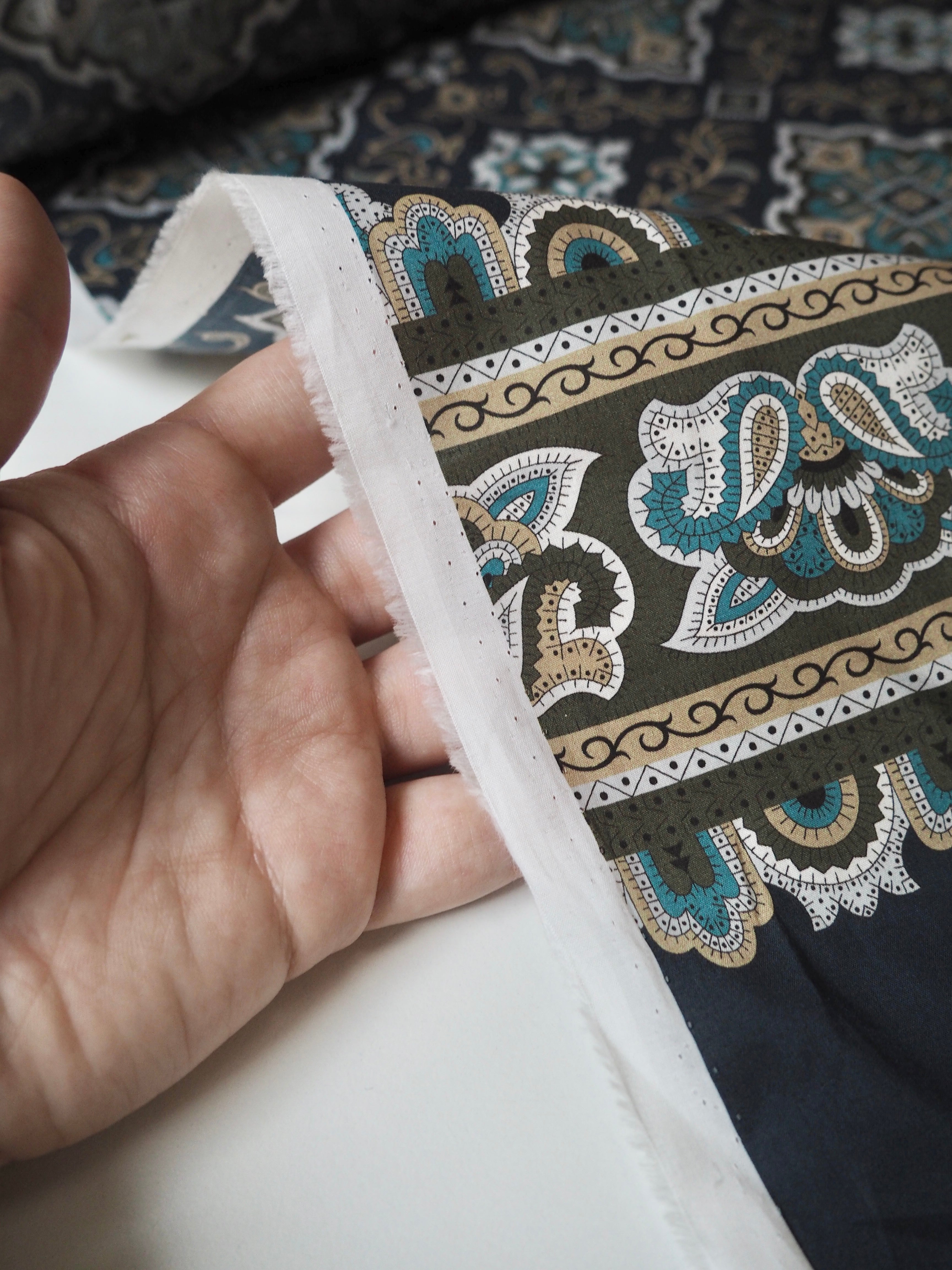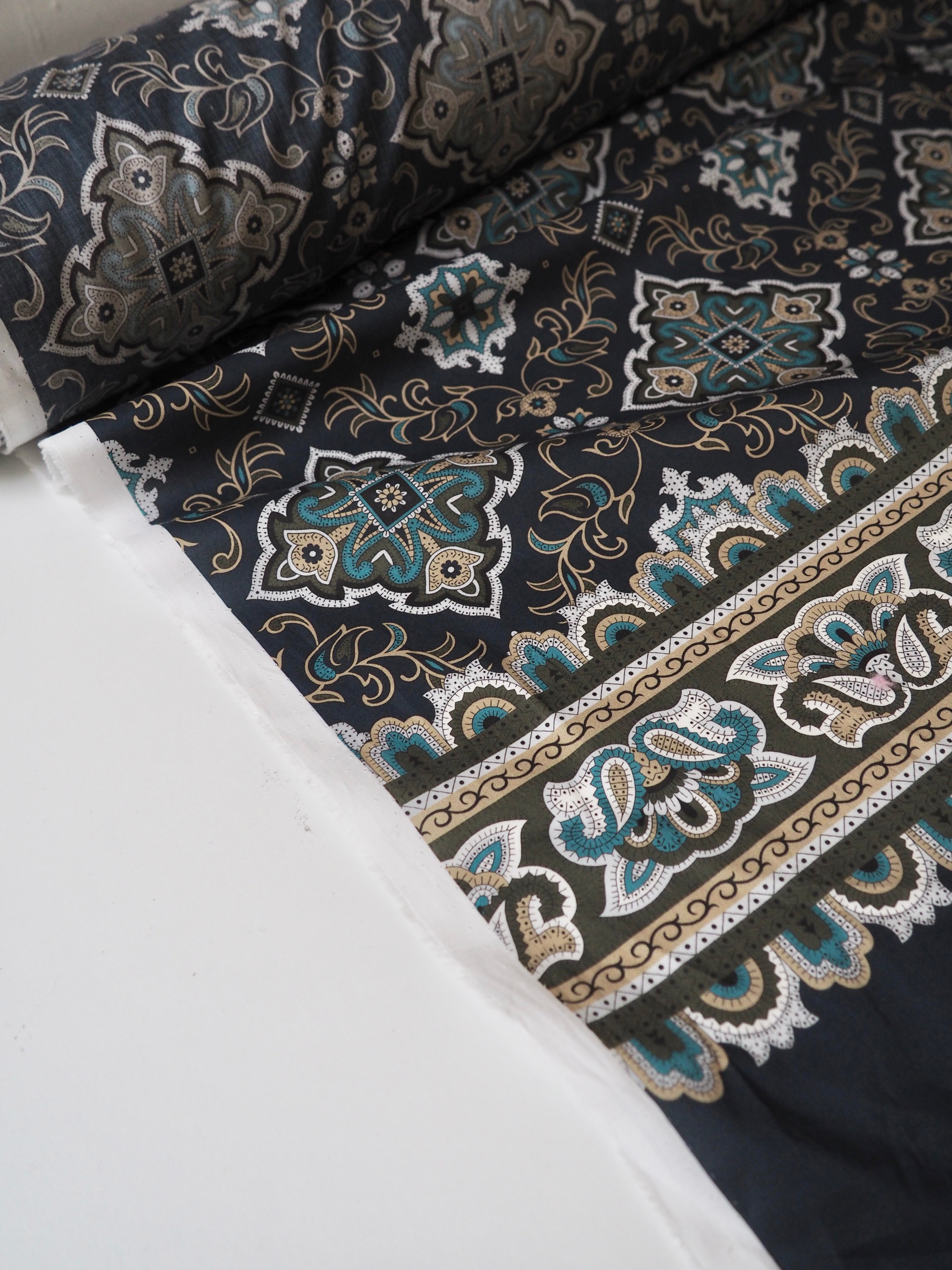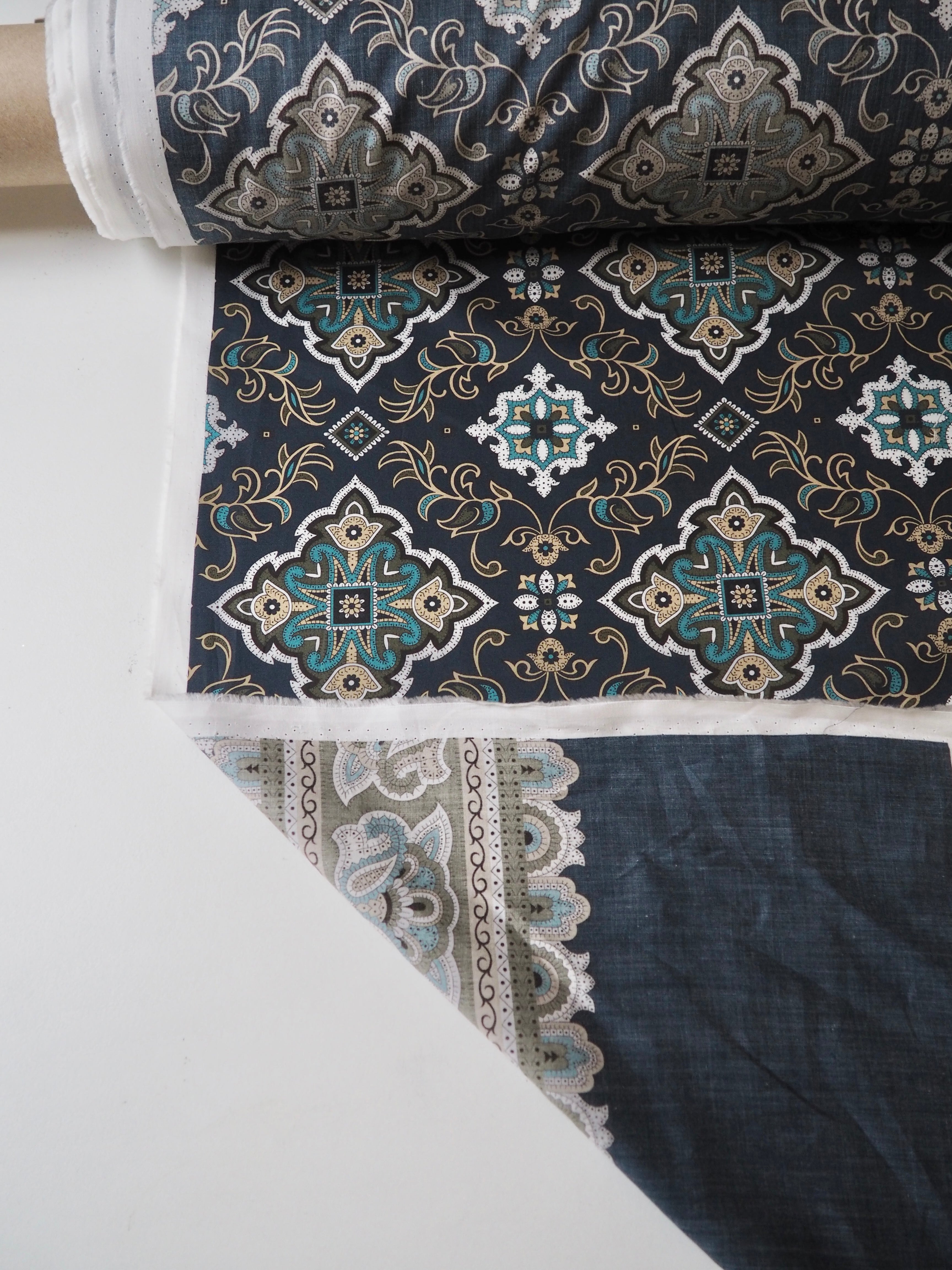 This ex-designer fabric is a classic Liberty Tana Lawn. It's unique printed into panels that are 1.8m repeating. It's in blues and olive green, with borders at each end. A top-quality Liberty cotton, and super lightweight! Soft with a lovely drape and slight crispness. Has a wonderful cotton handle. Mostly opaque but lets a little light in. We would love to see it in a blouse or even for quilting!