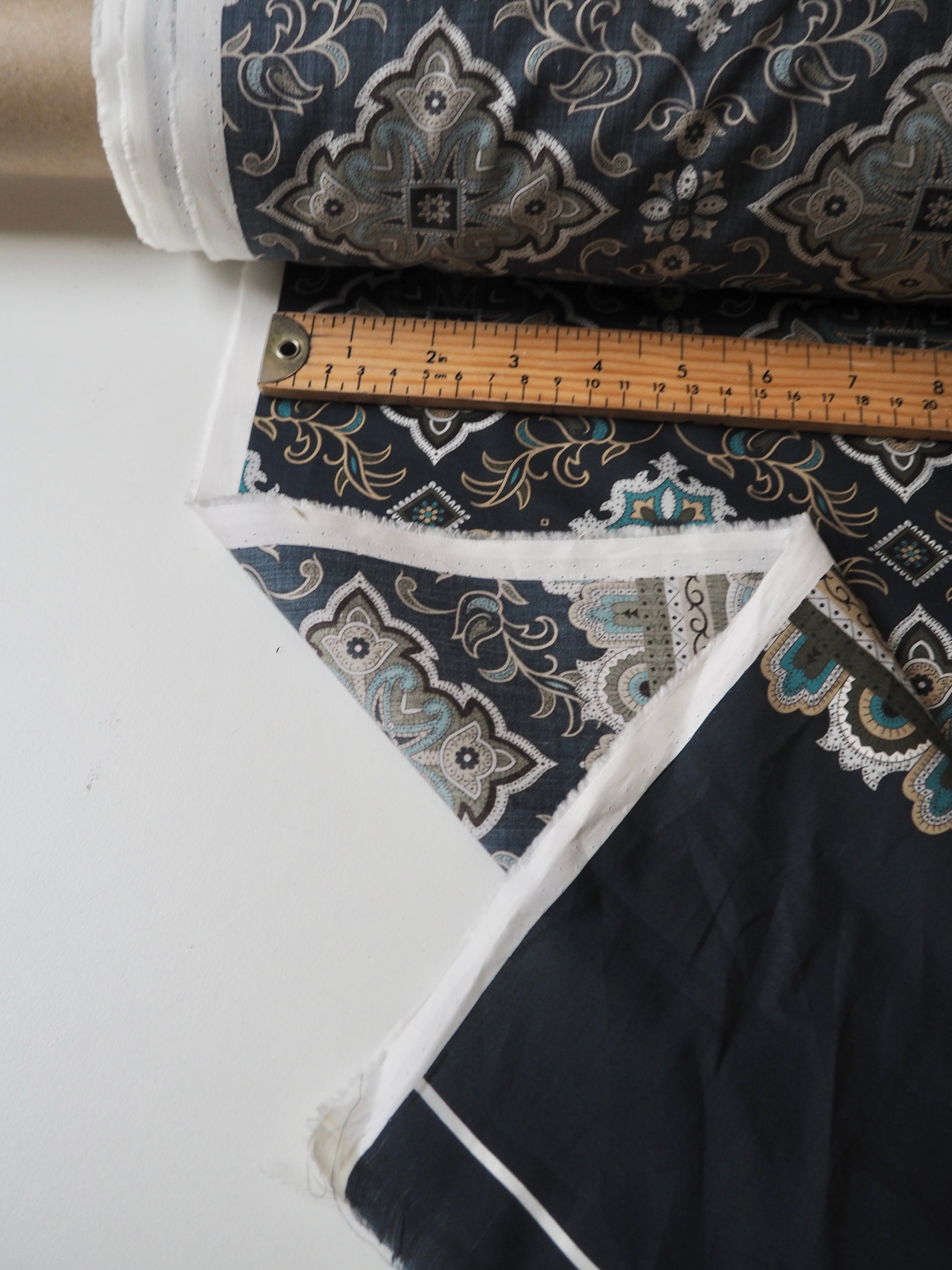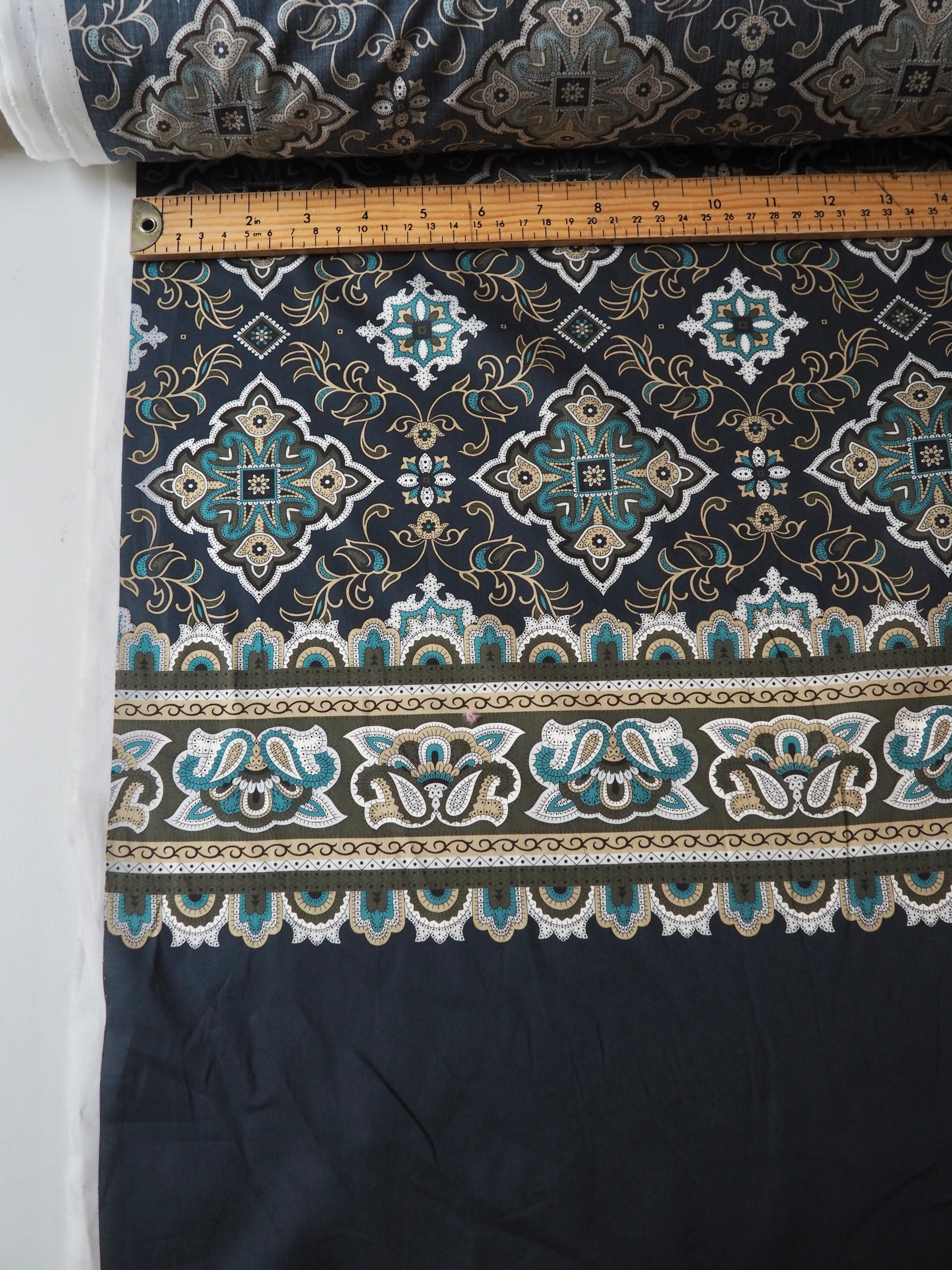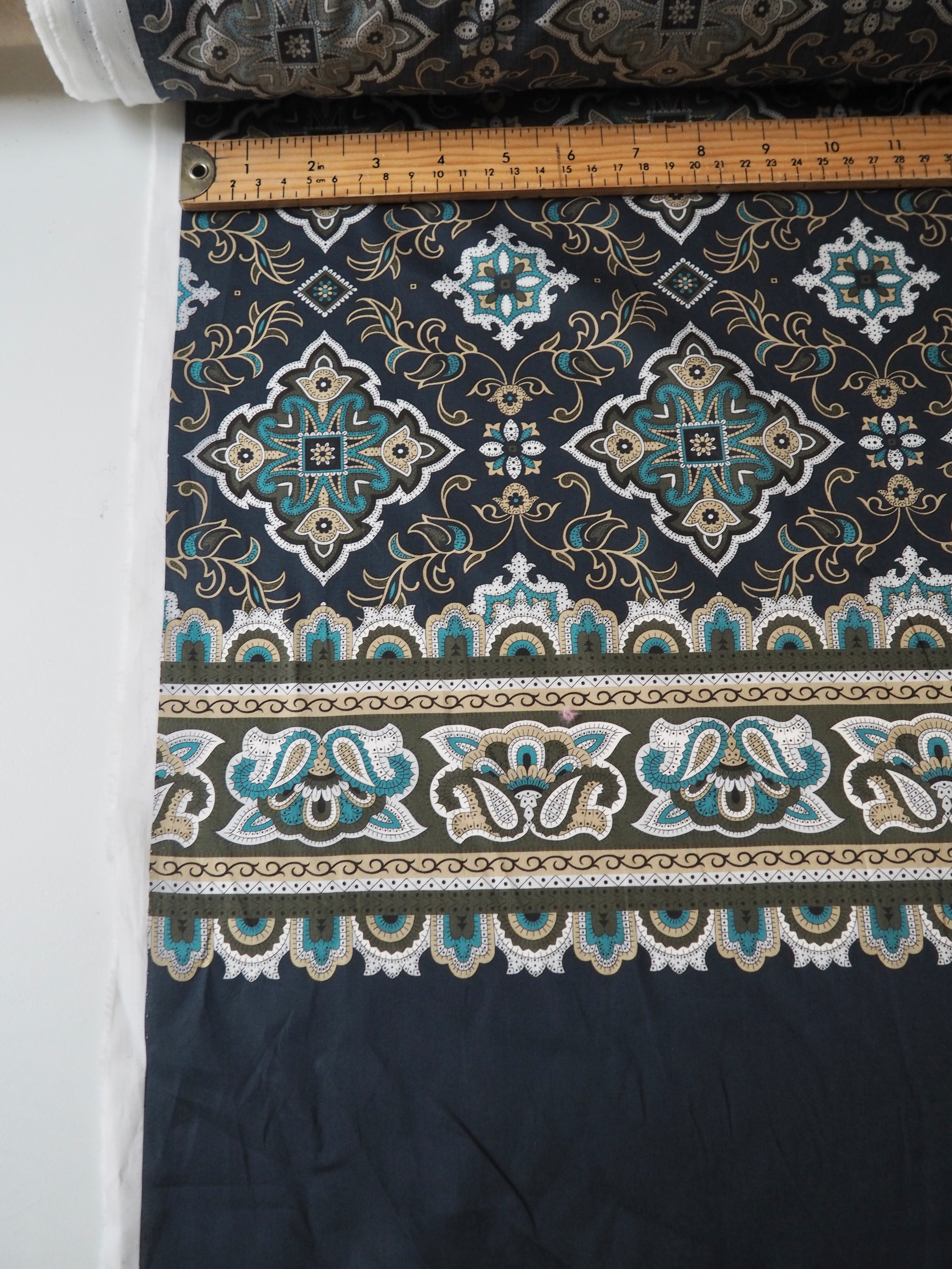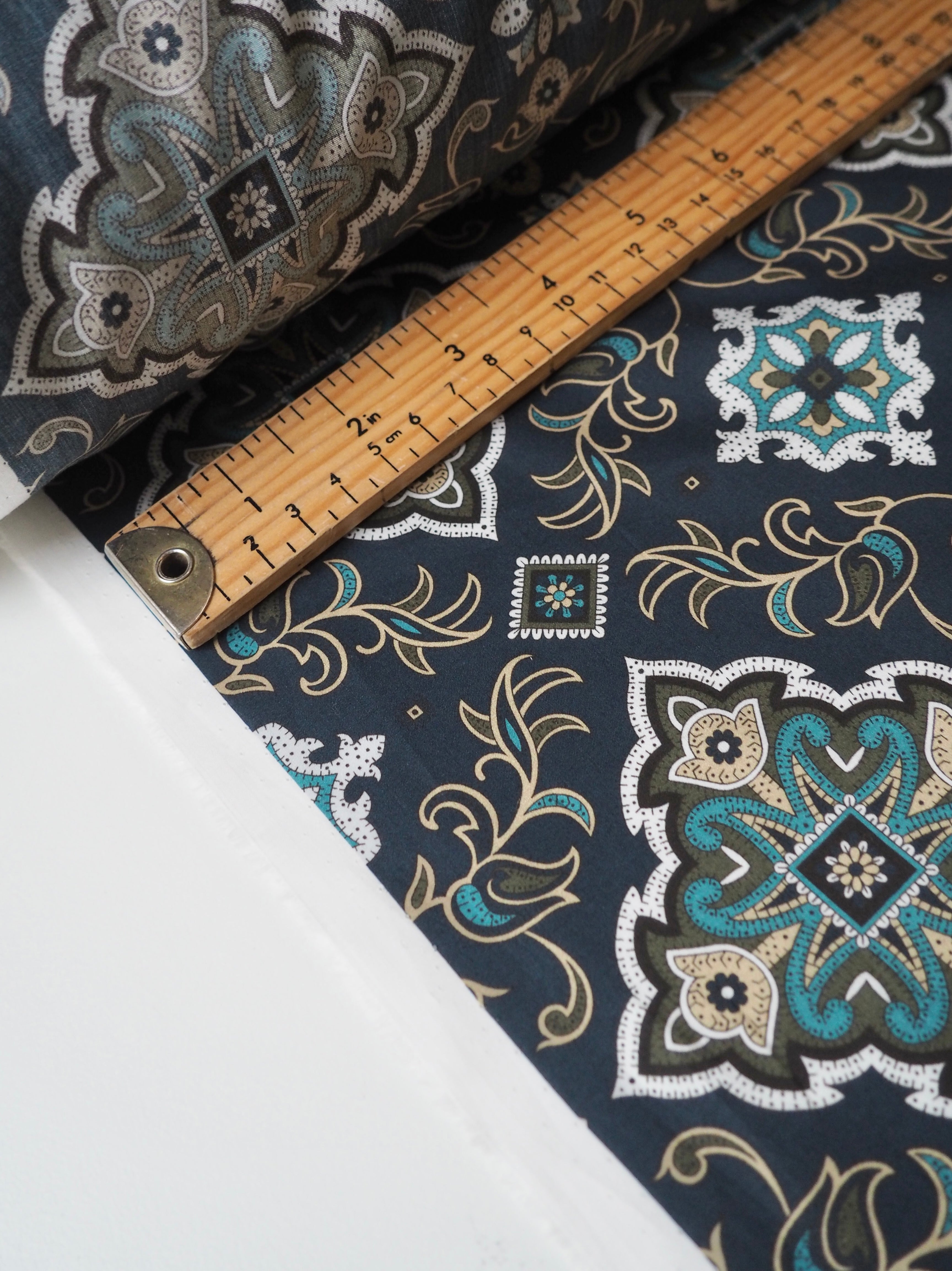 This ex-designer fabric is a classic Liberty Tana Lawn. It's unique printed into panels that are 1.8m repeating. It's in blues and olive green, with borders at each end. A top-quality Liberty cotton, and super lightweight! Soft with a lovely drape and slight crispness. Has a wonderful cotton handle. Mostly opaque but lets a little light in. We would love to see it in a blouse or even for quilting!