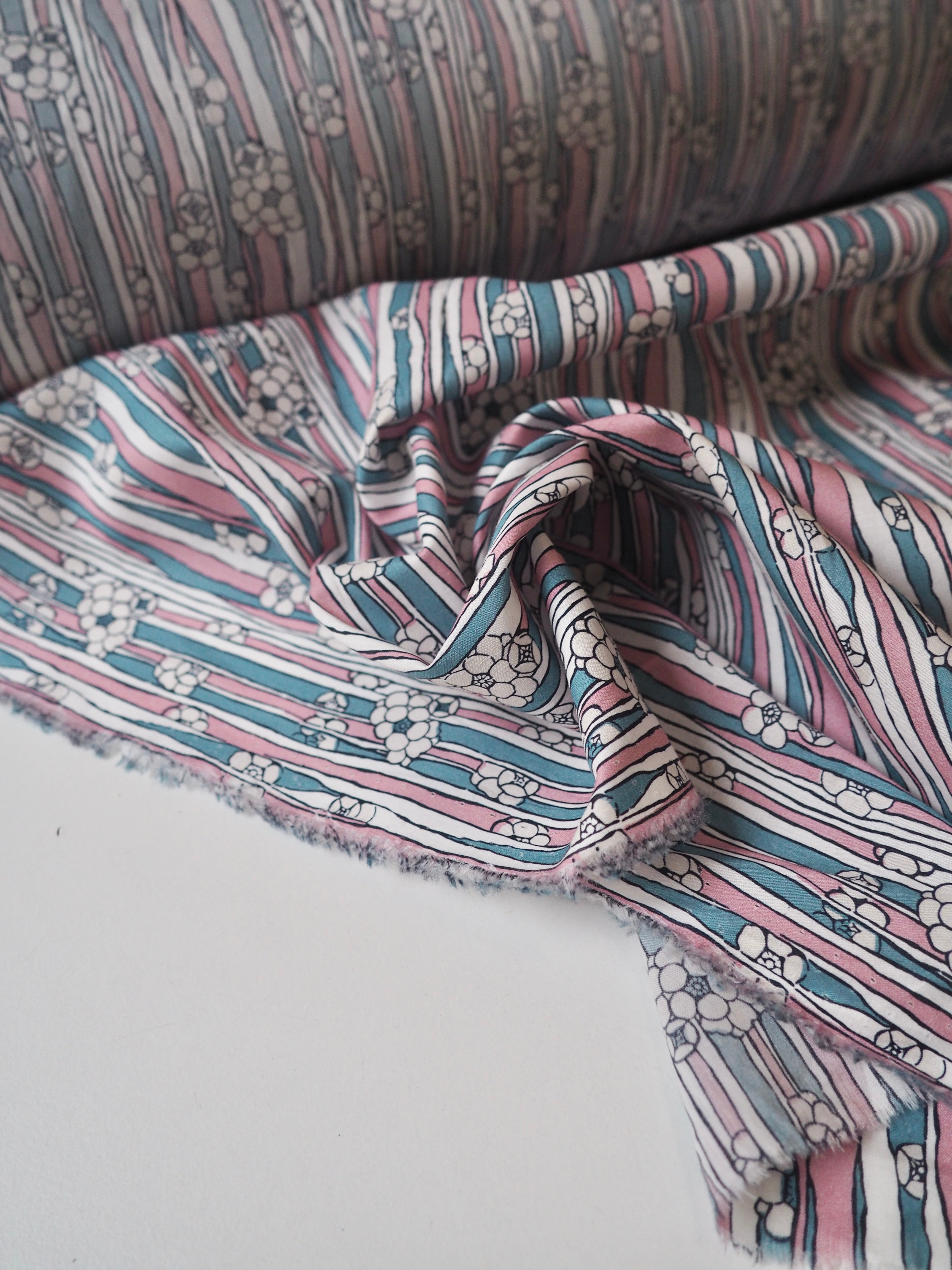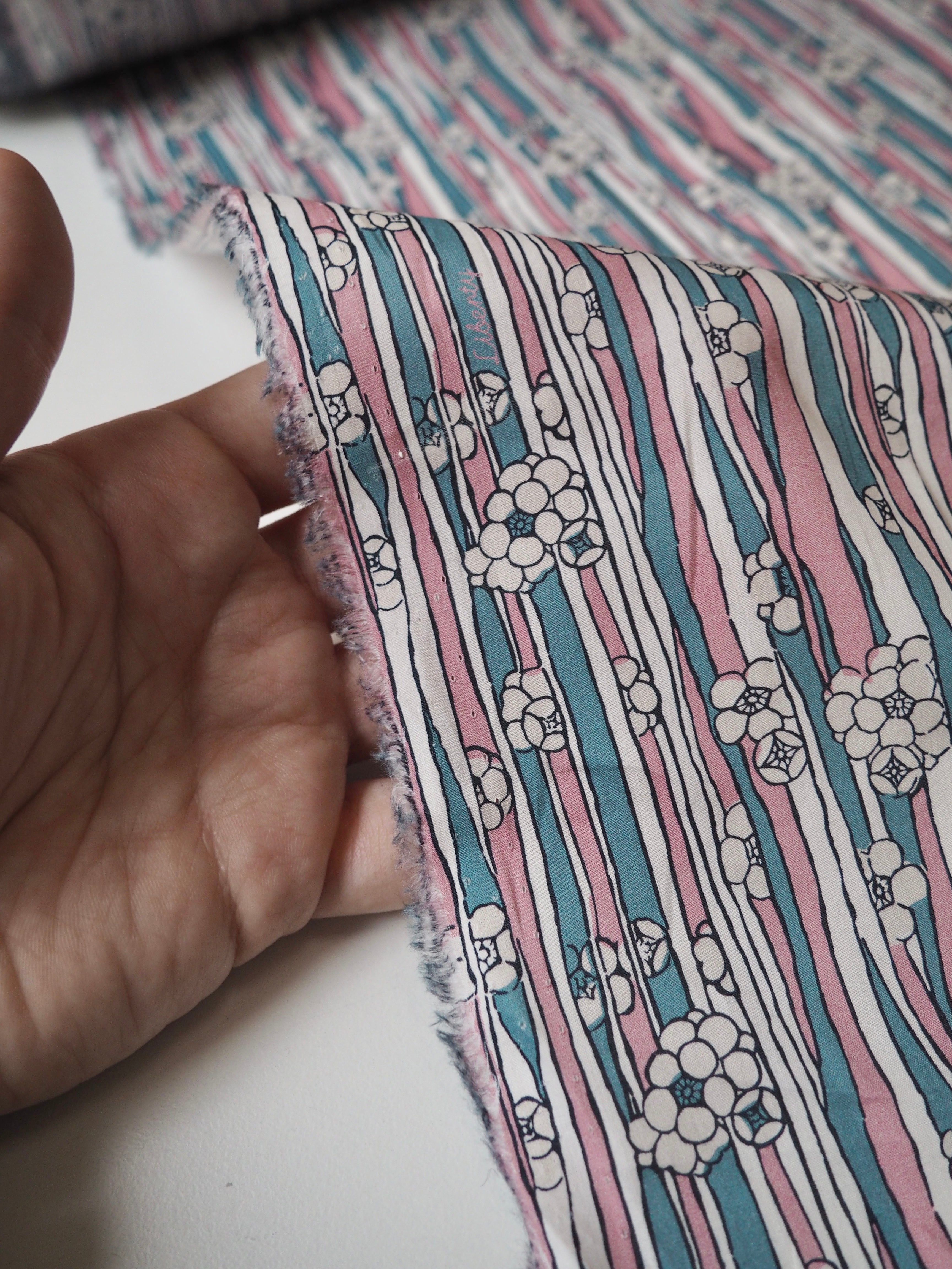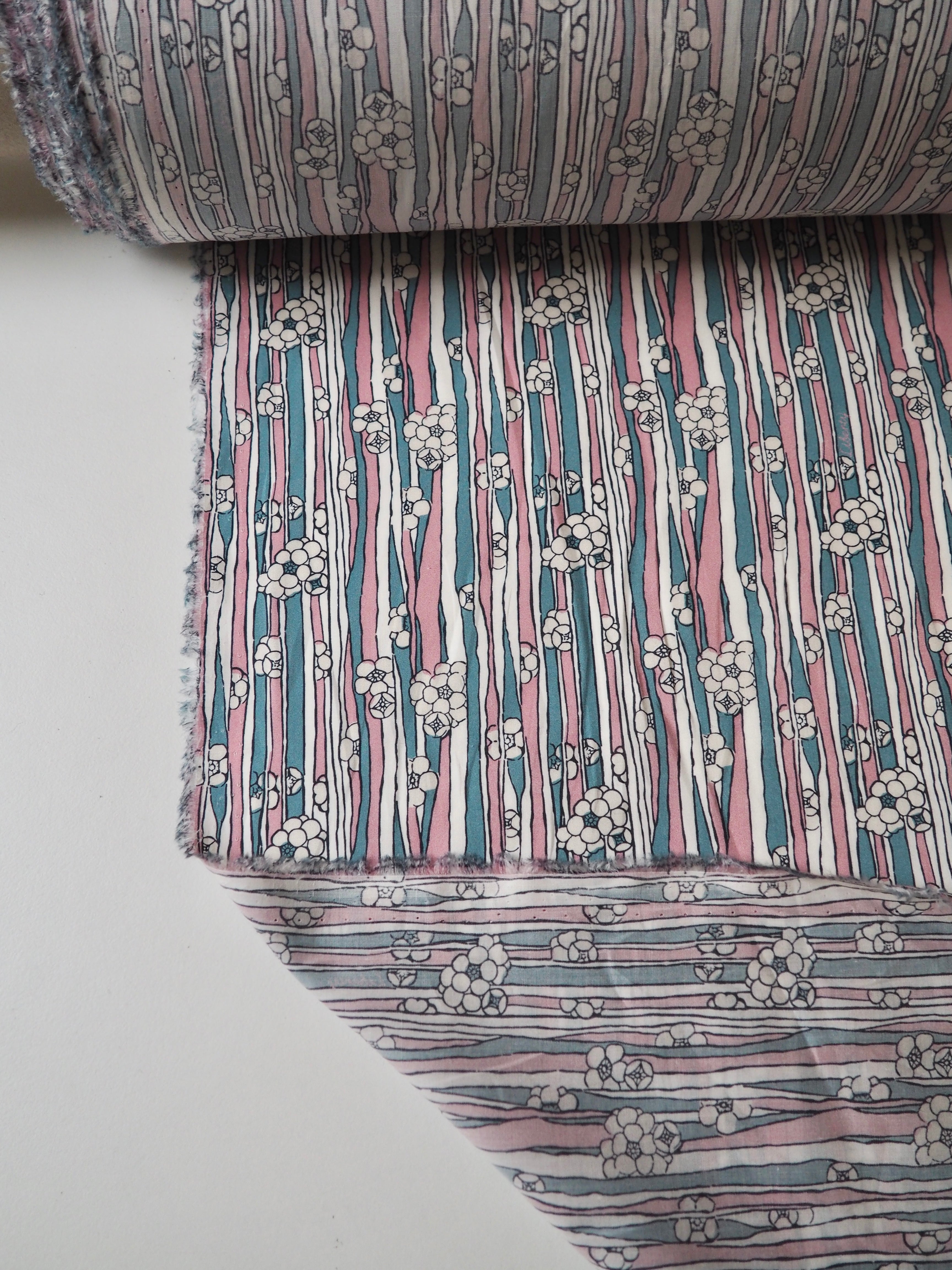 This ex-designer fabric is a classic Liberty Tana Lawn. It's in a stripe and floral print. A top-quality Liberty cotton, and super lightweight! Soft with a lovely drape and slight crispness. Has a wonderful cotton handle. Mostly opaque but lets a little light in. We would love to see it in a blouse or even for quilting!