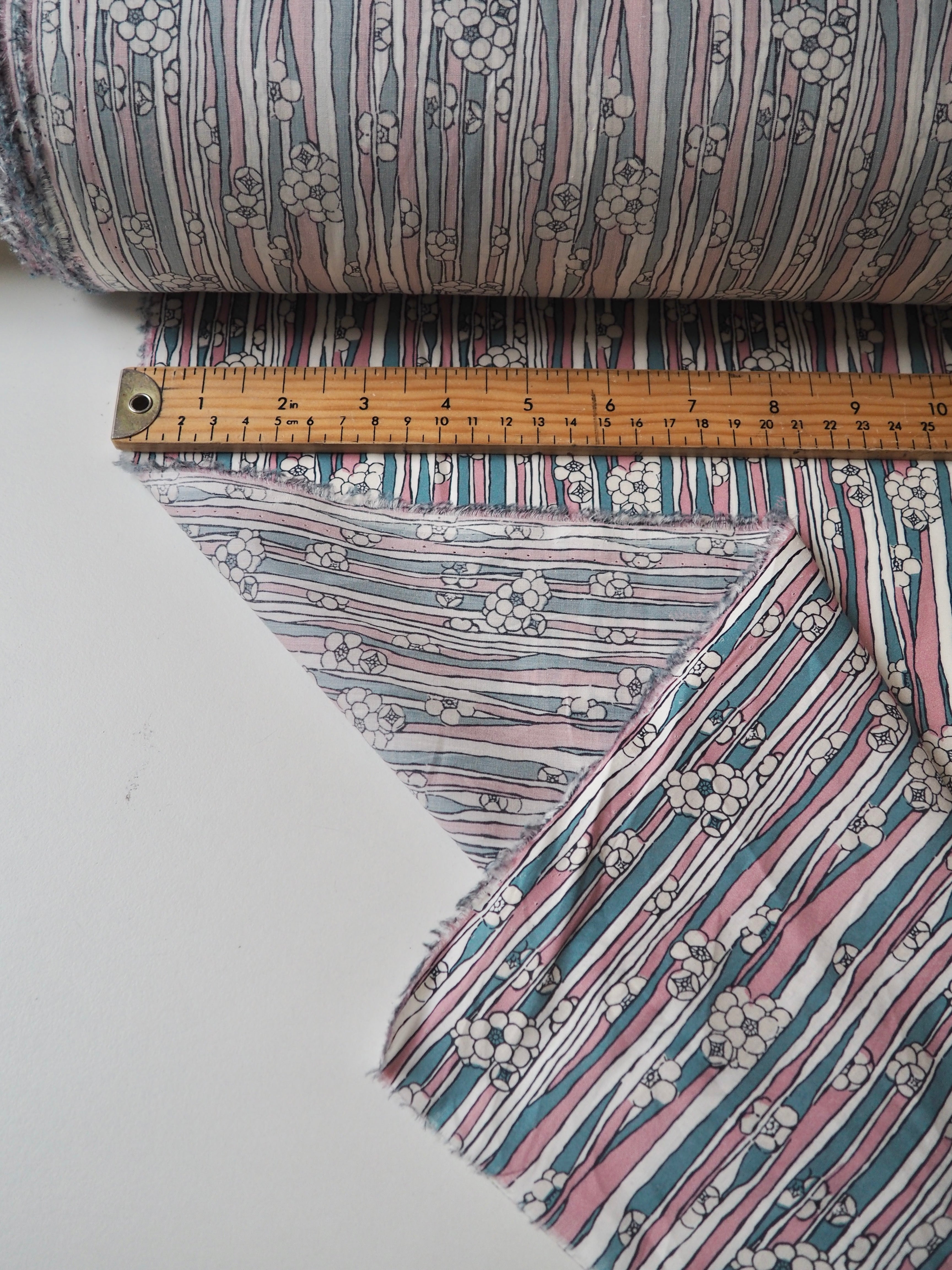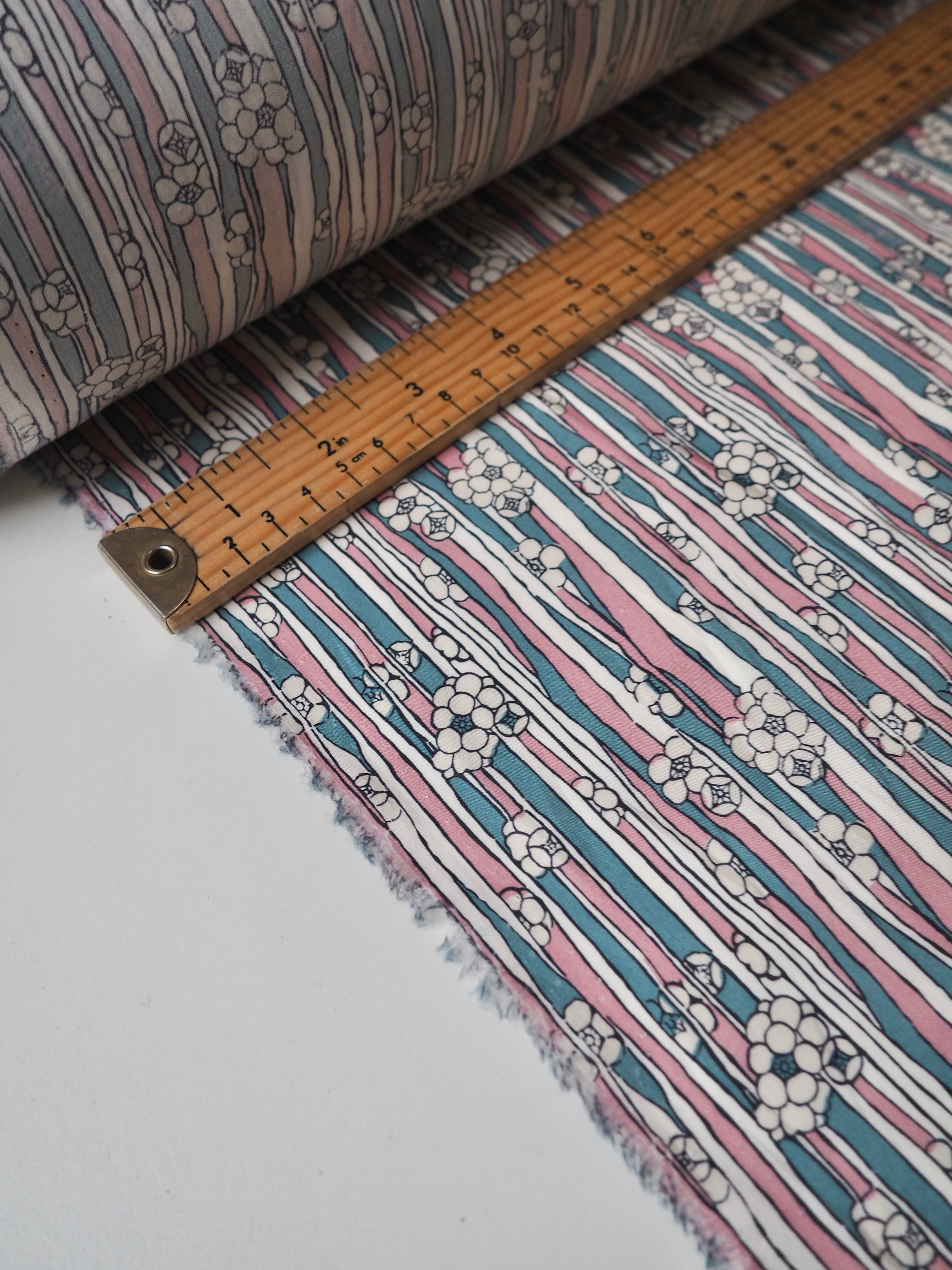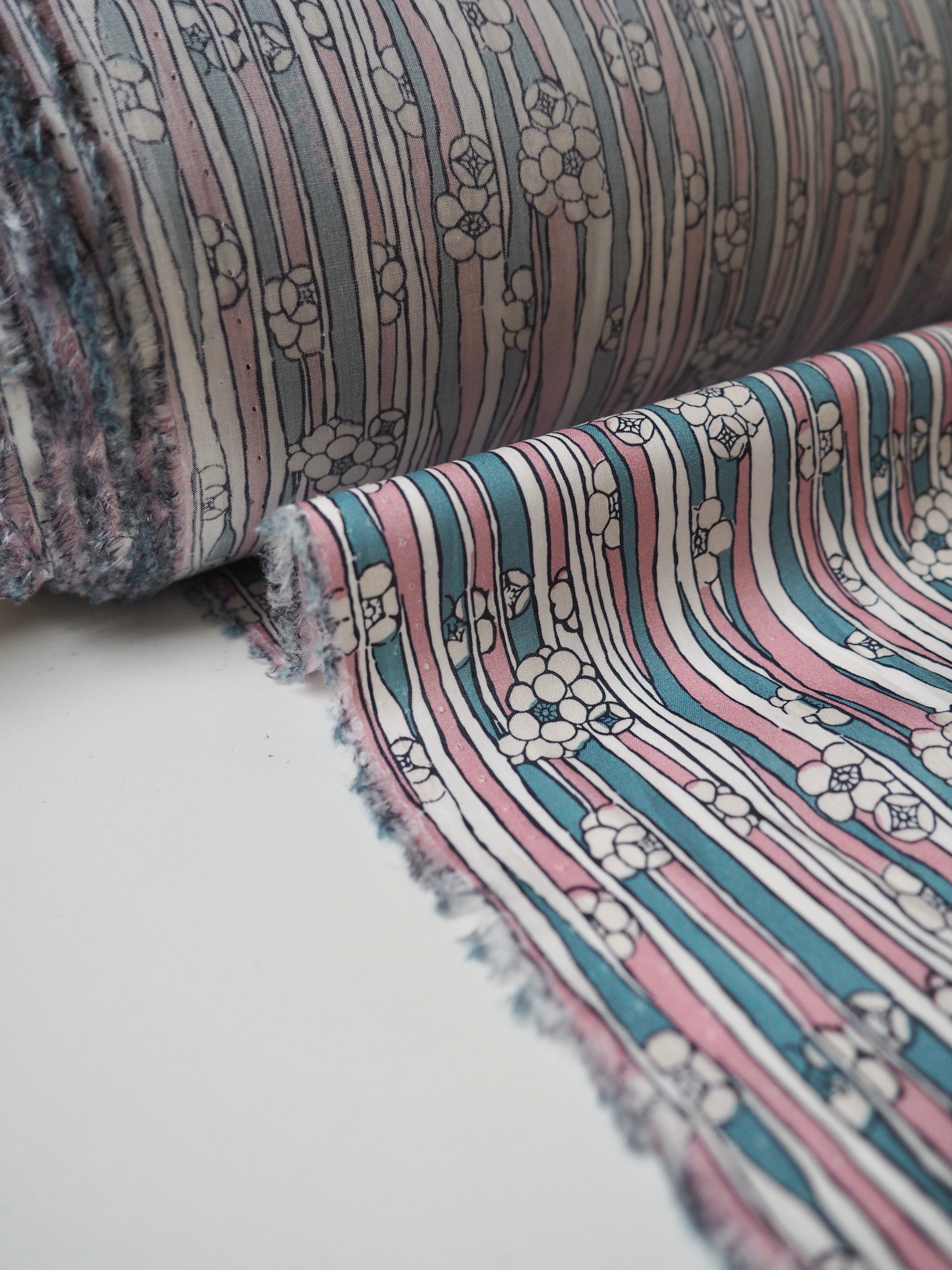 This ex-designer fabric is a classic Liberty Tana Lawn. It's in a stripe and floral print. A top-quality Liberty cotton, and super lightweight! Soft with a lovely drape and slight crispness. Has a wonderful cotton handle. Mostly opaque but lets a little light in. We would love to see it in a blouse or even for quilting!