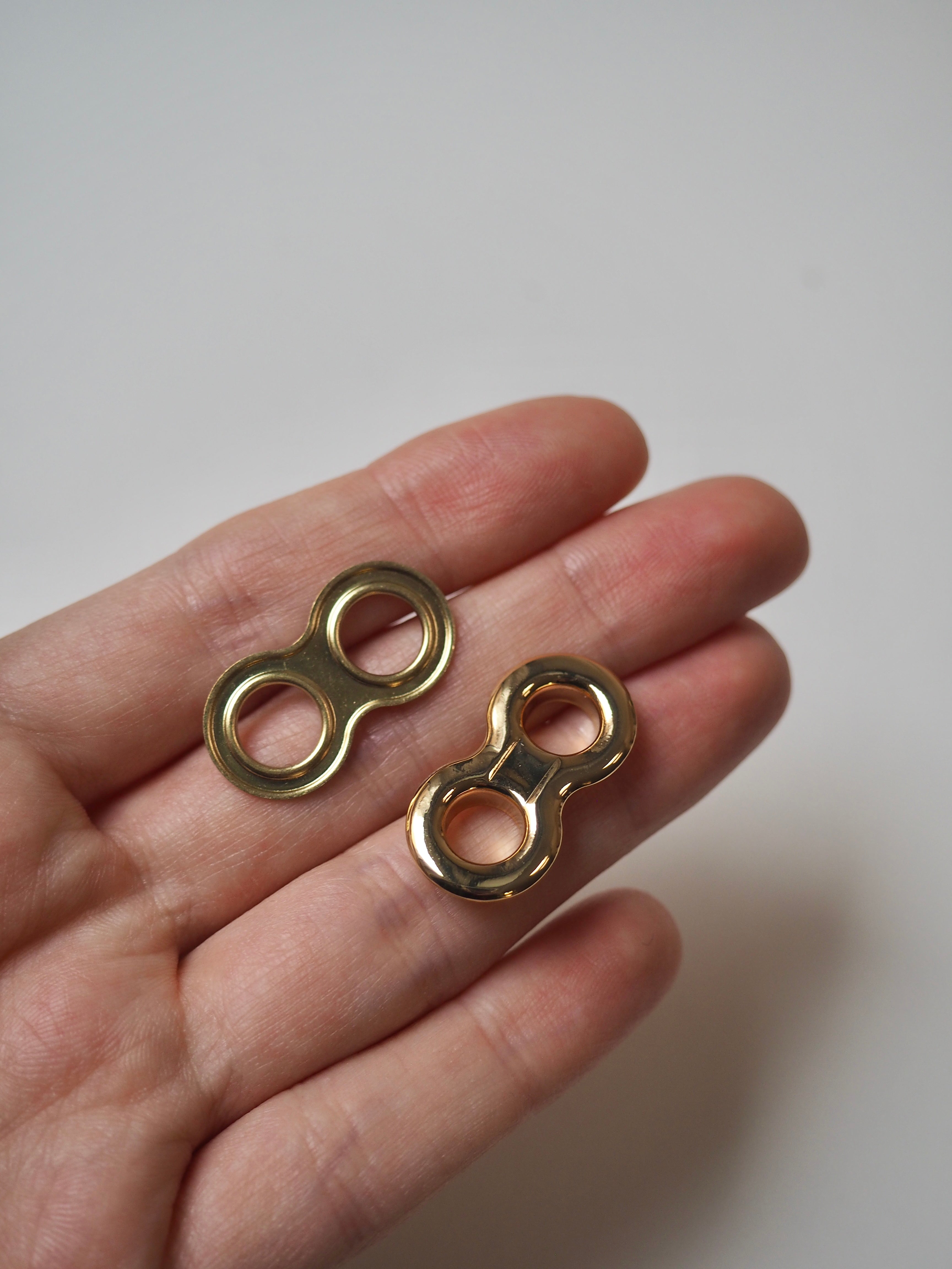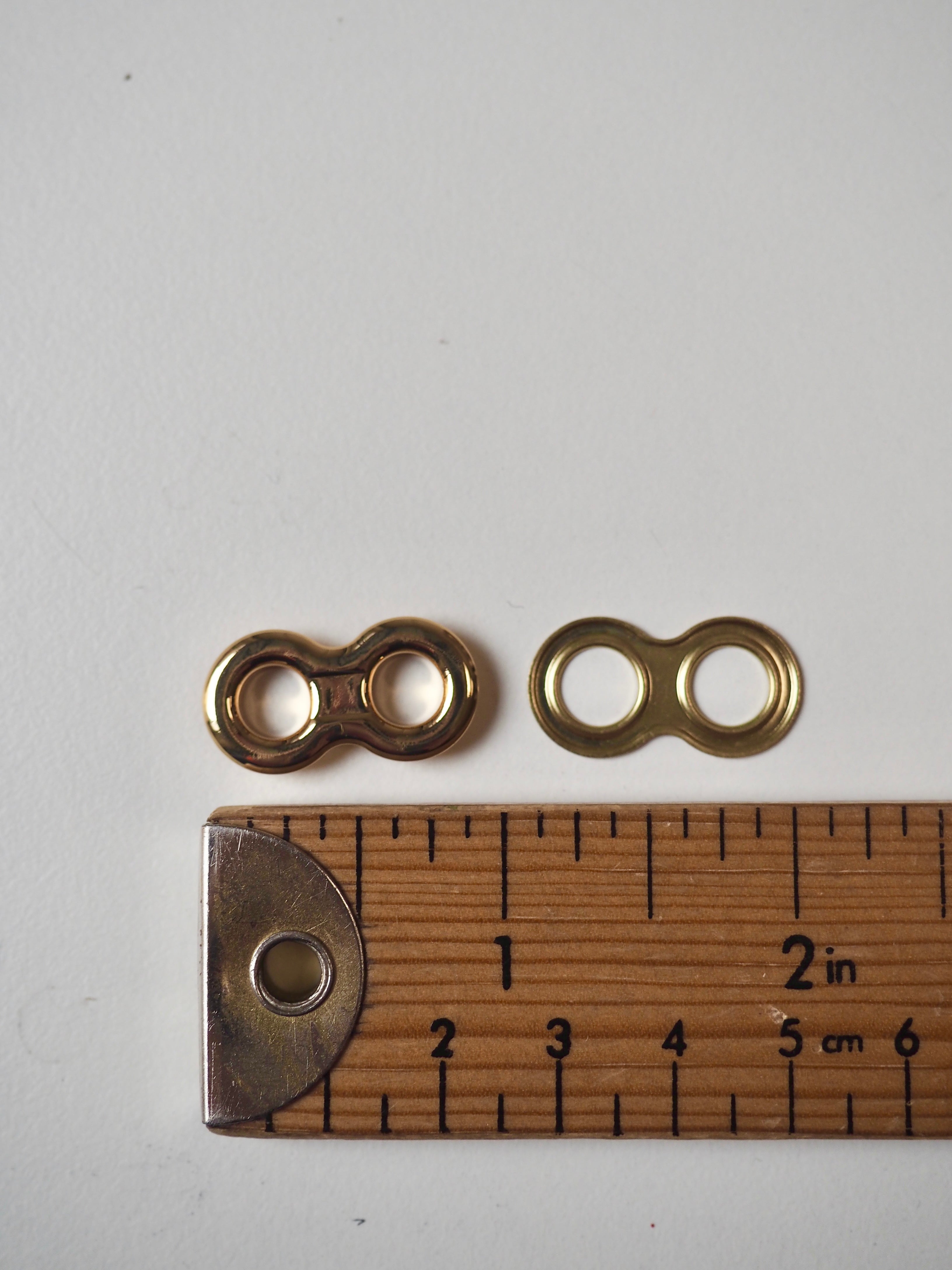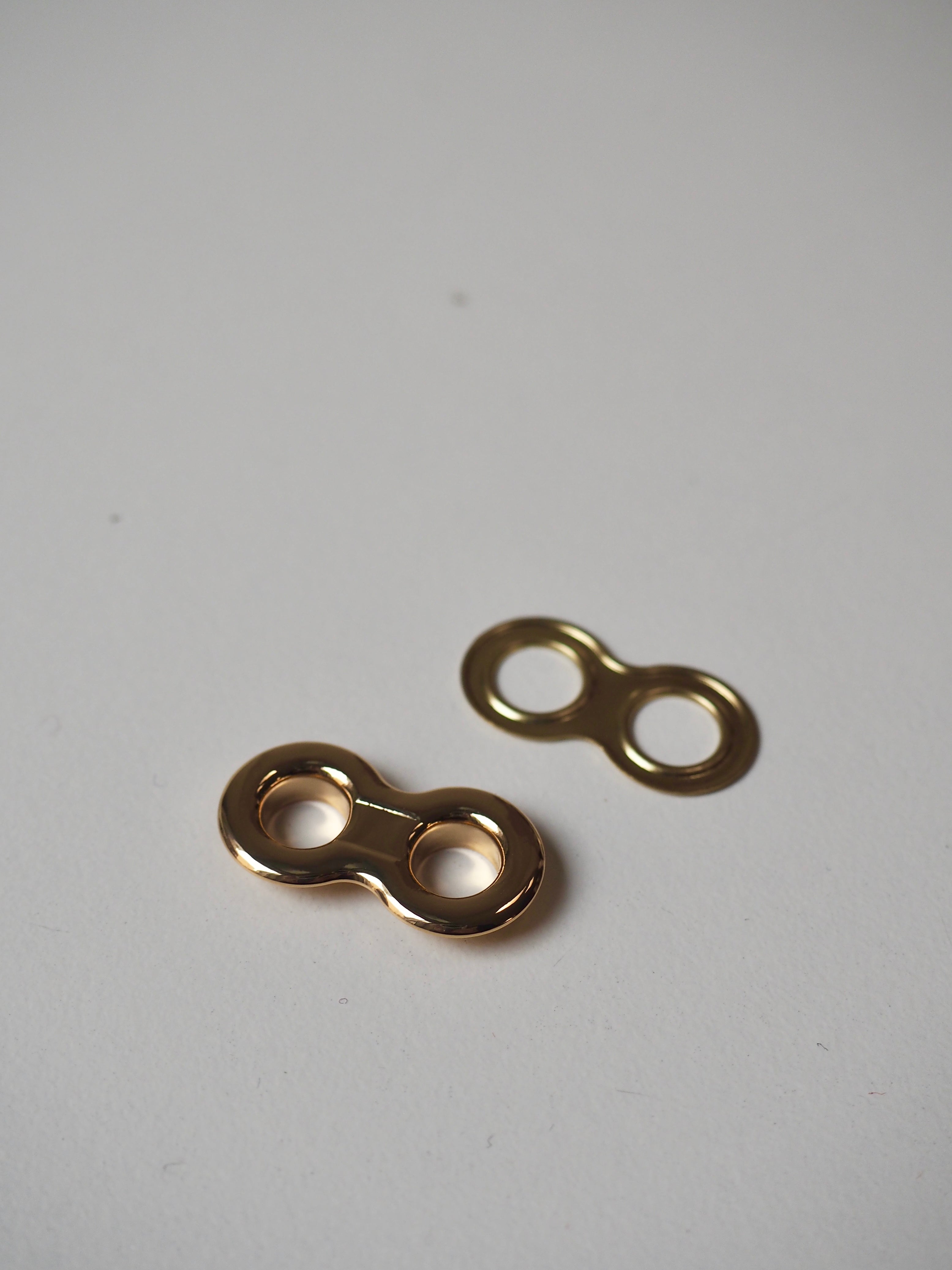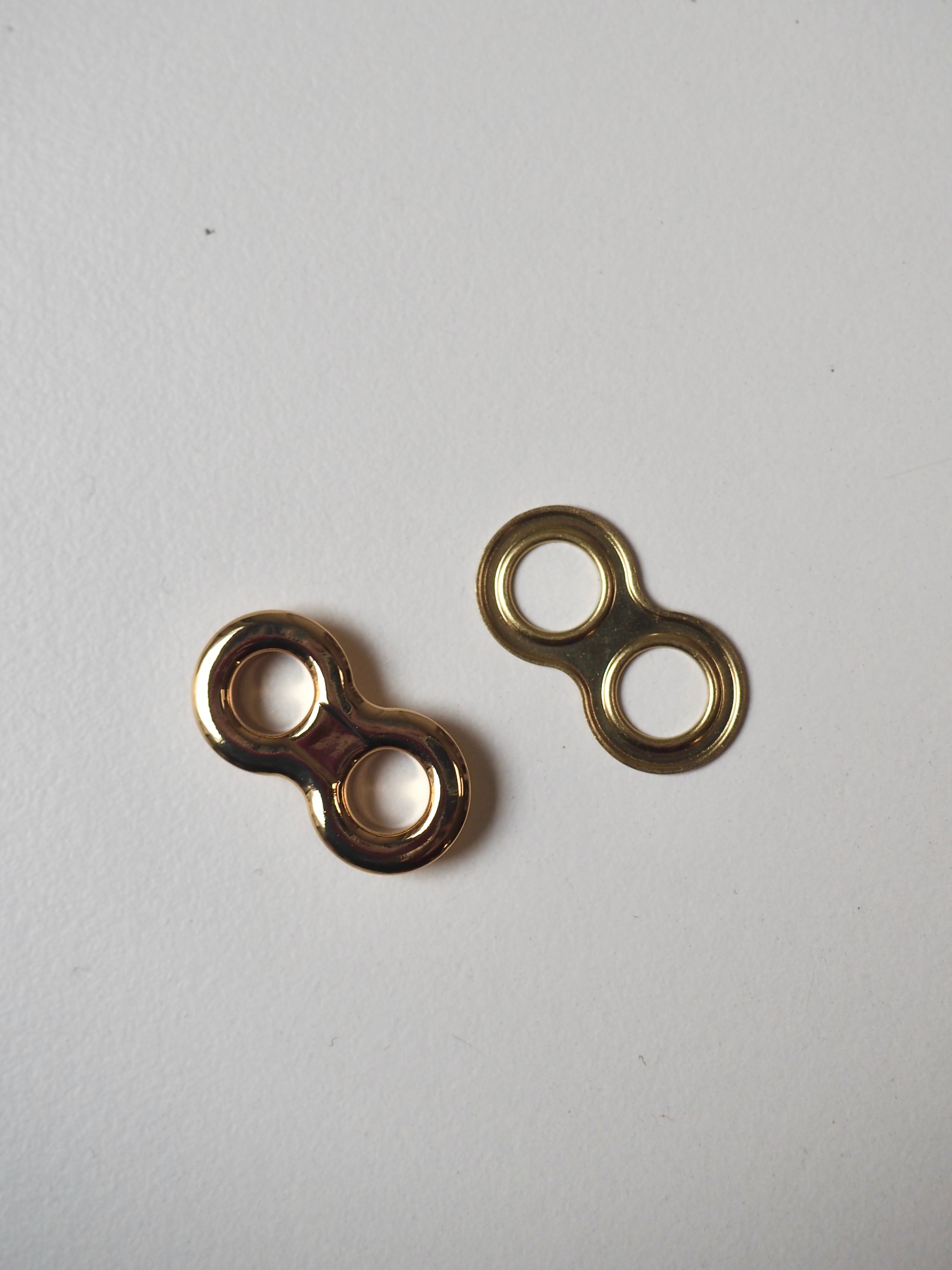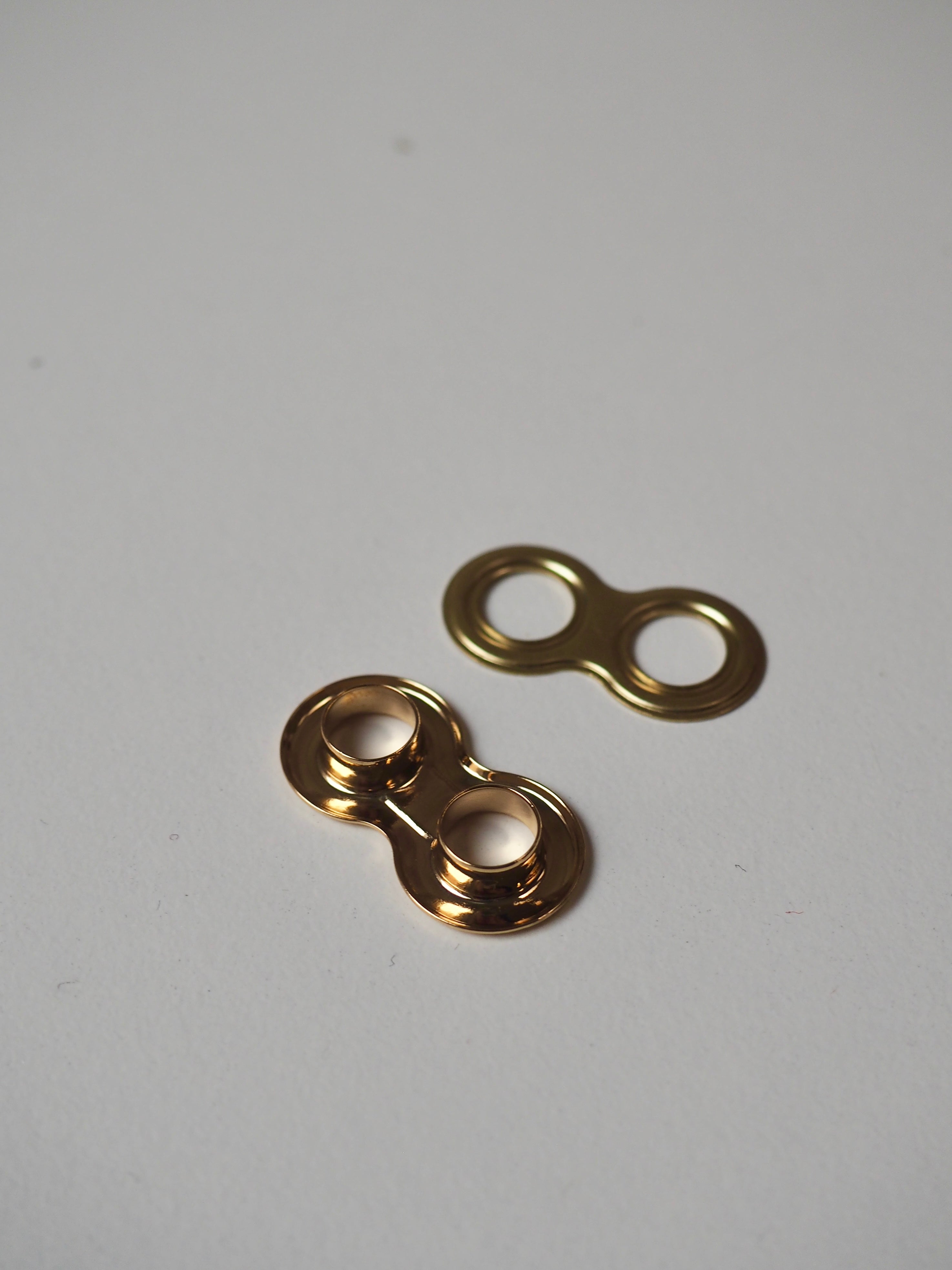 This ex-designer hardware is a double eyelet. It's lightweight, with a shiny finish. A great addition to your garment for lacing, attaching accessories, and being creative!