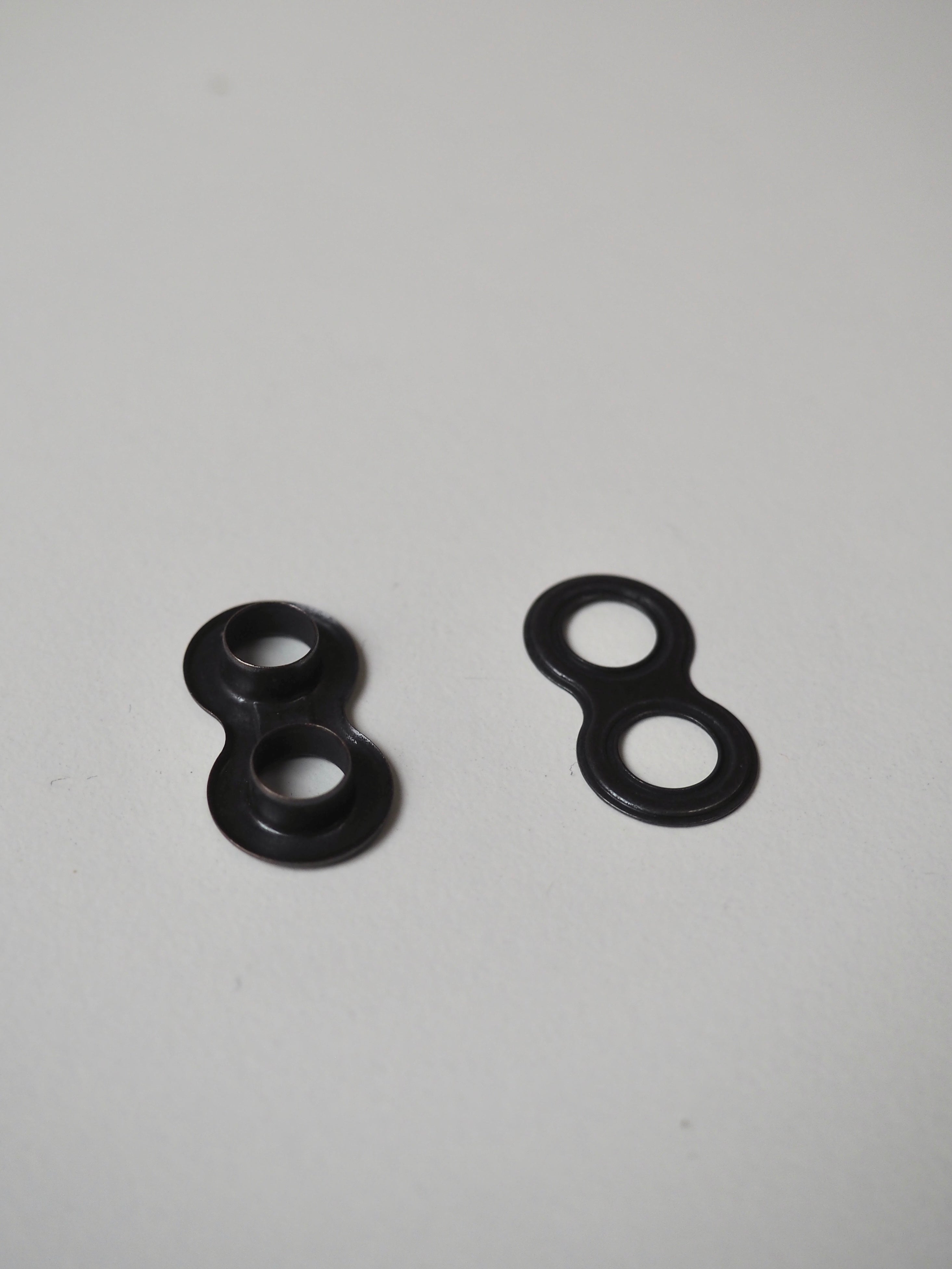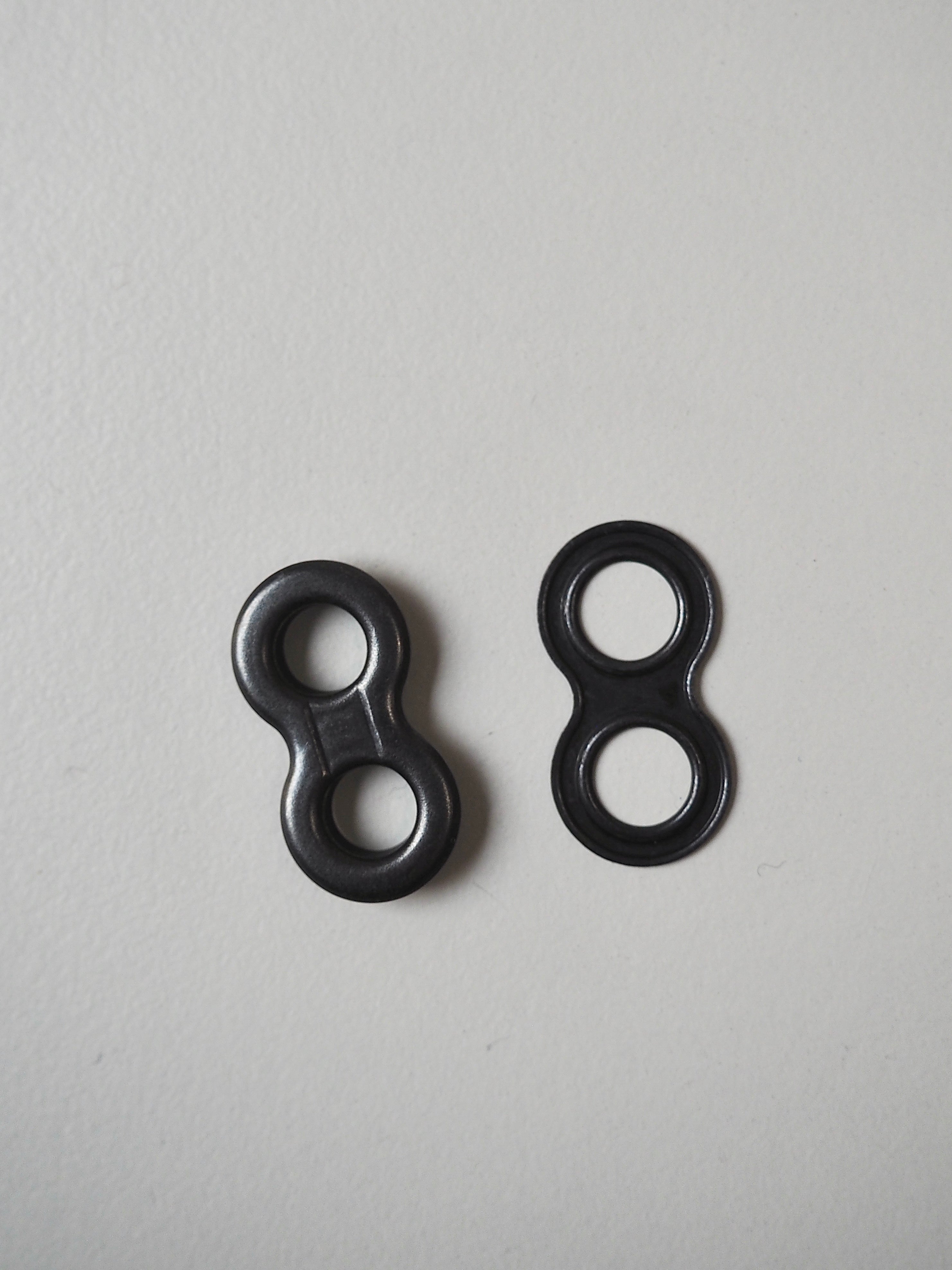 This ex-designer hardware is a double eyelet. It's lightweight, with a matte finish. A great addition to your garment for lacing, attaching accessories, and being creative!