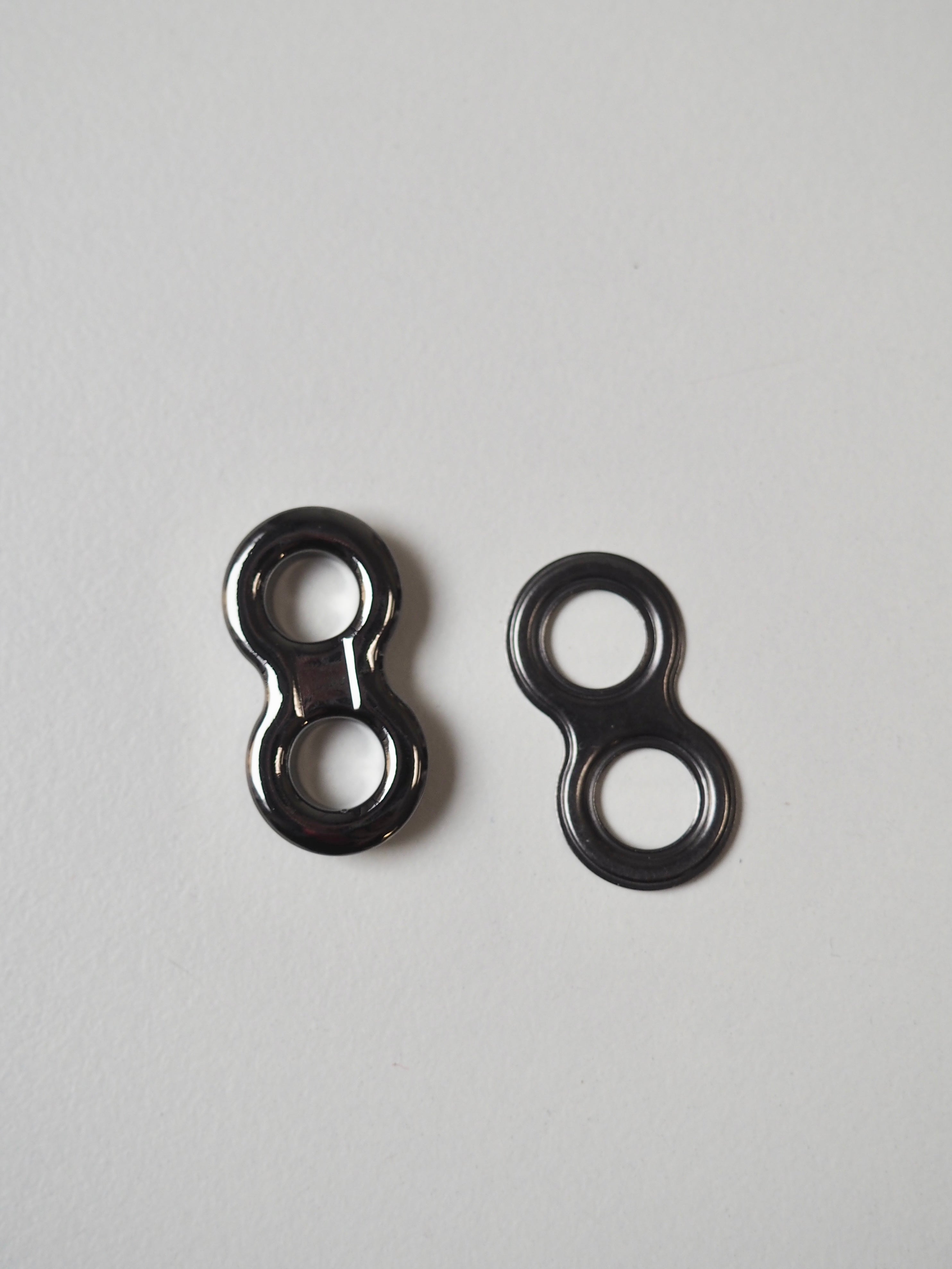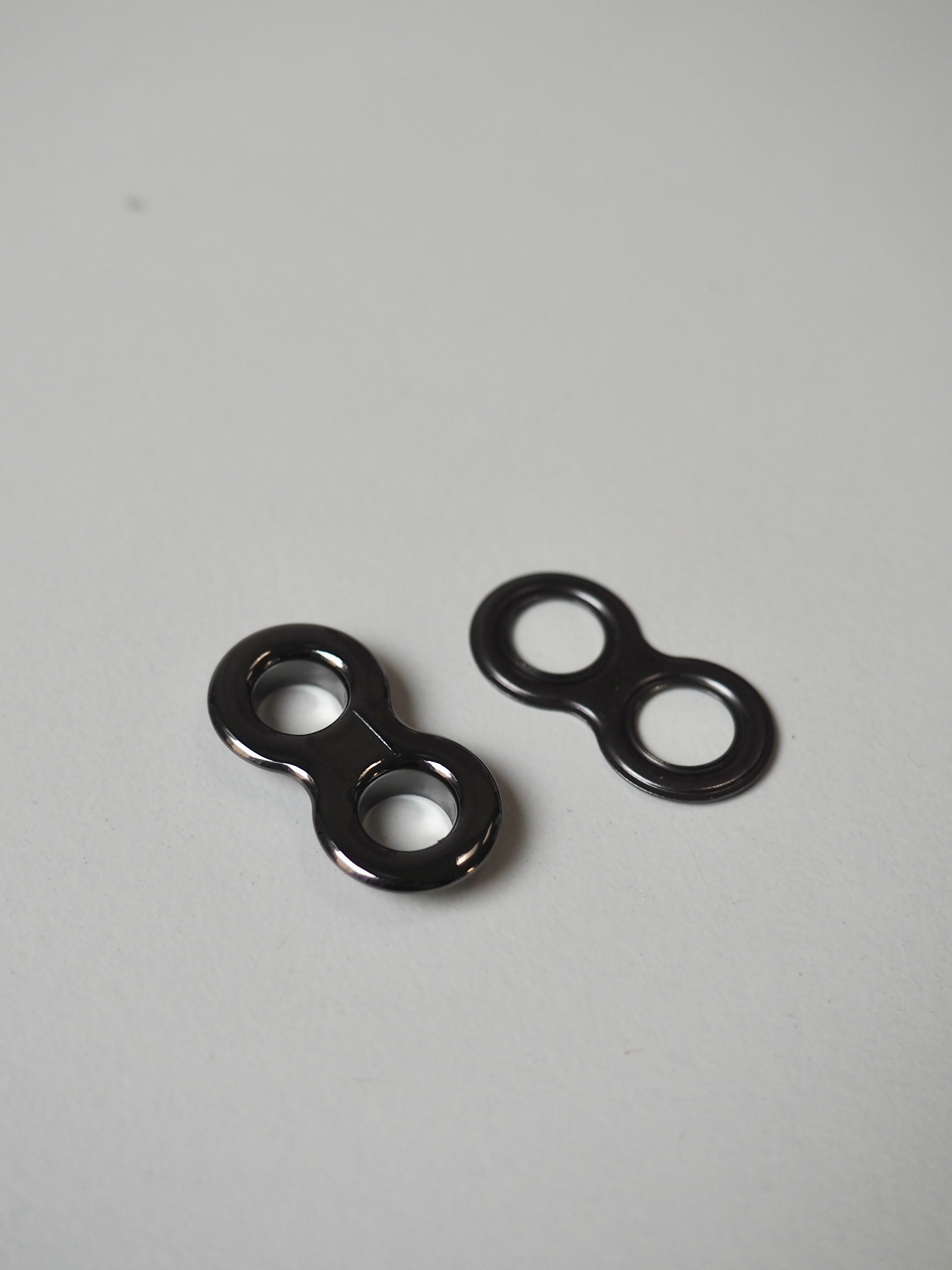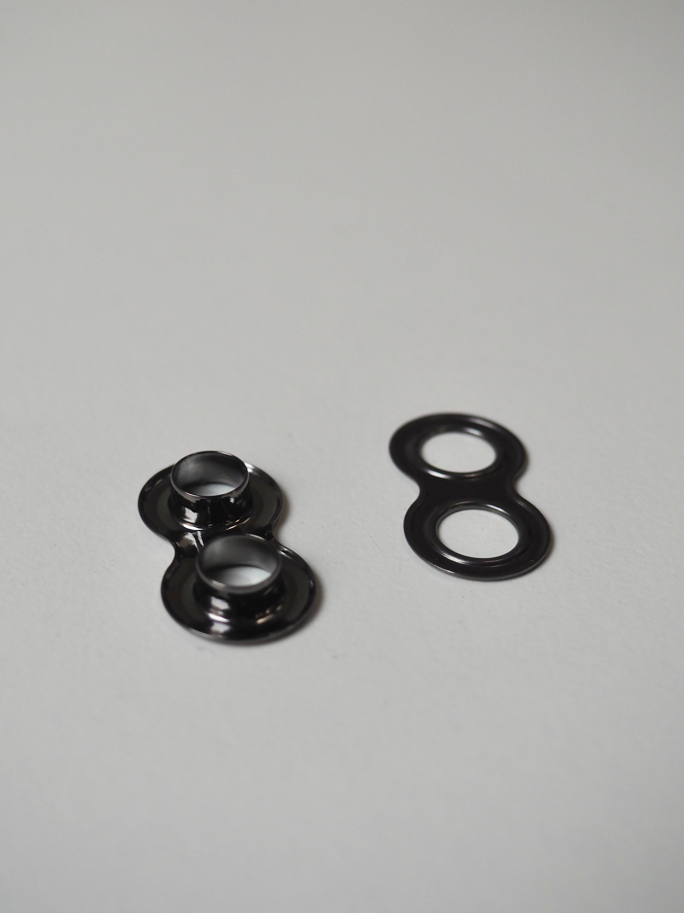 This ex-designer hardware is a double eyelet. It's lightweight, with a shiny finish. A great addition to your garment for lacing, attaching accessories, and being creative!