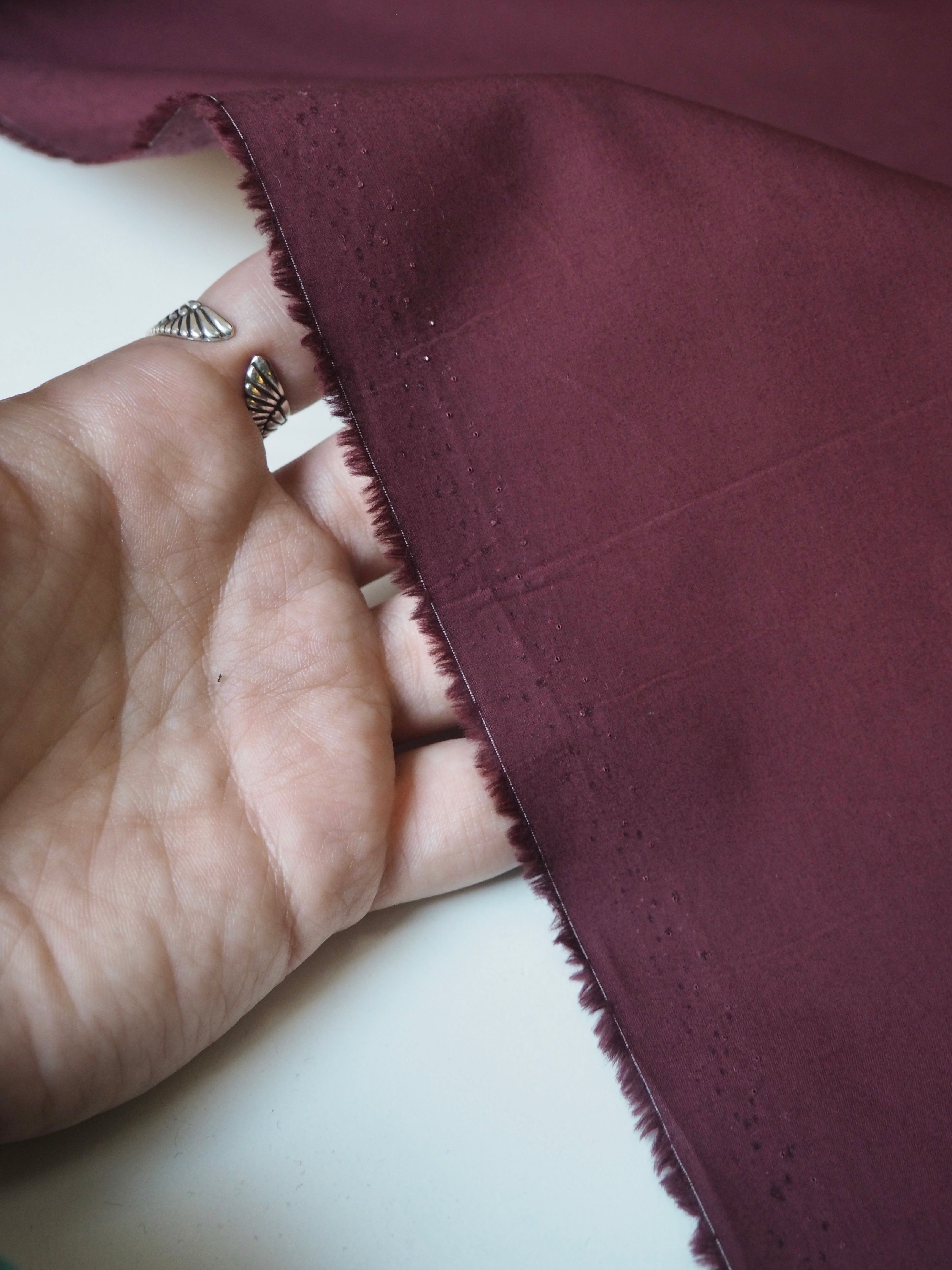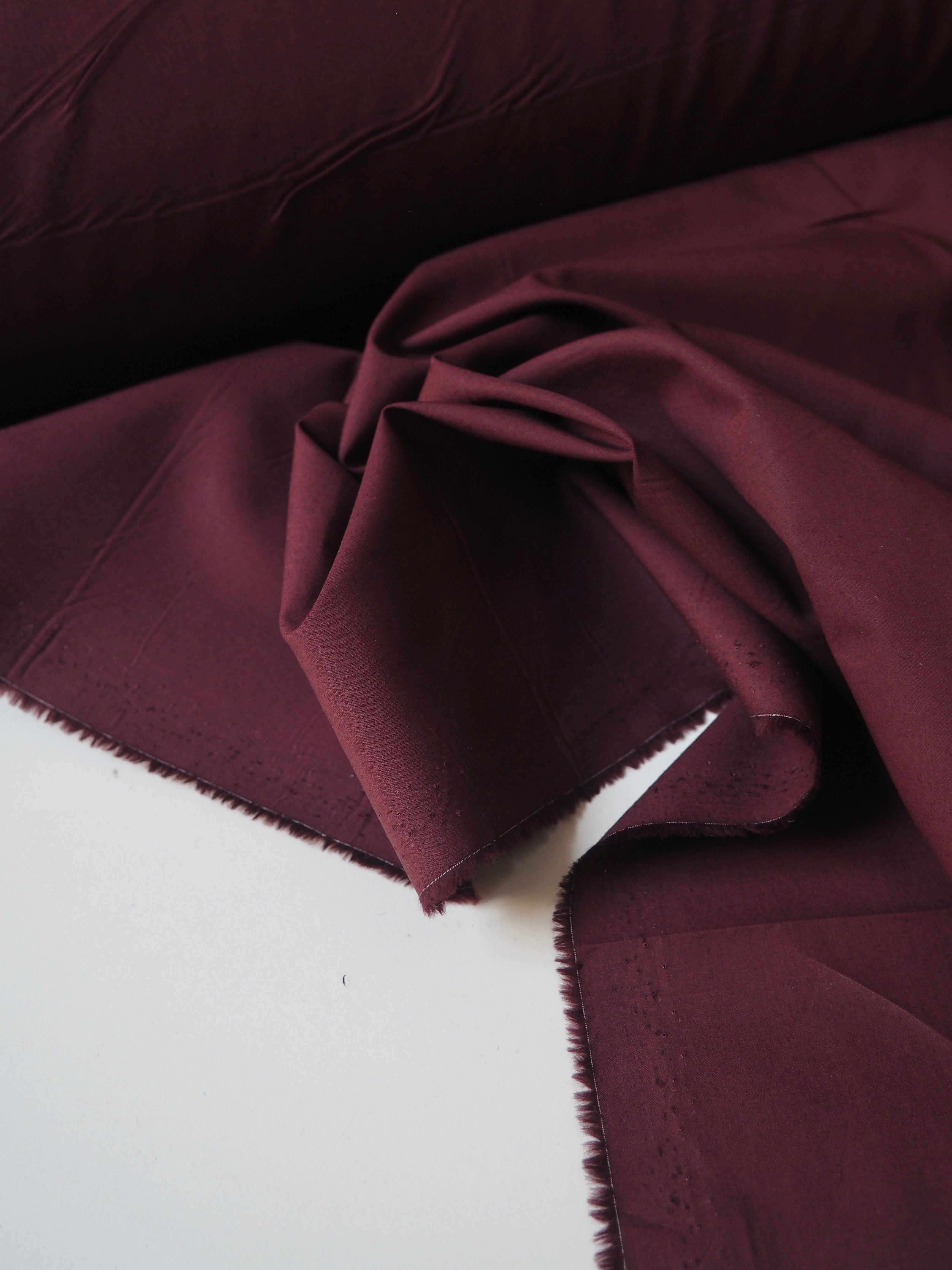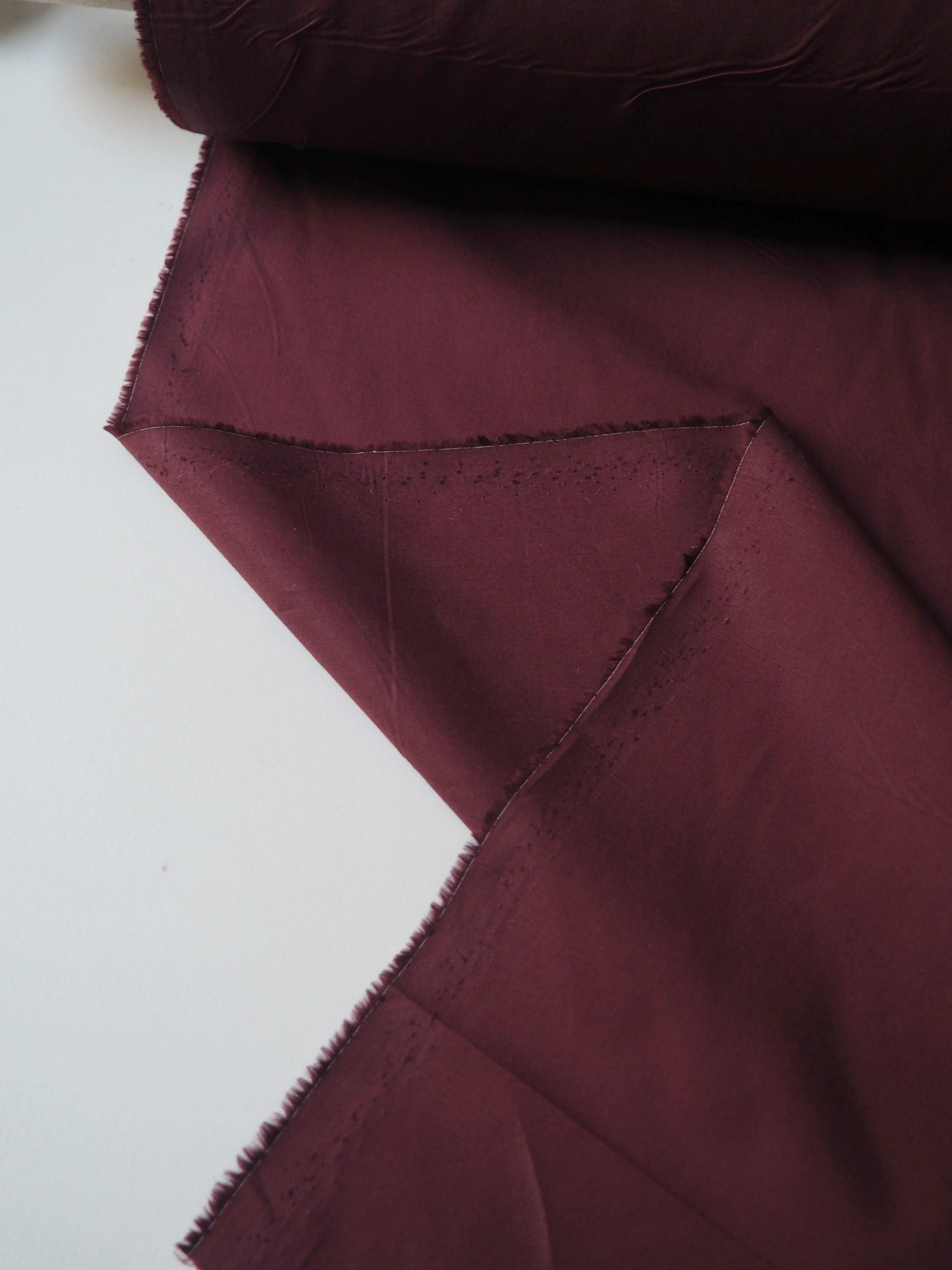 This ex-designer fabric is a cotton poplin. It's a muted merlot red shade. It's opaque, and lighter-weight for a poplin. Has a typical crispy poplin handle and drape. Such a lovely handle and very wearable! Perfect for a button down!