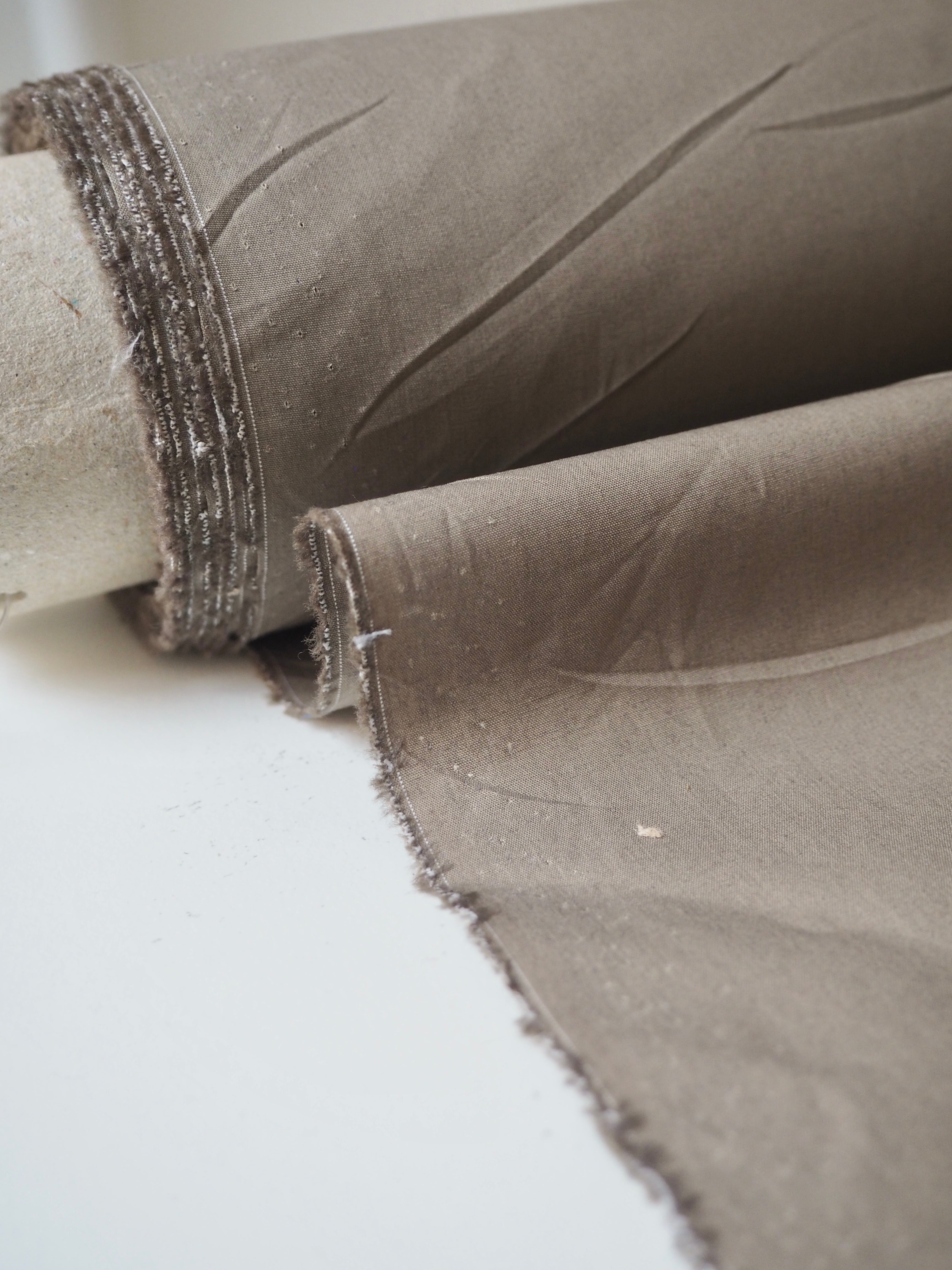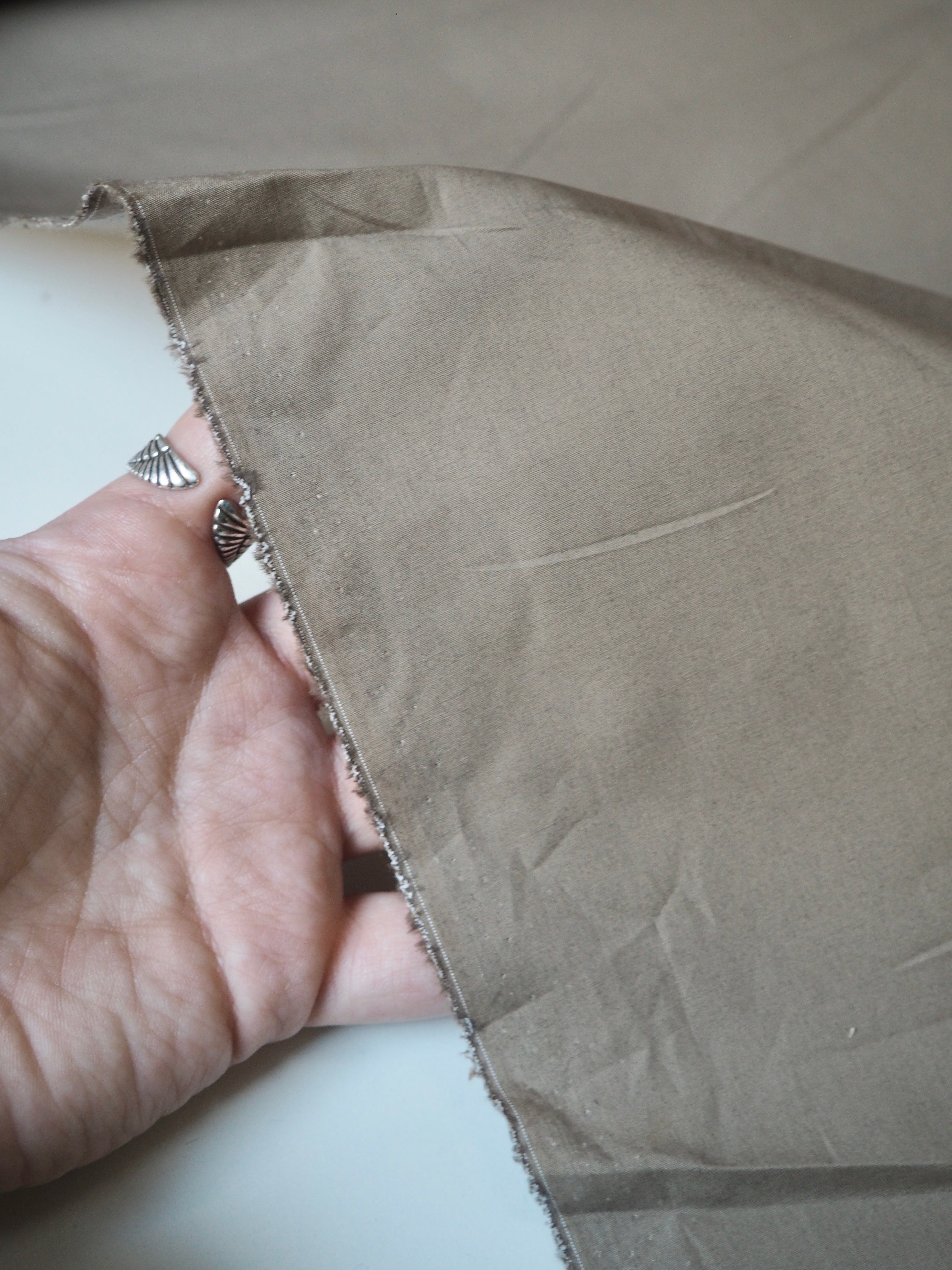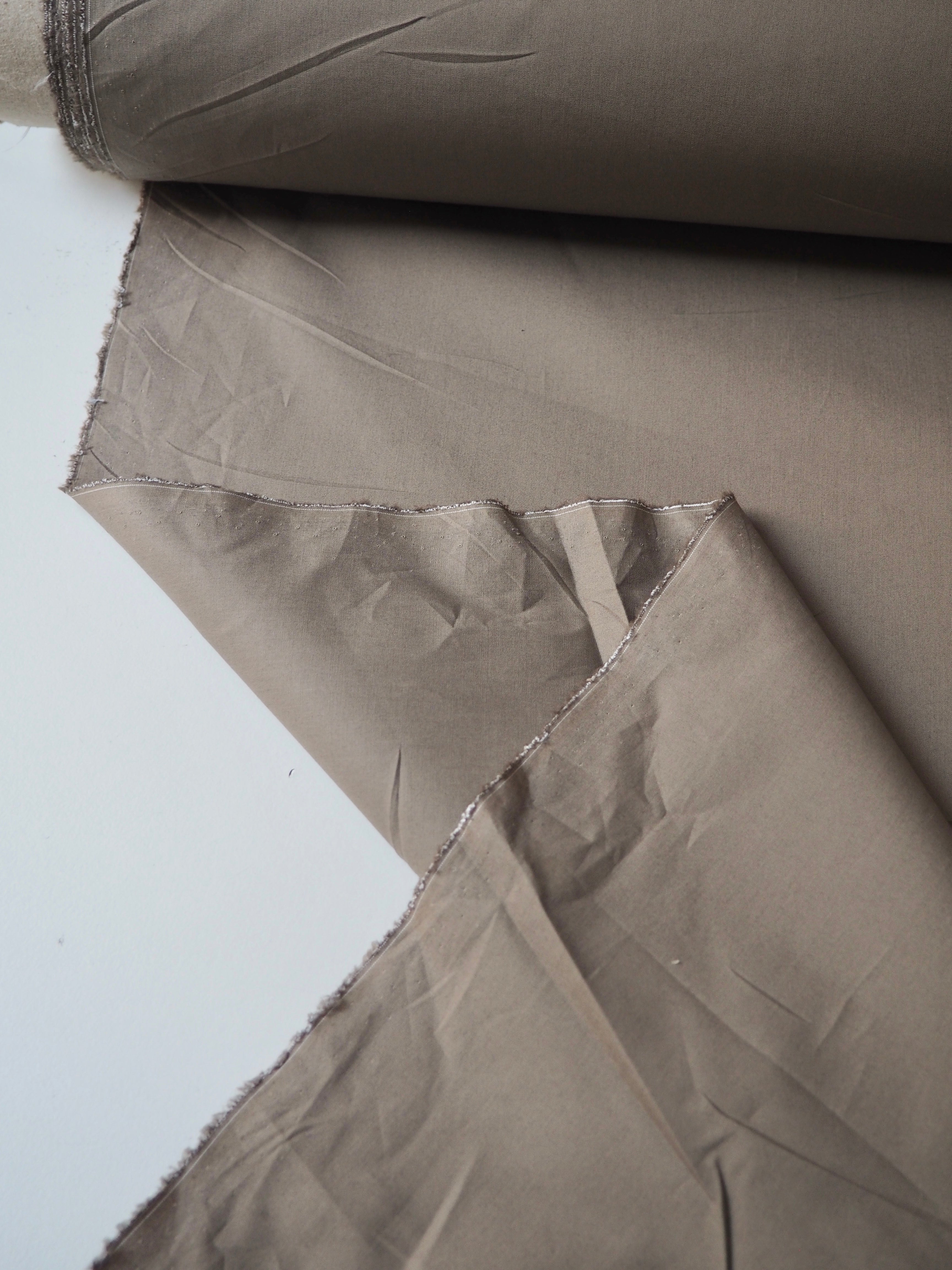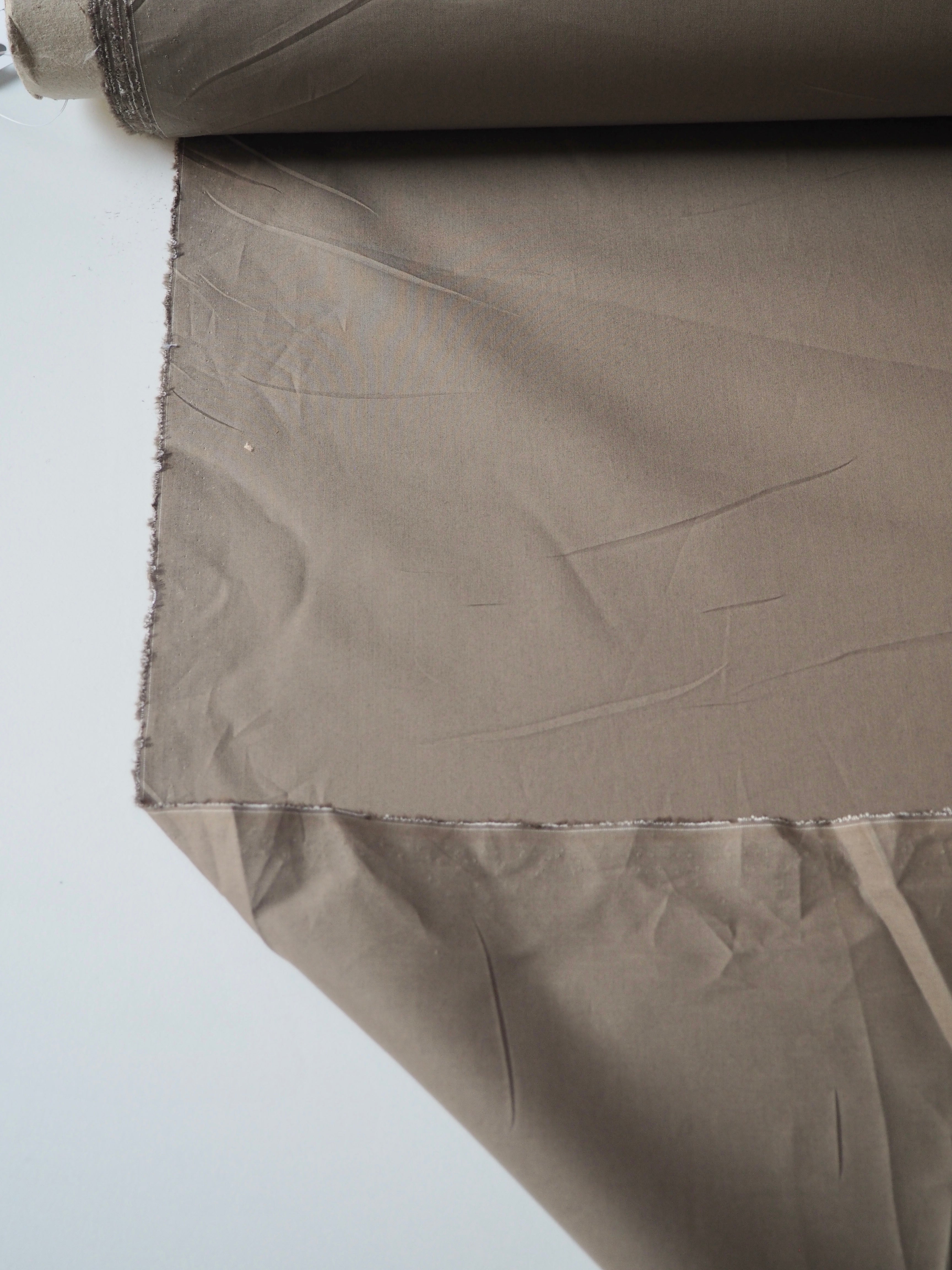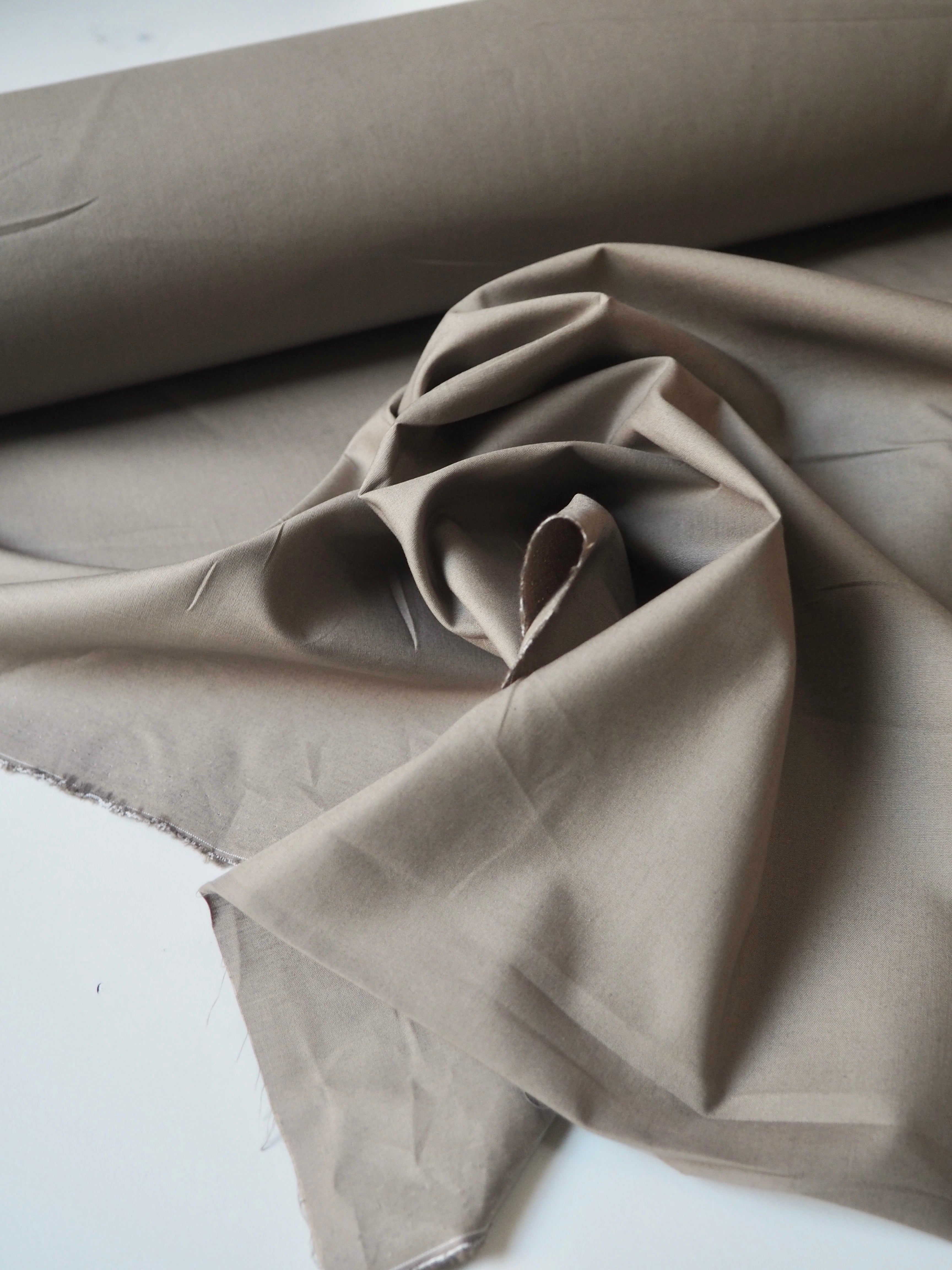 This ex-designer fabric is a cotton poplin. It's a classic taupe shade. It's opaque, and lighter-weight for a poplin. Has a typical crispy poplin handle and drape. Such a lovely handle and very wearable! Perfect for a button down!