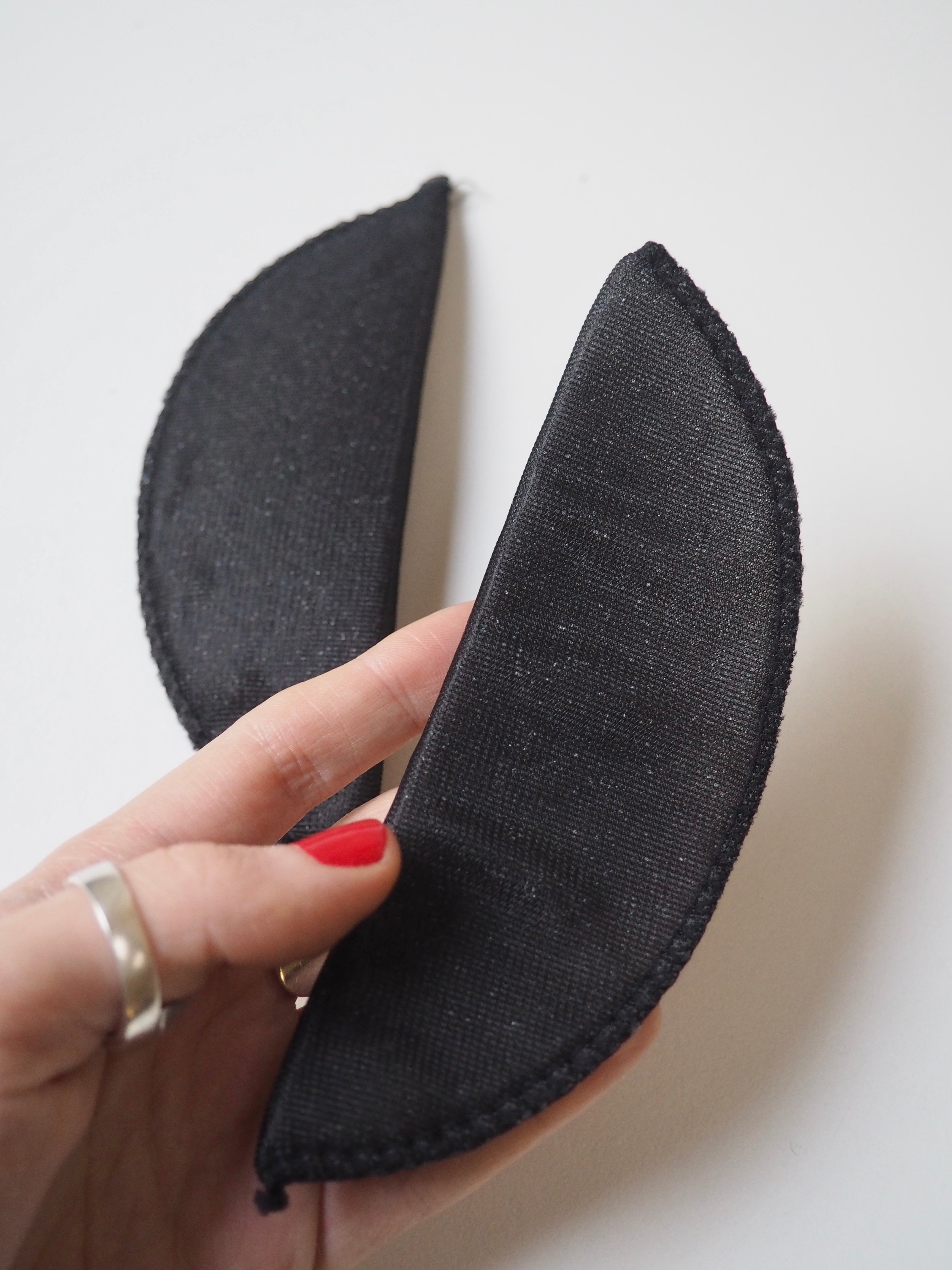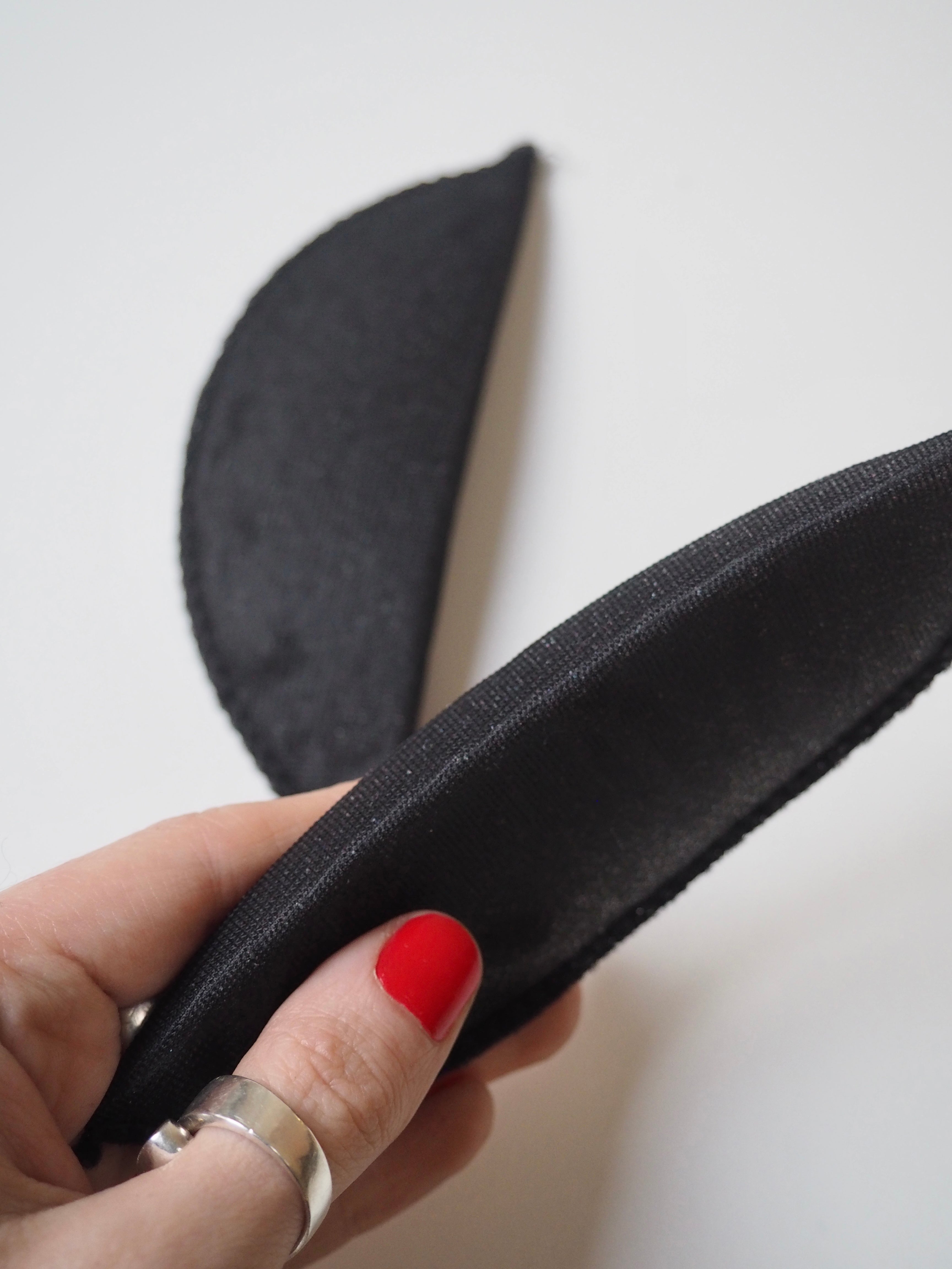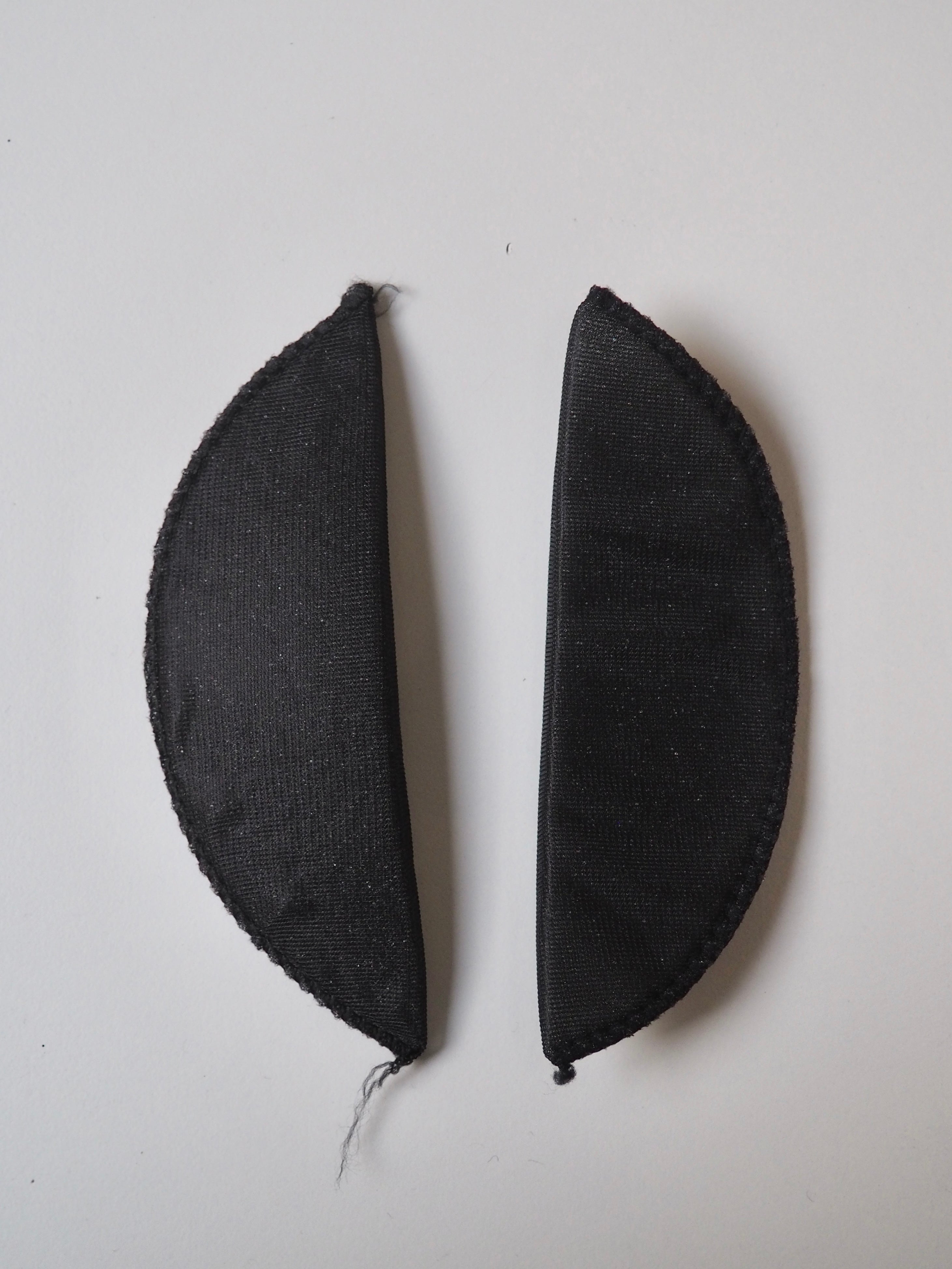 A narrow width shoulder pad with a light thickness perfect for more lightly structured garment. It is made up of a foam inner covered with a thin, black mesh polyester fabric, overlocked together at the edge. Great for adding shaping to a light jacket, tailored dress or less structured coat.
