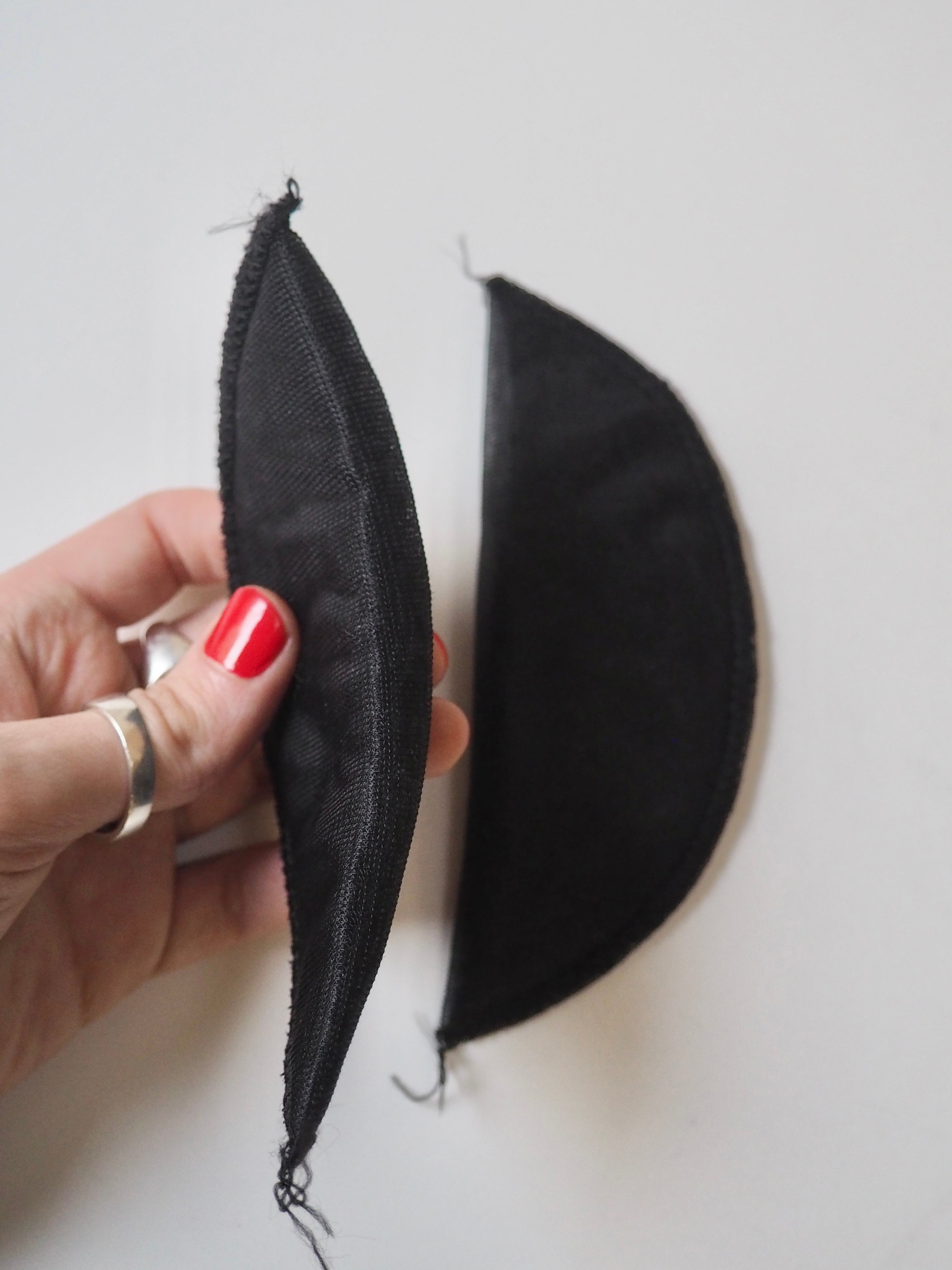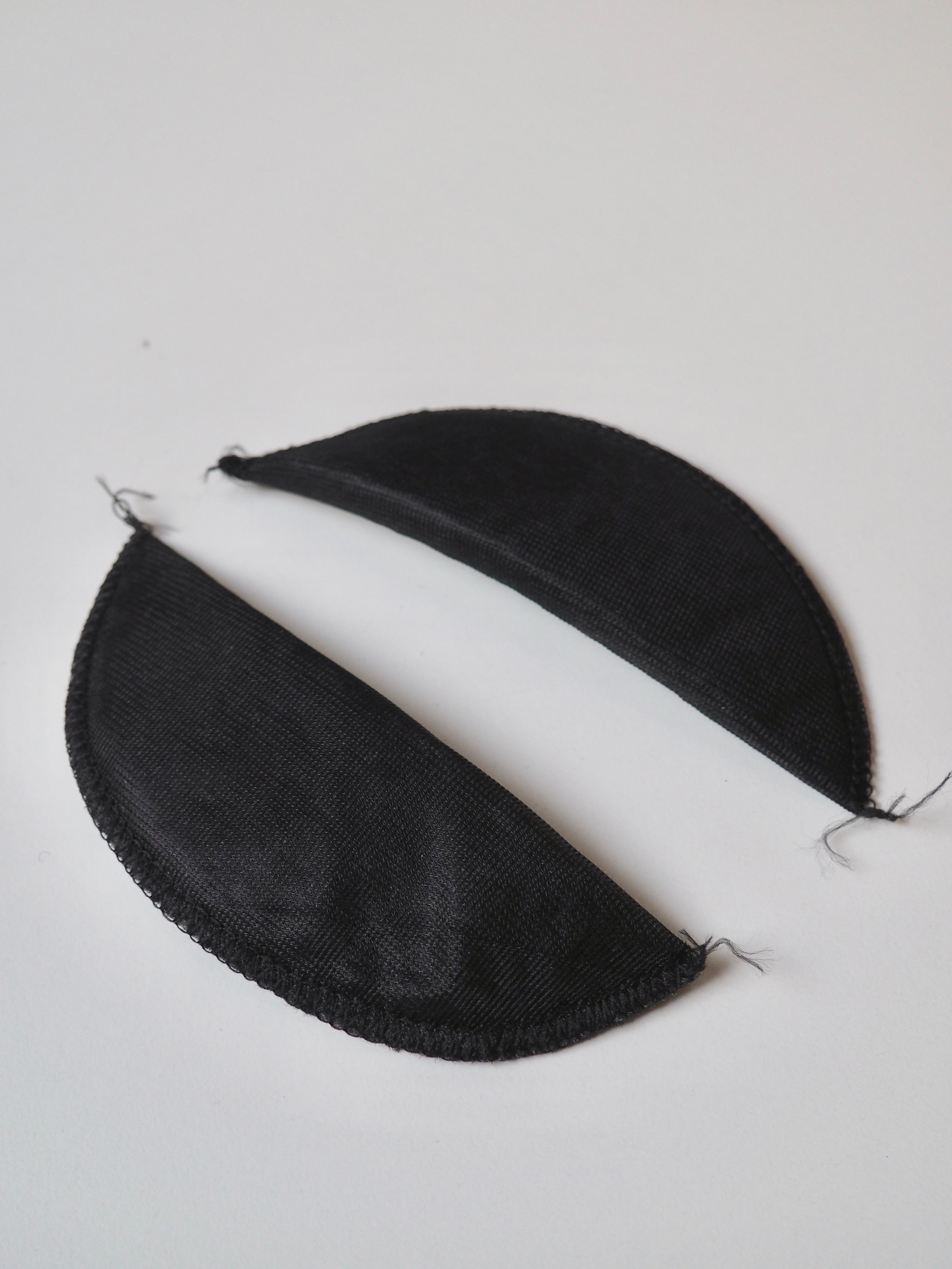 A narrow width shoulder pad with a light thickness perfect for more lightly structured garment. It is made up of a soft springy wadding inner covered with a thin, black mesh polyester fabric, overlocked together at the edge. Great for adding shaping to a light jacket, tailored dress or less structured coat.