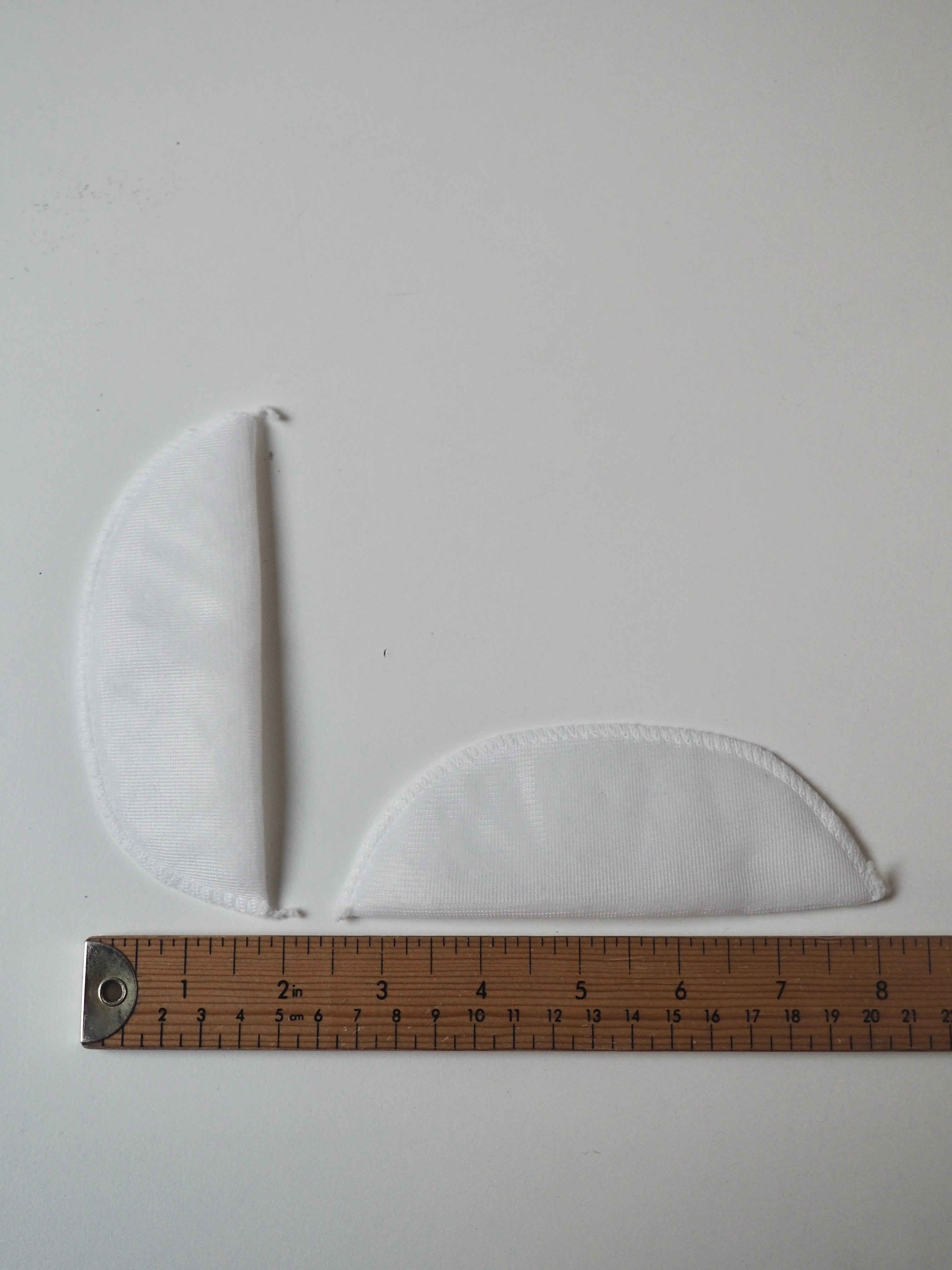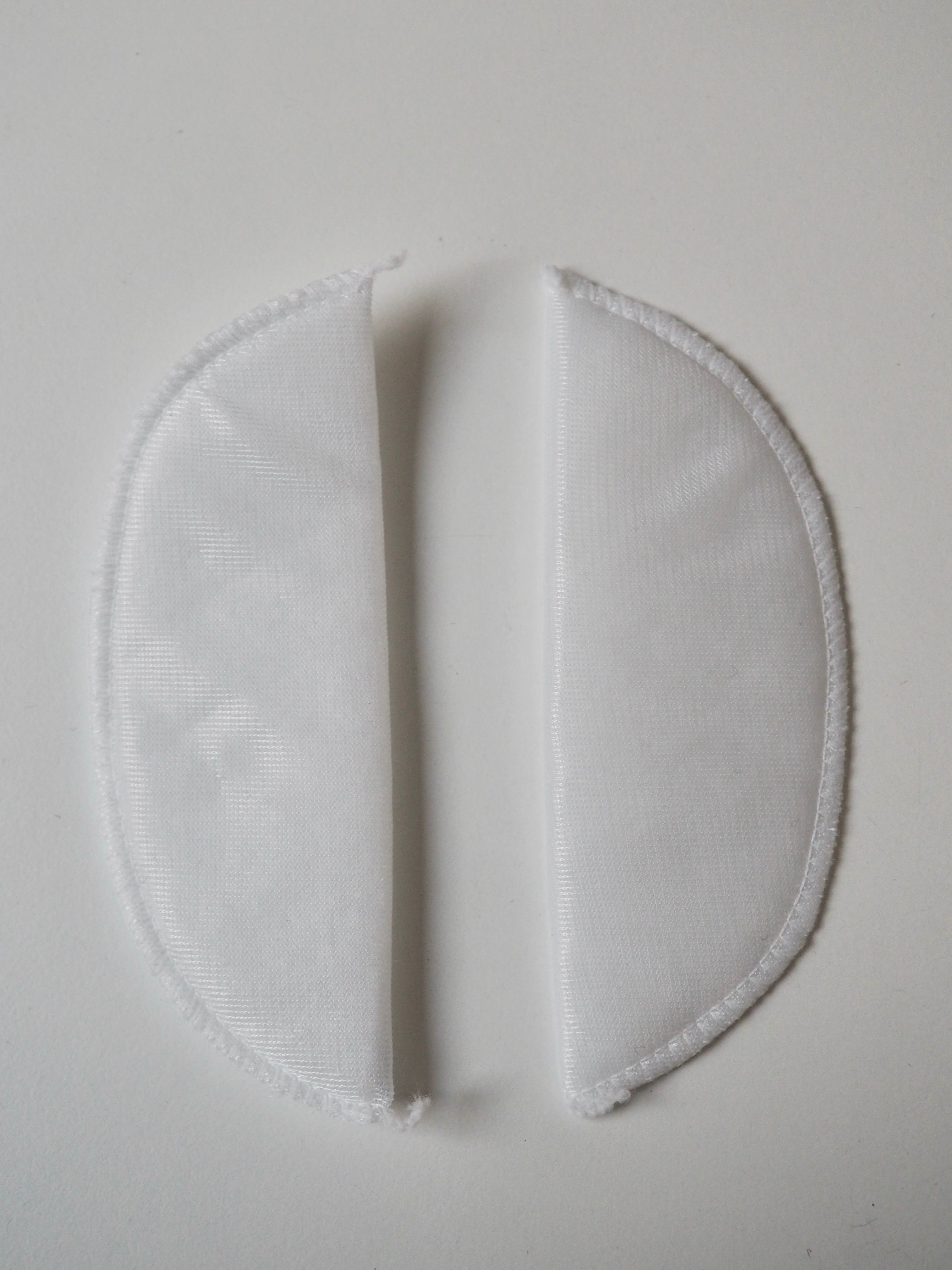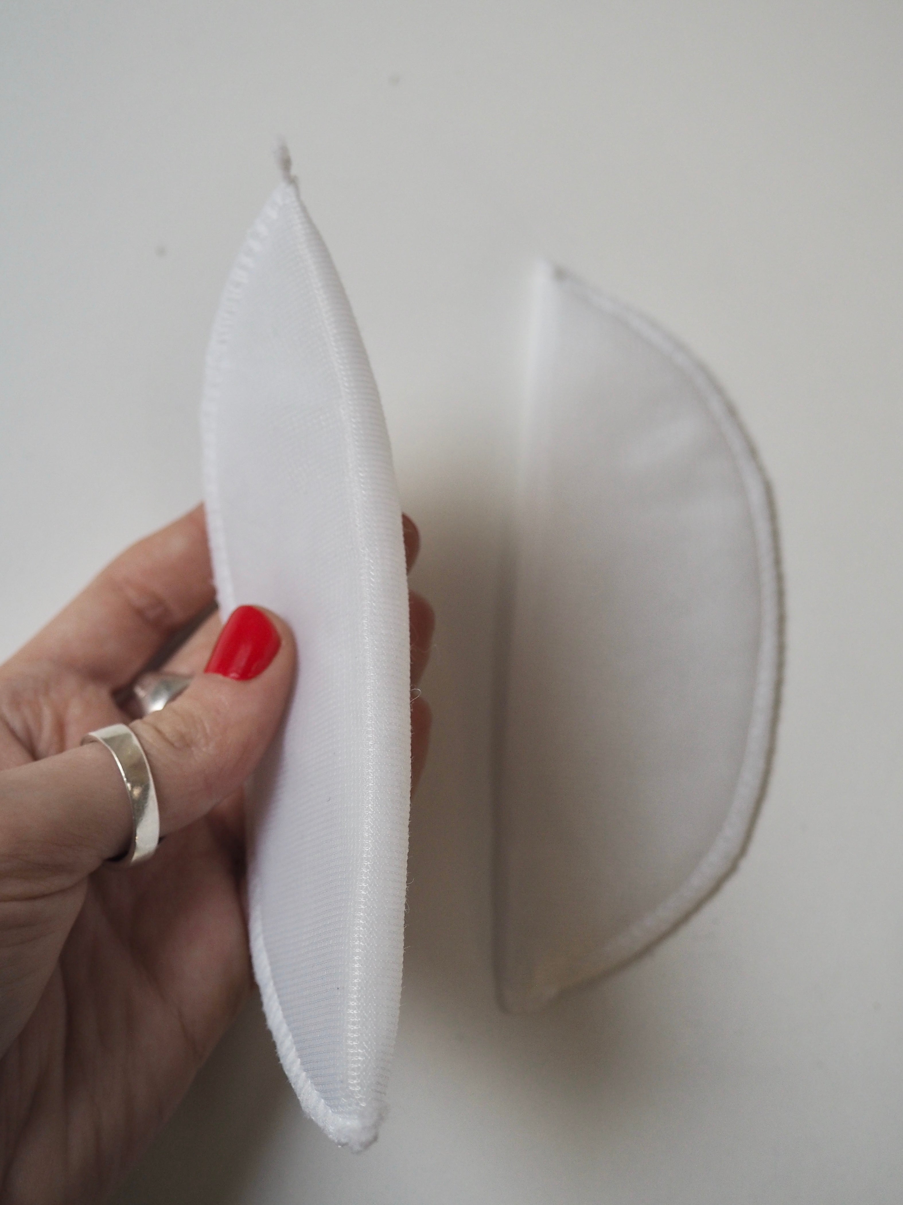 A narrow width dress shoulder pad with a light thickness perfect for more lightly structured garment. It is made up of a wadding inner covered with a thin, white mesh polyester fabric, overlocked together at the edge. Great for adding shaping to a tailored dress, light jacket or less structured coat.